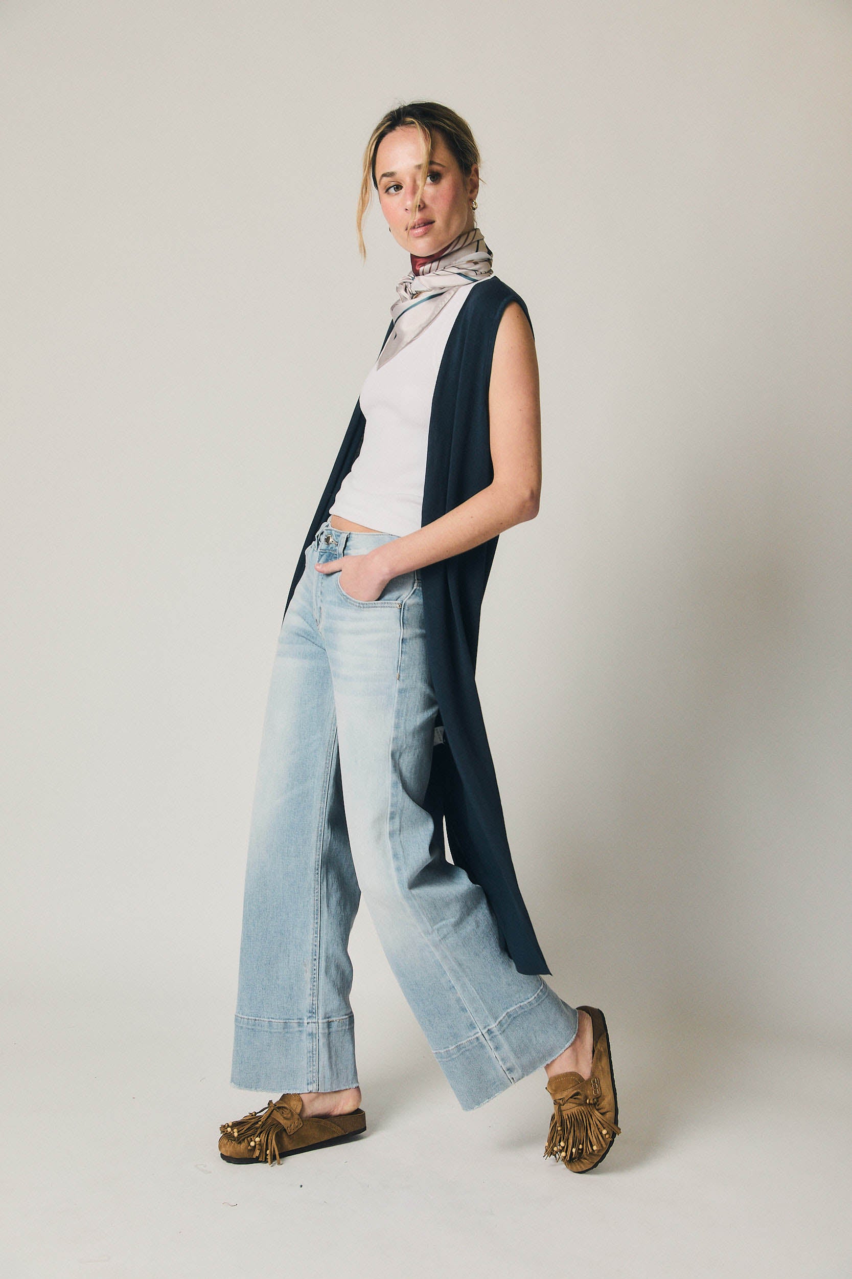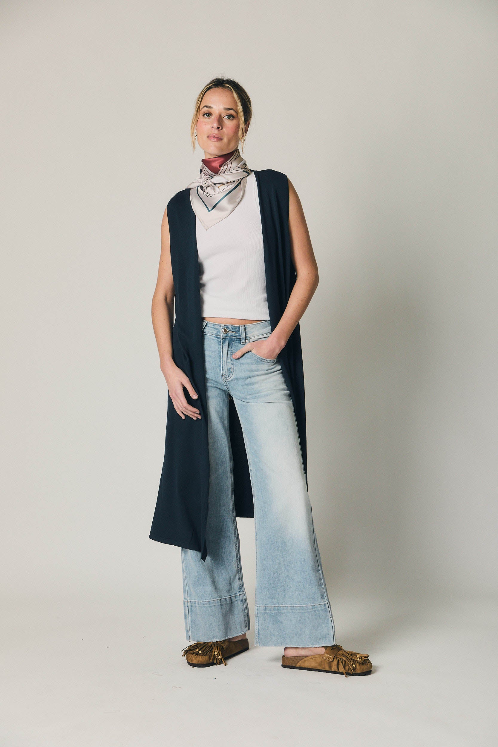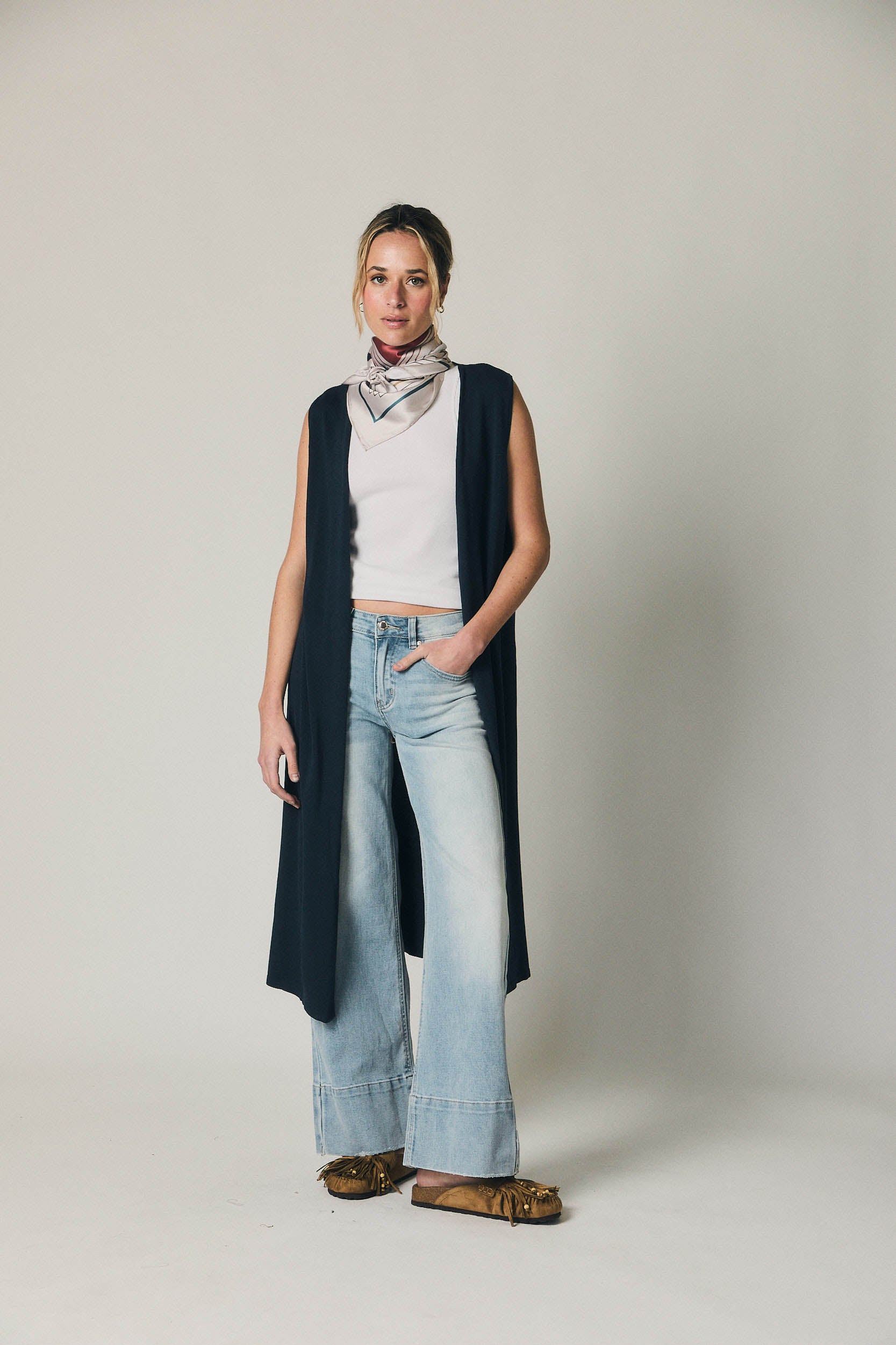 Chaleco largo de punto en tono azul marino. Diseño abierto sin cierre, con escote amplio y silueta recta que cae hasta media pierna. Presenta corte limpio y minimalista, sin mangas y con caída fluida que aporta movimiento al conjunto.