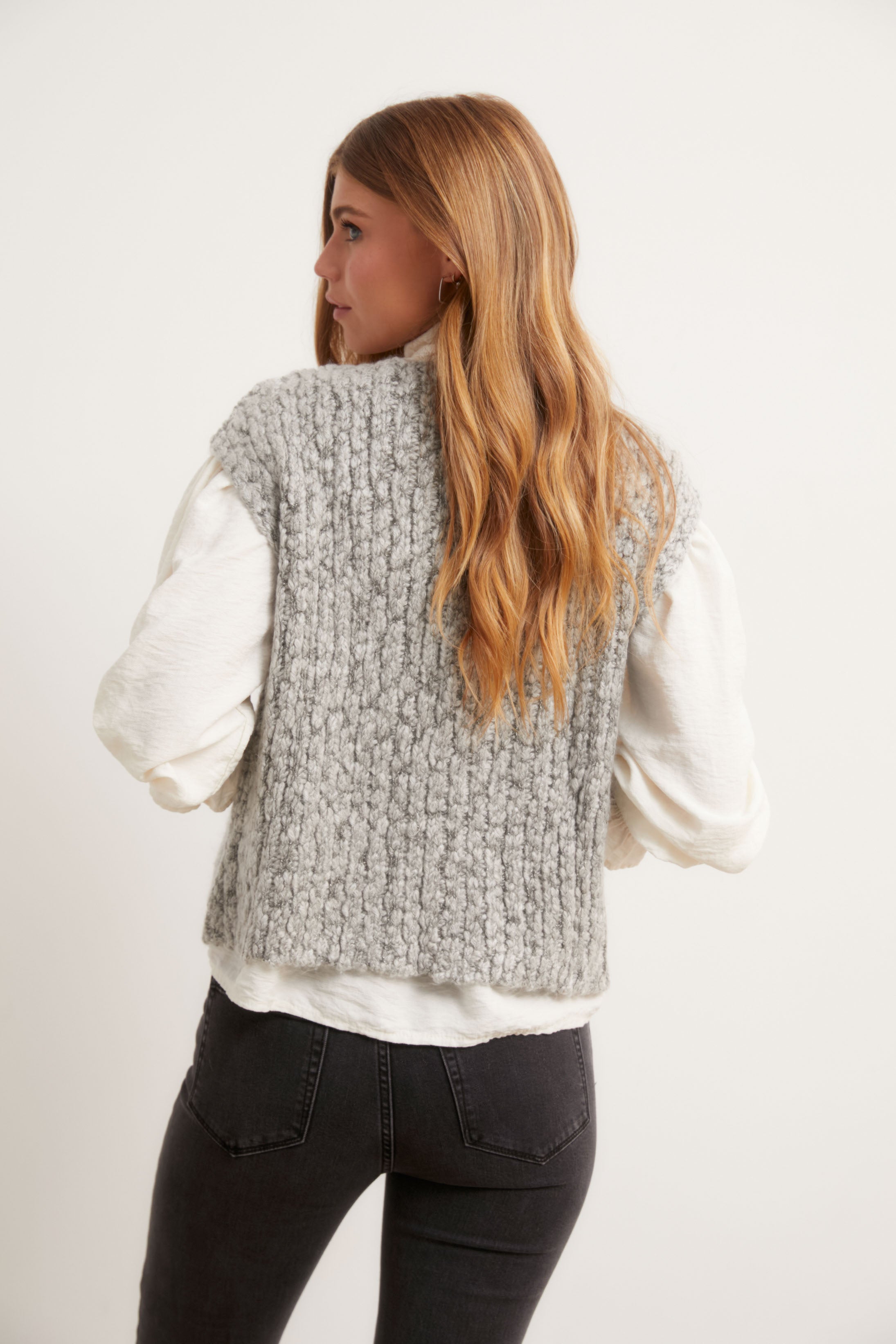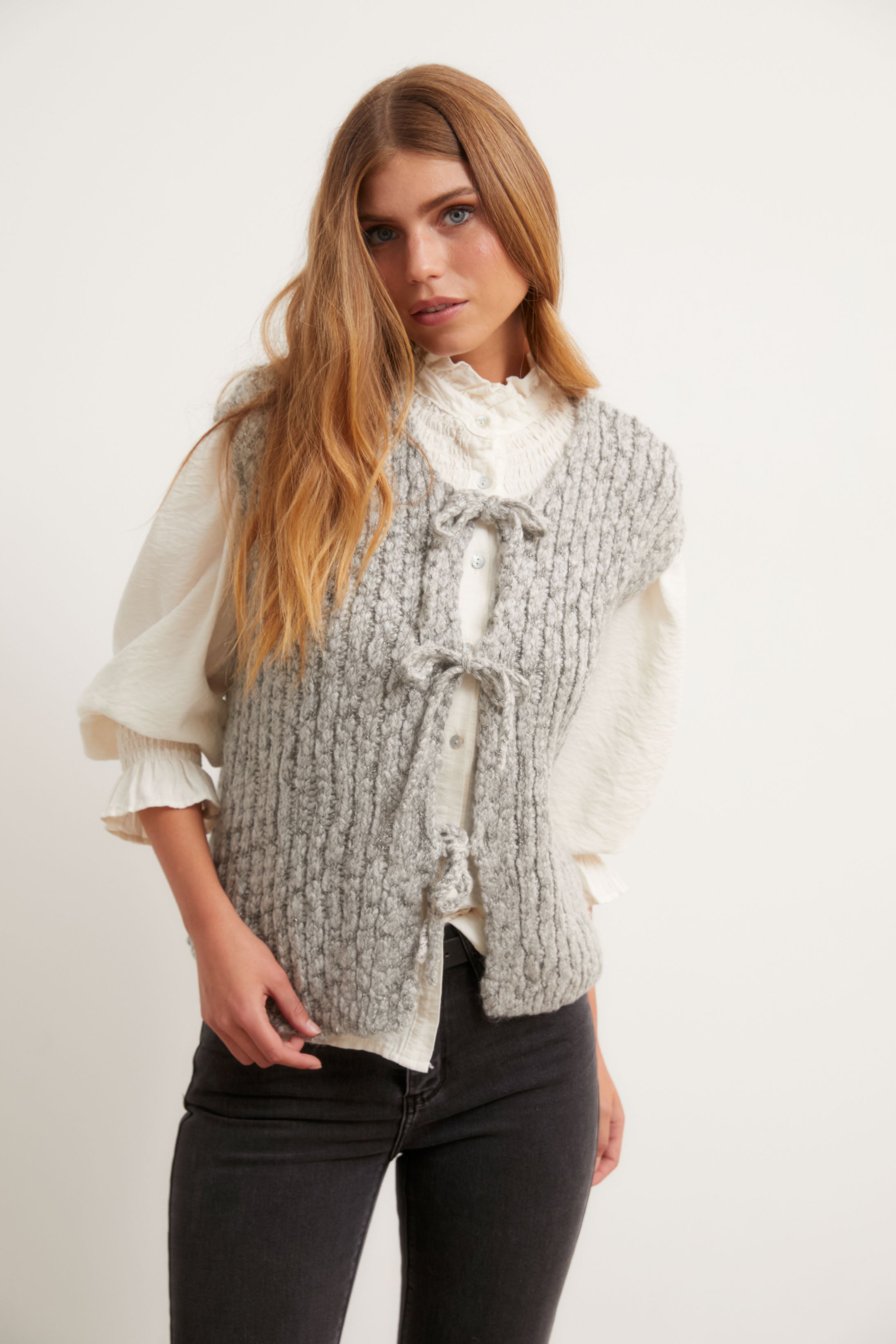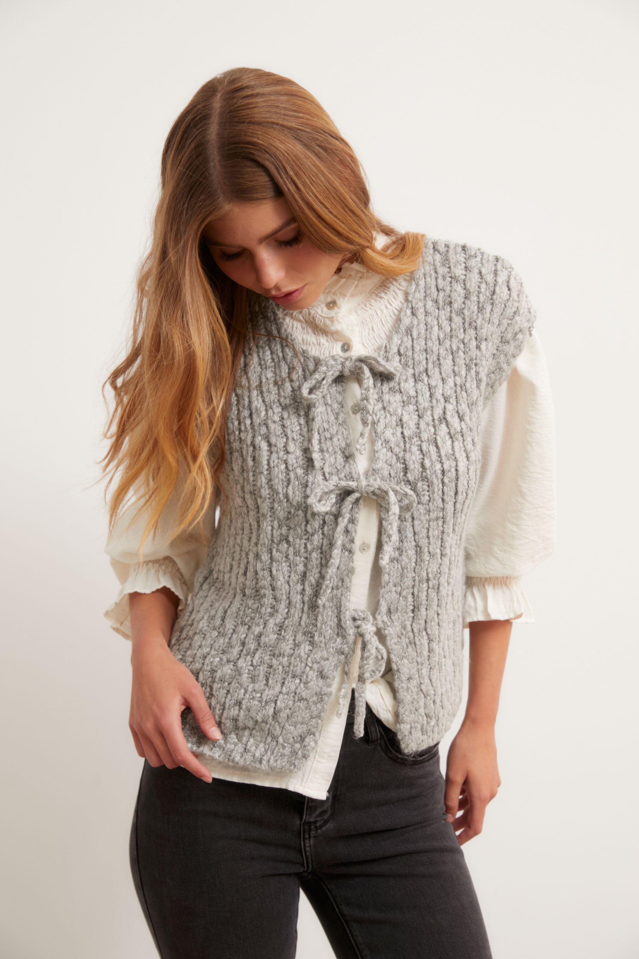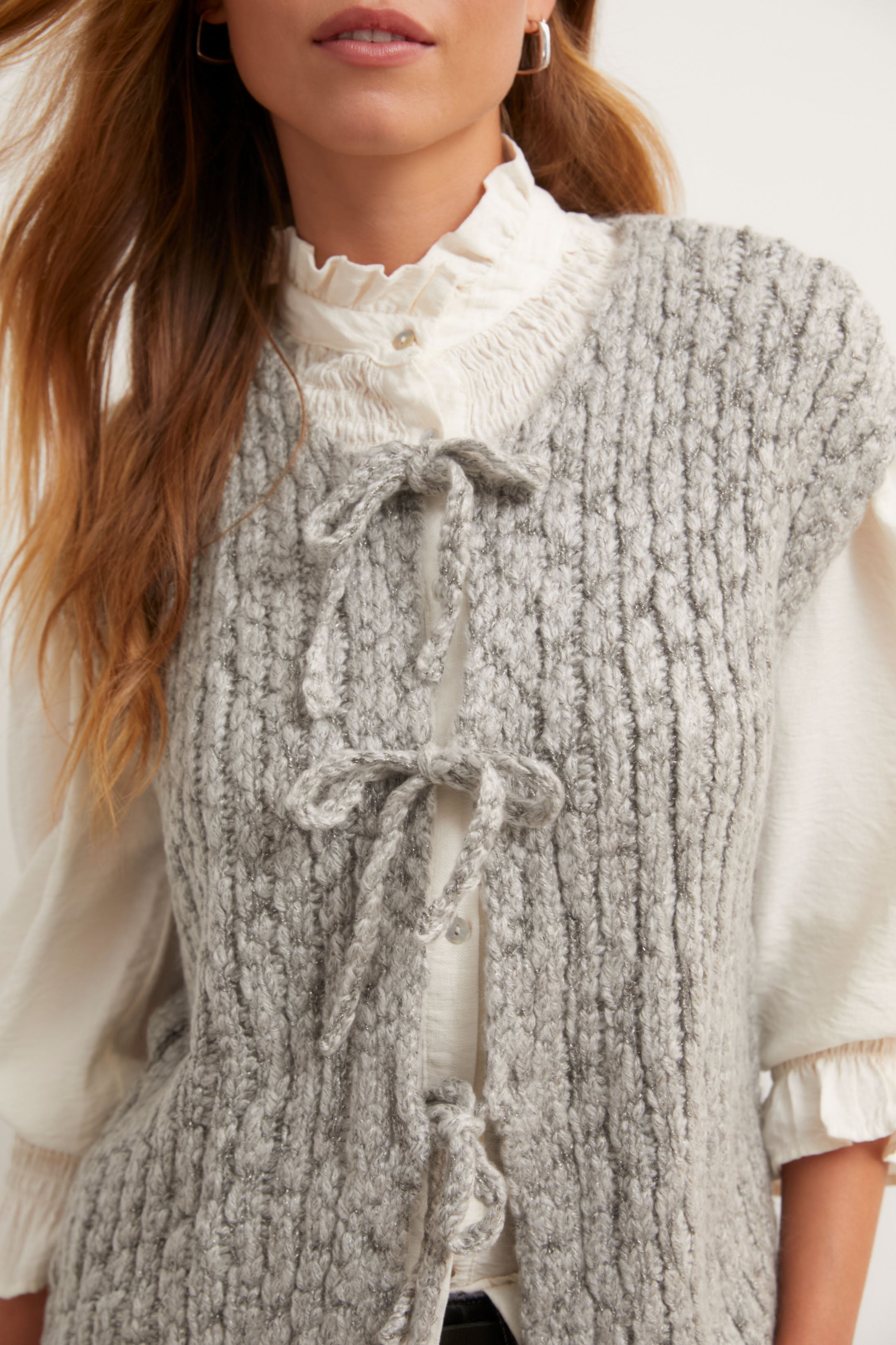 Chaleco de punto grueso en tono gris, con estructura trenzada y cierre frontal mediante tres lazos del mismo tejido. De corte recto y hombro caído, su diseño combina calidez y textura en una prenda que aporta un aire artesanal y relajado.