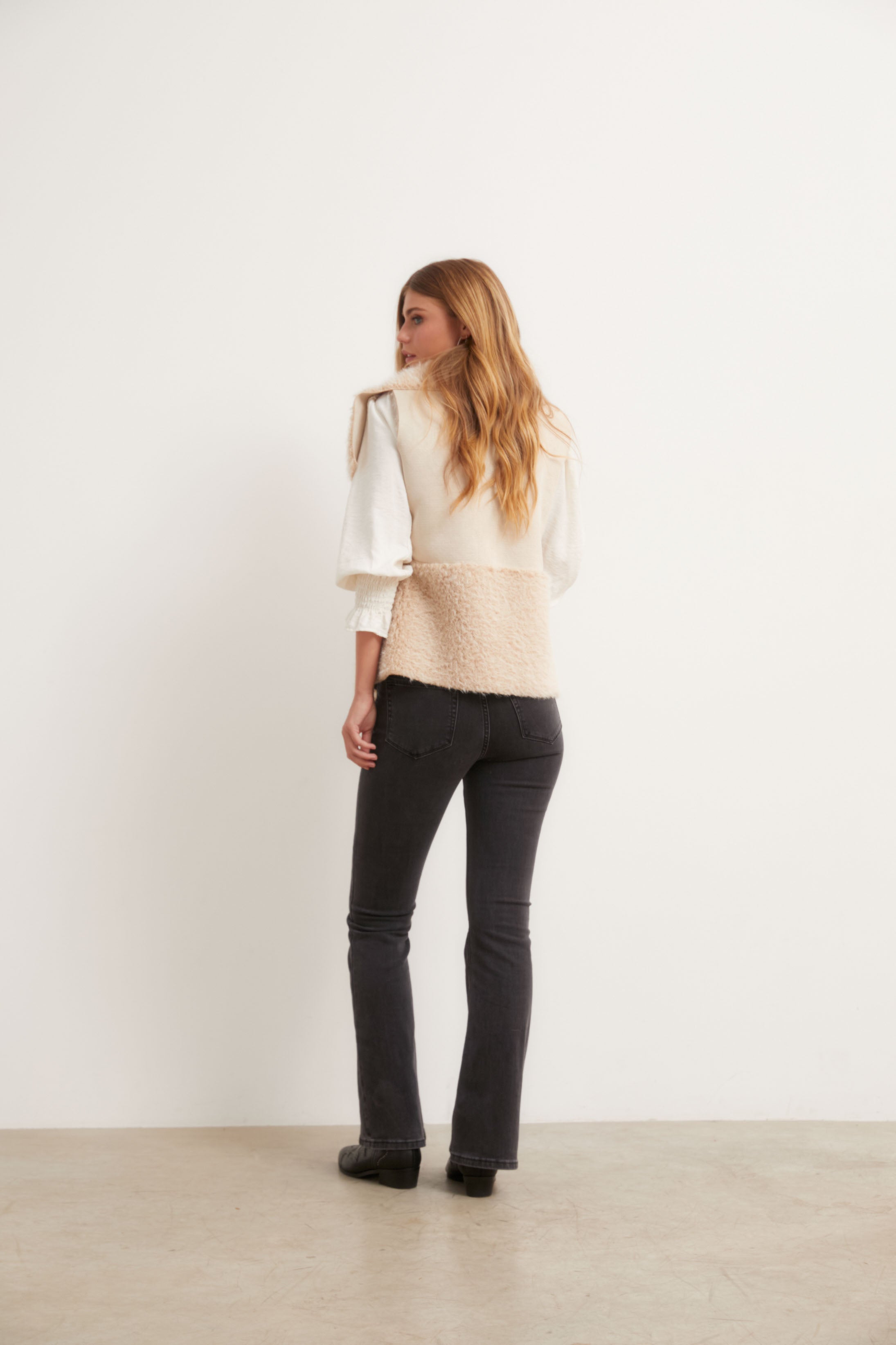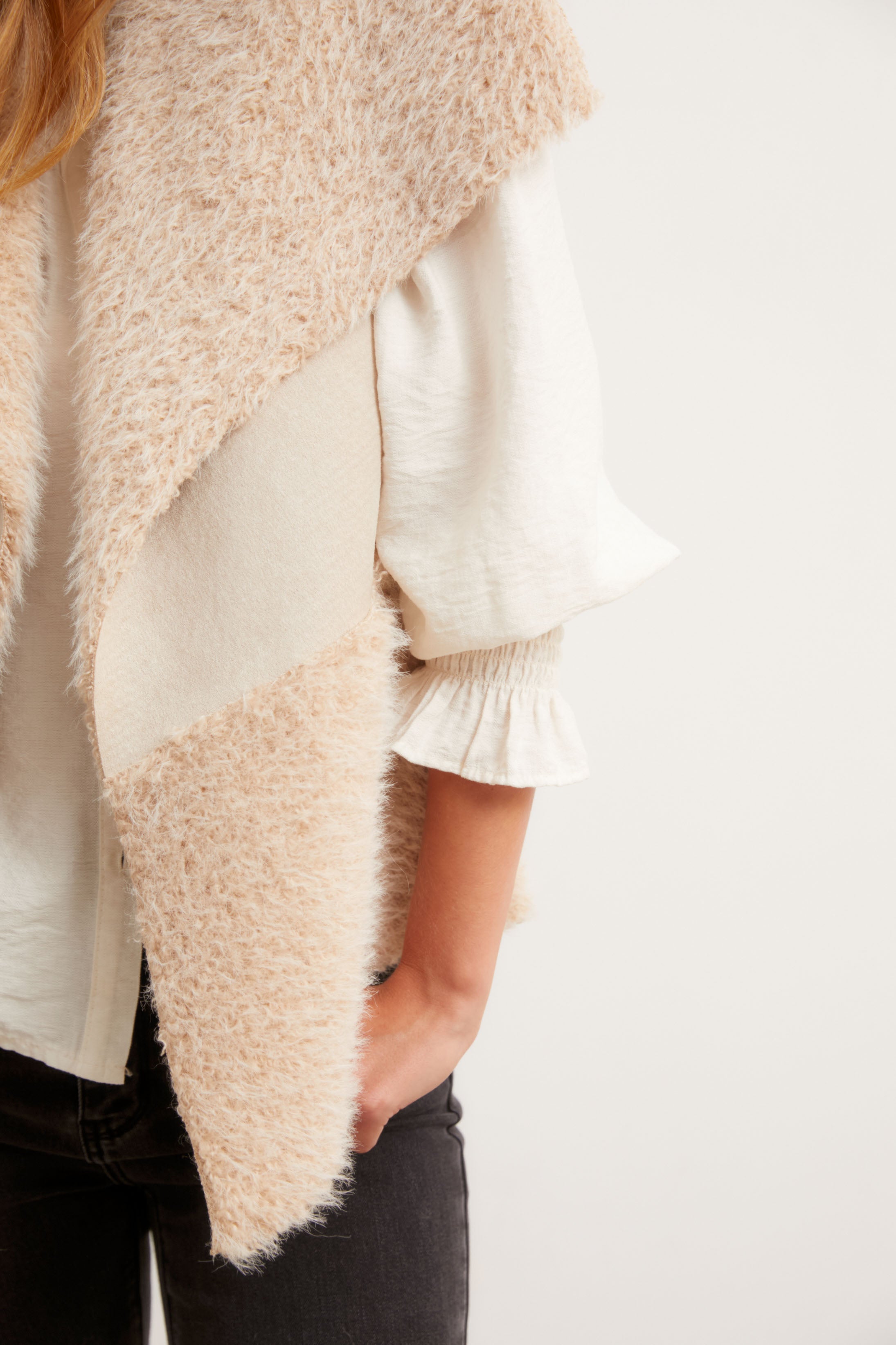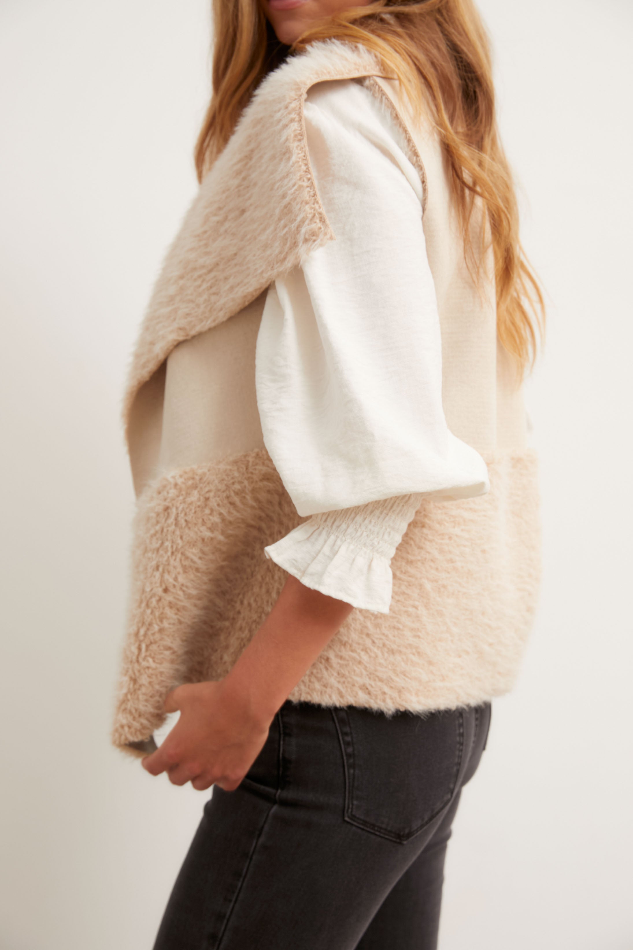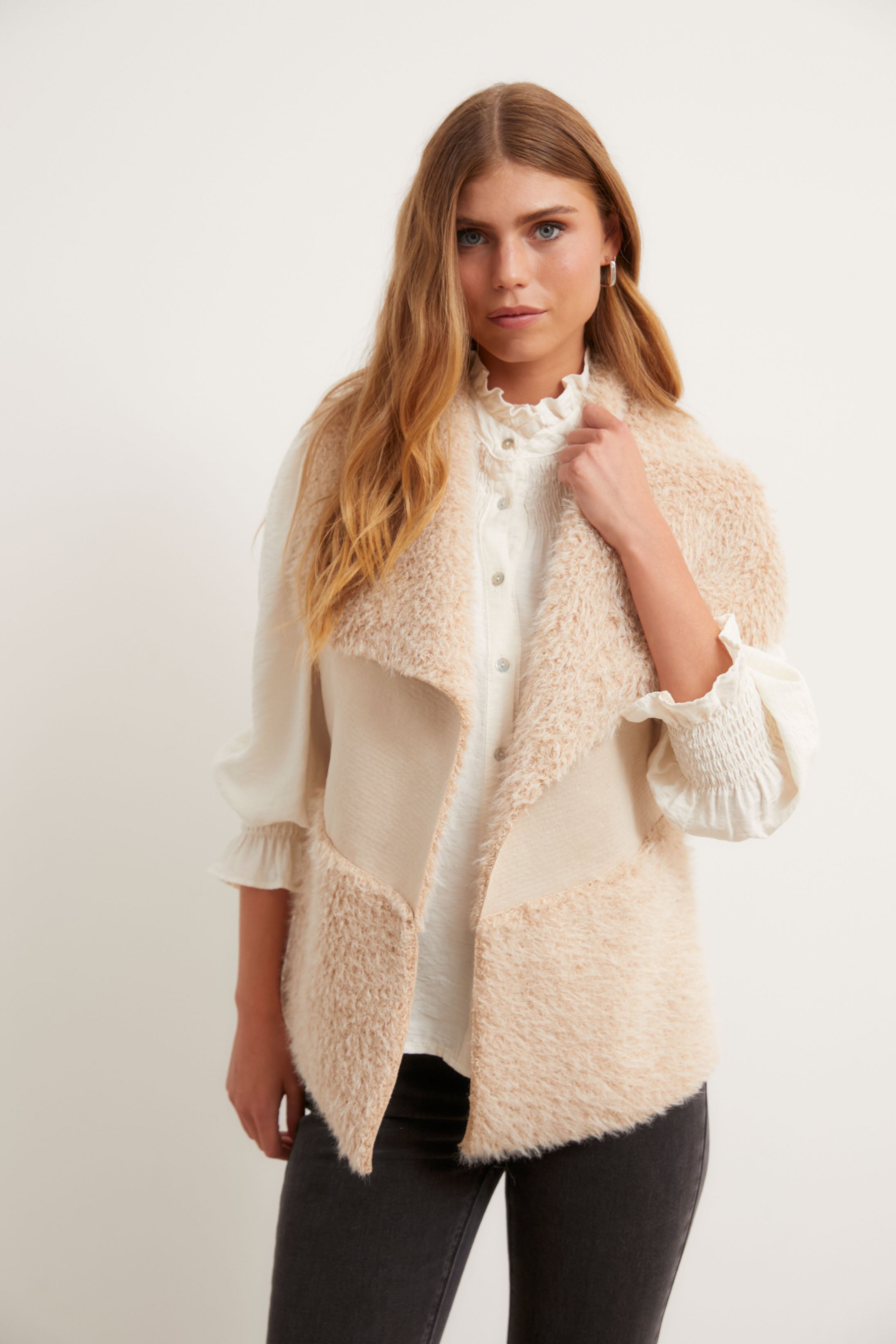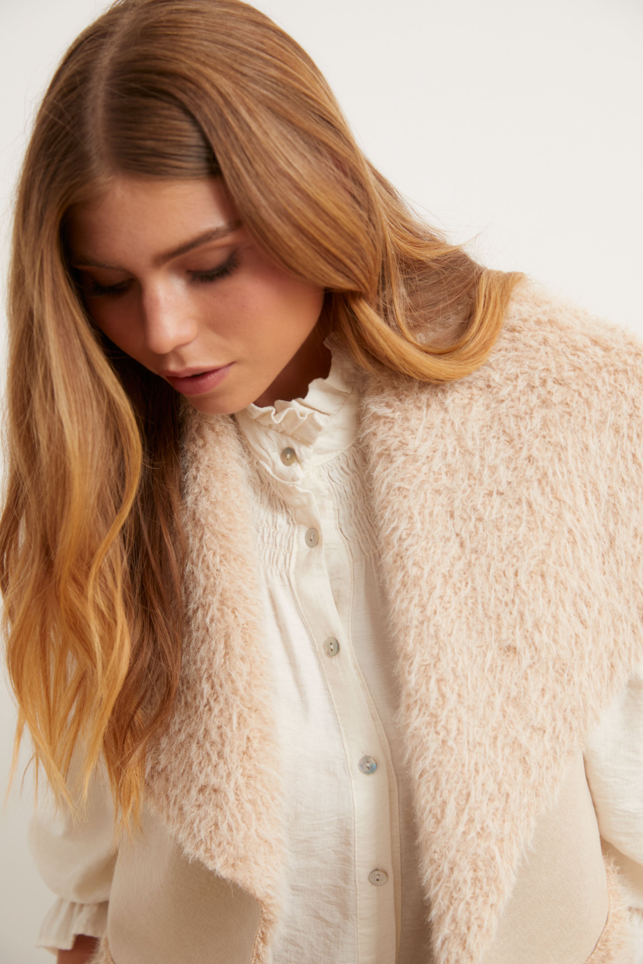 Chaleco en tono beige con textura de pelo largo y diseño abierto. Combina paneles suaves con zonas de pelo más esponjoso que aportan volumen y calidez. Su corte recto y ligeramente largo lo convierte en una prenda versátil y muy favorecedora.