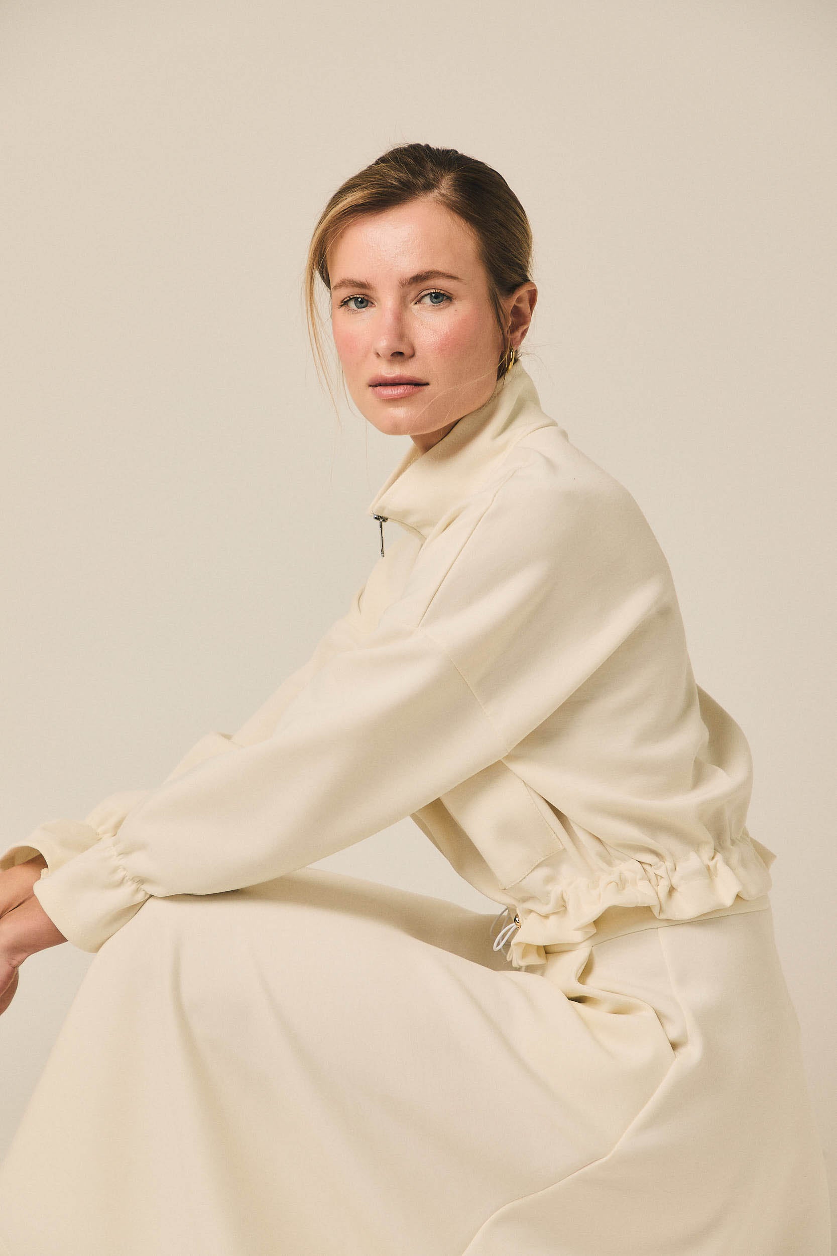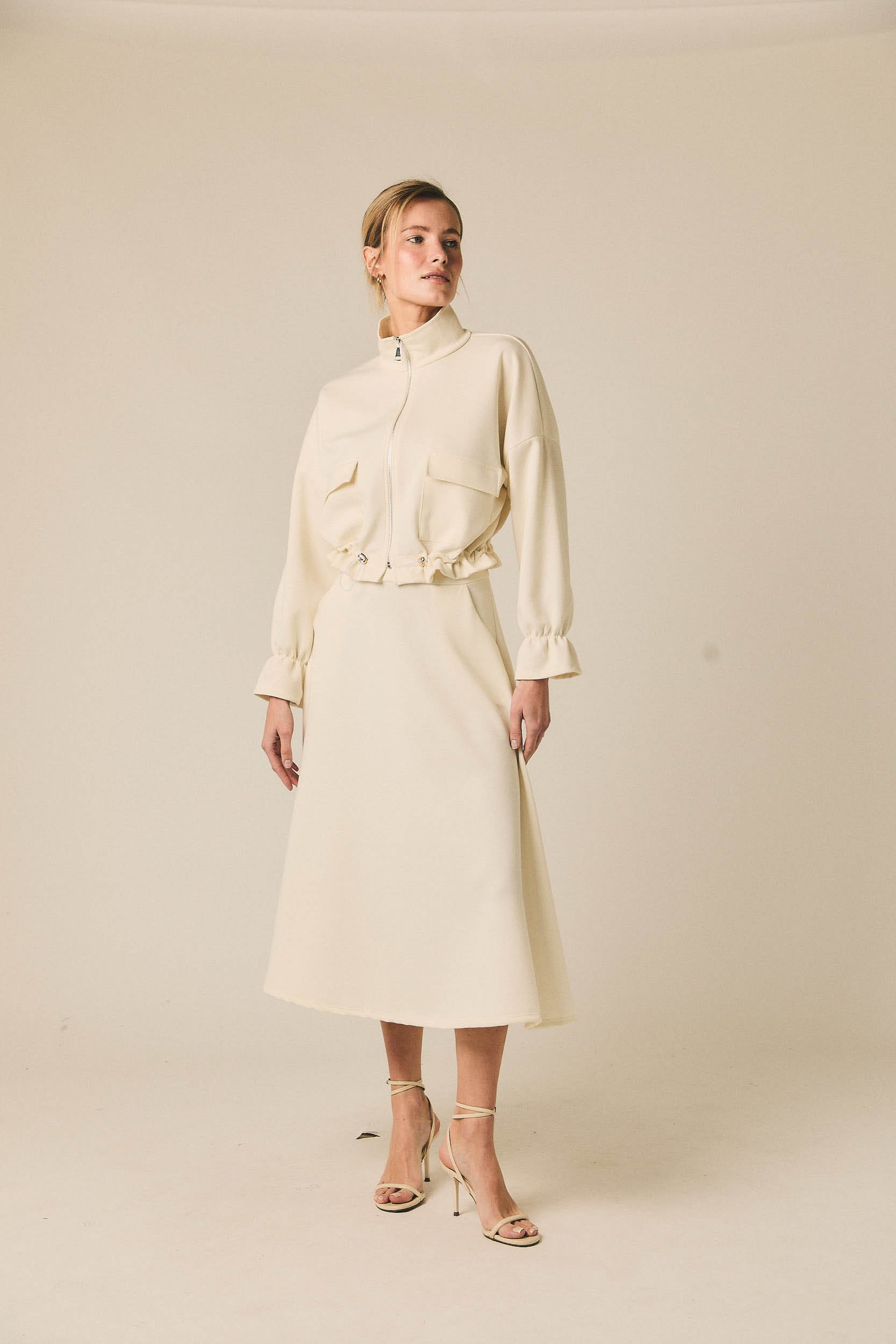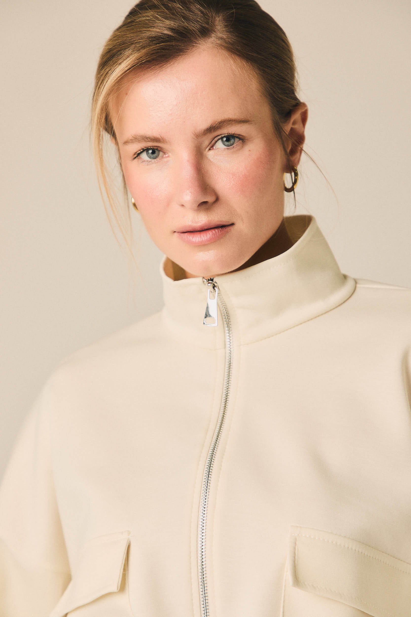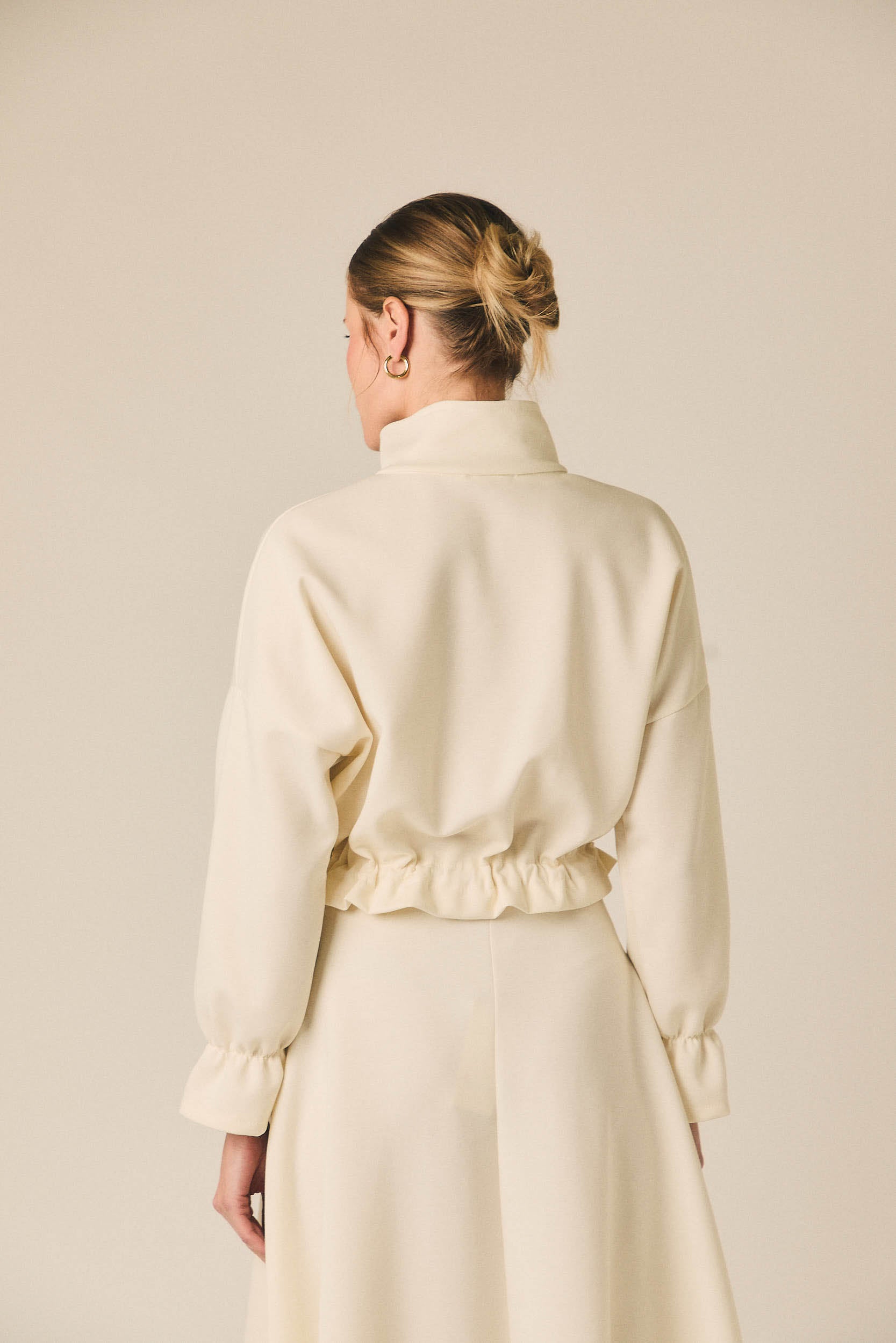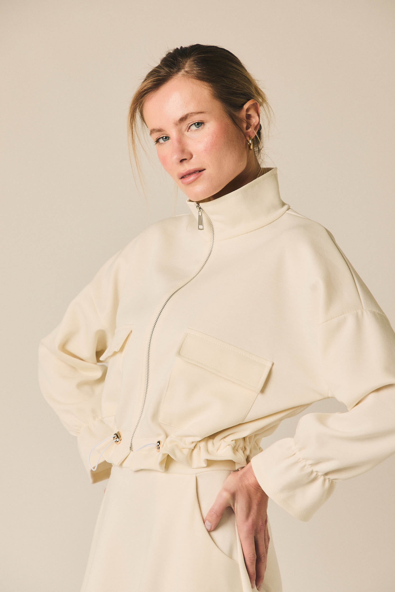Chaqueta de mujer en tejido tipo neopreno en tono crema. Diseño corto con cierre frontal de cremallera metálica y cuello ligeramente subido. Incorpora bolsillos delanteros con solapa y bajo ajustable con detalle fruncido que define la silueta.