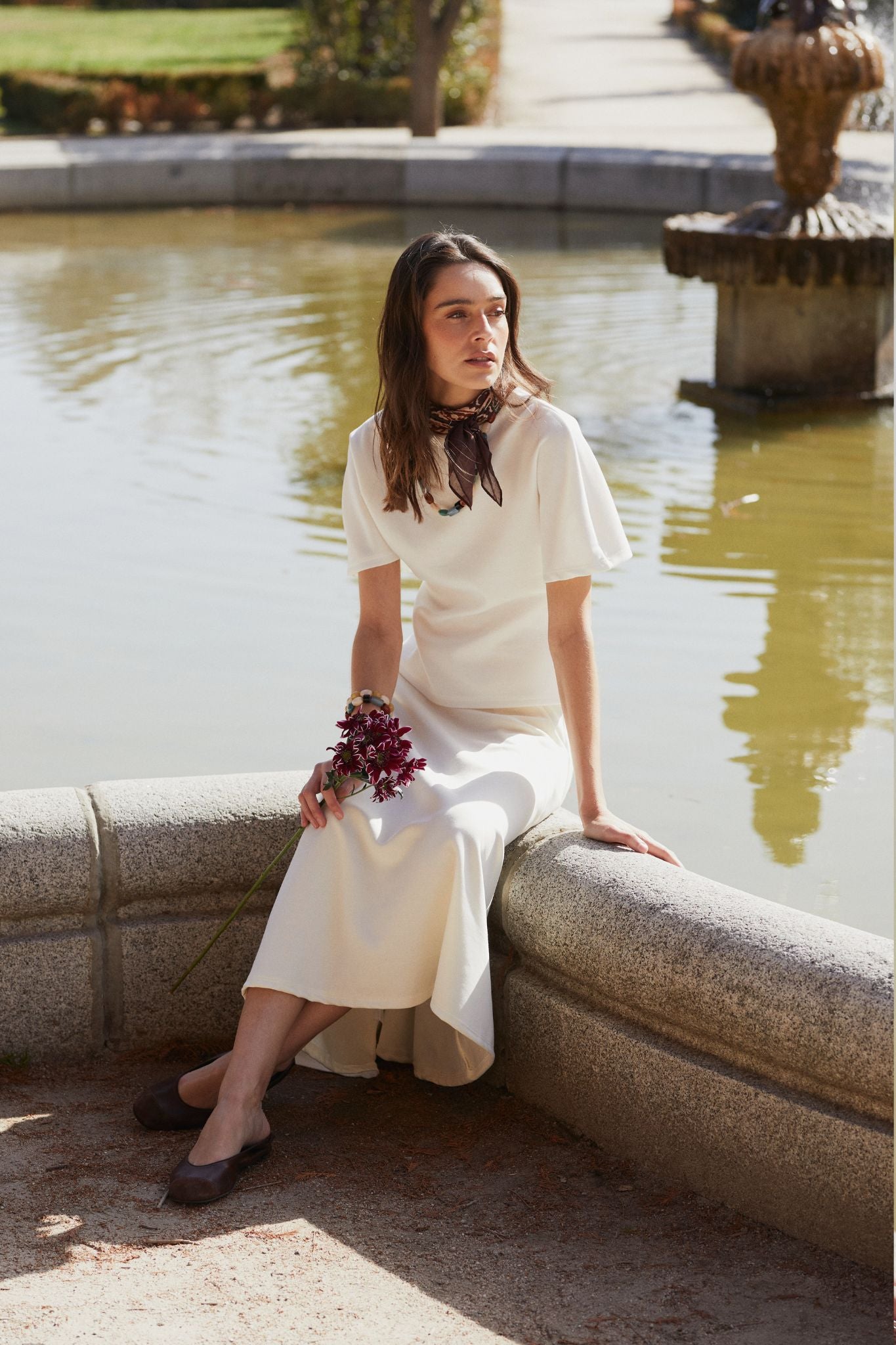 Falda midi de mujer en color crema con corte evasé y caída fluida. Diseño de tiro medio con cinturilla ancha que estiliza la silueta. Largo por debajo de la rodilla y bajo ligeramente acampanado que aporta movimiento al caminar. Incorpora bolsillos laterales discretos que suman funcionalidad.