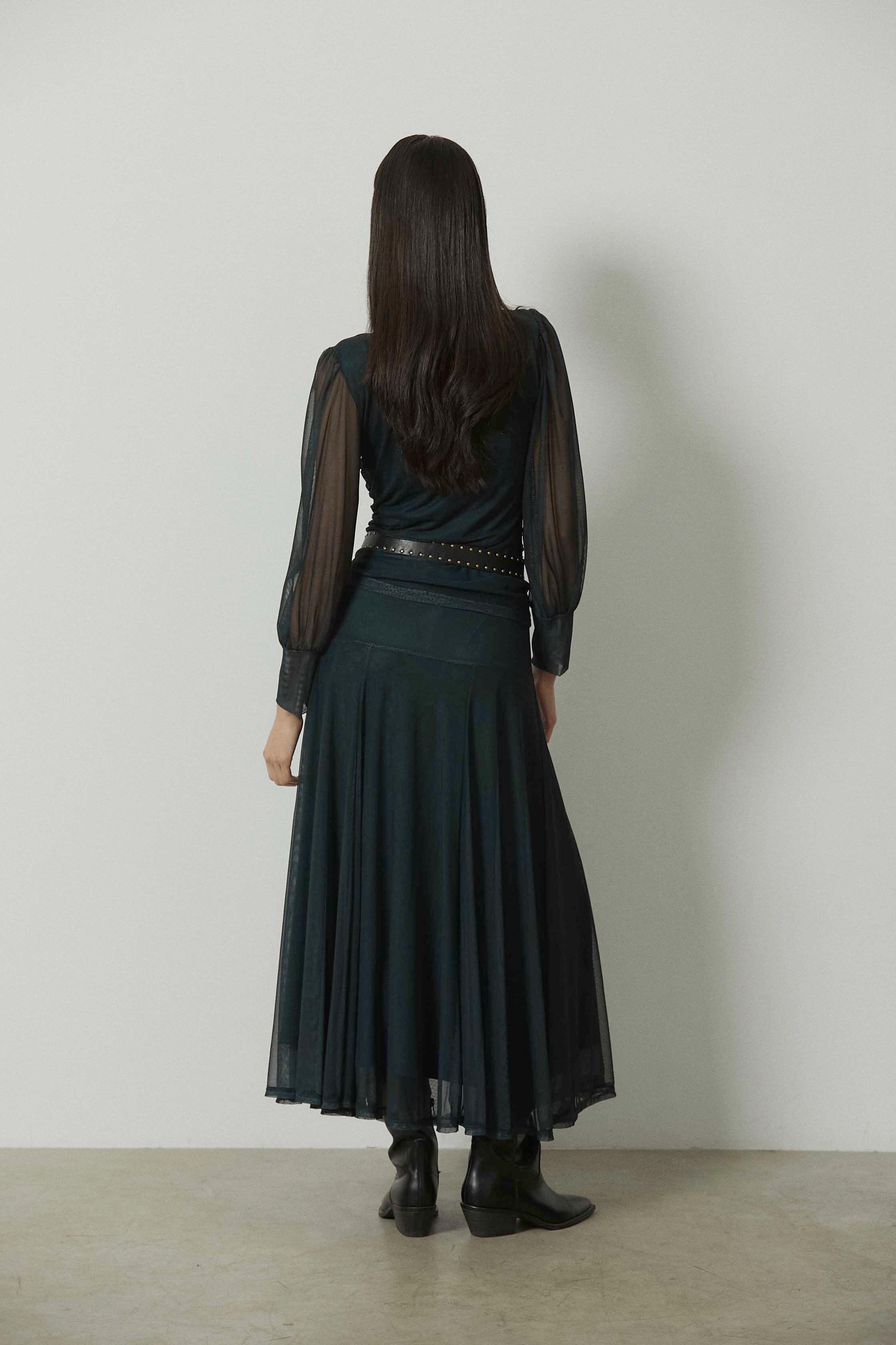 Falda larga de tul en color verde, con caída fluida y ligera transparencia. Presenta cintura elástica que se adapta cómodamente al cuerpo y un diseño limpio que acompaña el movimiento al caminar. Su largo midi–maxi y el tejido vaporoso crean una silueta suave y continua.