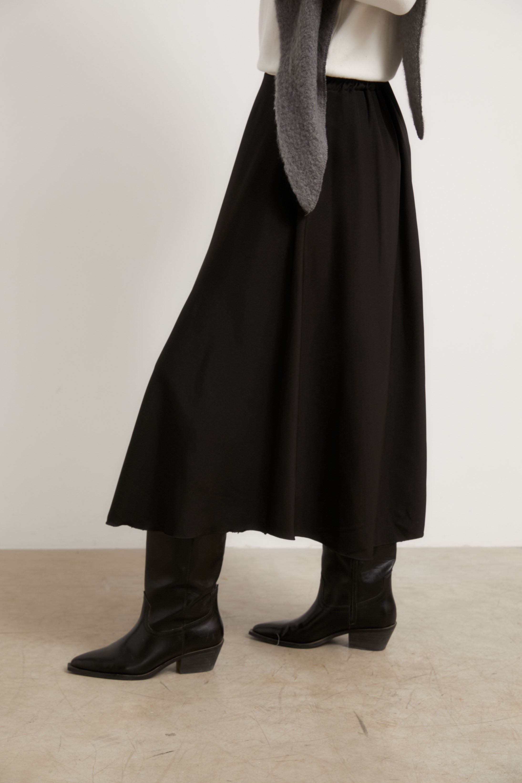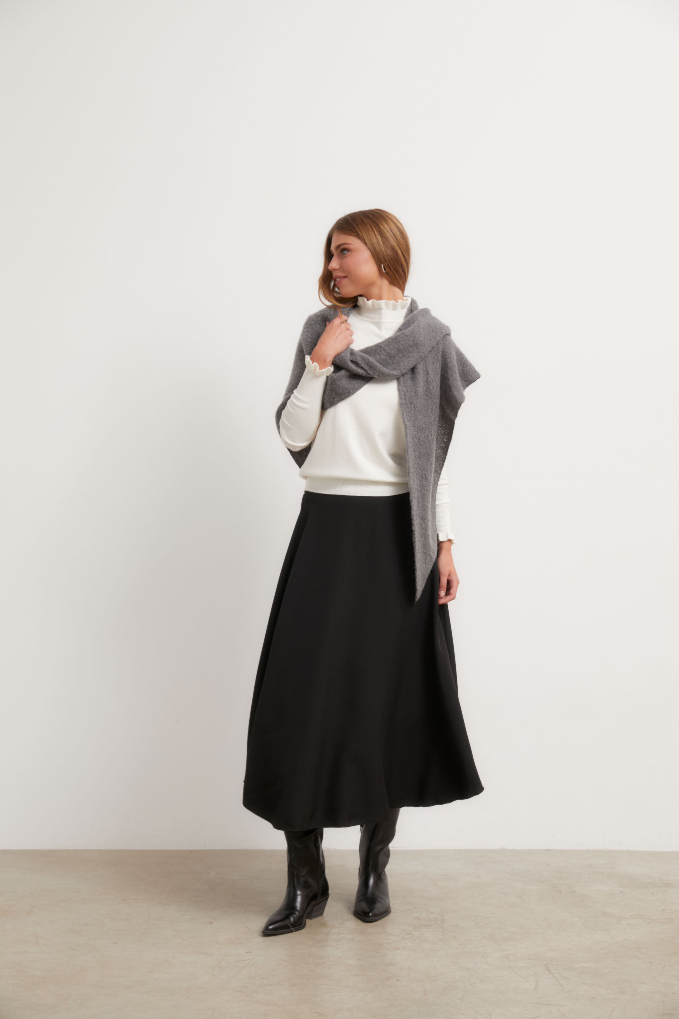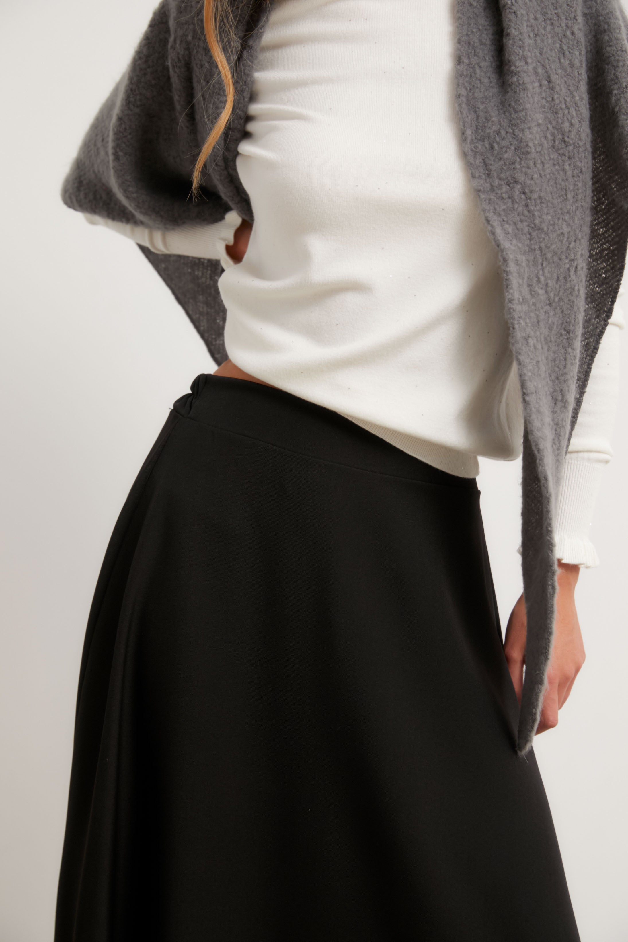 Falda midi en color negro con corte de vuelo y tejido de caída suave. La cintura elástica se adapta cómodamente, realzando la silueta sin perder movimiento. Su diseño limpio y fluido aporta un toque elegante y versátil a cualquier look.