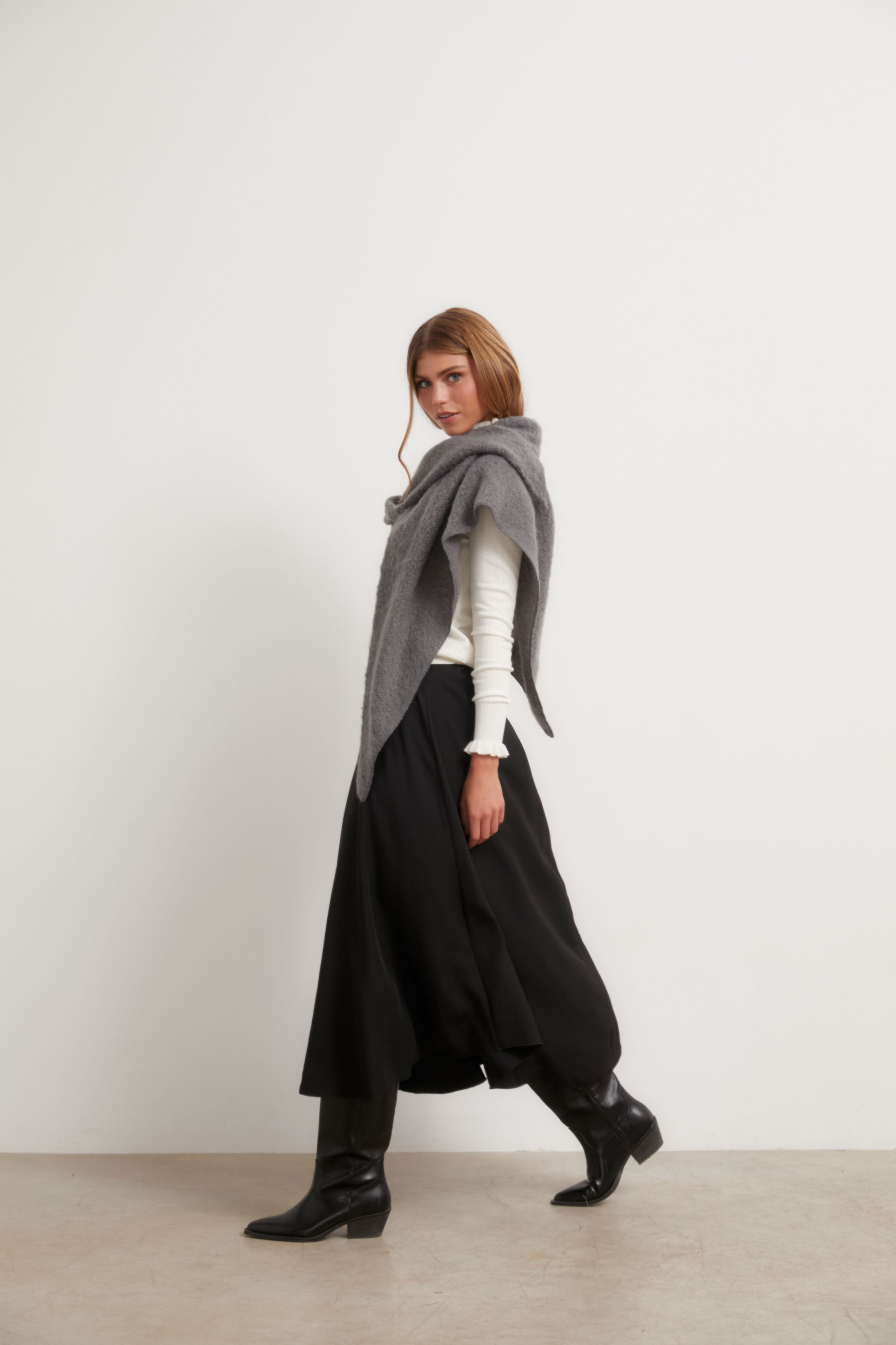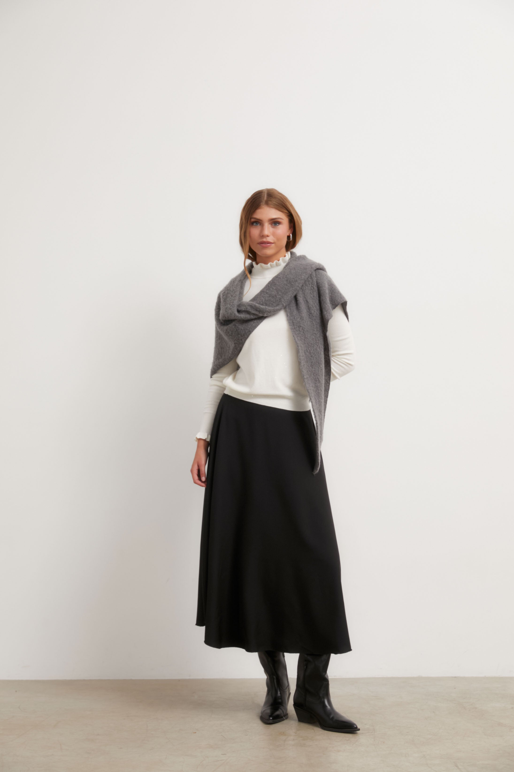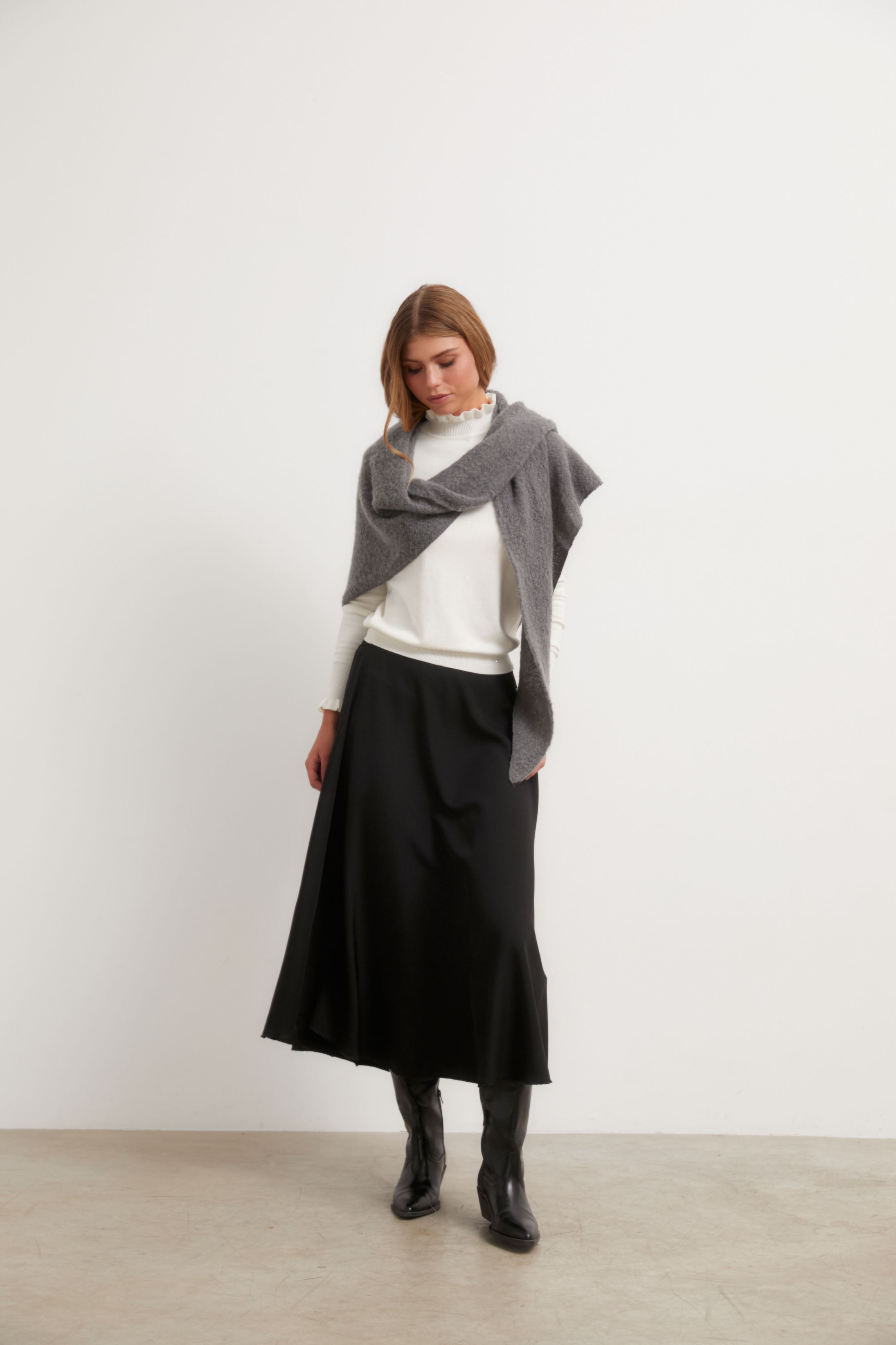 Falda midi en color negro con corte de vuelo y tejido de caída suave. La cintura elástica se adapta cómodamente, realzando la silueta sin perder movimiento. Su diseño limpio y fluido aporta un toque elegante y versátil a cualquier look.