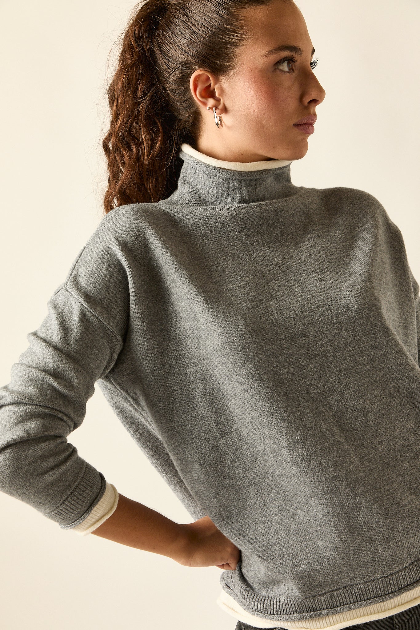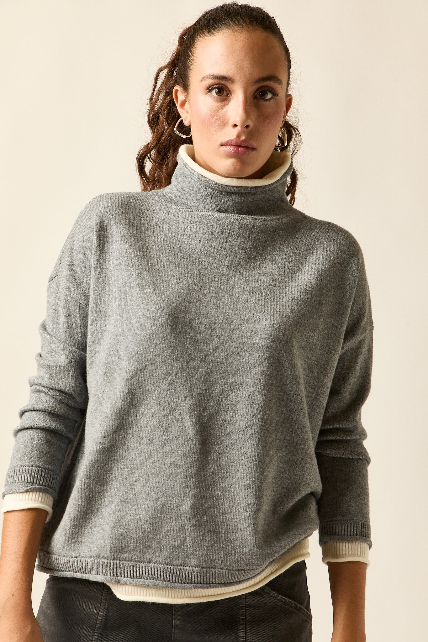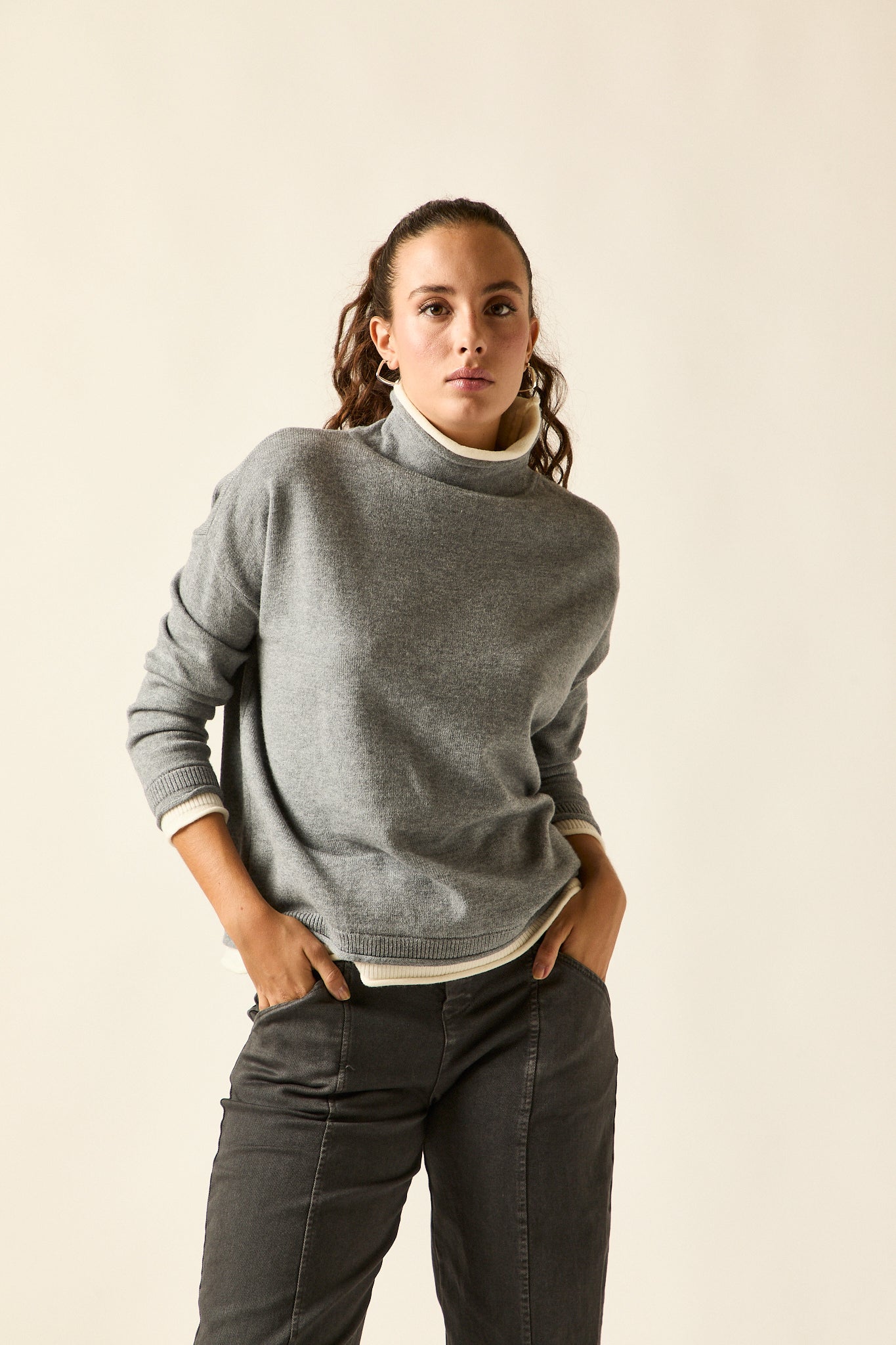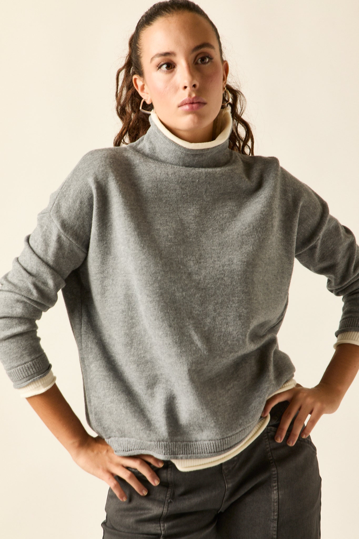 Jersey de punto fino en tono gris con vivos en beige en el bajo, cuello interior y puños. De cuello subido, hombro caído y corte recto con caída fluida, combina comodidad y estilo en una prenda versátil y atemporal.