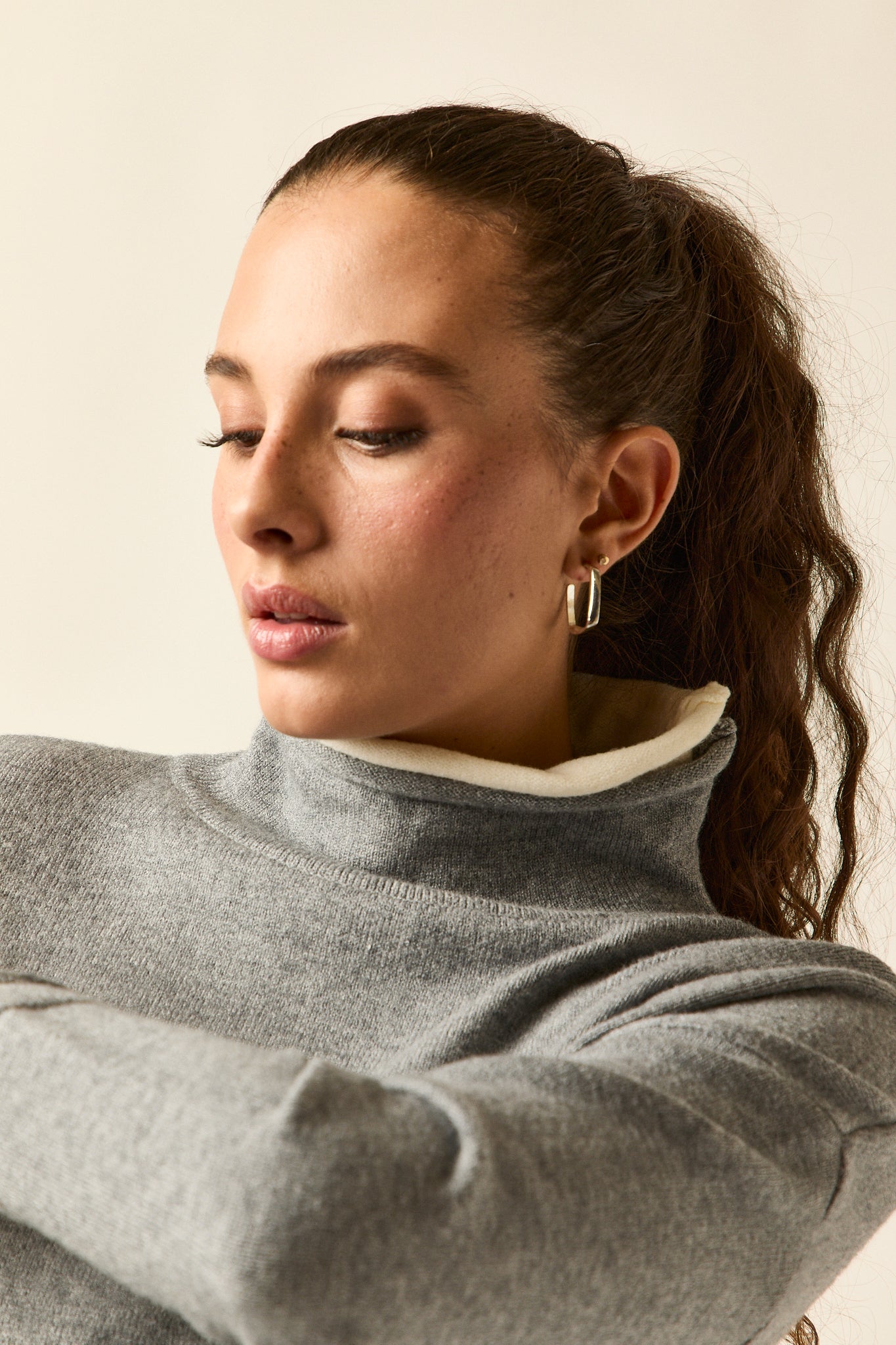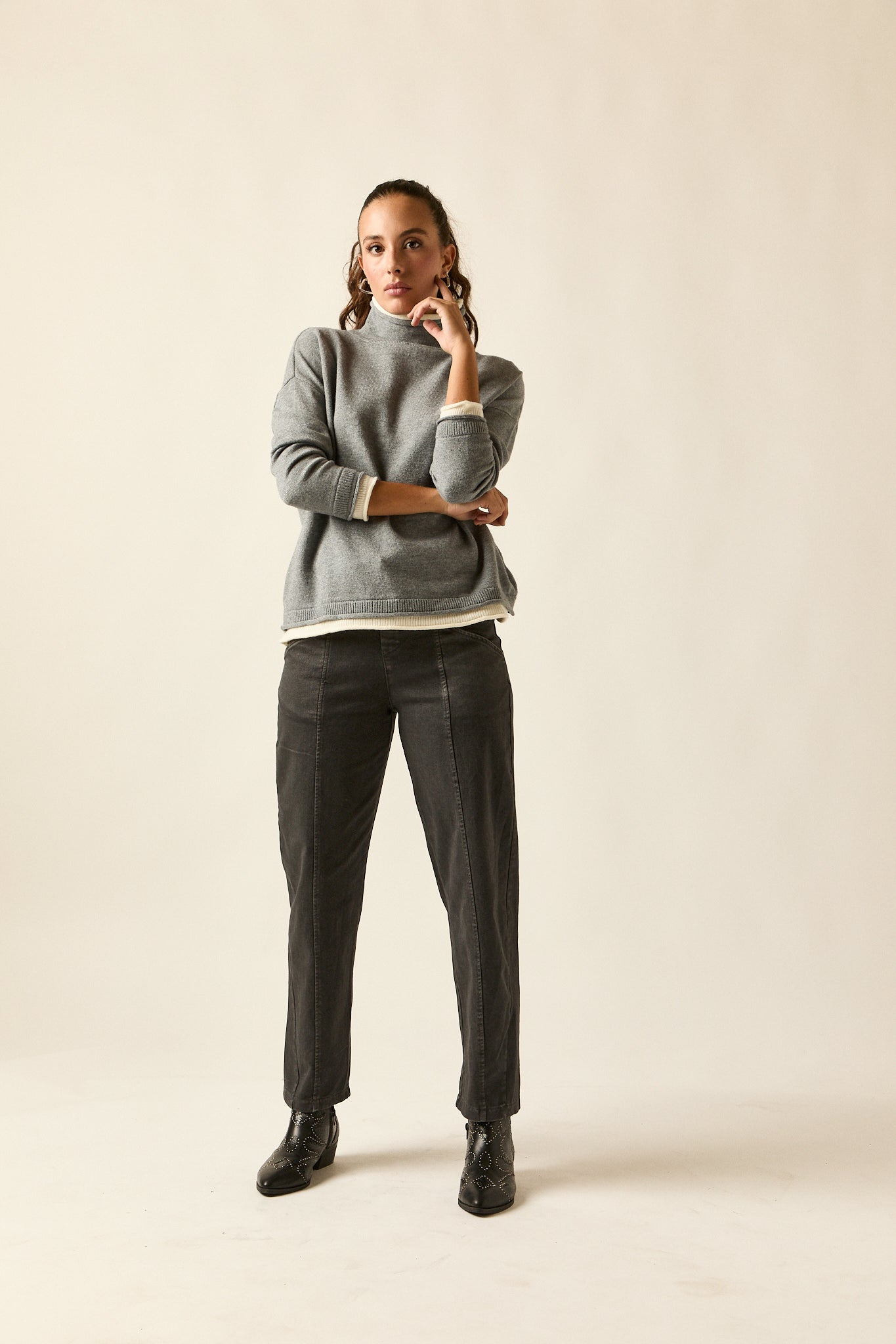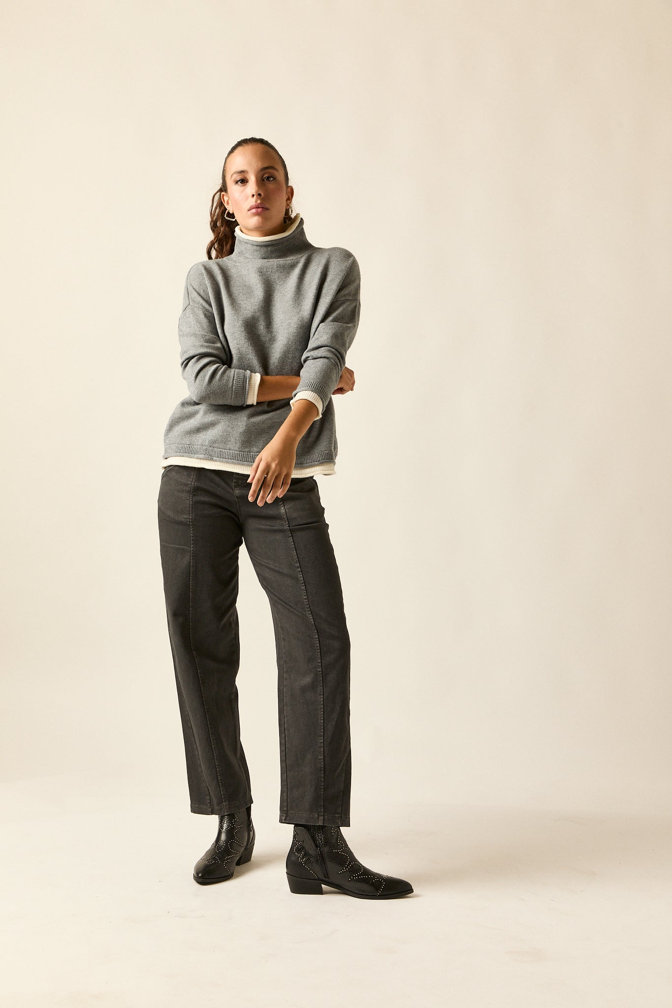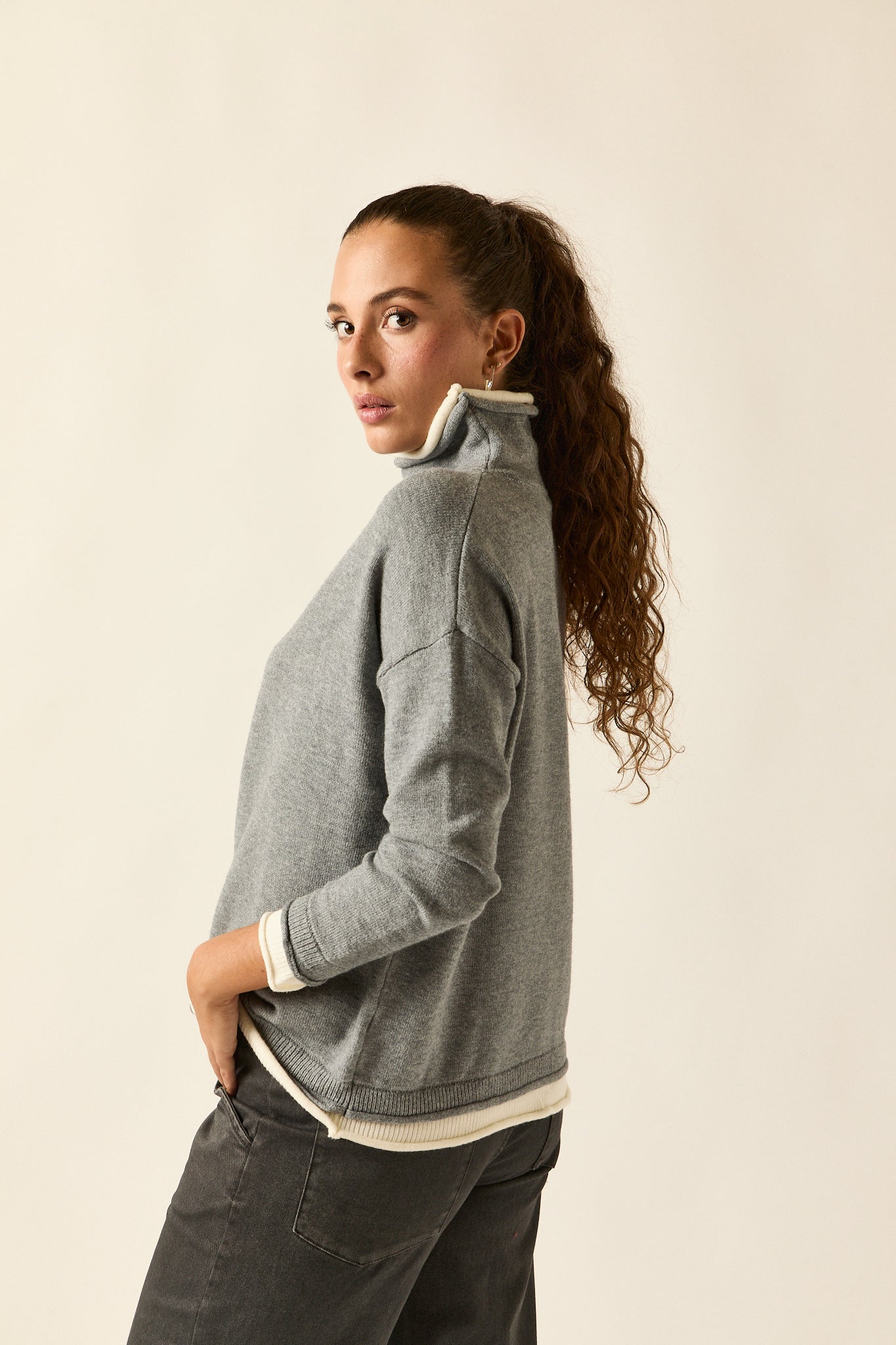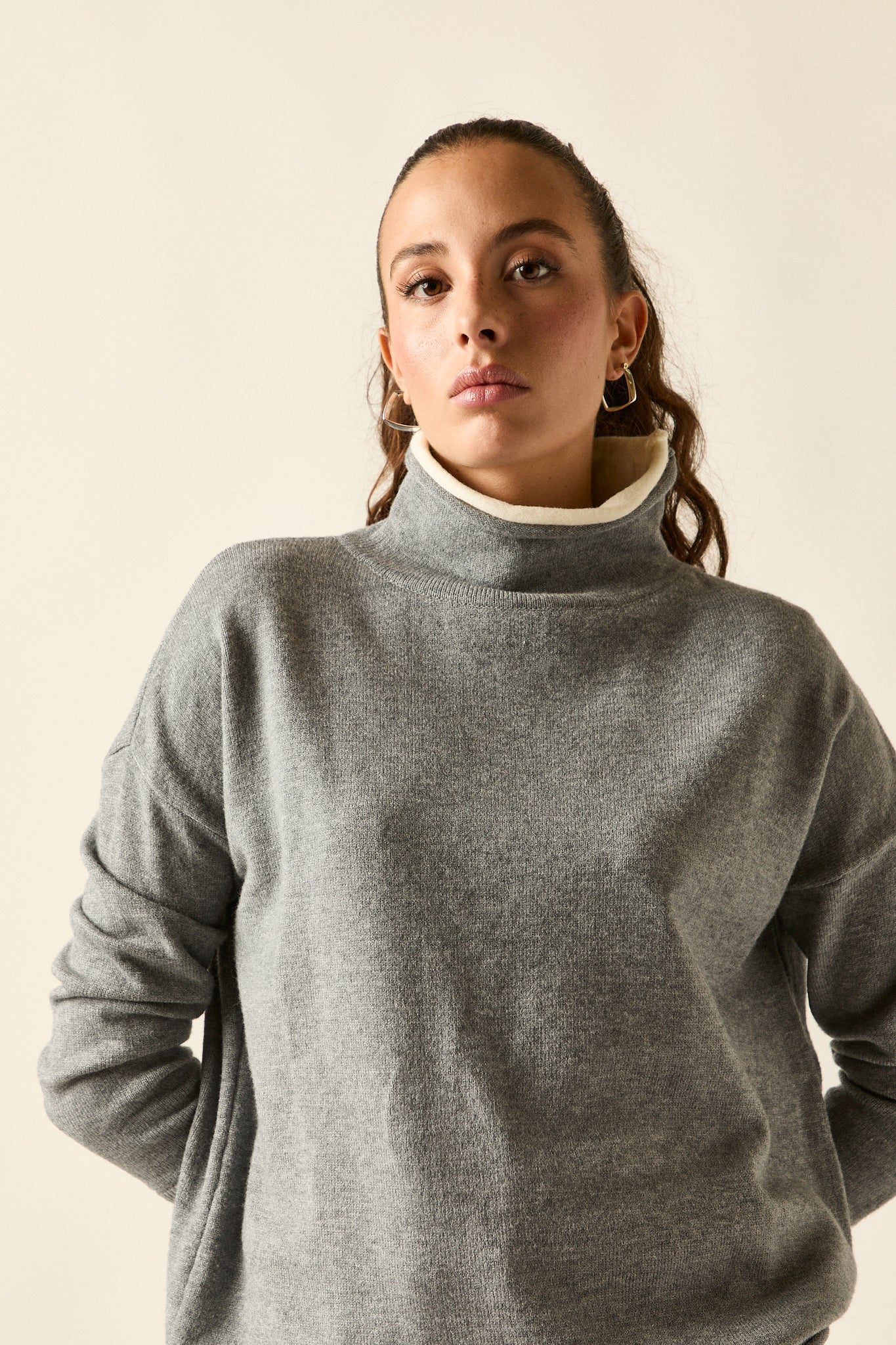Jersey de punto fino en tono gris con vivos en beige en el bajo, cuello interior y puños. De cuello subido, hombro caído y corte recto con caída fluida, combina comodidad y estilo en una prenda versátil y atemporal.