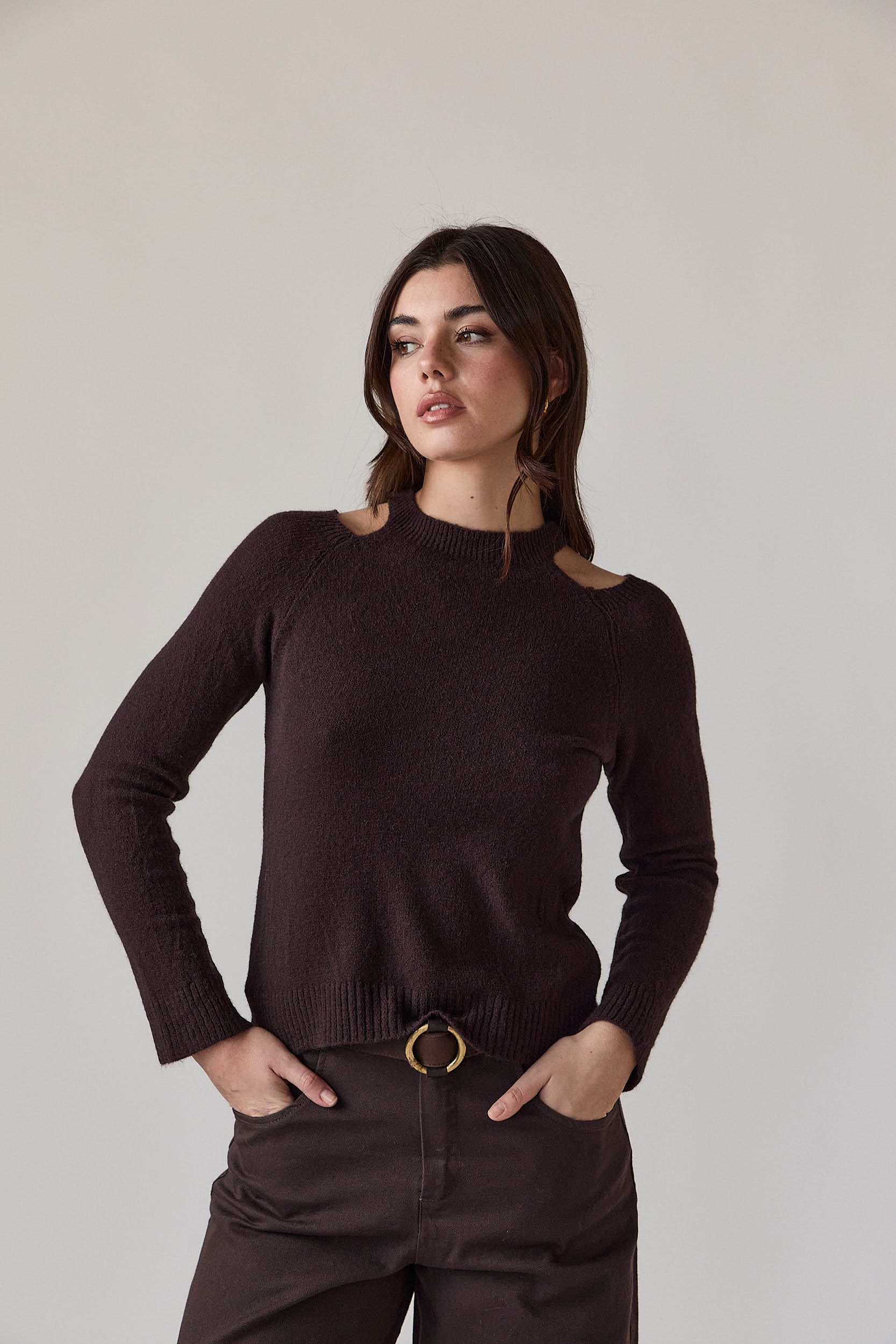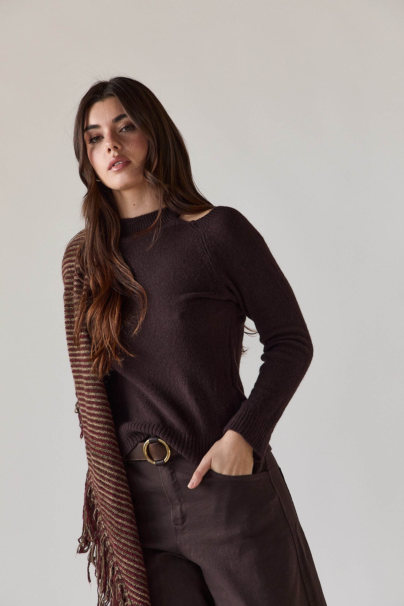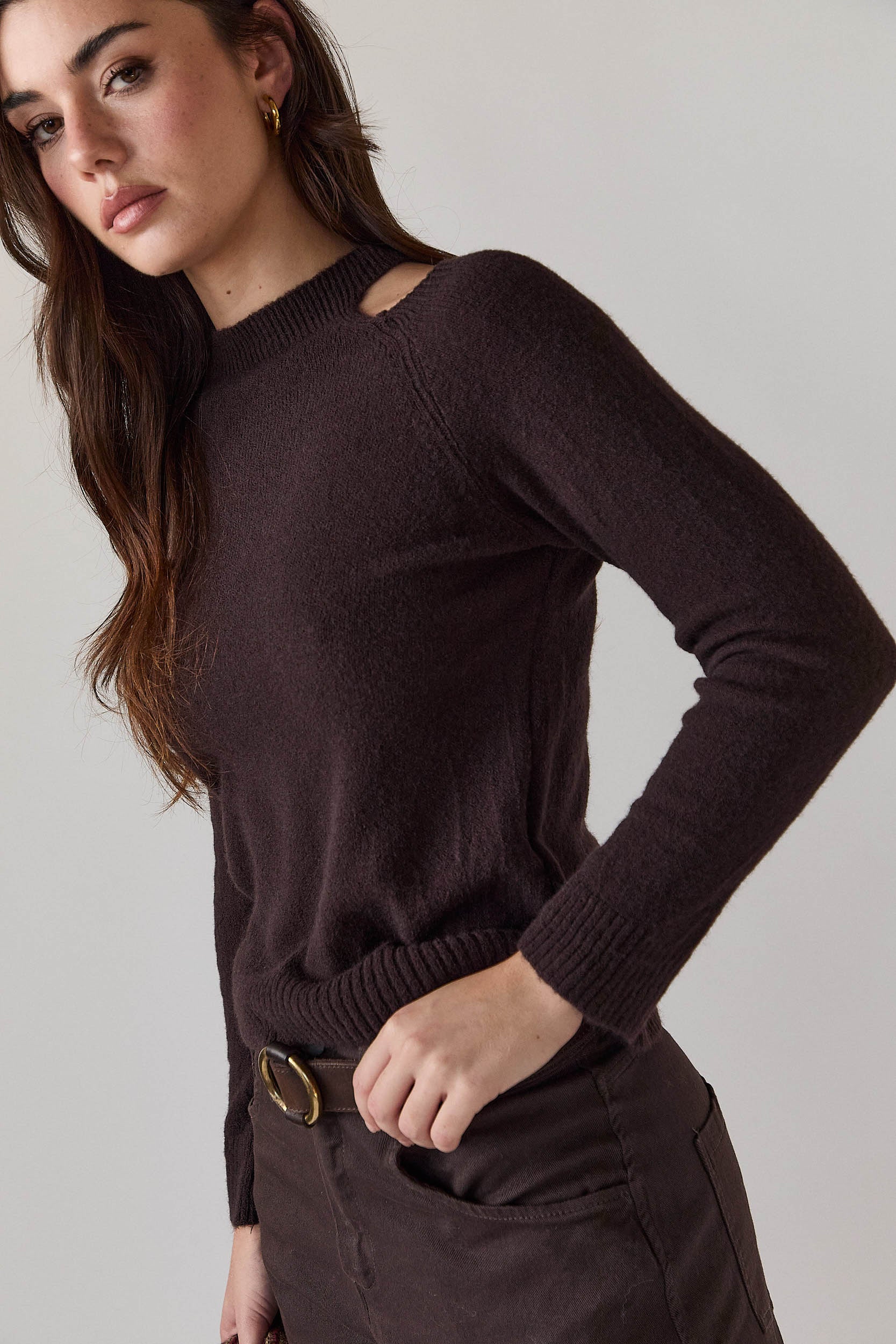 Jersey de punto suave en tono marrón, con aberturas cut out en los hombros que aportan un toque actual al diseño. Incluye cuello redondo, manga larga y un fit cómodo que acompaña la silueta sin ajustar.