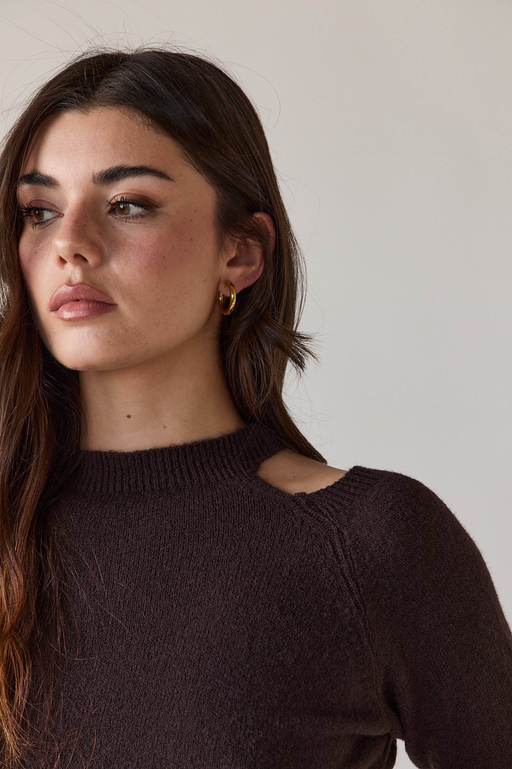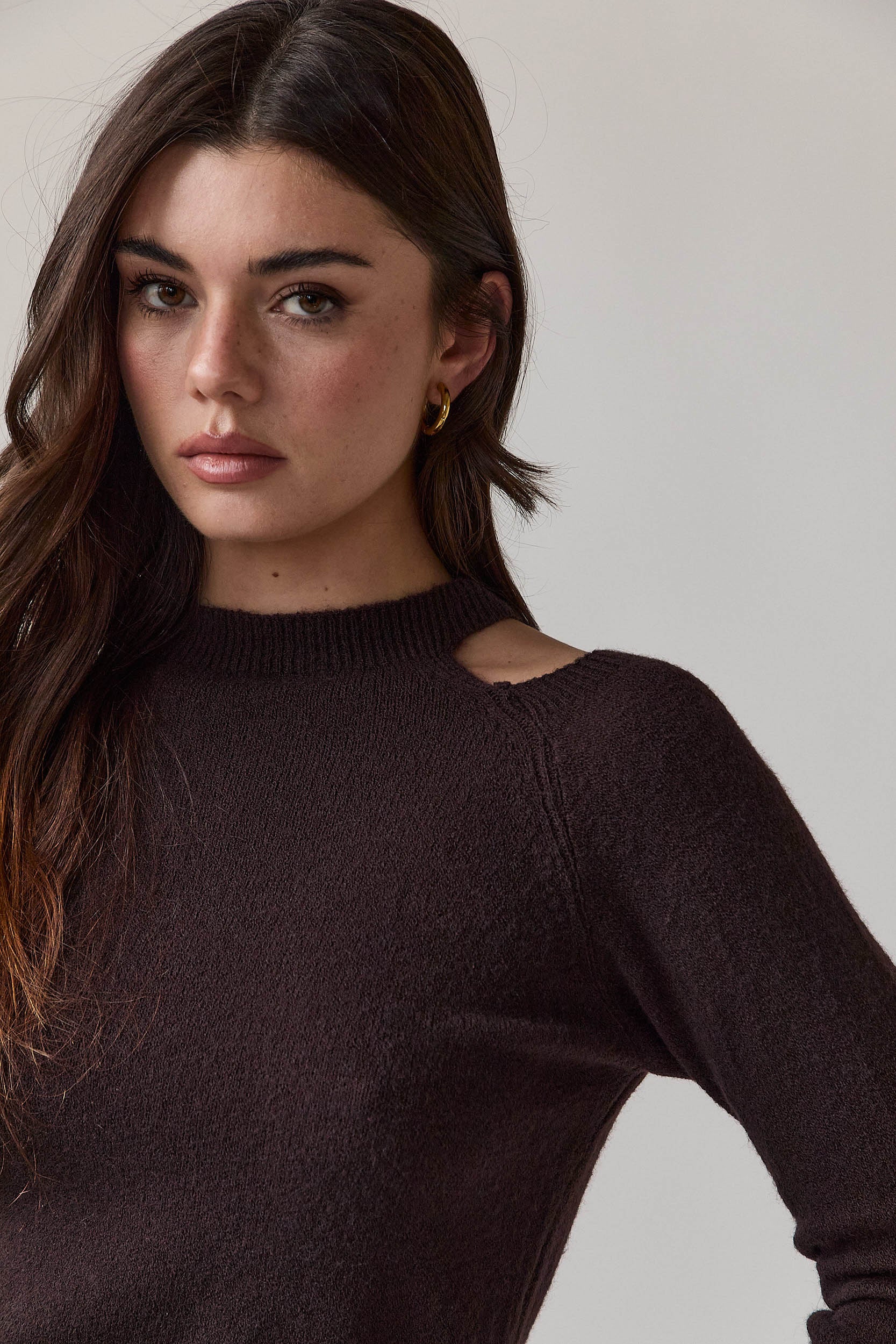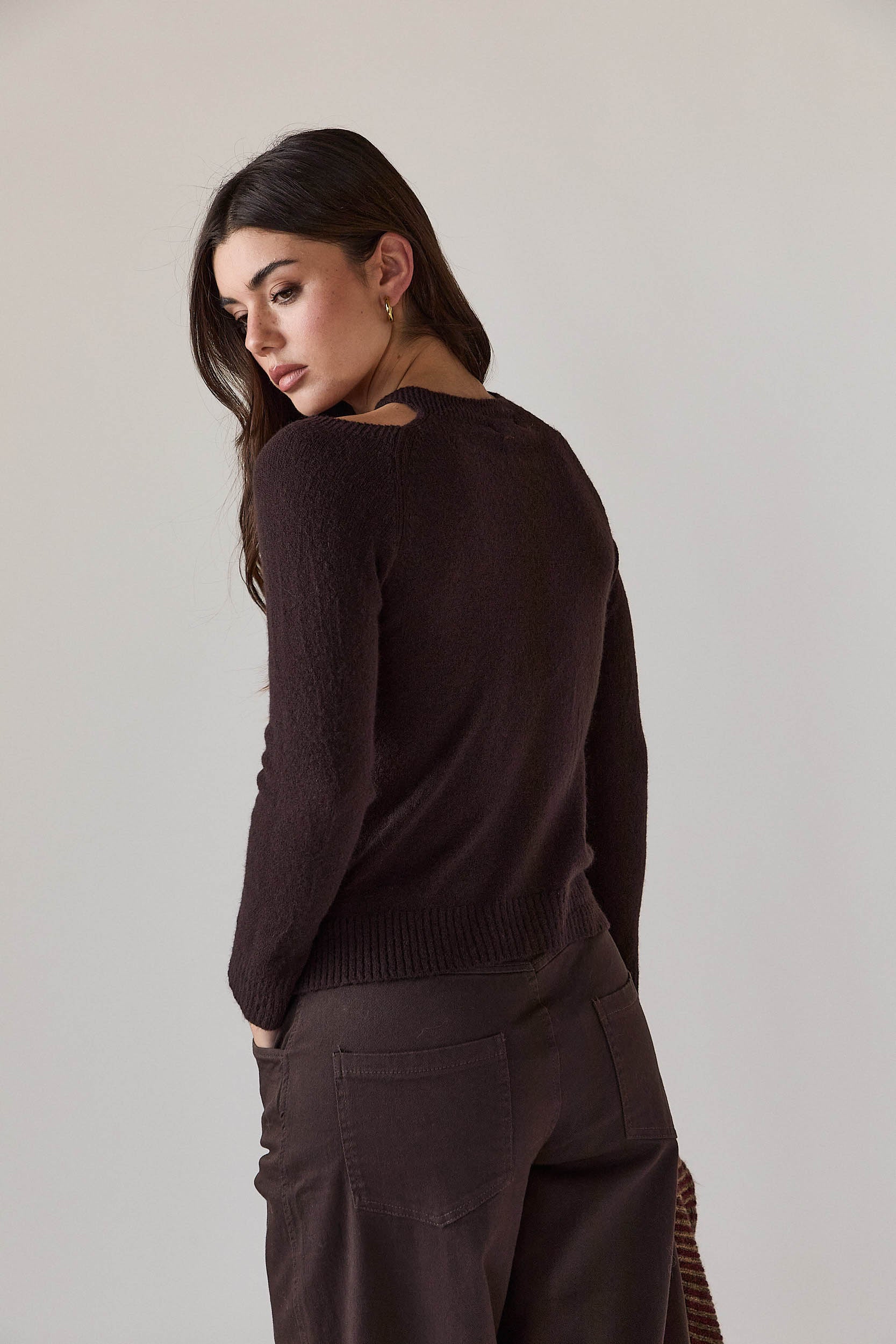Jersey de punto suave en tono marrón, con aberturas cut out en los hombros que aportan un toque actual al diseño. Incluye cuello redondo, manga larga y un fit cómodo que acompaña la silueta sin ajustar.