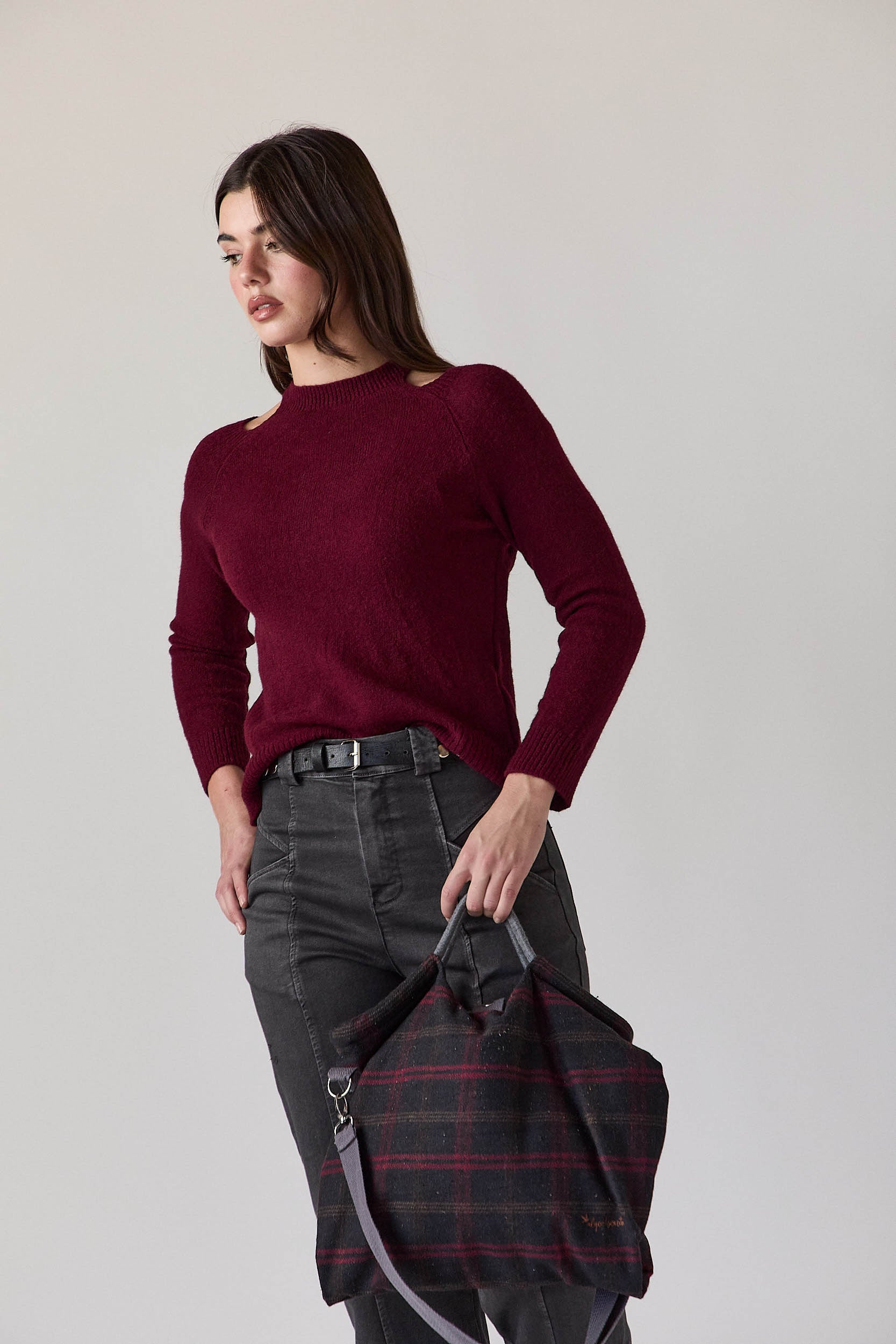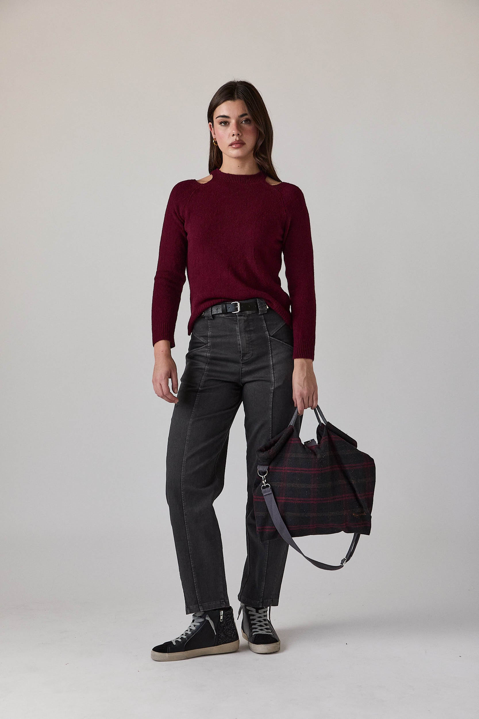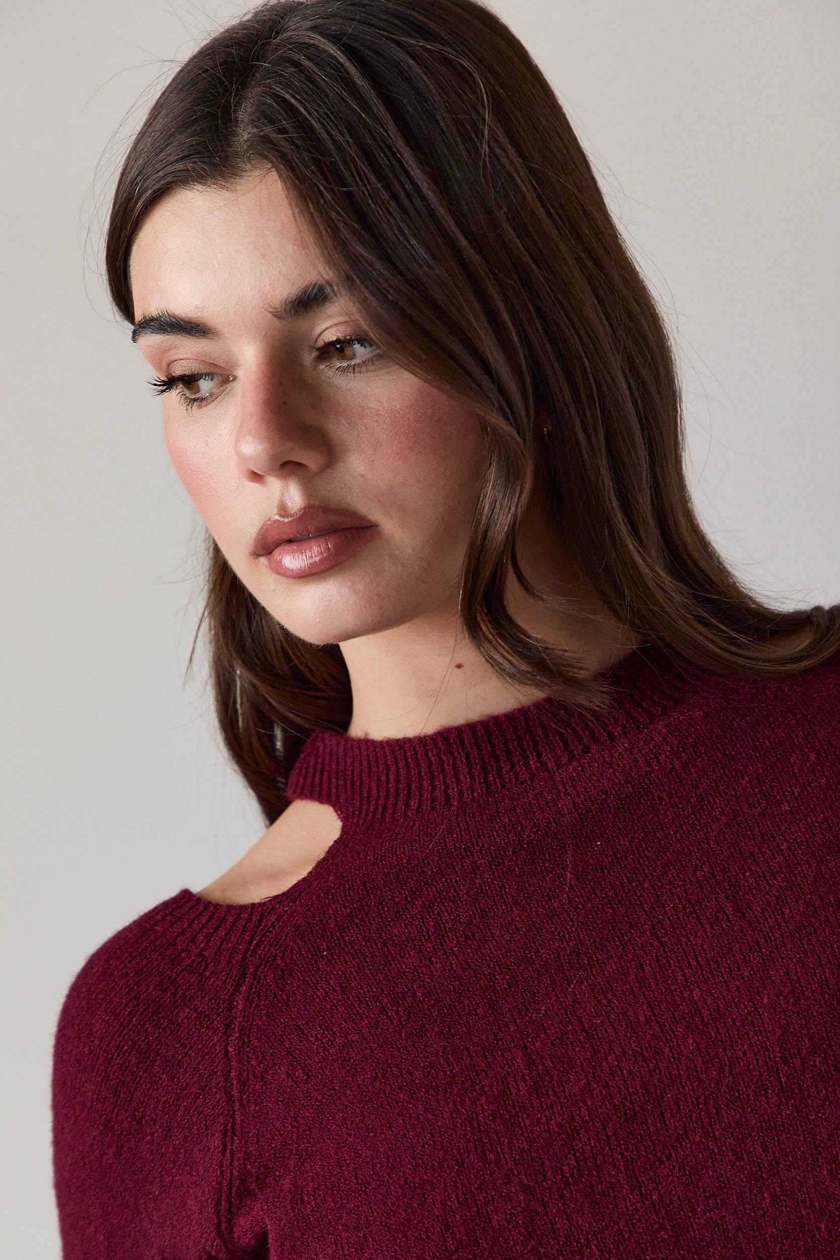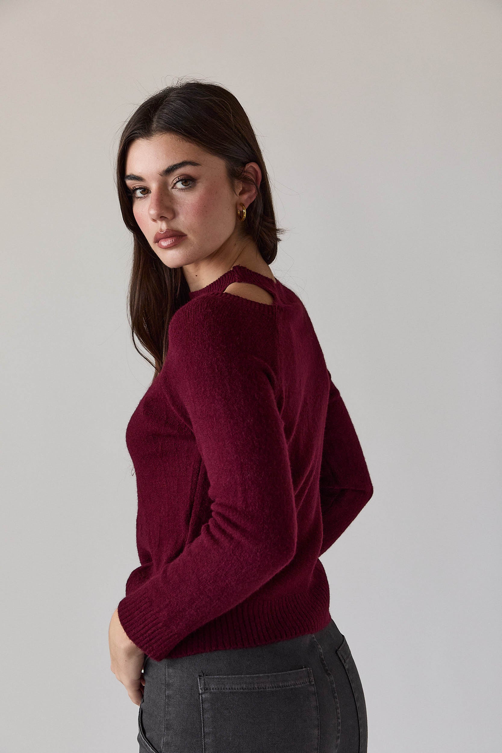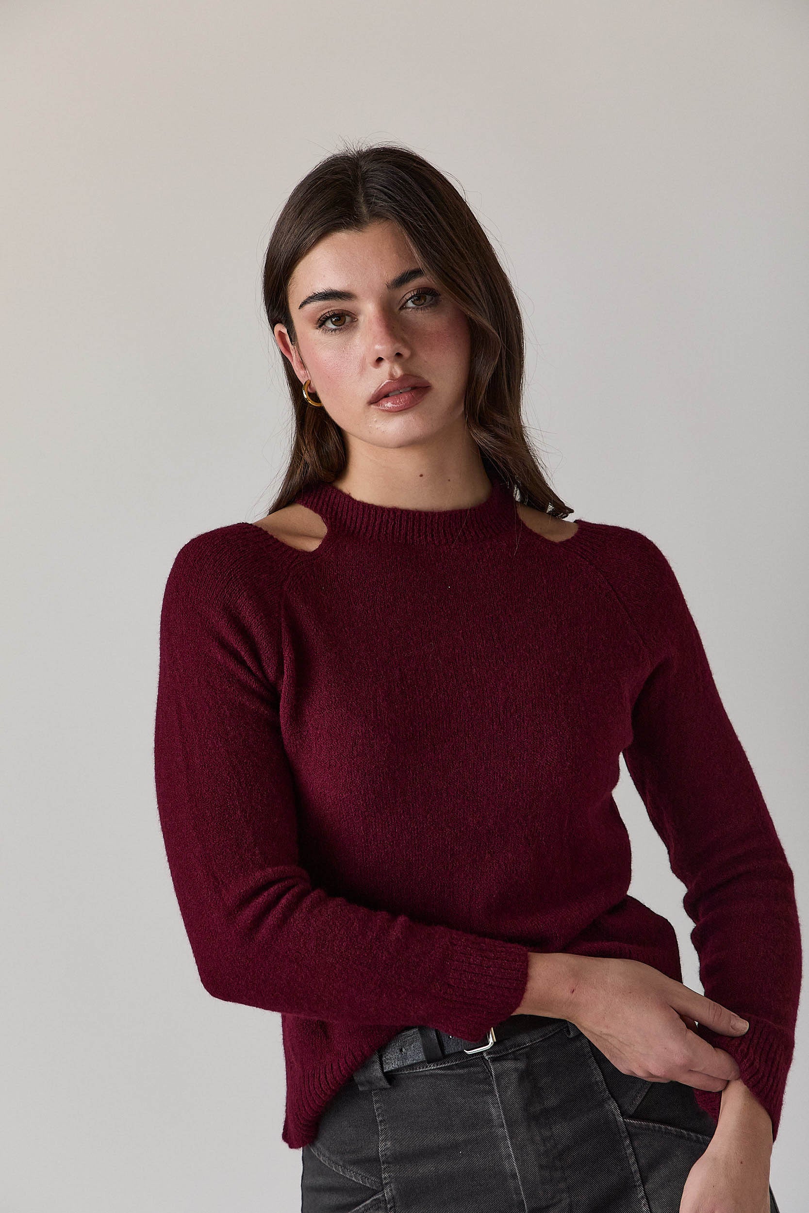 Jersey de punto suave en tono vino, con detalle cut out en ambos hombros que aporta un toque moderno al diseño. Presenta cuello redondo, manga larga y un fit cómodo que se adapta al cuerpo sin ajustar.