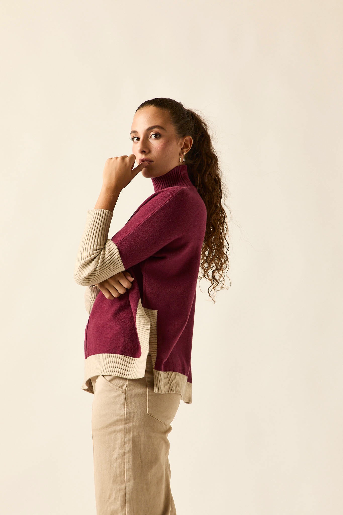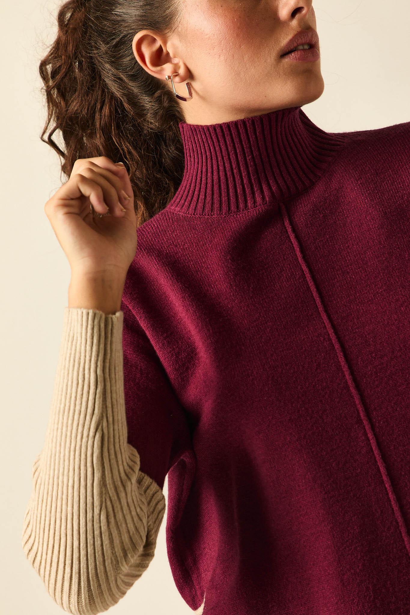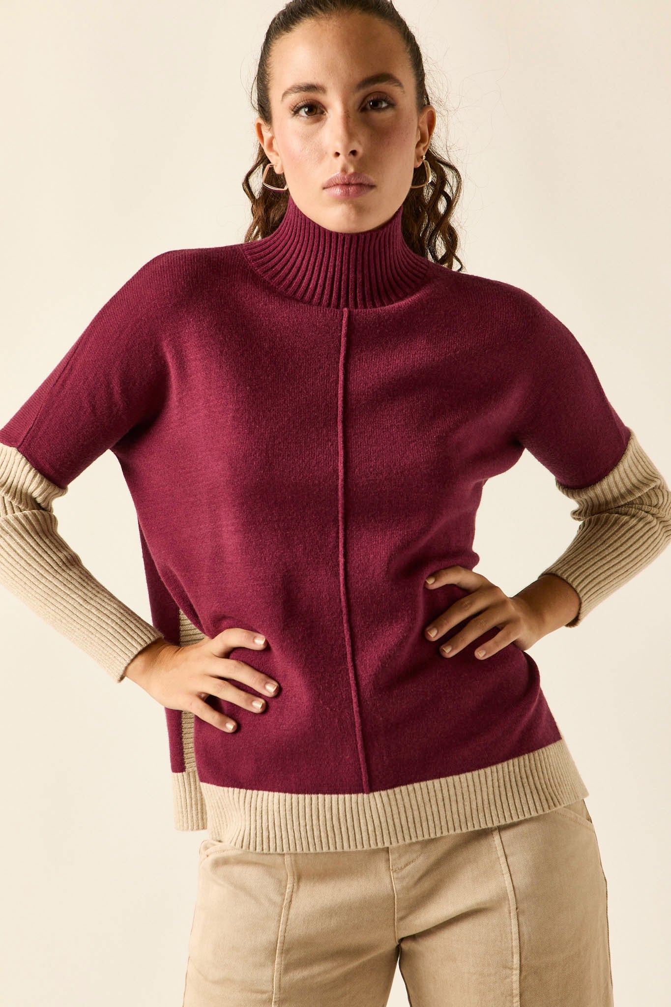 Jersey de punto suave en tono vino con mangas y ribetes en contraste beige. Presenta cuello alto de canalé, costura central decorativa y aberturas laterales que aportan movimiento y comodidad. Su diseño amplio y los detalles bicolor lo convierten en una prenda versátil y con personalidad.