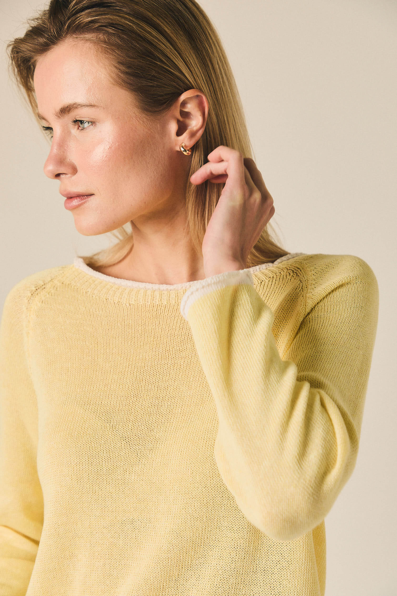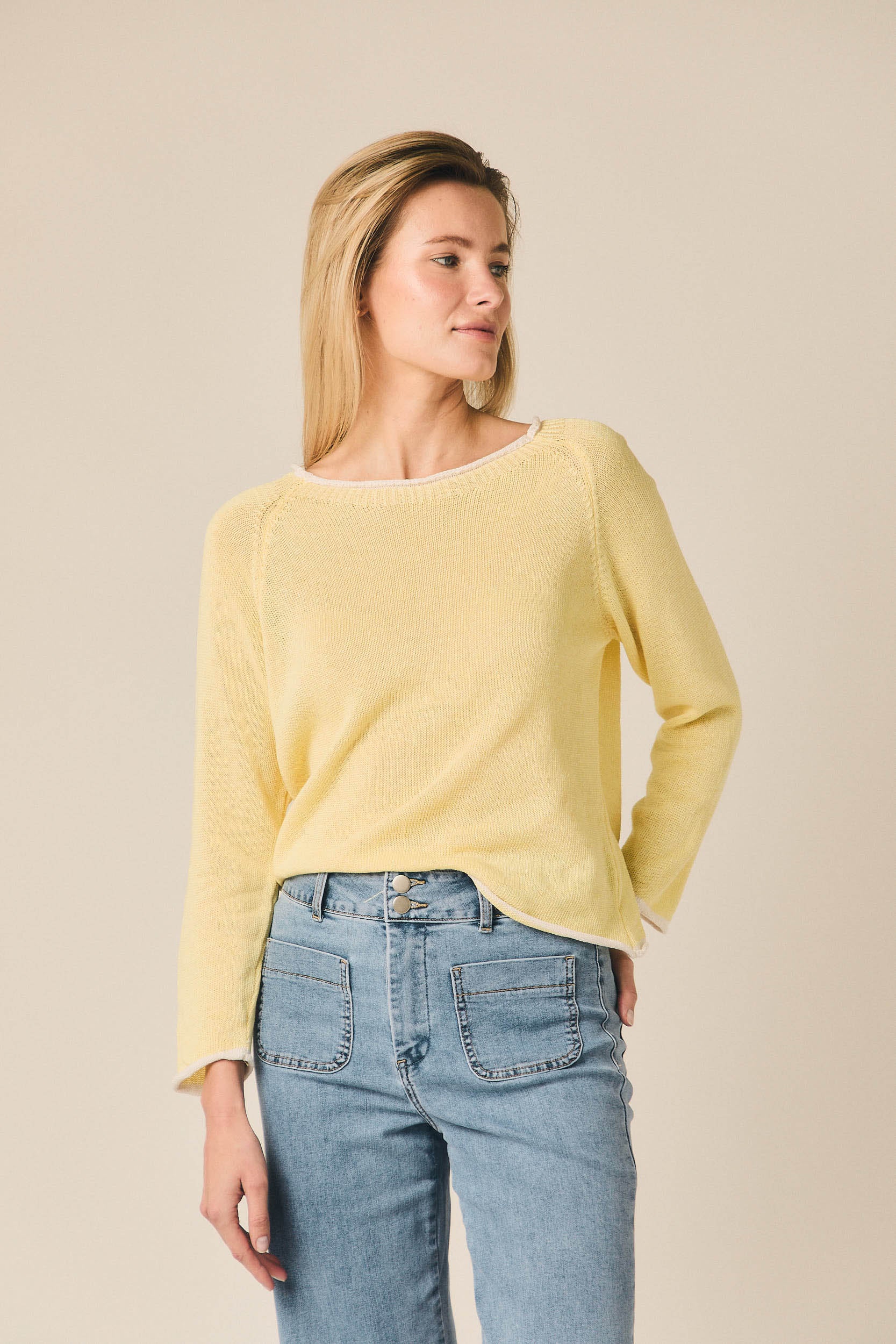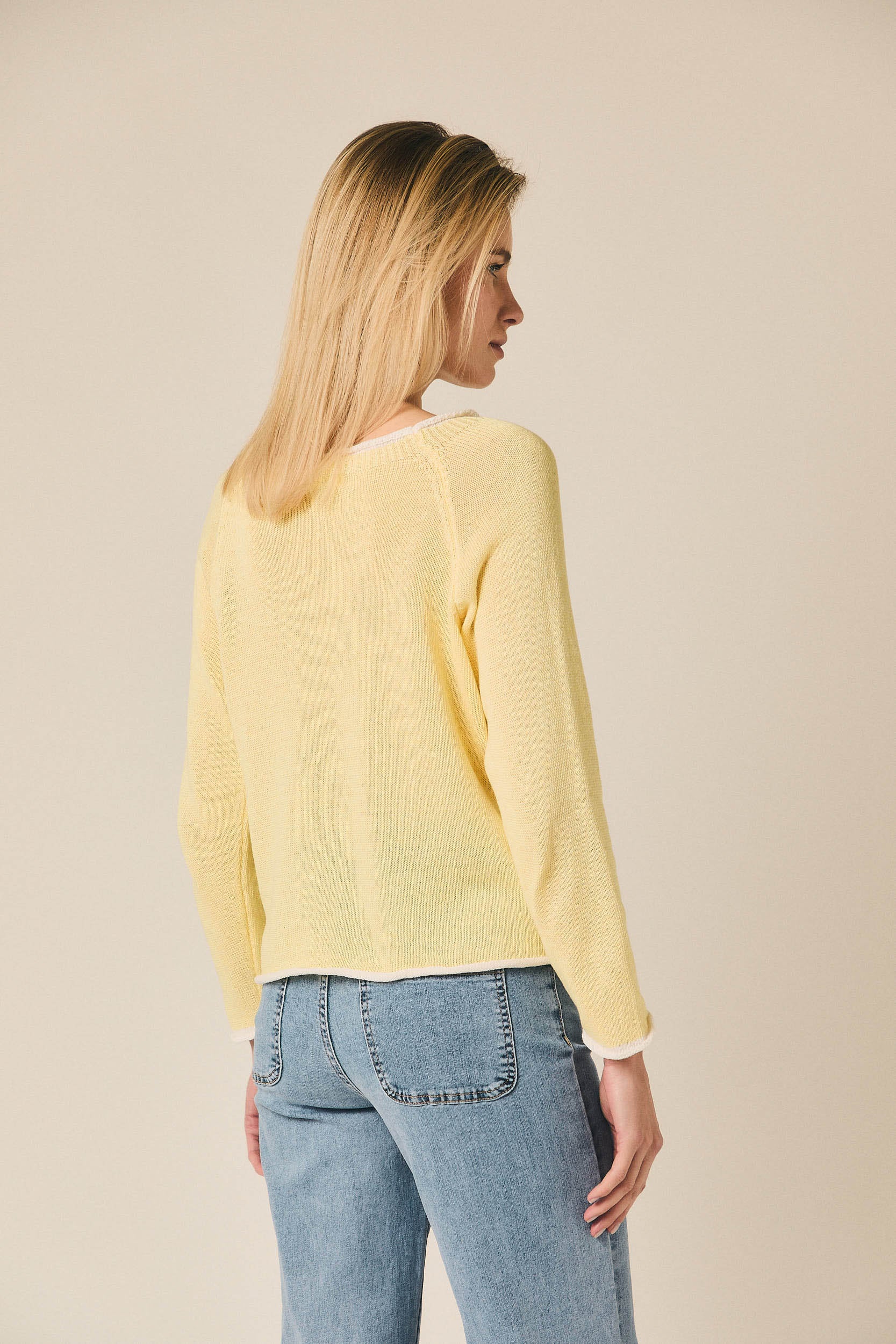 Jersey de punto fino con escote redondo y manga larga. Presenta un diseño limpio con vivos en contraste en el cuello, puños y bajo que aportan un detalle sutil al diseño. Su silueta recta y ligera lo convierte en una prenda cómoda para el día a día.