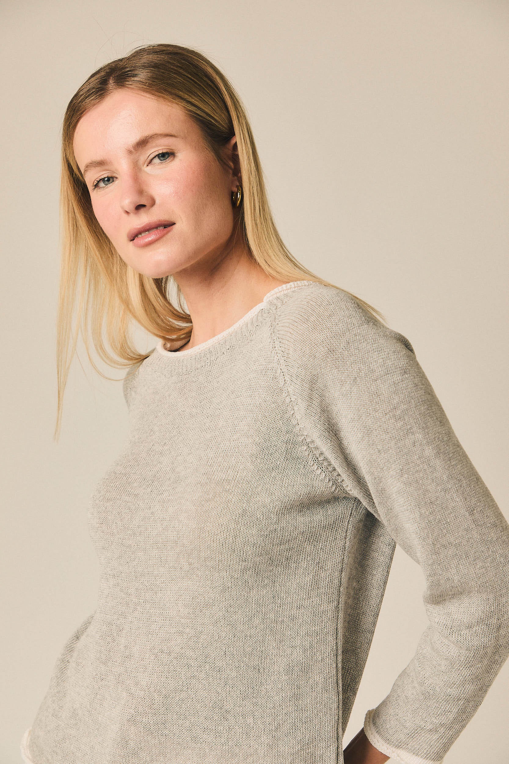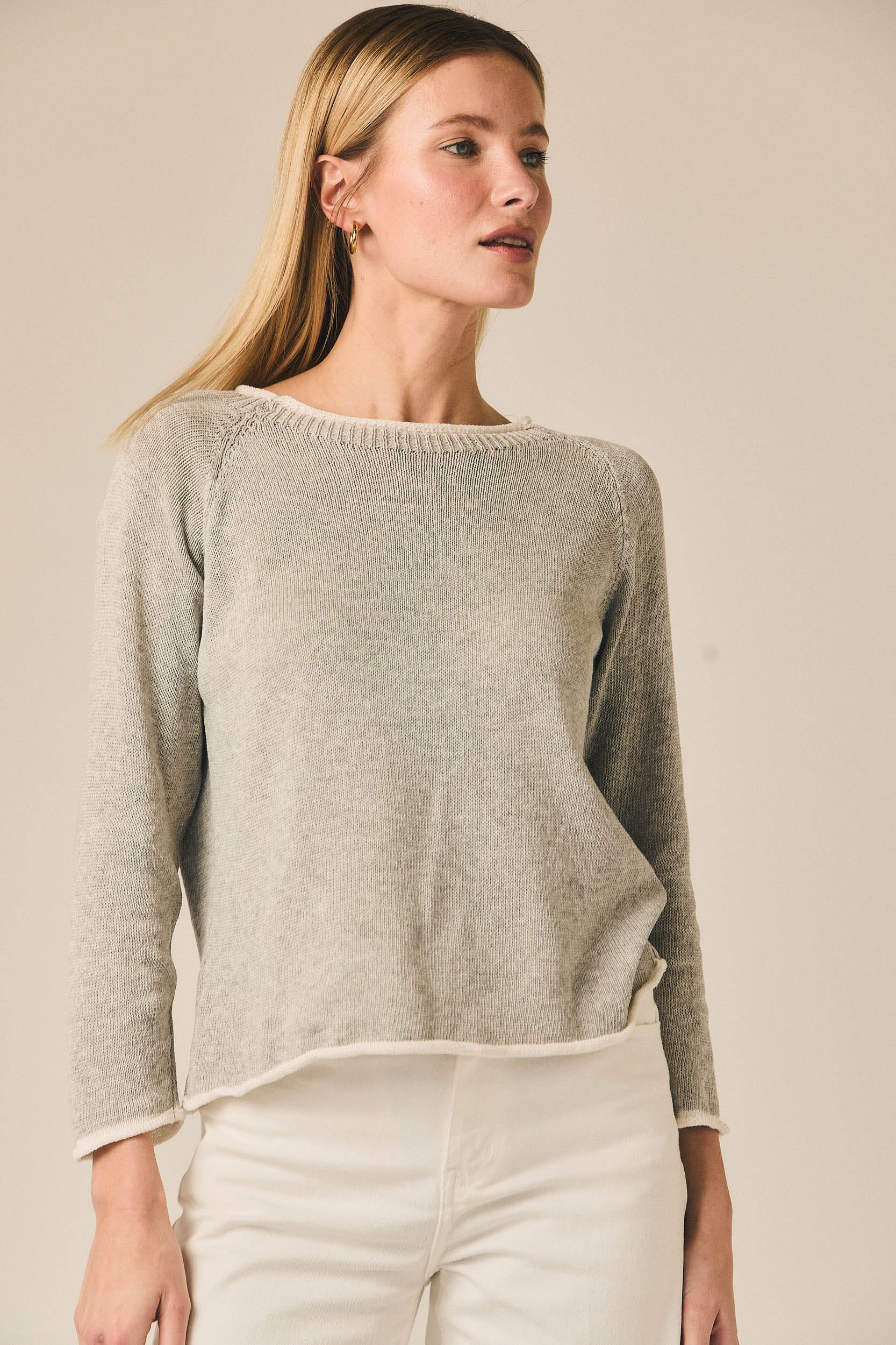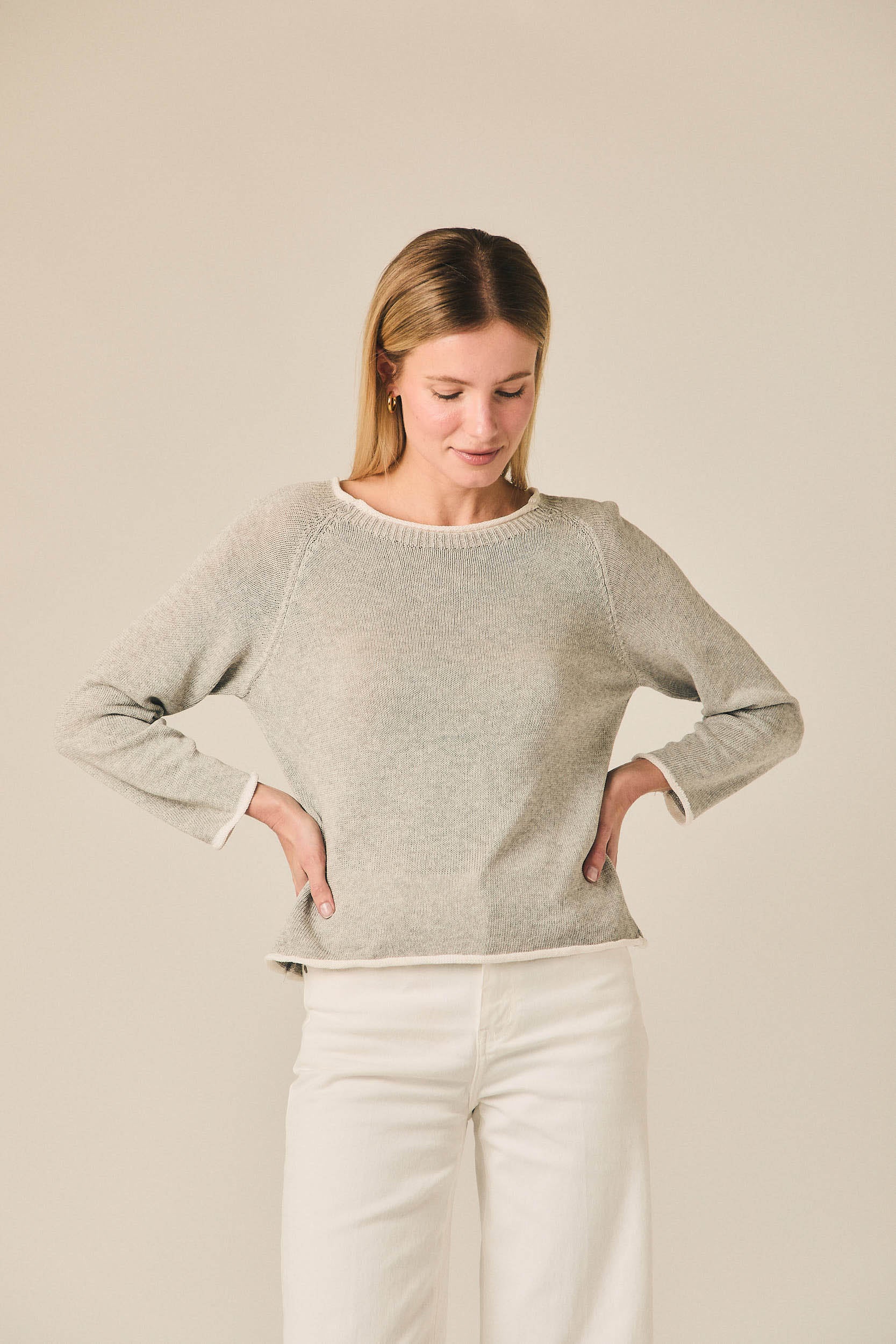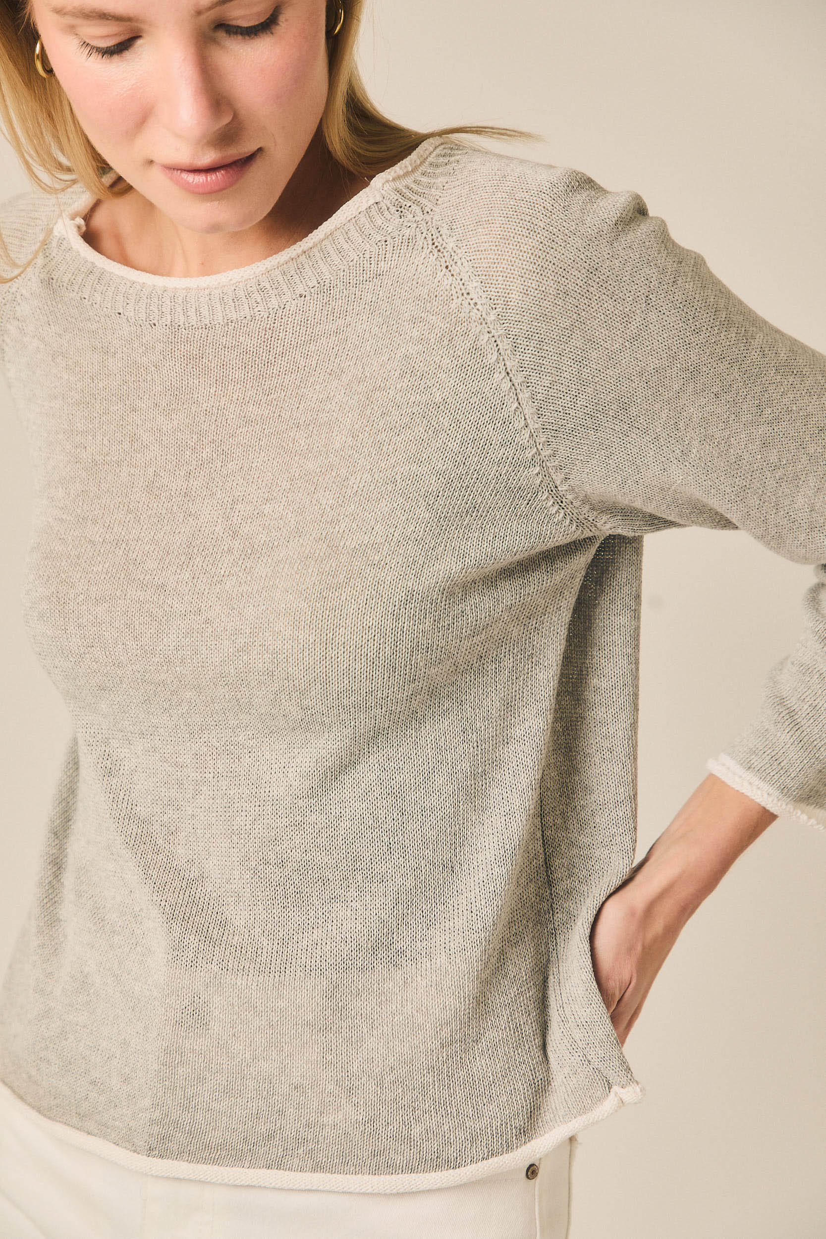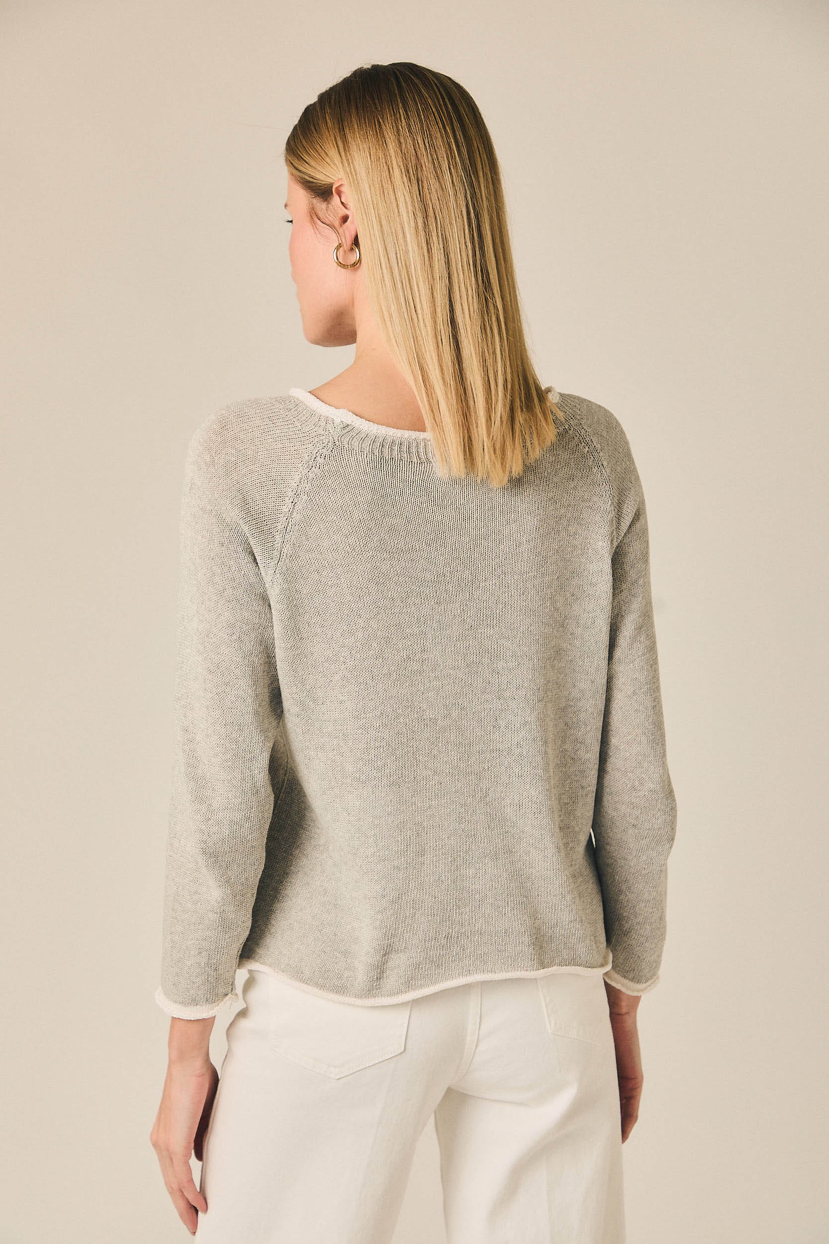 Jersey de punto fino con escote redondo y manga larga. Presenta un diseño limpio con vivos en contraste en el cuello, puños y bajo que aportan un detalle sutil al diseño. Su silueta recta y ligera lo convierte en una prenda cómoda para el día a día.