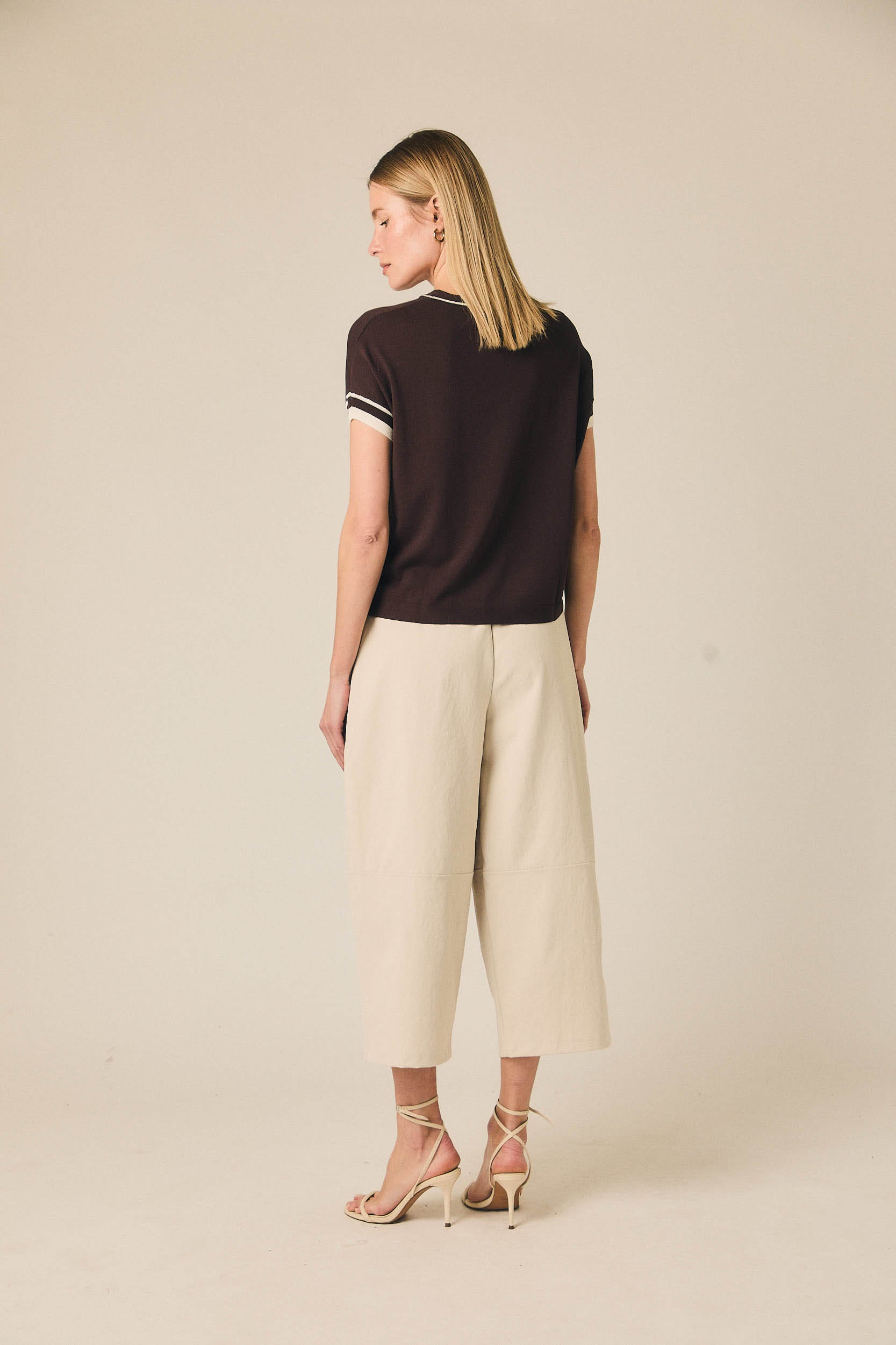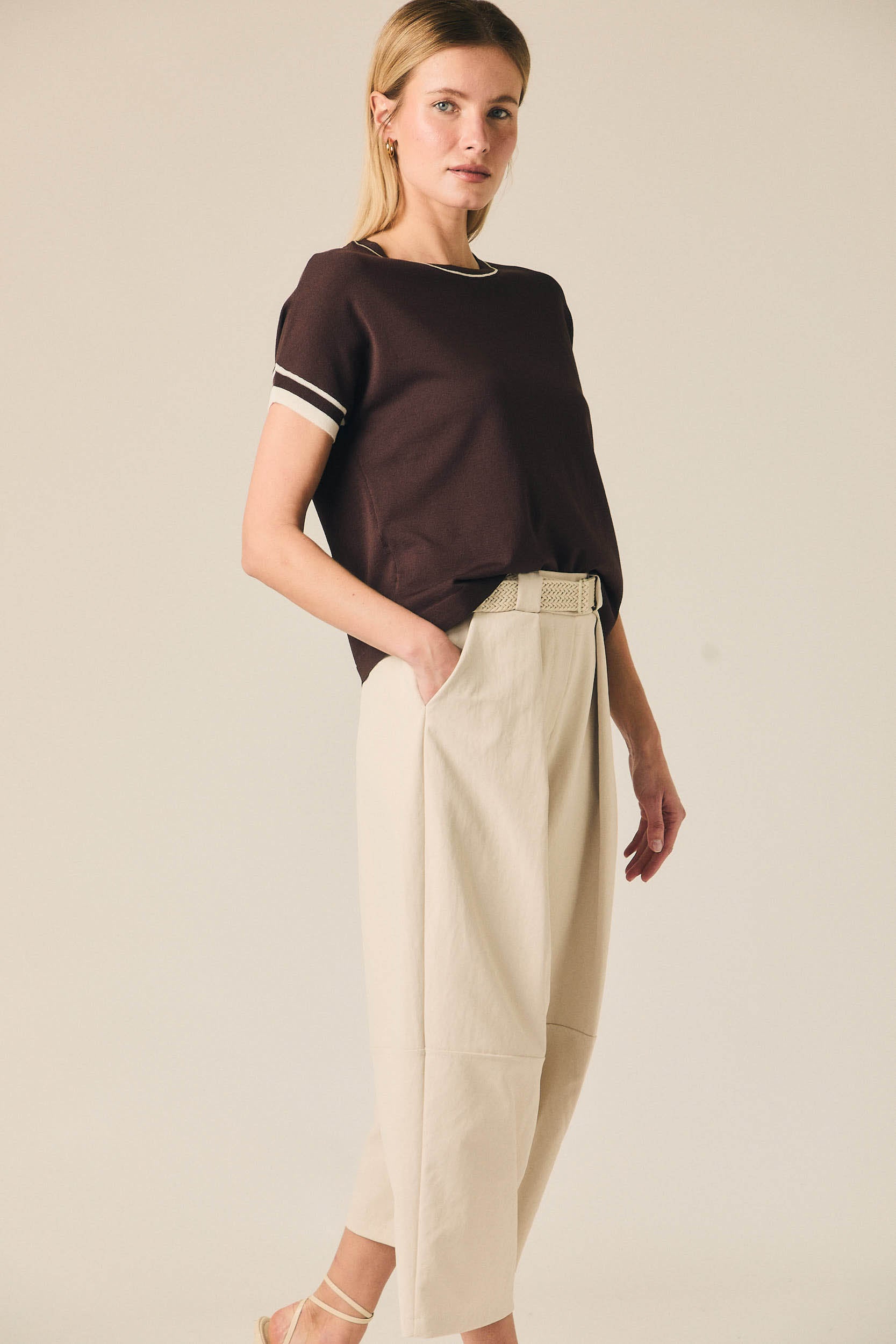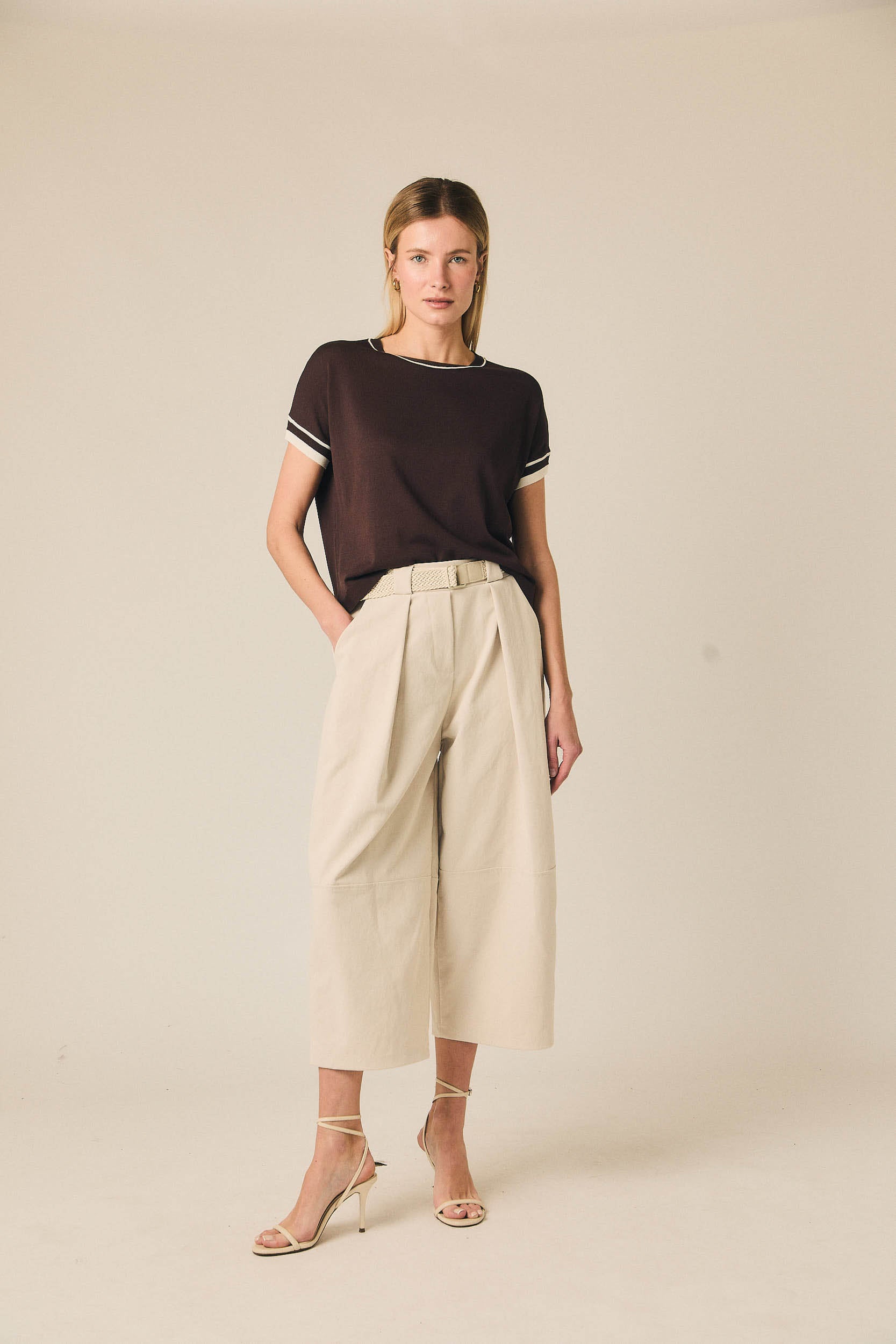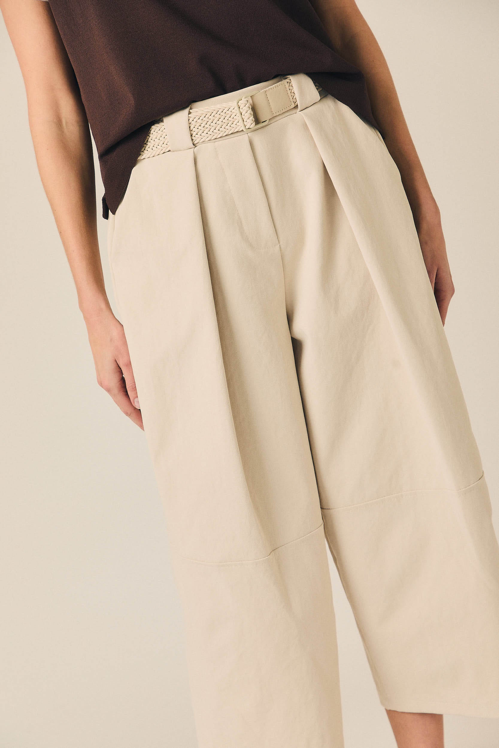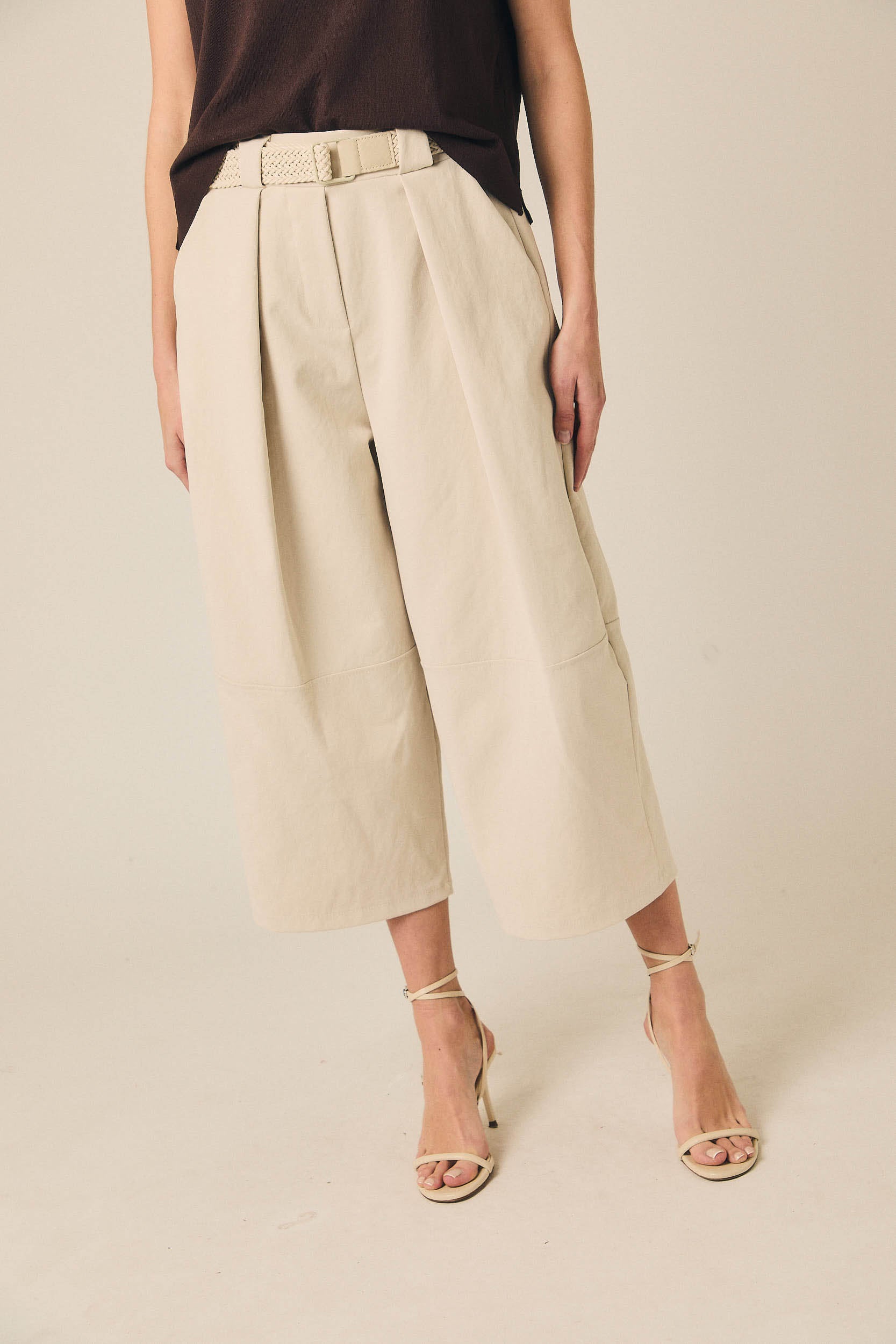 Pantalón cropped de tiro medio con pernera ancha y largo por encima del tobillo. Presenta pinzas frontales que aportan estructura y bolsillos laterales funcionales. Incluye cinturón trenzado en tono neutro que completa el diseño y define la cintura.