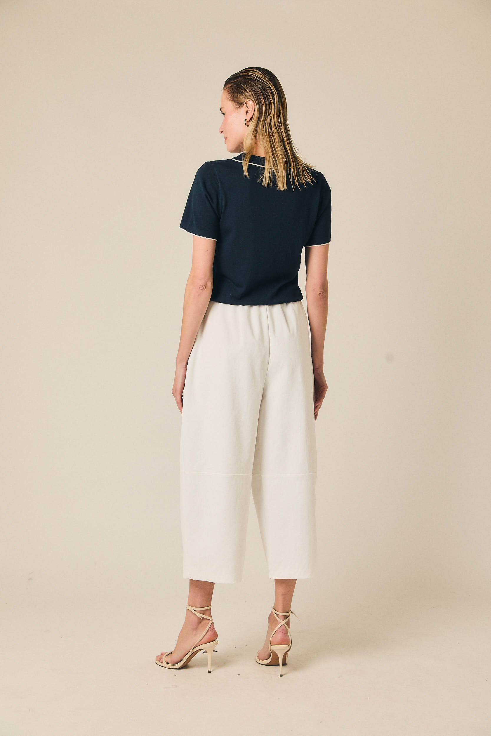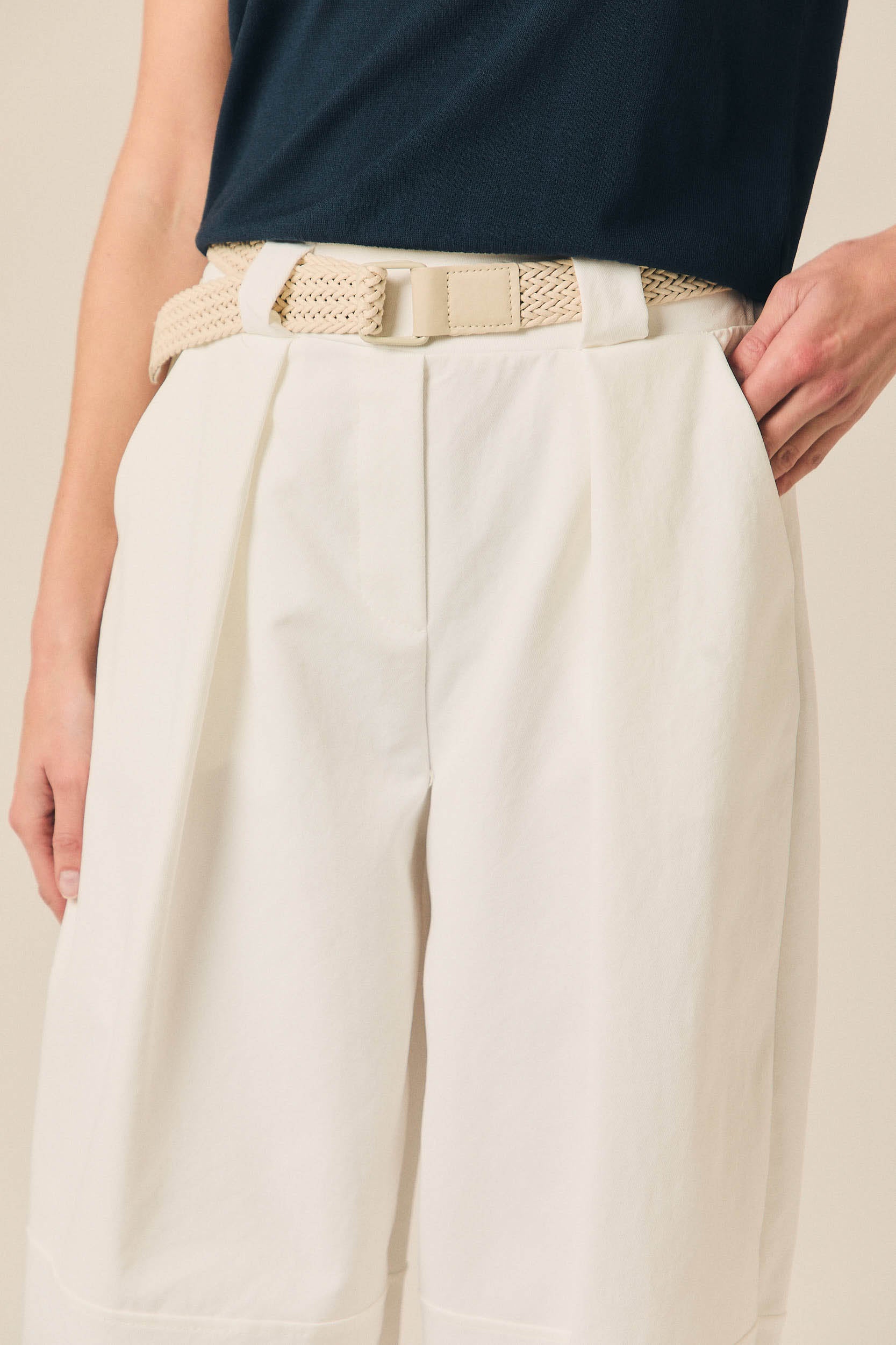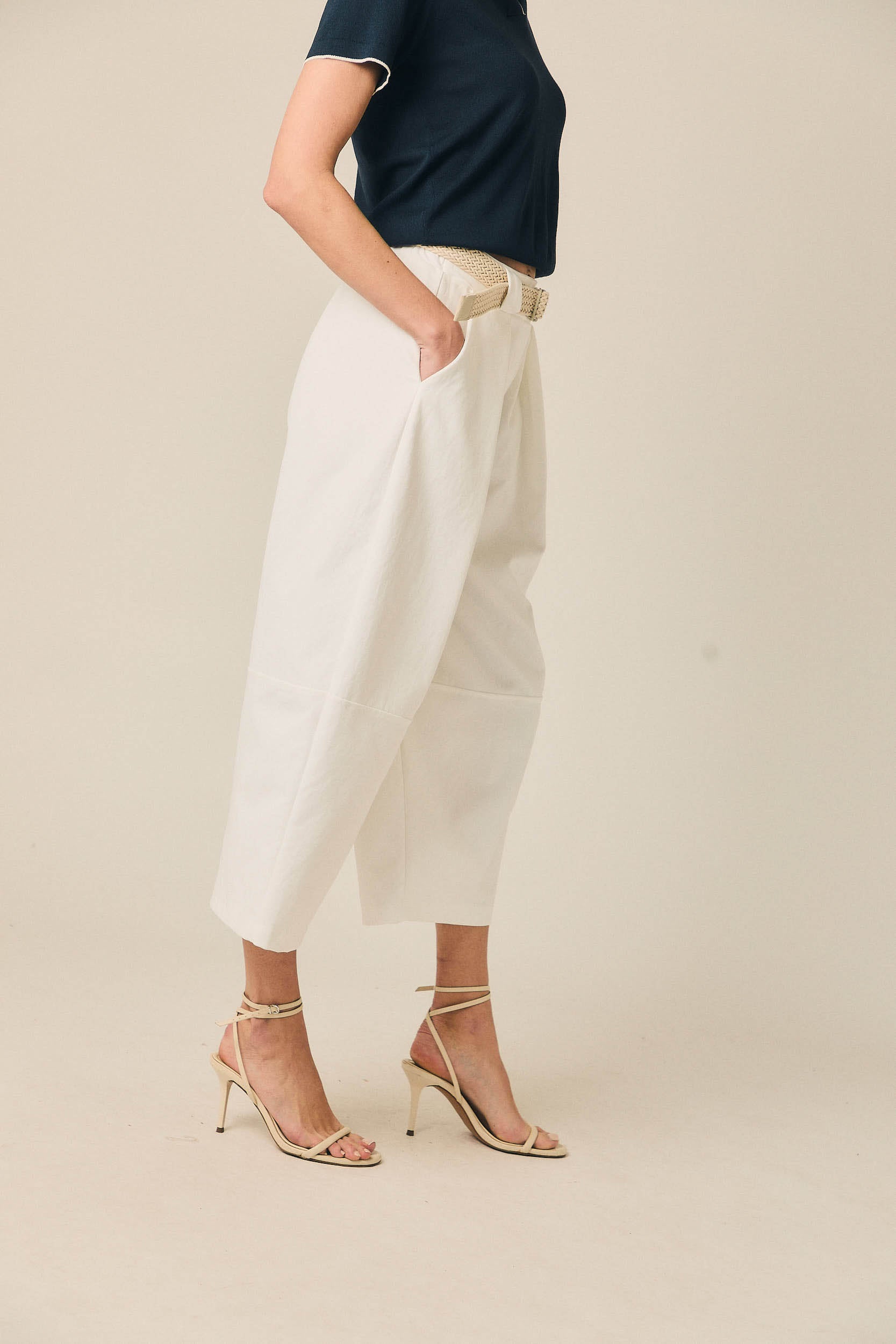 Pantalón cropped de tiro medio con pernera ancha y largo por encima del tobillo. Presenta pinzas frontales que aportan estructura y bolsillos laterales funcionales. Incluye cinturón trenzado en tono neutro que completa el diseño y define la cintura.