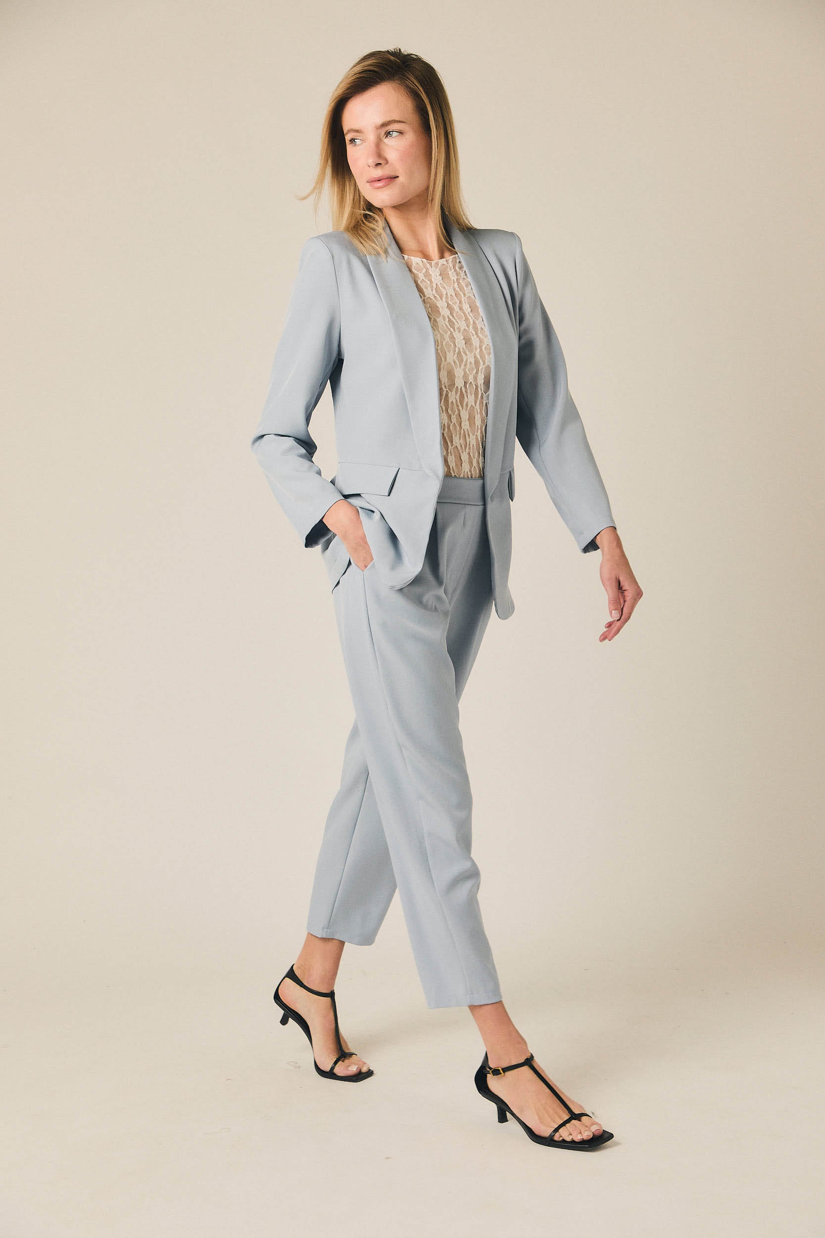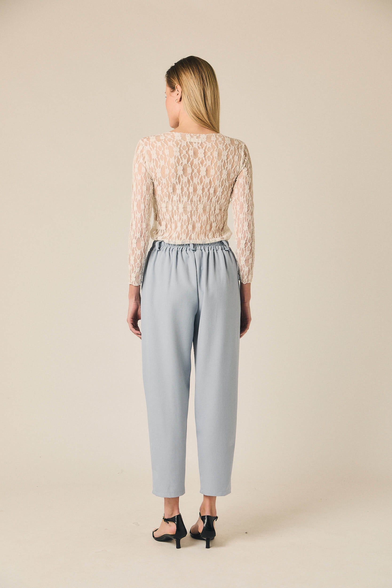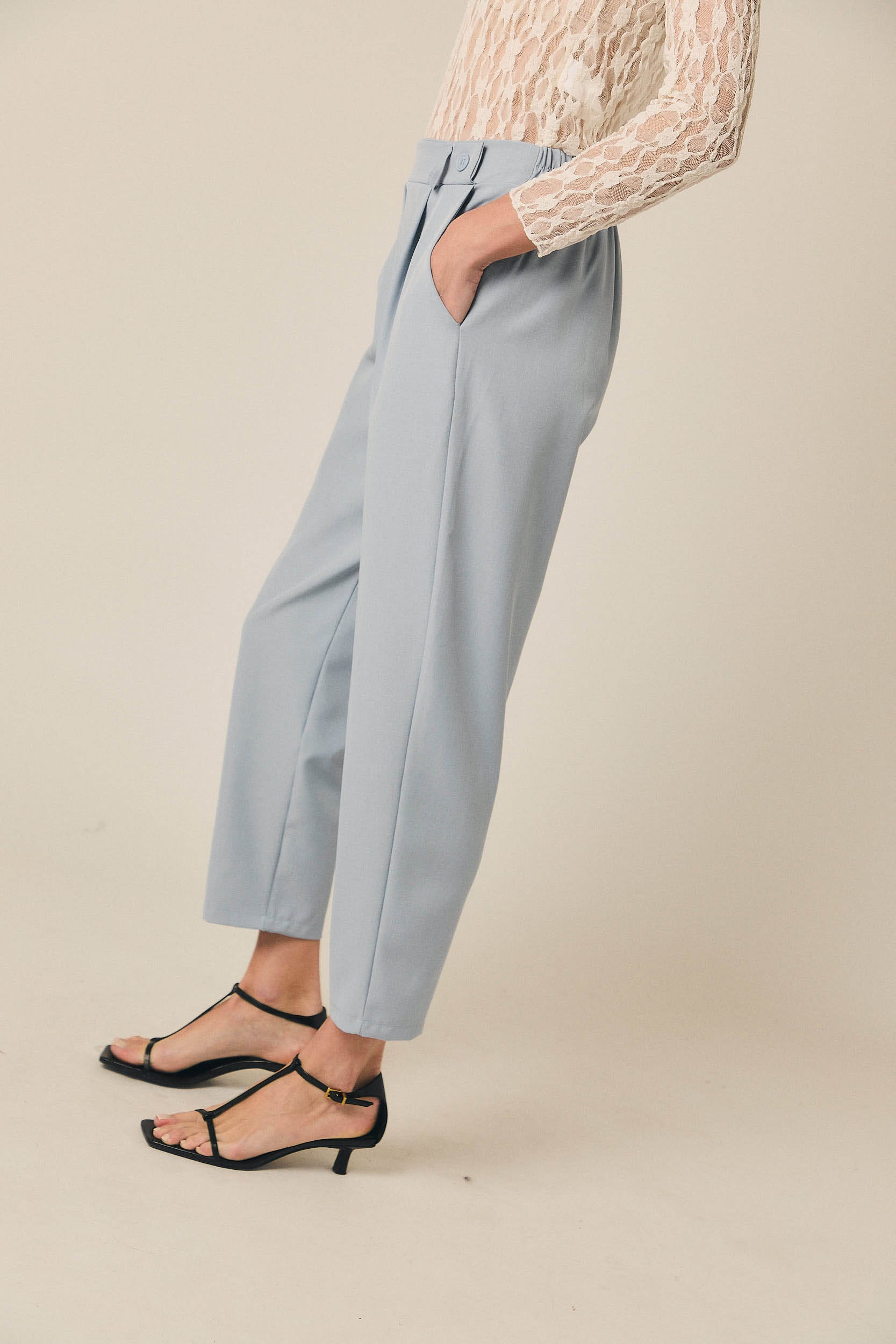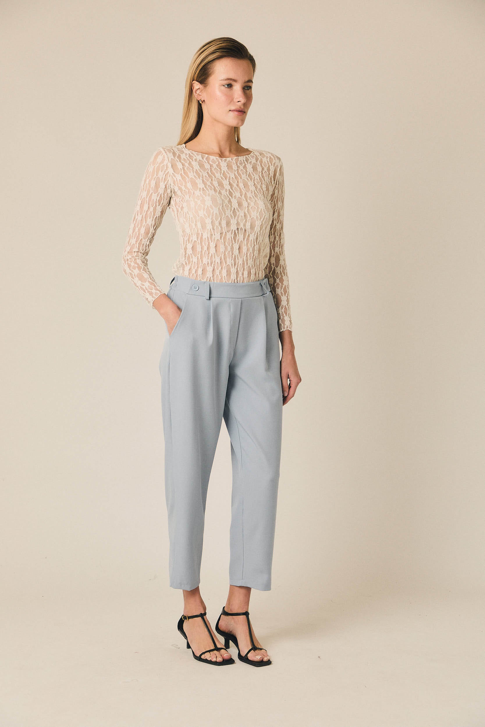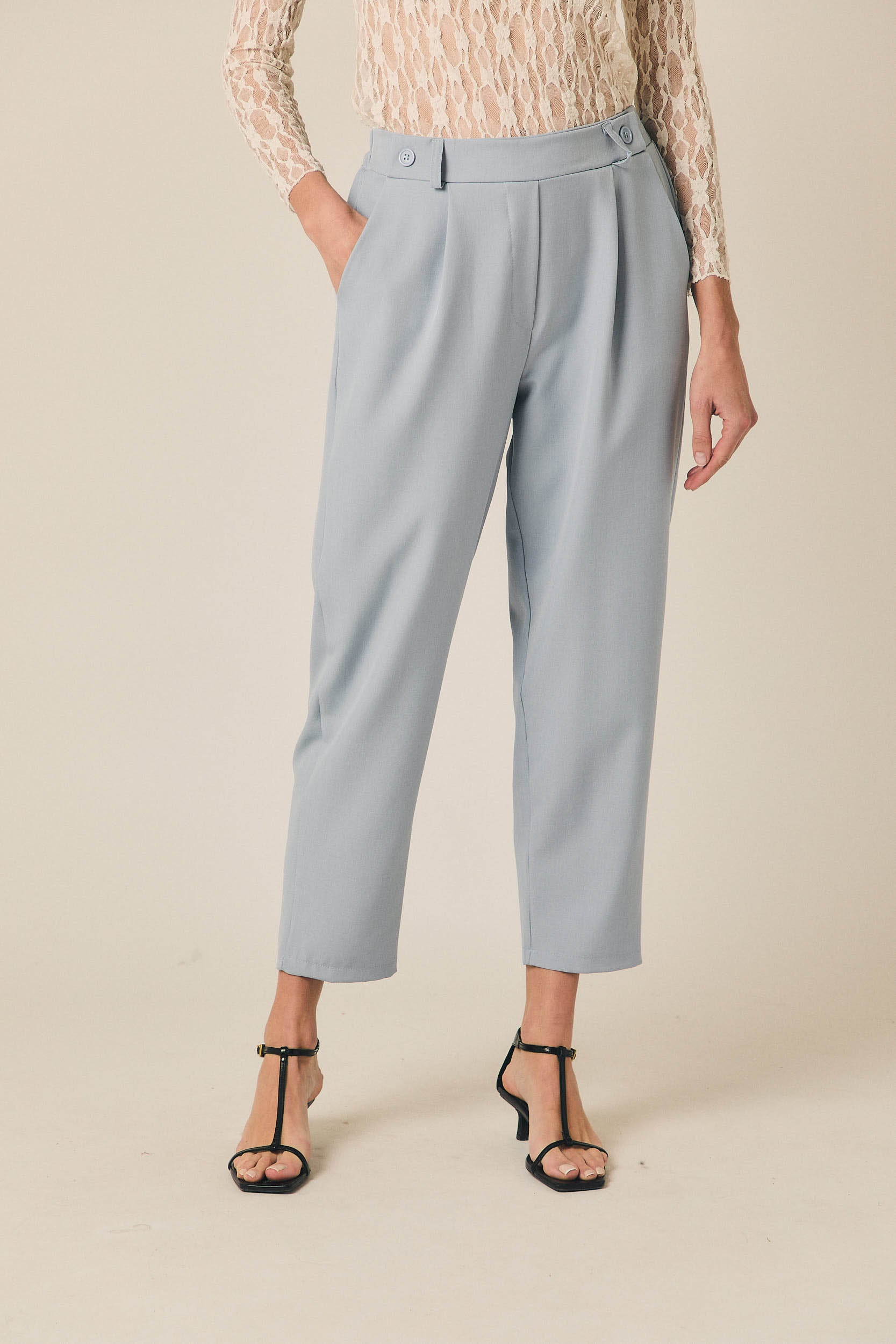 Pantalón tobillero de tiro medio con silueta recta y caída fluida. Presenta cintura con trabillas, cierre frontal con botón y pliegues delanteros que aportan amplitud. Incluye bolsillos laterales y largo al tobillo, creando una línea limpia y estilizada en tono celeste.