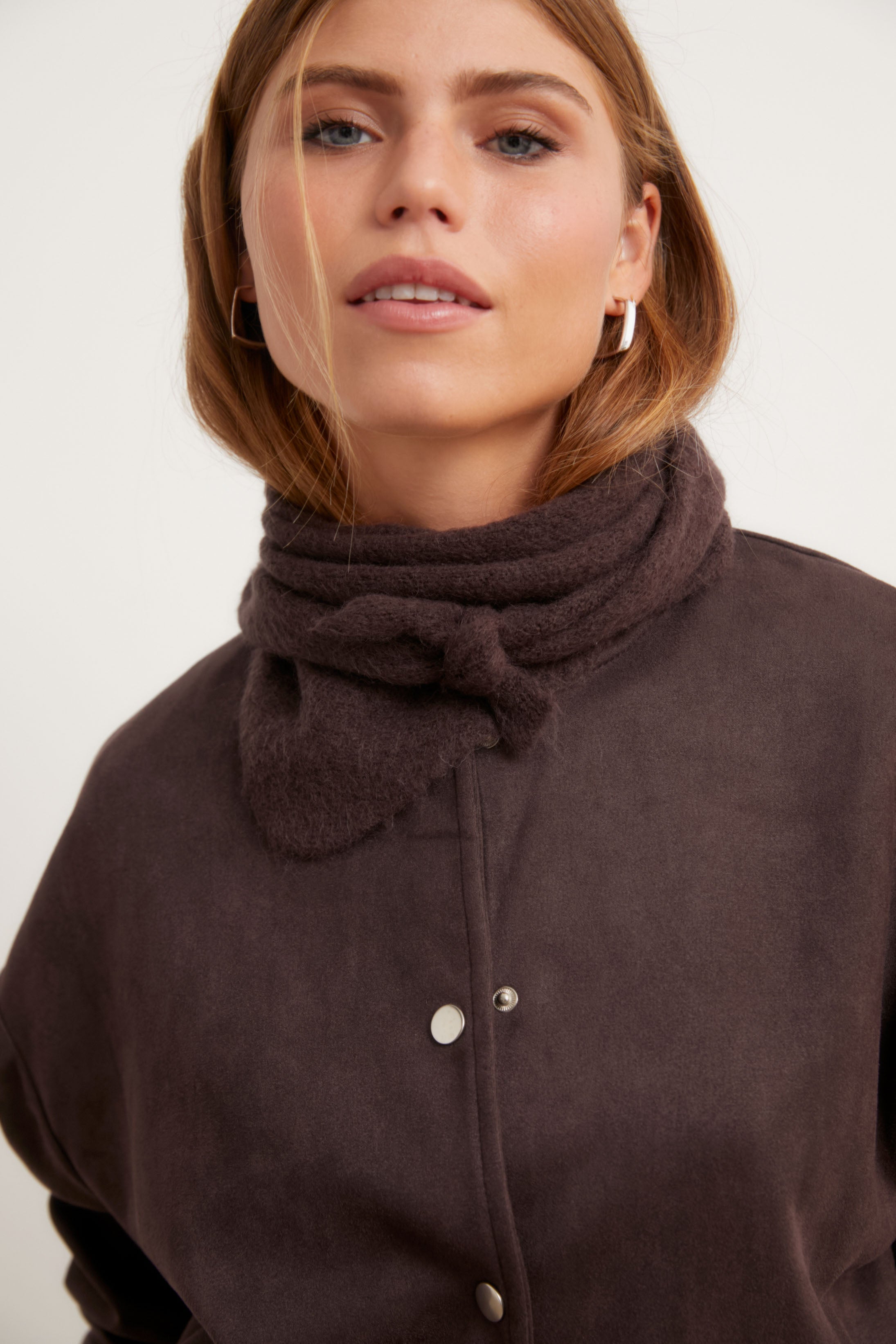 Pañuelo de lana suave en tono marrón oscuro. Presenta forma triangular con terminación en pico y se anuda fácilmente al cuello, aportando calidez y un acabado envolvente al look. Su textura mullida y ligera lo convierte en un accesorio cómodo y versátil.