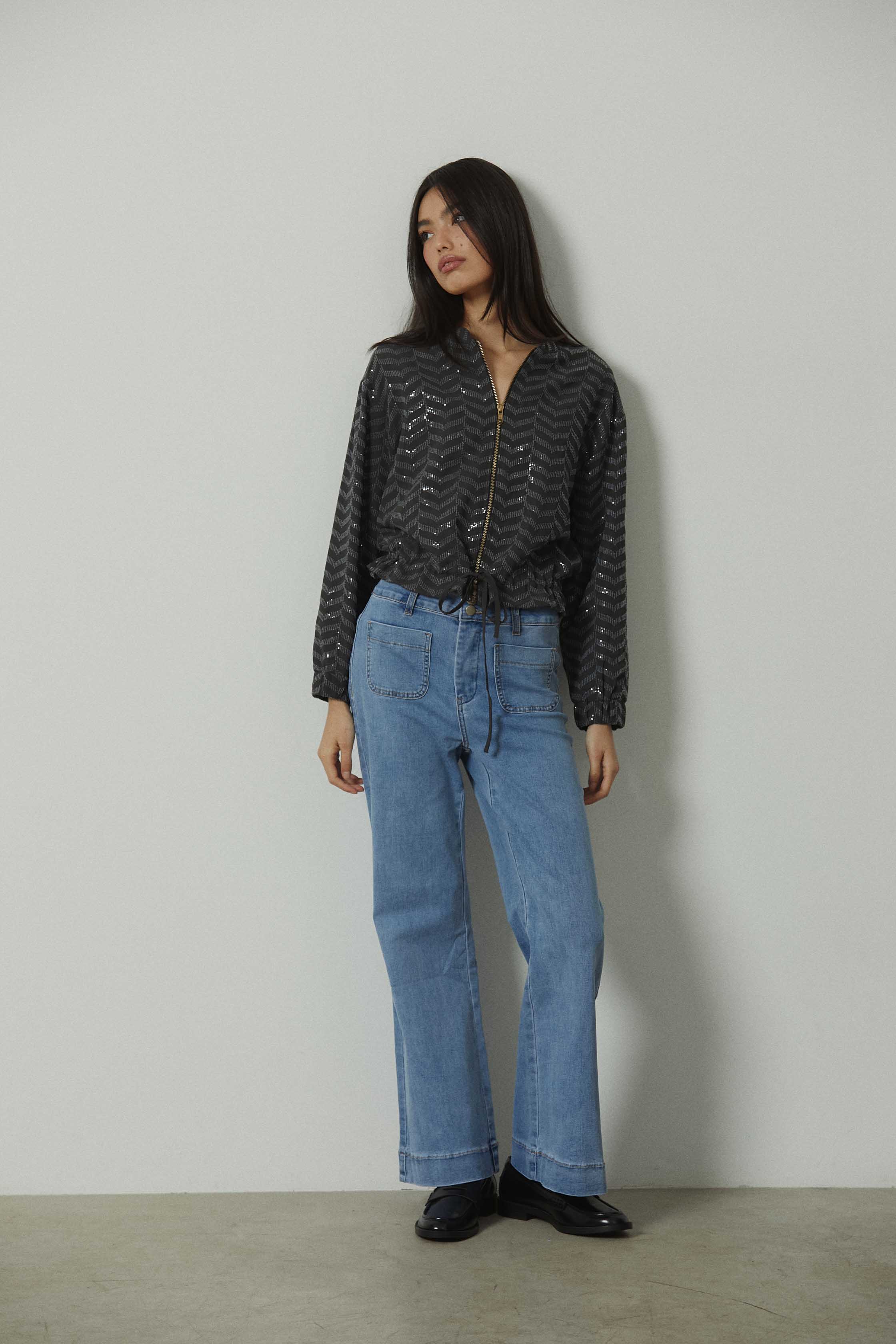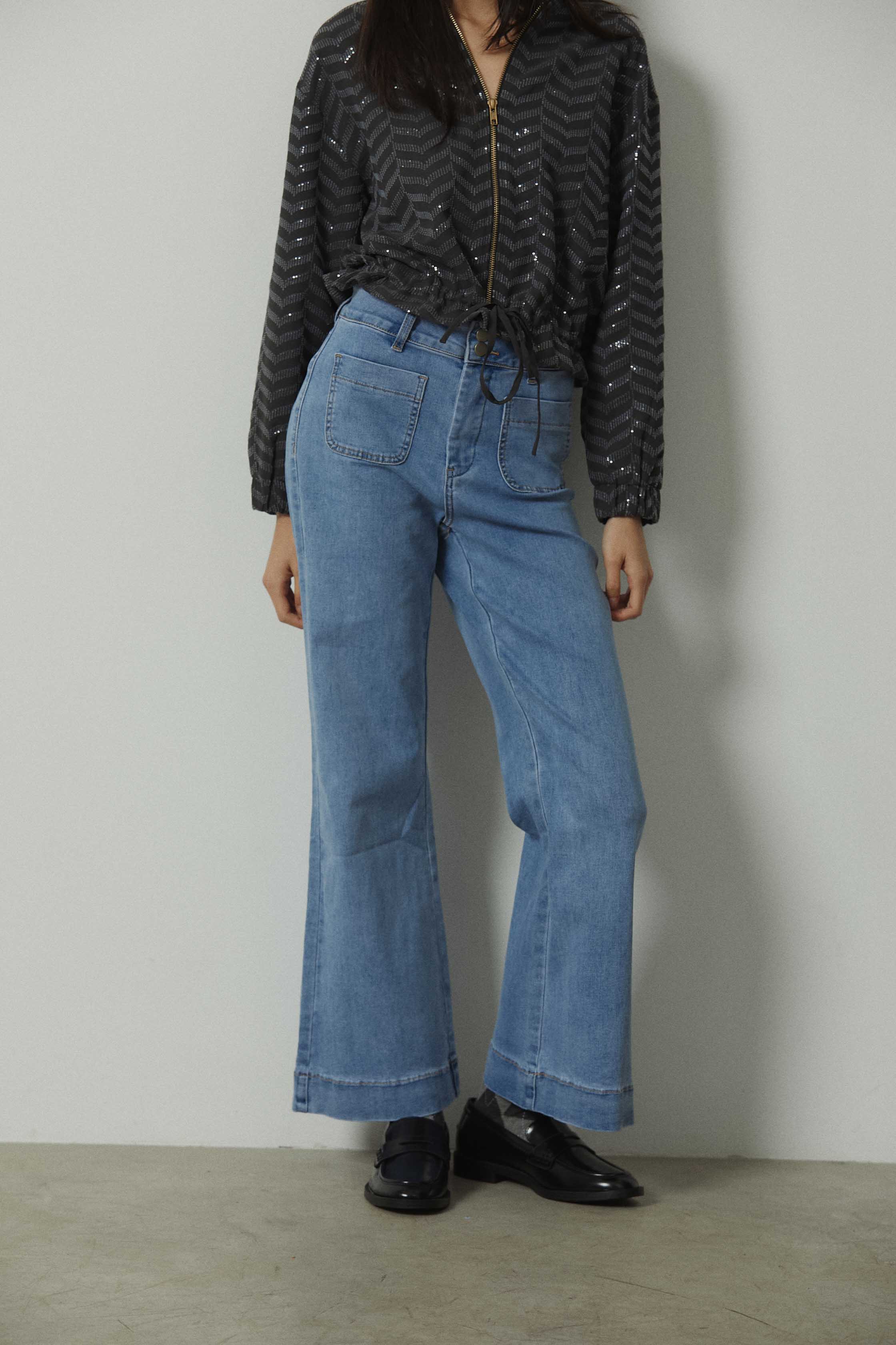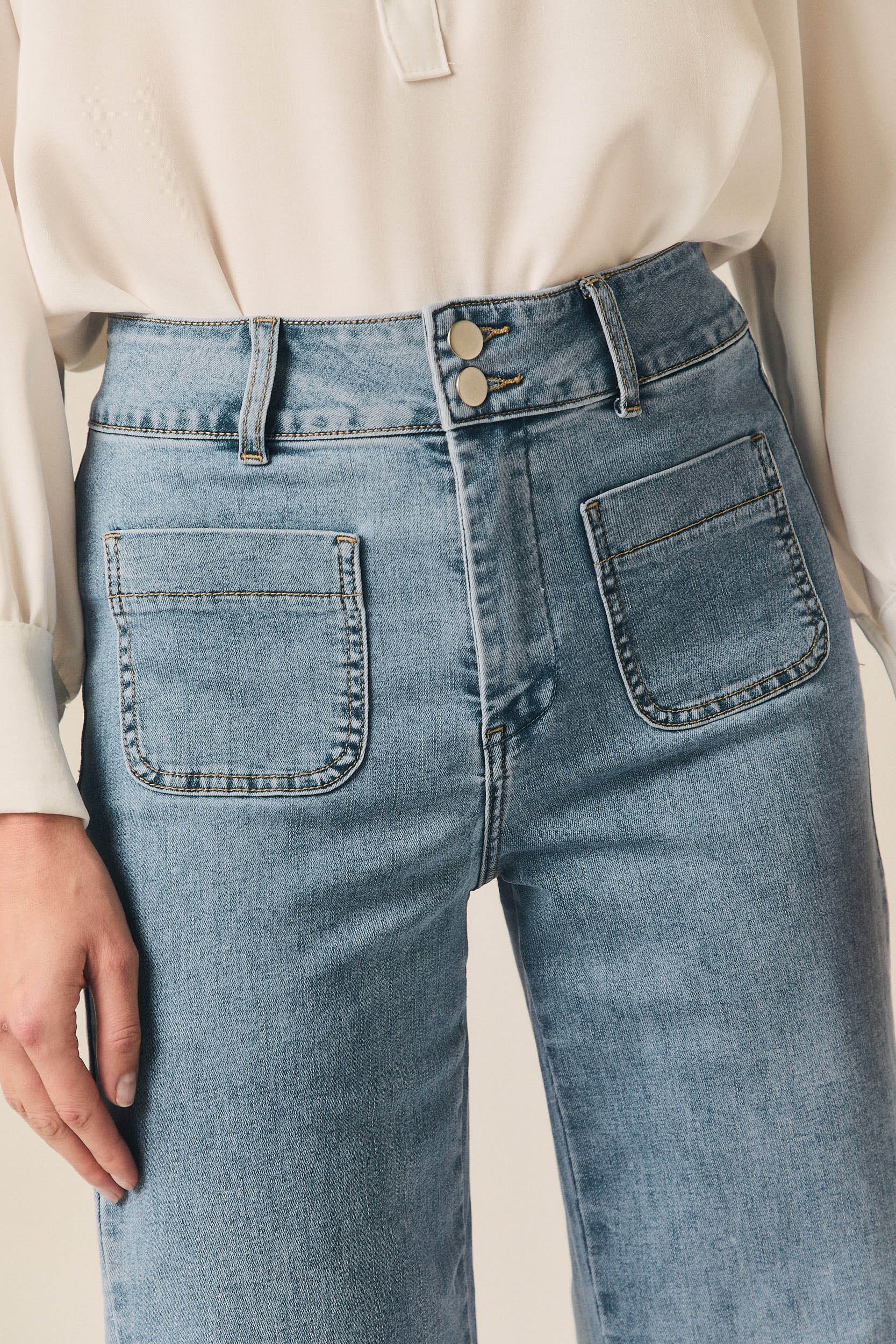 Jeans de tiro medio con corte recto y ligera amplitud en la pierna. Destaca su diseño frontal con dos bolsillos grandes aplicados, que aportan un aire utilitario y diferencian la prenda del vaquero clásico. Cierre con botón y cremallera, trabillas para cinturón y acabado en azul claro con lavado suave. El bajo recto refuerza una silueta cómoda y actual.