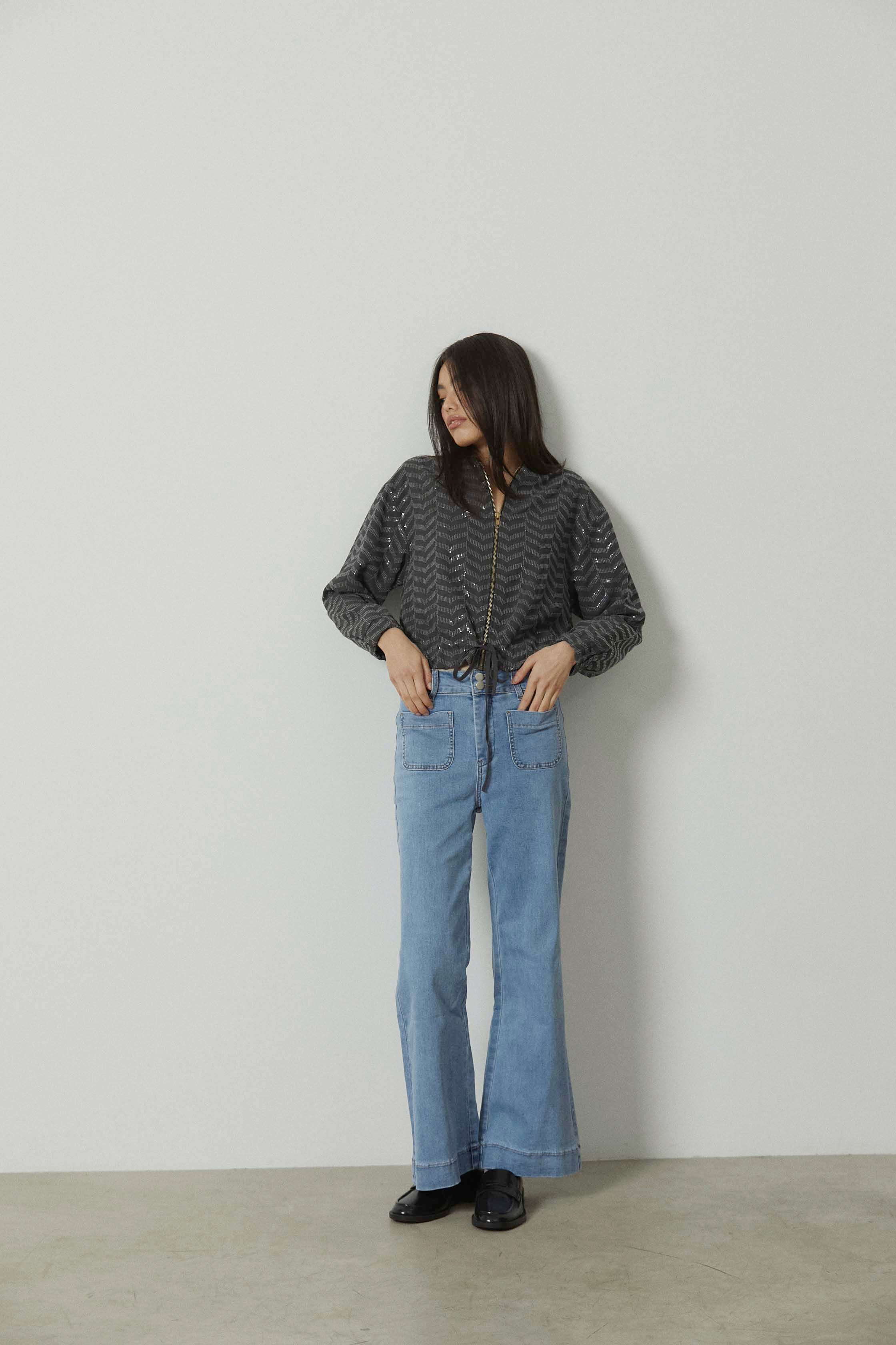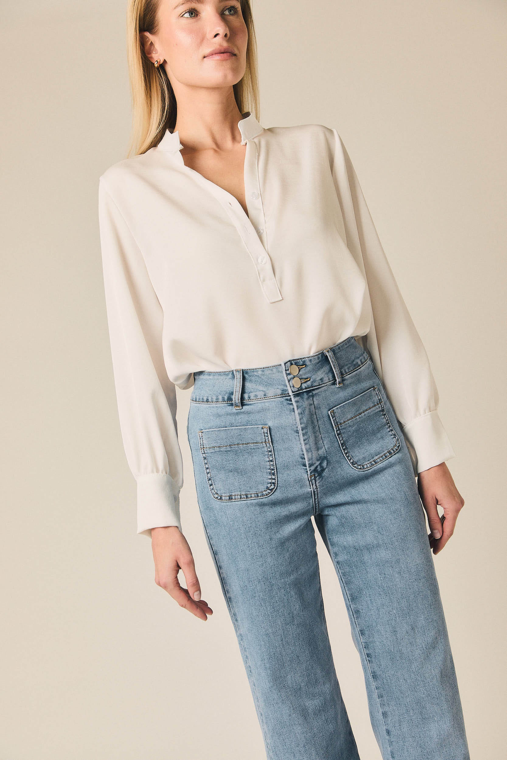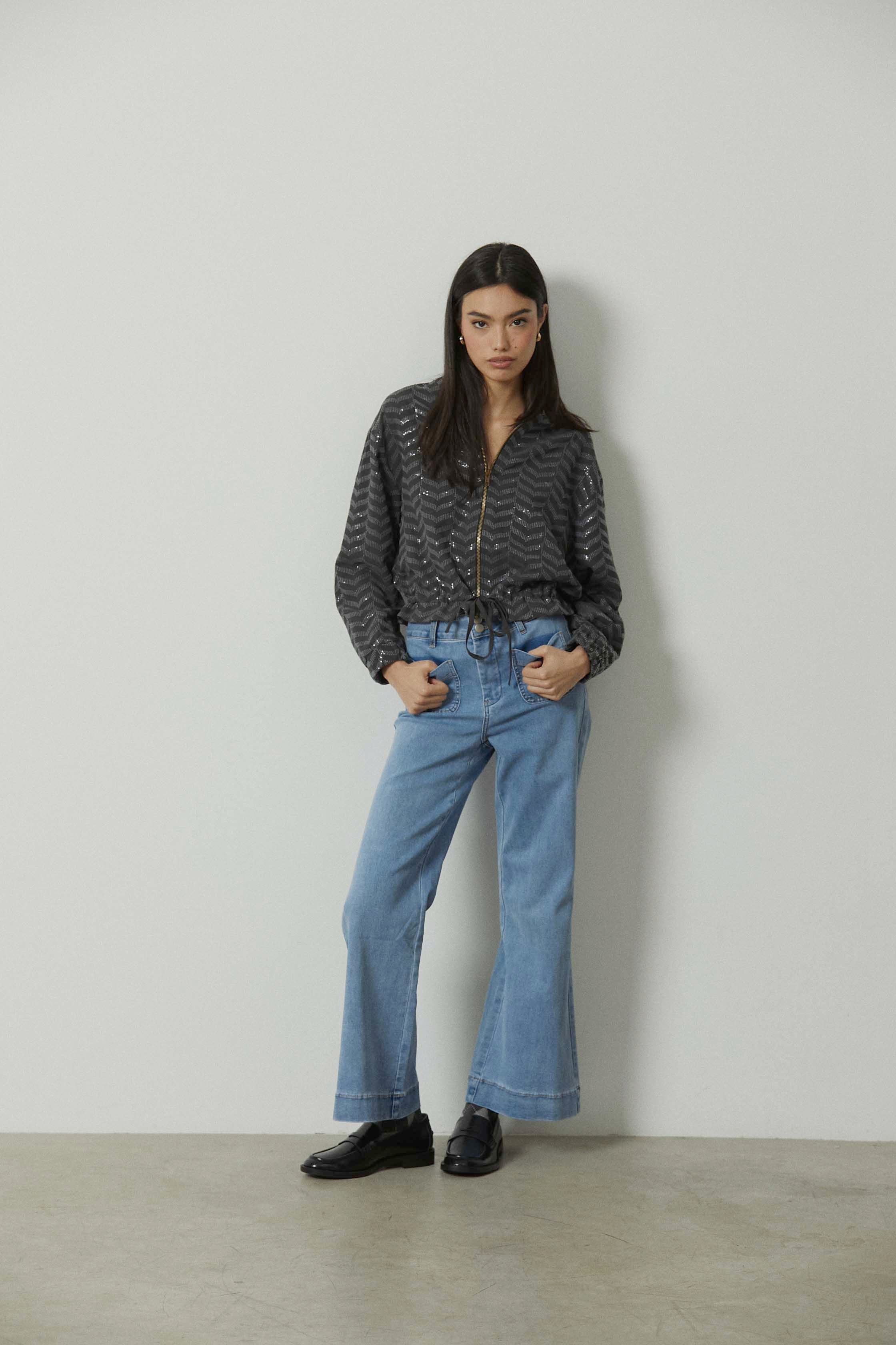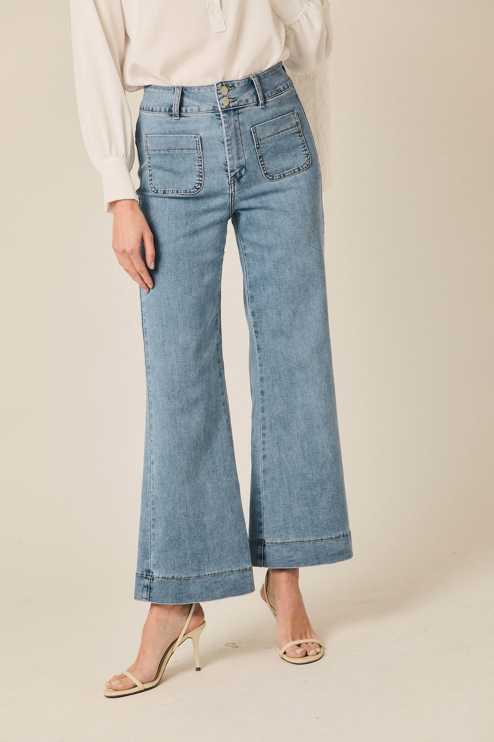 Jeans de tiro medio con corte recto y ligera amplitud en la pierna. Destaca su diseño frontal con dos bolsillos grandes aplicados, que aportan un aire utilitario y diferencian la prenda del vaquero clásico. Cierre con botón y cremallera, trabillas para cinturón y acabado en azul claro con lavado suave. El bajo recto refuerza una silueta cómoda y actual.