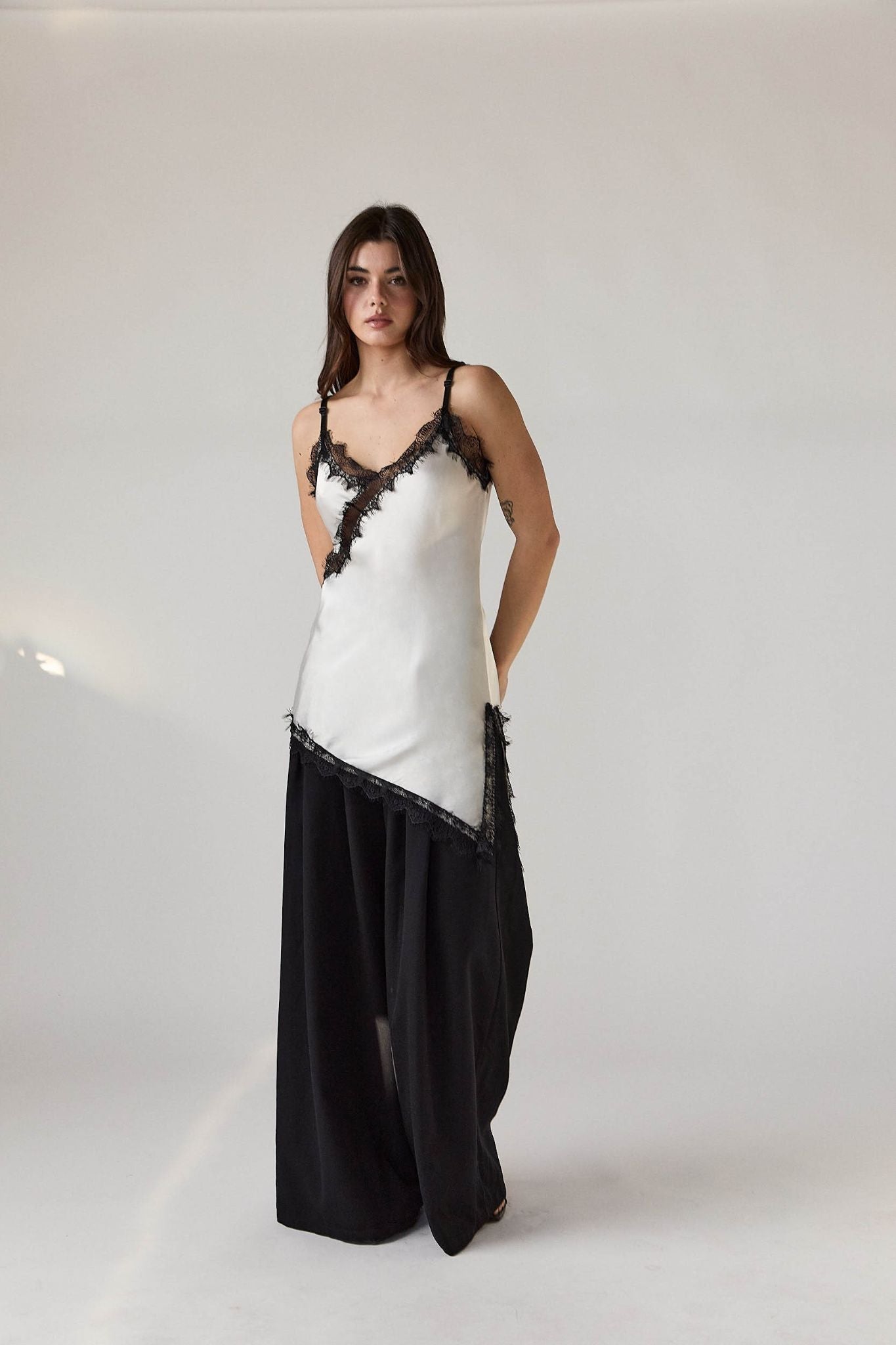 Top lencero en tono natural con acabado satinado y detalle de encaje en negro que recorre el escote y el bajo en forma asimétrica. El corte en pico aporta movimiento y estiliza la silueta, mientras que los tirantes finos regulables permiten ajustar el largo con comodidad.