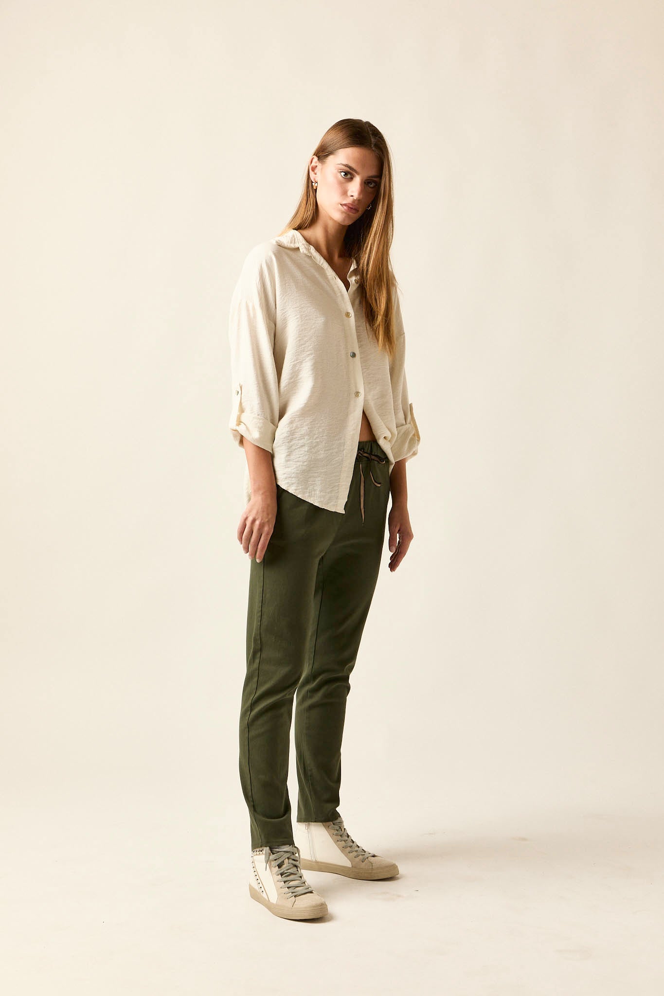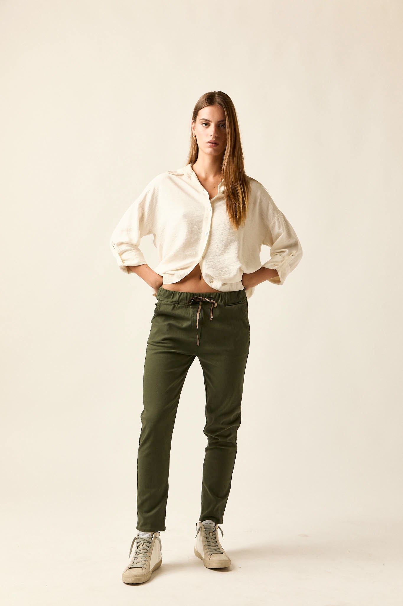 Pantalón de algodón en tono verde kaki con cintura elástica ajustable mediante cordón decorativo en contraste. Su corte recto y ligero lo convierte en una prenda cómoda y versátil, perfecta para looks desenfadados sin perder estilo. Incluye bolsillos laterales prácticos que refuerzan su aire funcional.