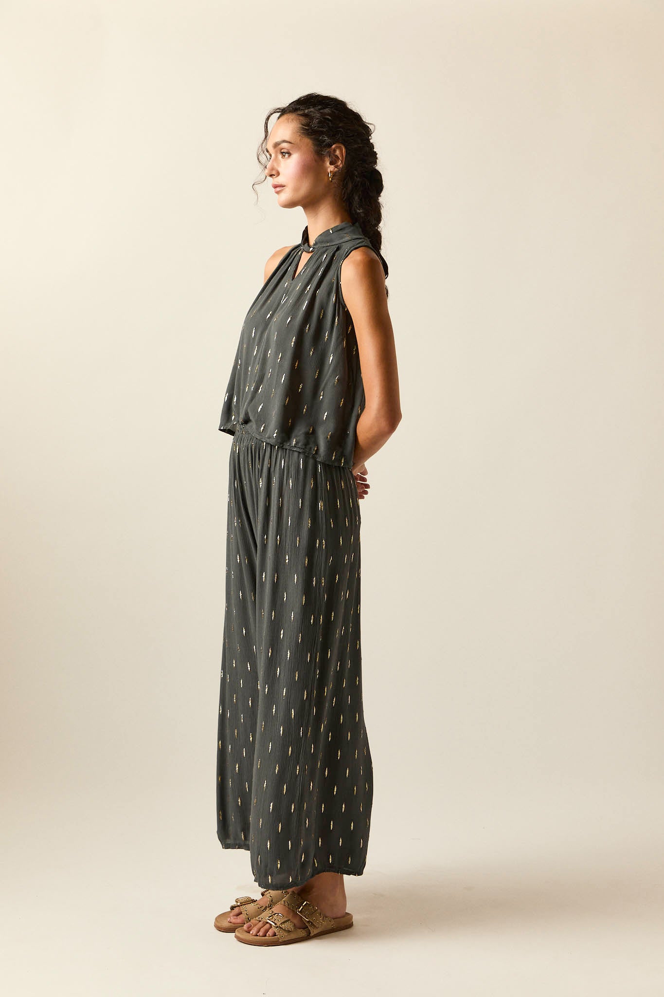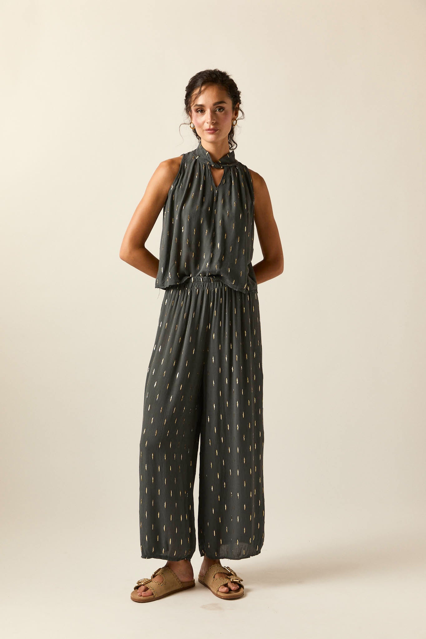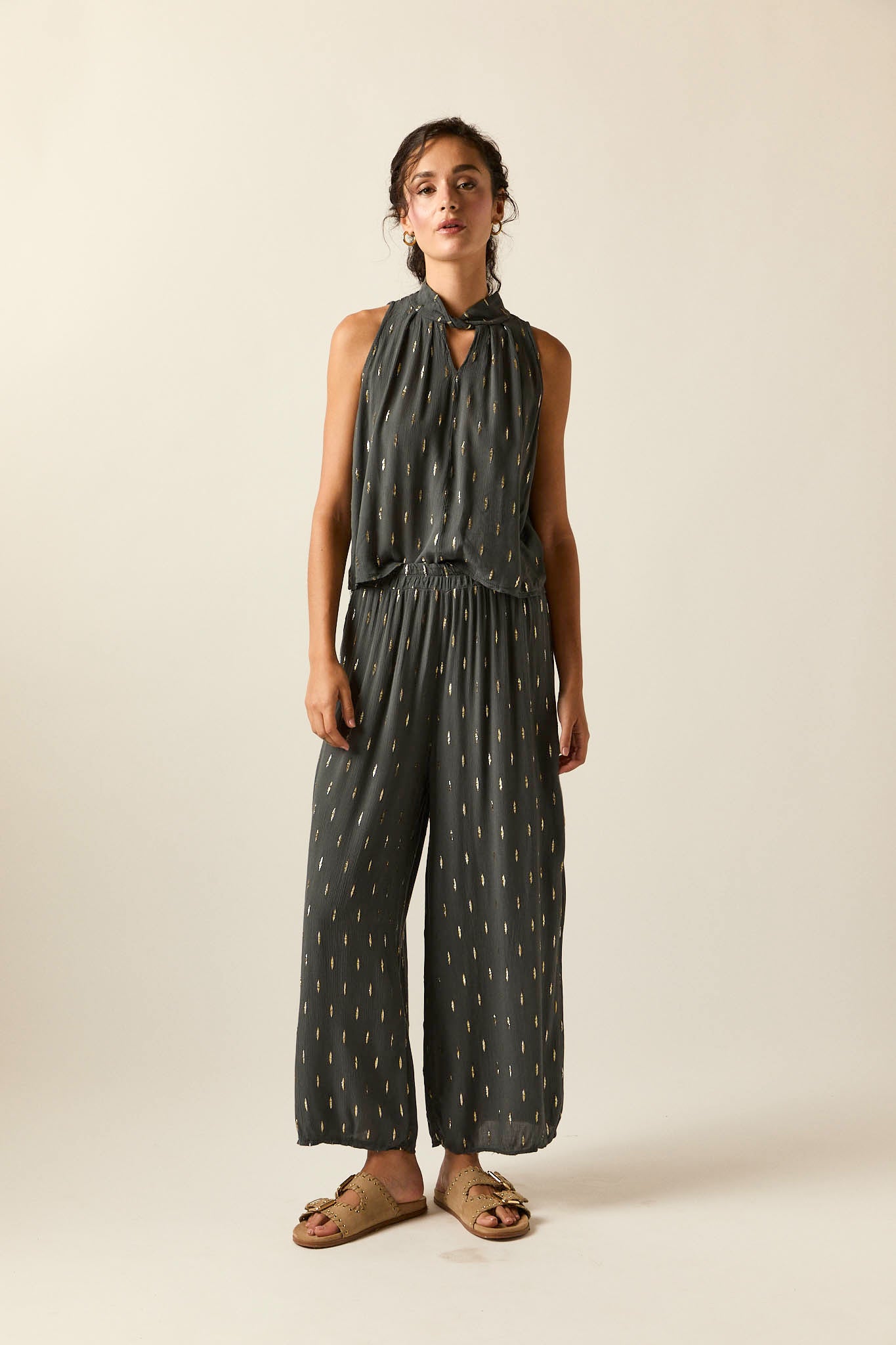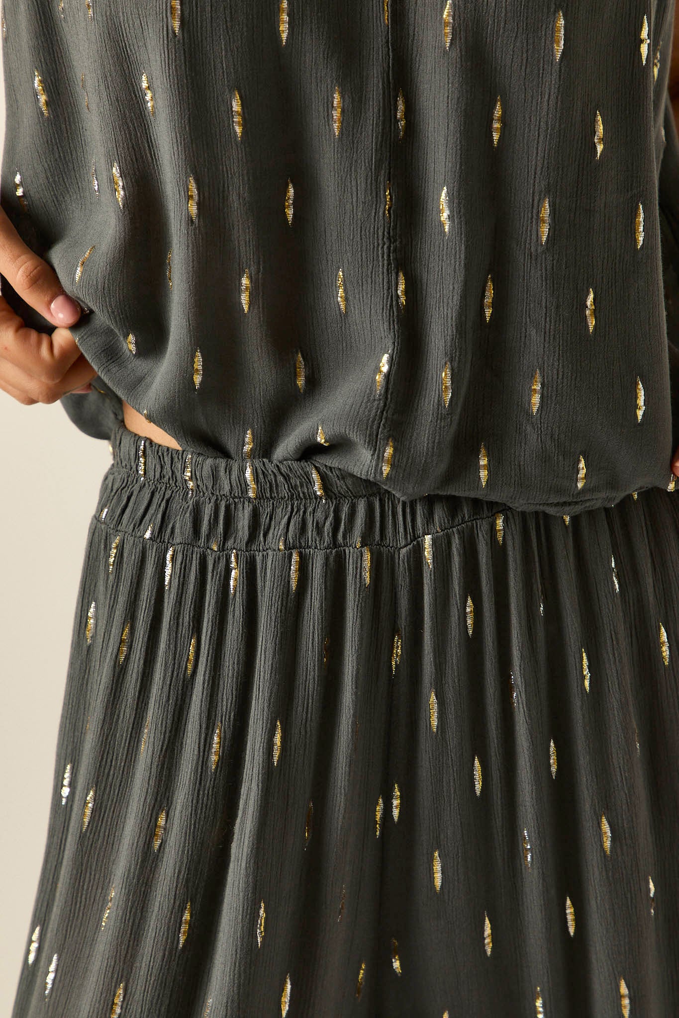 Pantalón ancho de bambula en tono gris con detalles de hilos de lurex dorado. Cintura elástica con frunce que aporta comodidad y favorece el ajuste. El corte recto y fluido estiliza la silueta y aporta movimiento en cada paso.