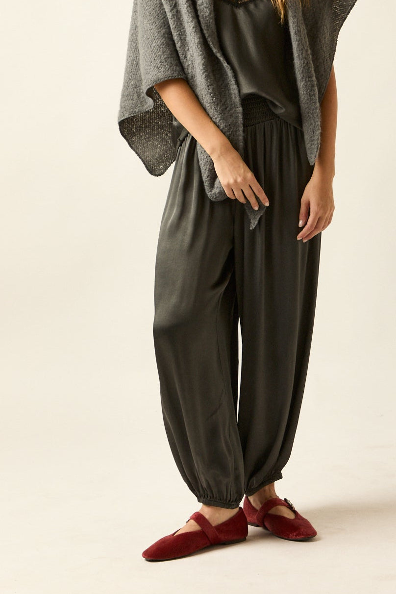Pantalón fluido estilo bombacho en tejido satinado topo. La cintura alta con nido de abeja elástico aporta comodidad y un ajuste favorecedor, mientras que el bajo con goma crea el característico efecto abombachado. Su caída ligera y con brillo sutil le da un aire sofisticado.
