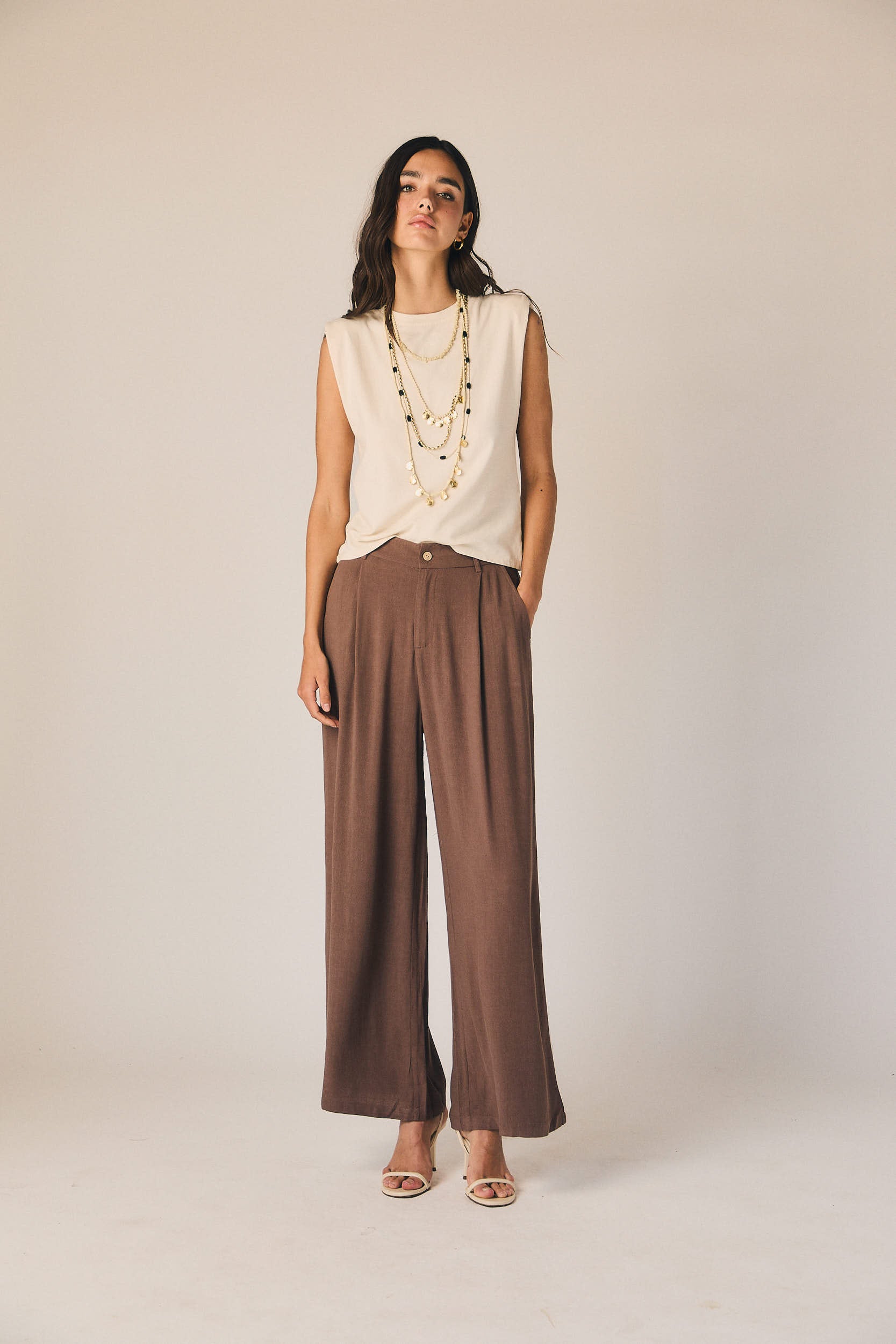 Pantalón de tiro medio en tono marrón con diseño de pierna ancha y recta. Presenta pinzas frontales que aportan estructura y caída, con cierre de botón y bolsillos laterales. El tejido fluido acompaña el movimiento sin ajustar.