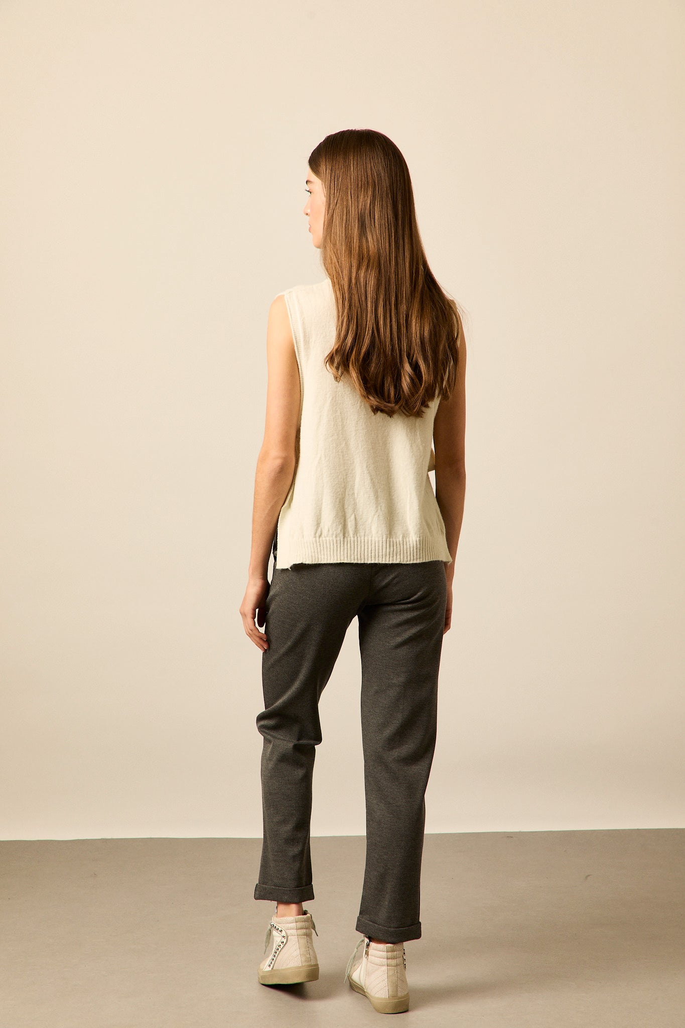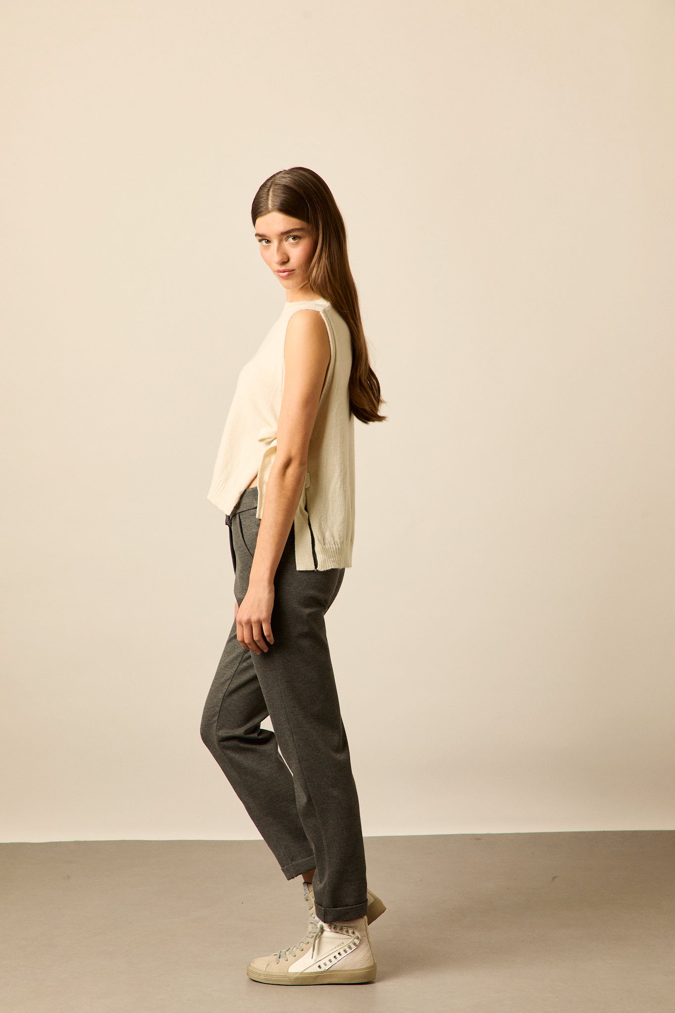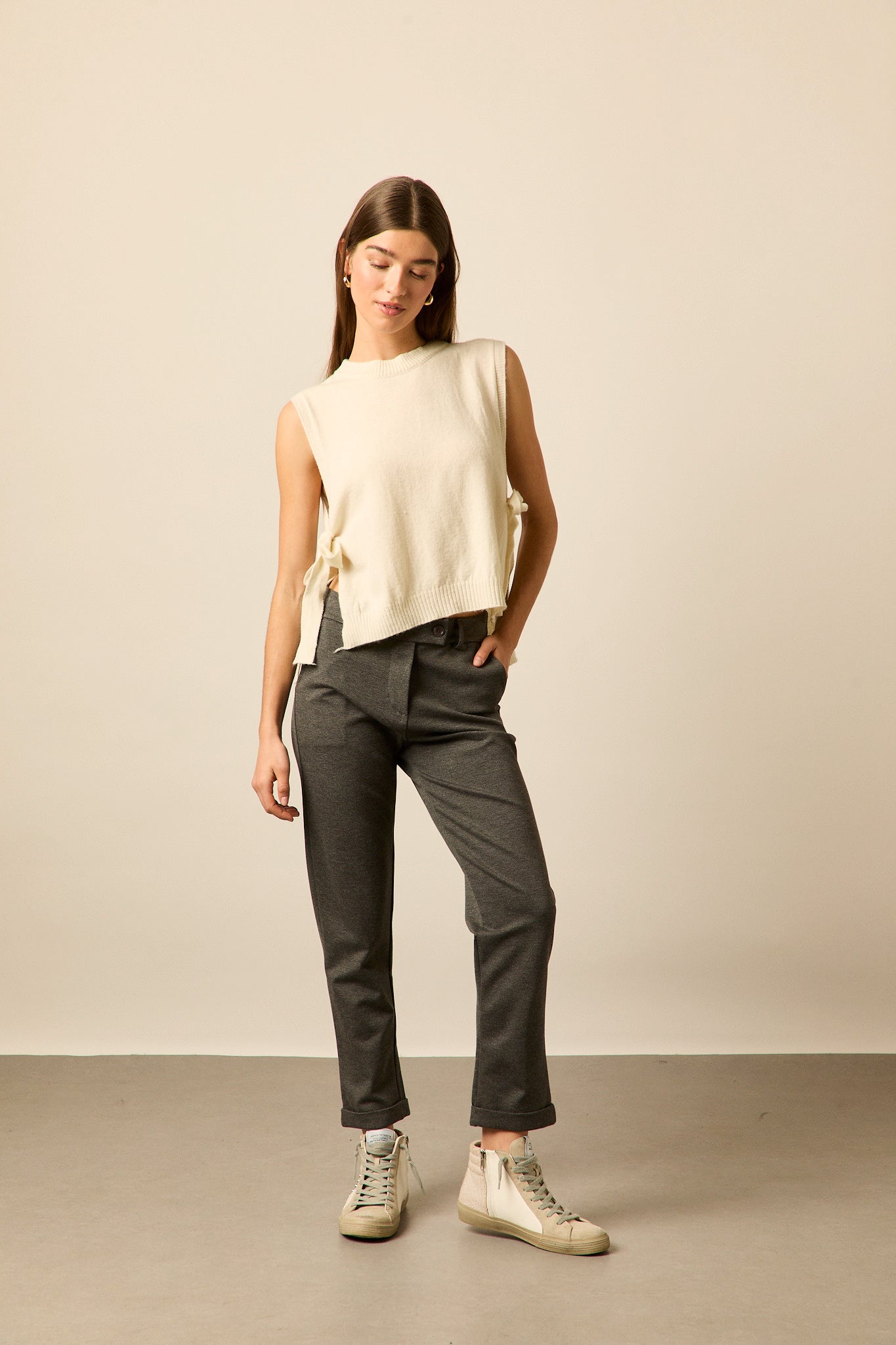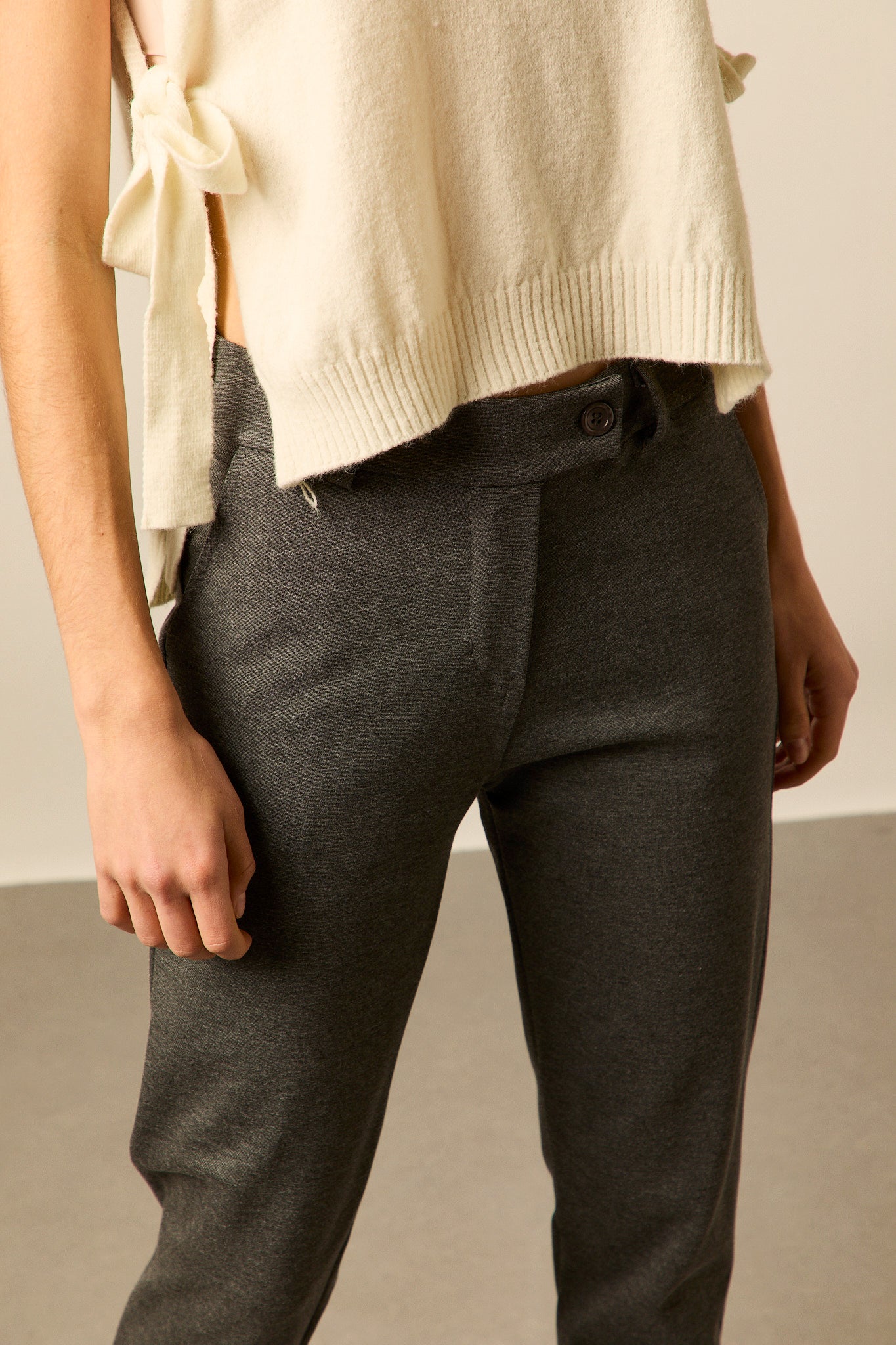 Pantalón de estilo sastre en color gris antracita, con cierre de botón y cremallera, bolsillos laterales y trabillas en la cintura. De corte recto y ligeramente entallado, aporta un aire elegante y atemporal que se adapta tanto a looks de oficina como a combinaciones más relajadas.