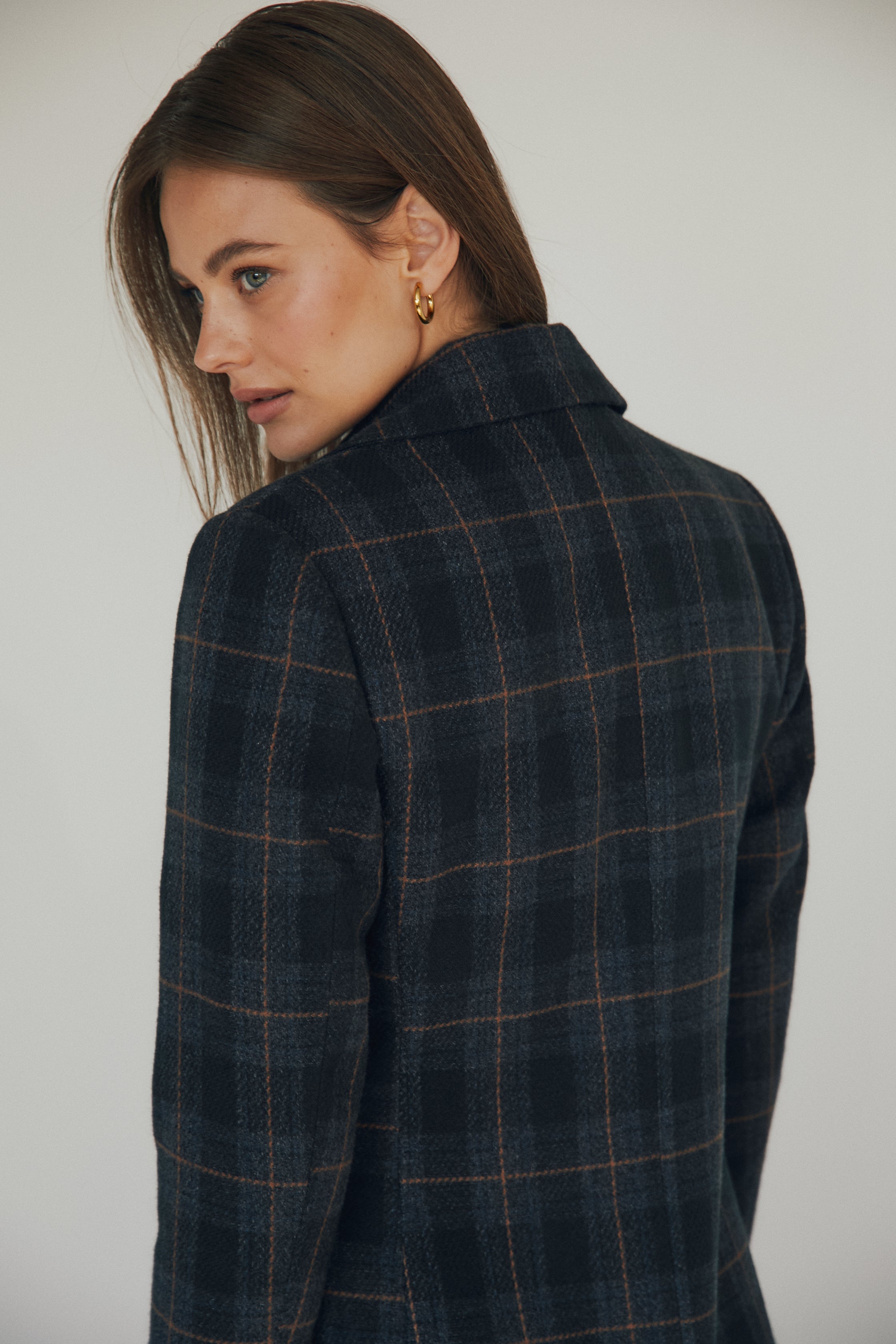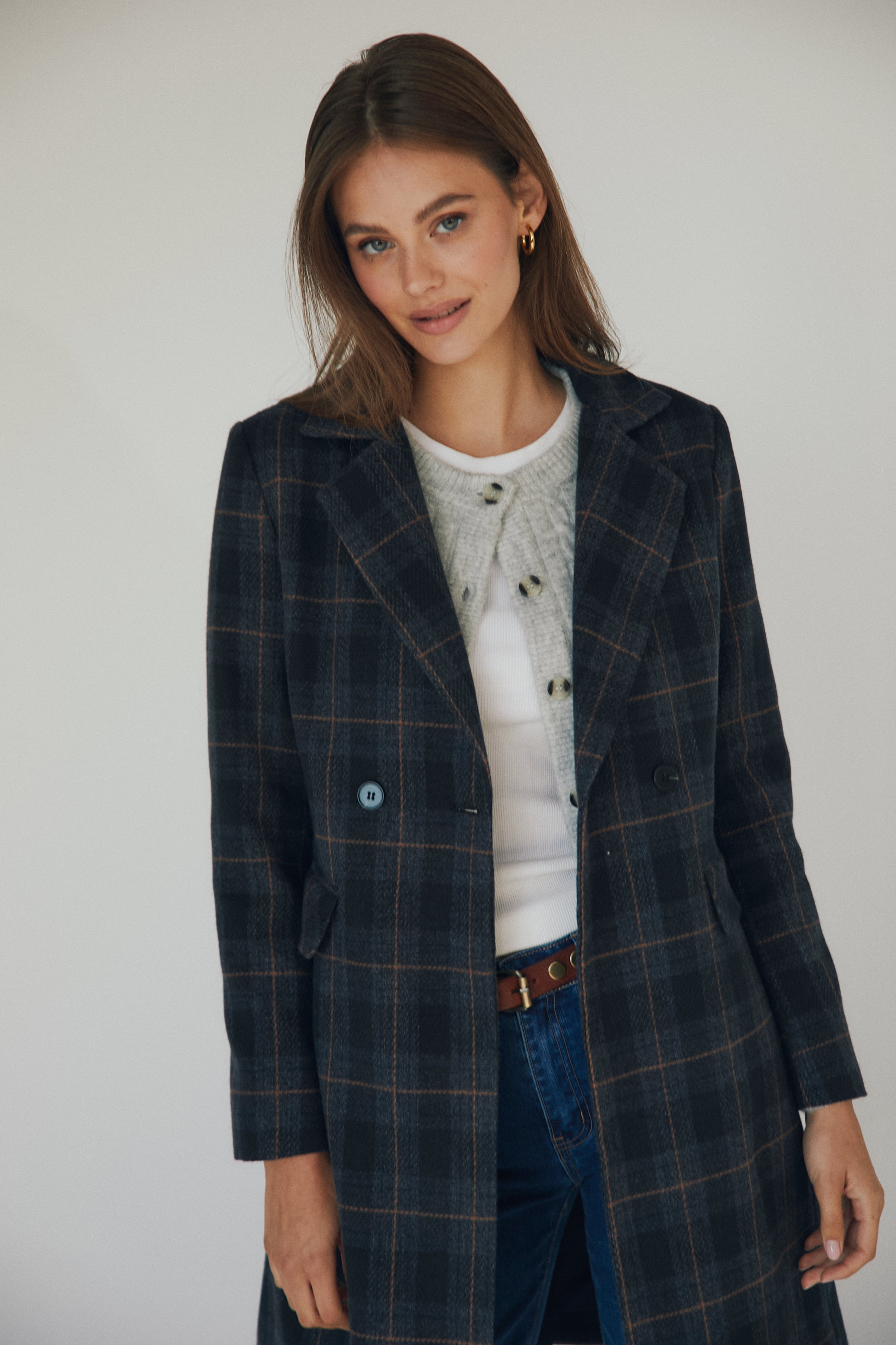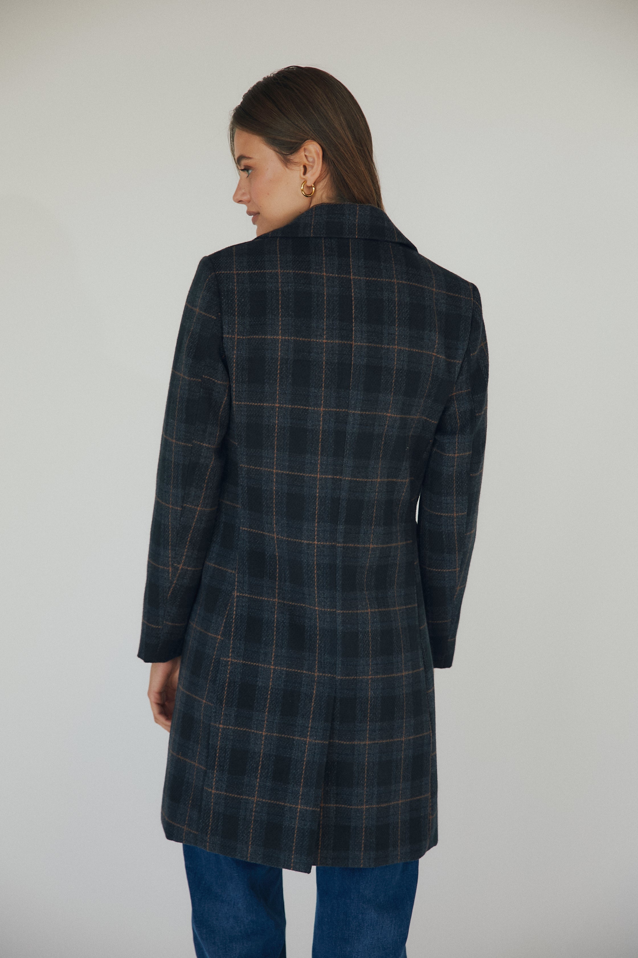 Abrigo largo de paño con estampado de cuadros en tonos azul marino y finas líneas en contraste. De corte recto, presenta cuello con solapas, cierre de doble botonadura y bolsillos con solapa a ambos lados. Su diseño clásico y favorecedor se adapta con facilidad tanto a looks casual como más formales.