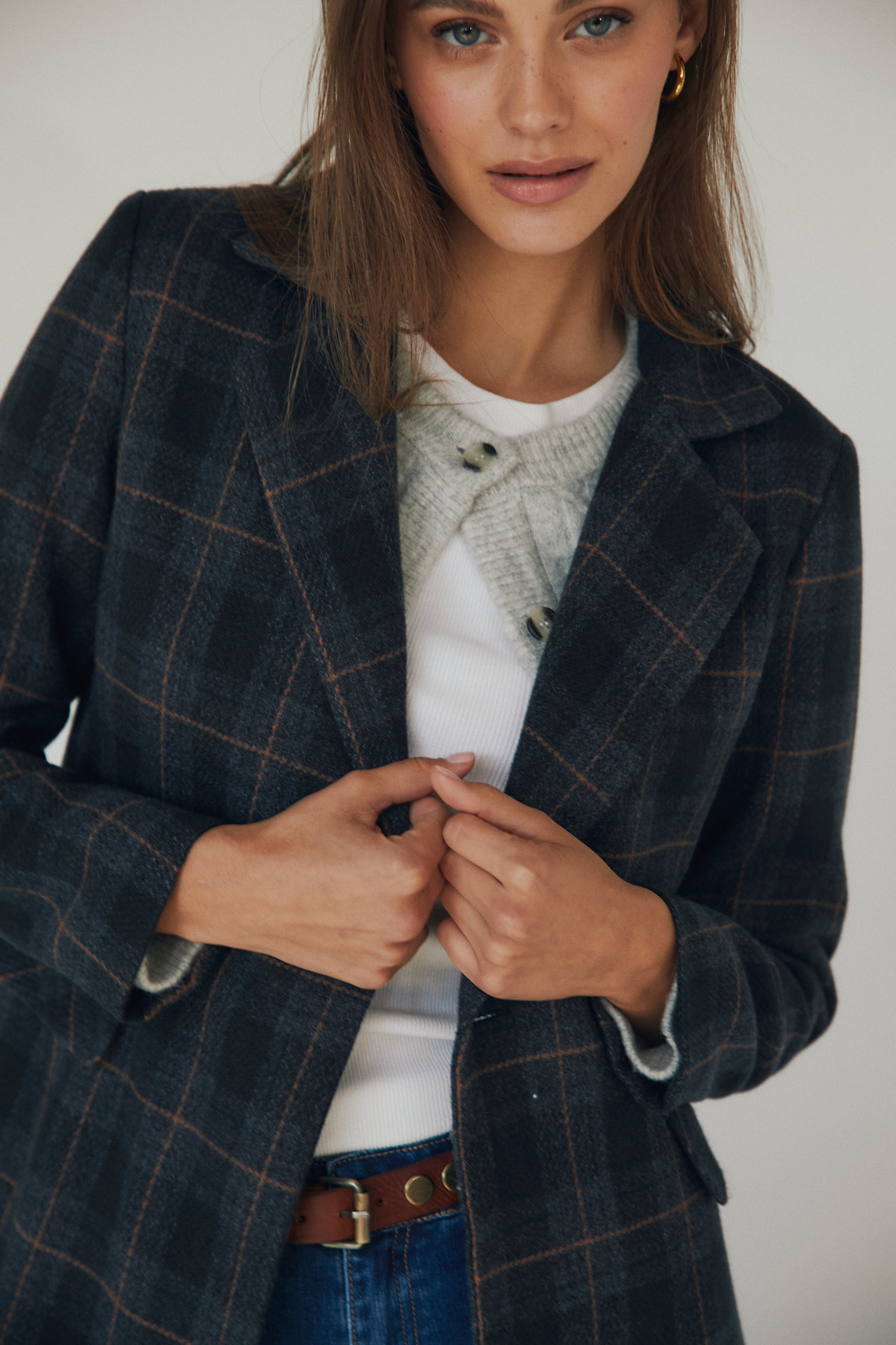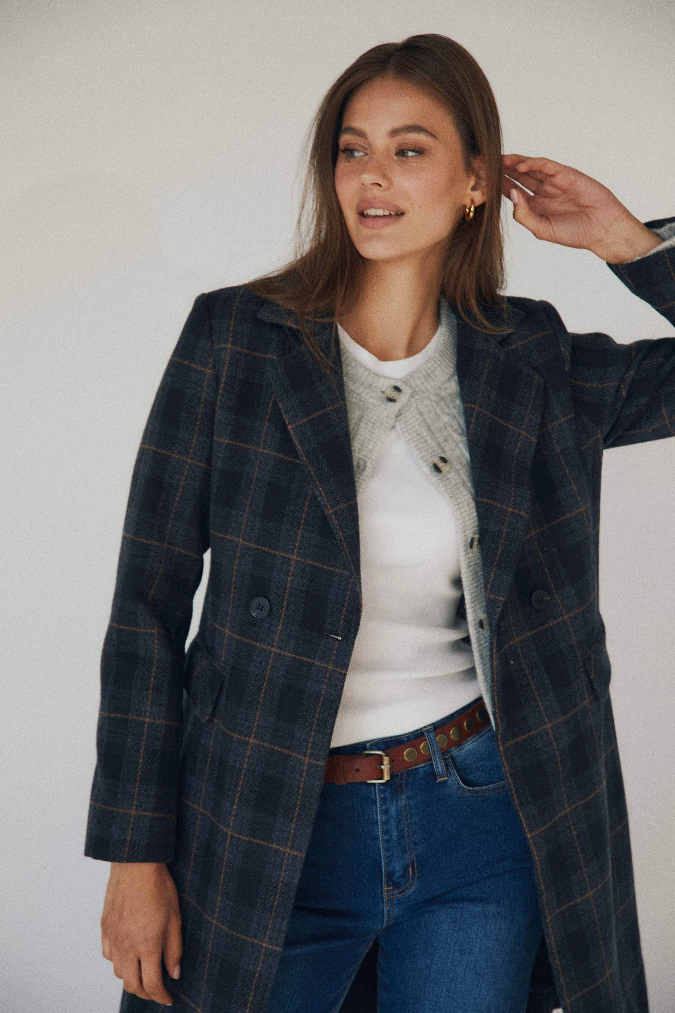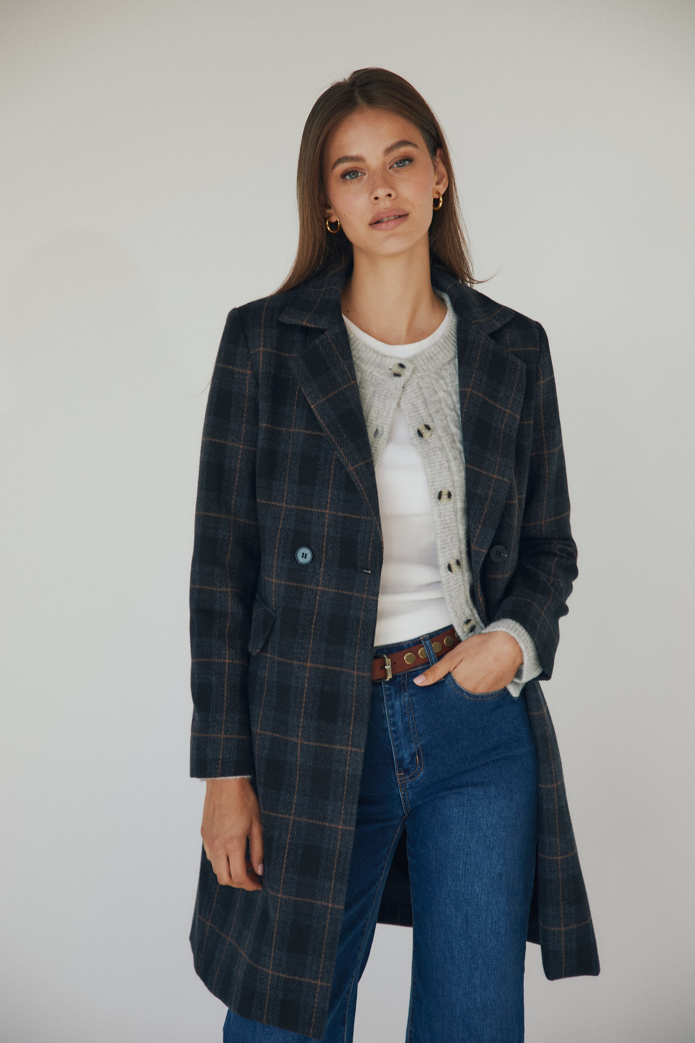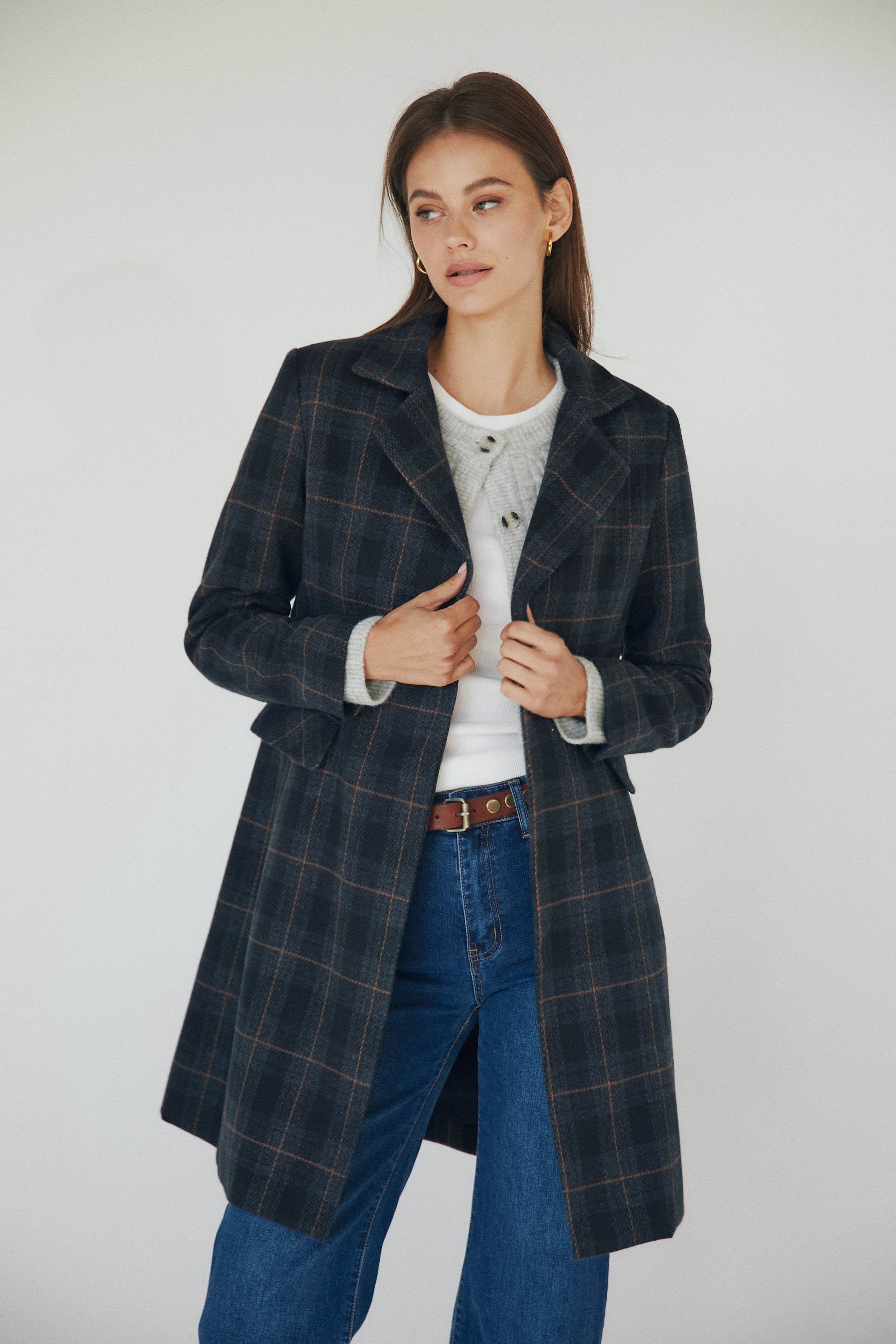 Abrigo largo de paño con estampado de cuadros en tonos azul marino y finas líneas en contraste. De corte recto, presenta cuello con solapas, cierre de doble botonadura y bolsillos con solapa a ambos lados. Su diseño clásico y favorecedor se adapta con facilidad tanto a looks casual como más formales.