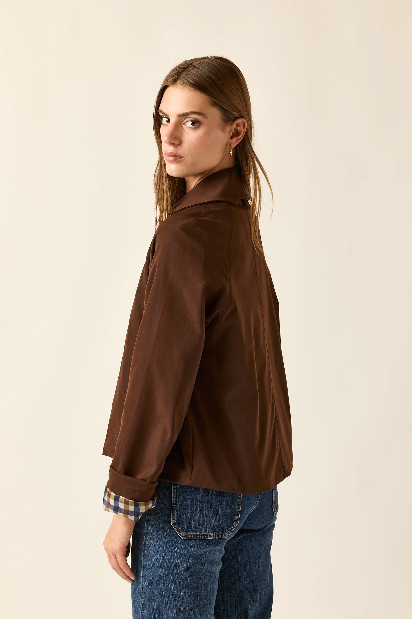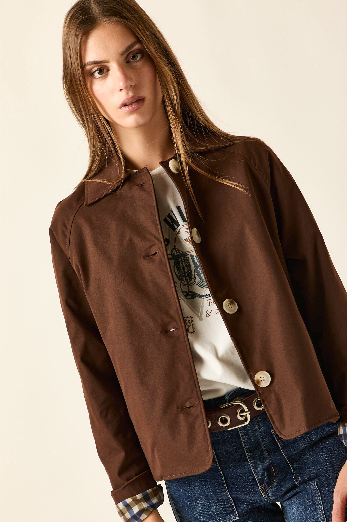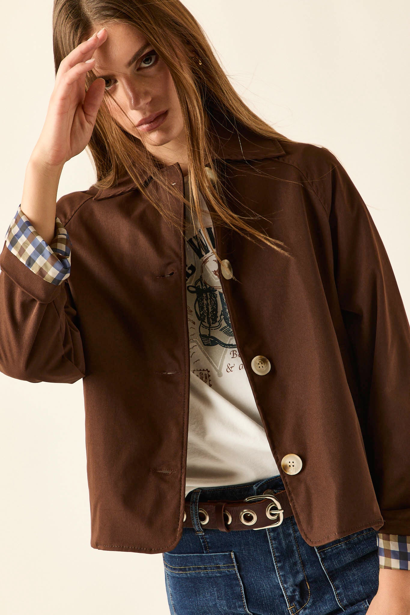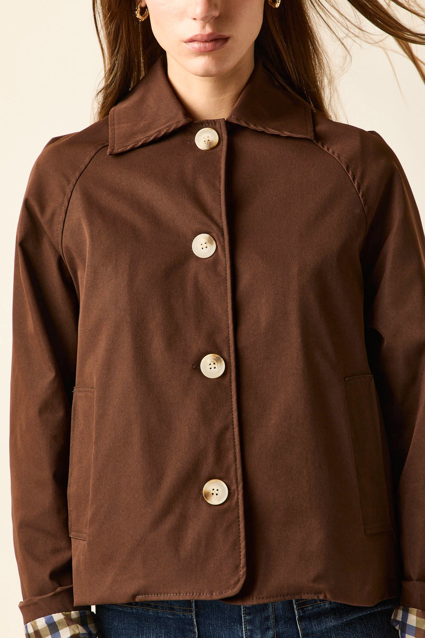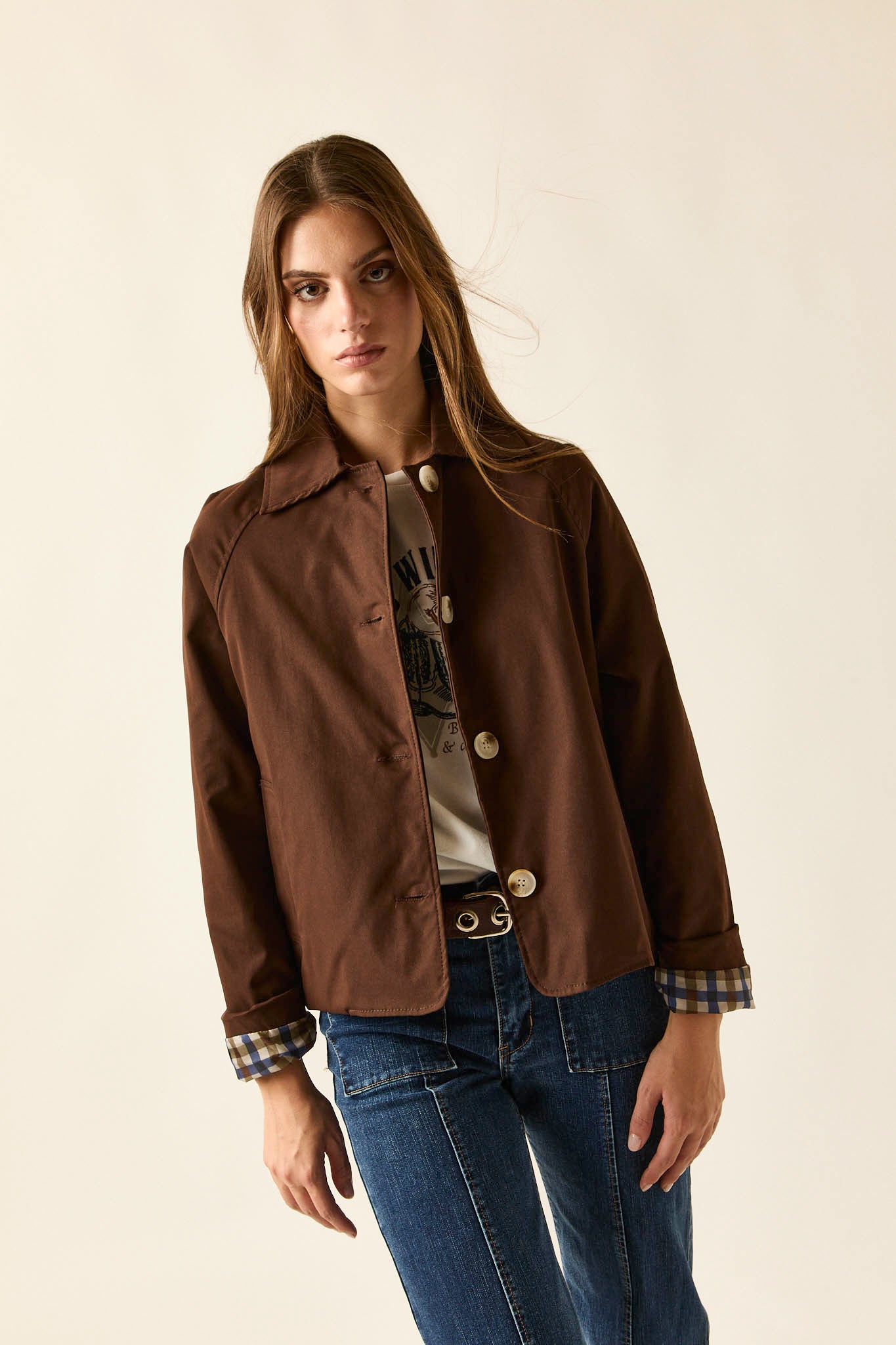 Gabardina corta en color marrón con cierre frontal de botones grandes en contraste. Presenta cuello de solapa clásico, bolsillos laterales discretos y detalle de forro interior en estampado de cuadros que aporta un guiño especial al diseño. Su silueta recta y ligera la convierte en una prenda versátil para entretiempo.