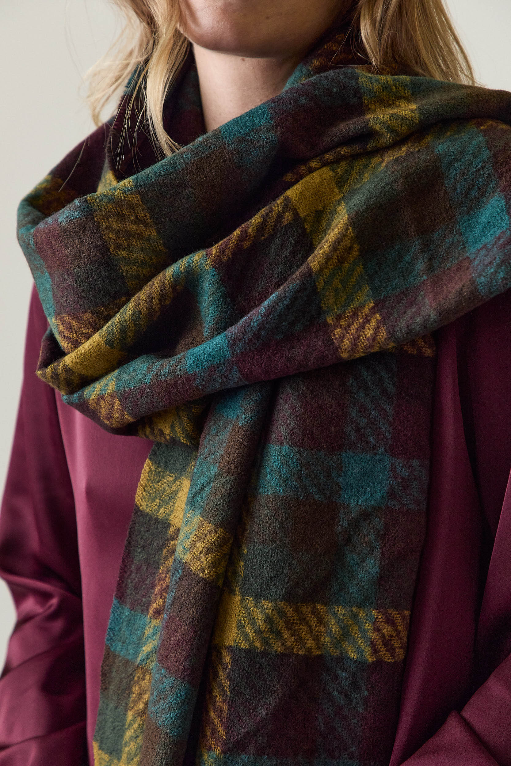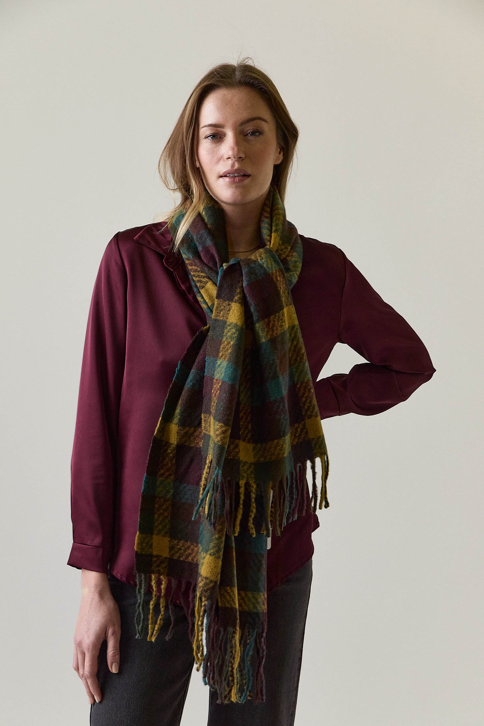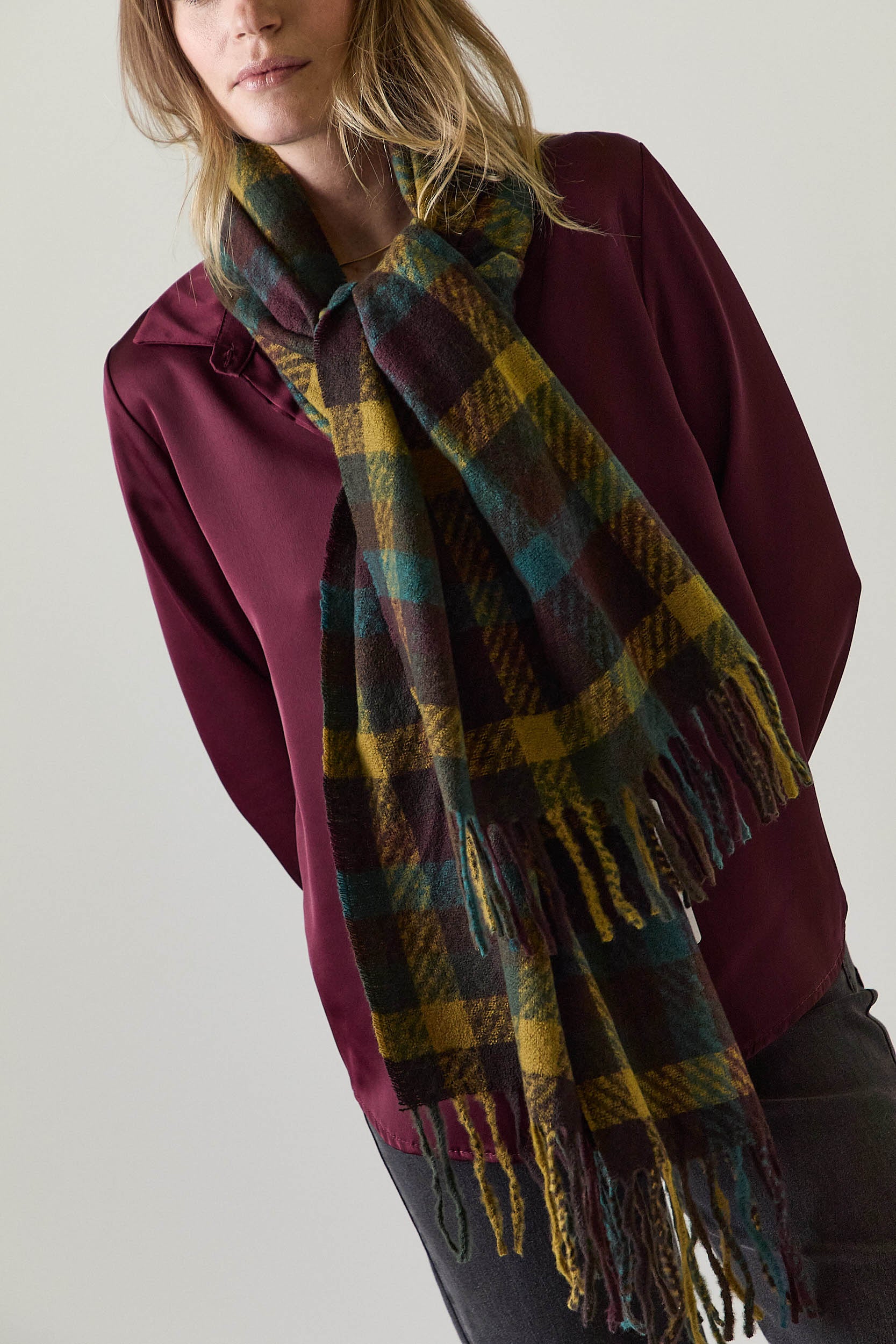 Bufanda de cuadros en una combinación de tonos lima, verde, burdeos y amarillo mostaza. Su diseño presenta un cuadro clásico de tamaño medio y flecos largos que aportan textura y movimiento.