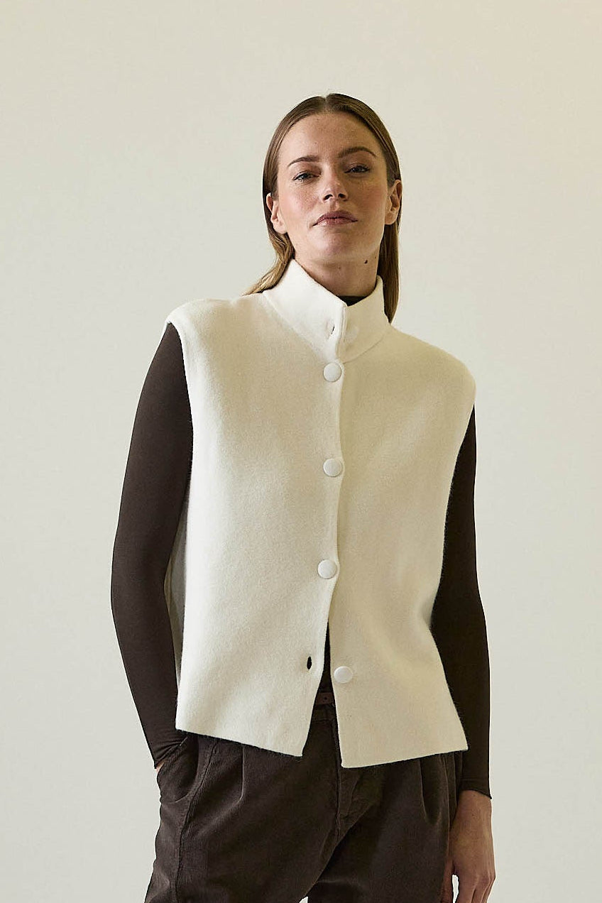 Chaleco en tono natural con cuello subido y cierre frontal de botones forrados. Diseño sin mangas, corte recto y bajo ligeramente abierto en el centro. Un básico versátil para sumar capas en entretiempo o llevar como pieza principal en looks de estilo depurado.