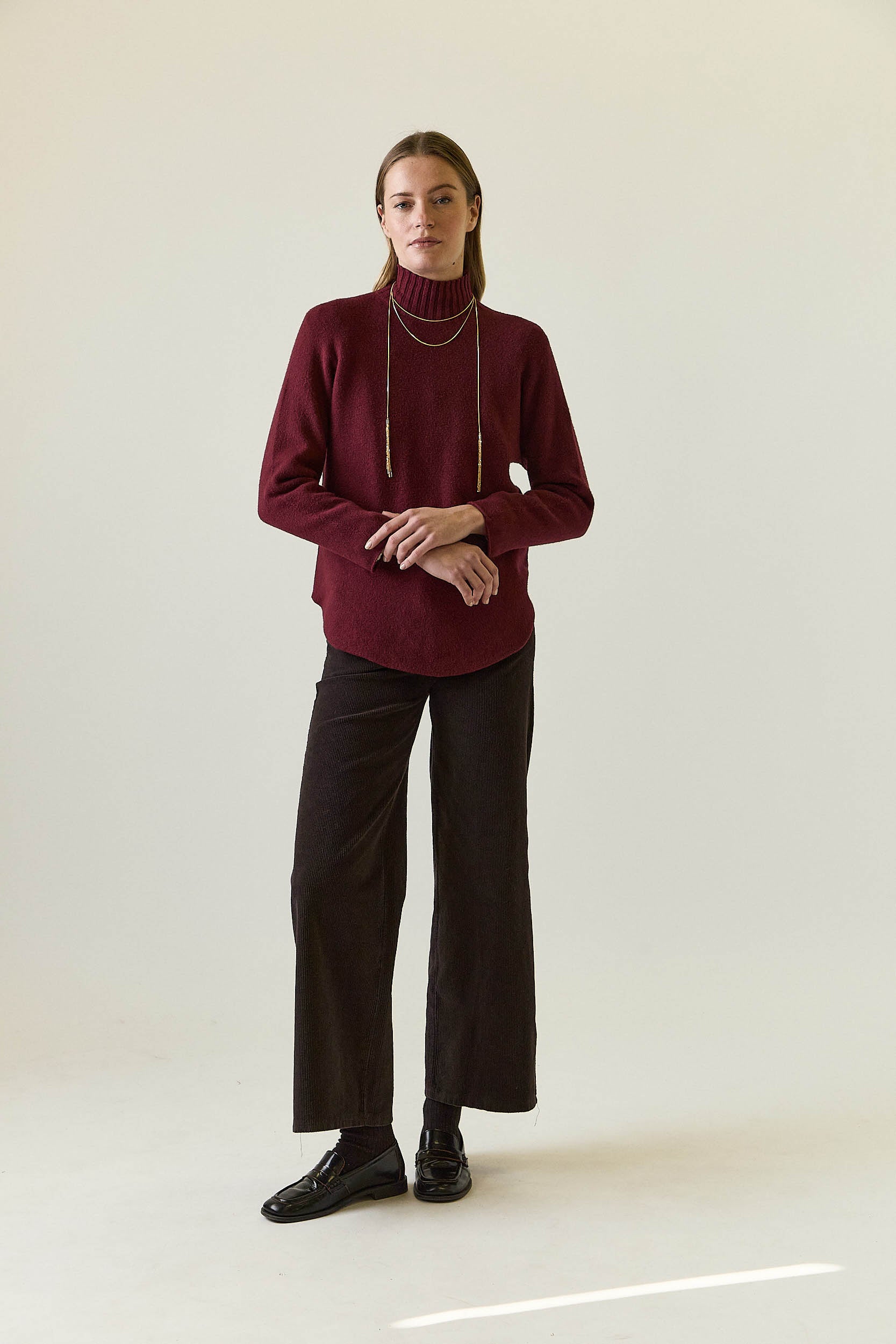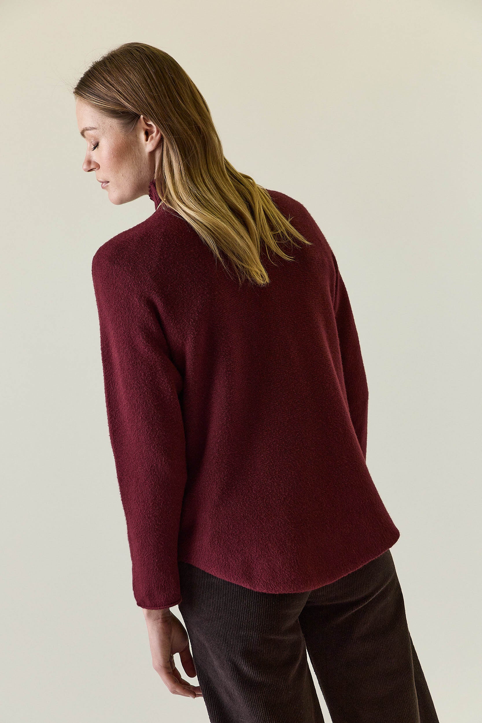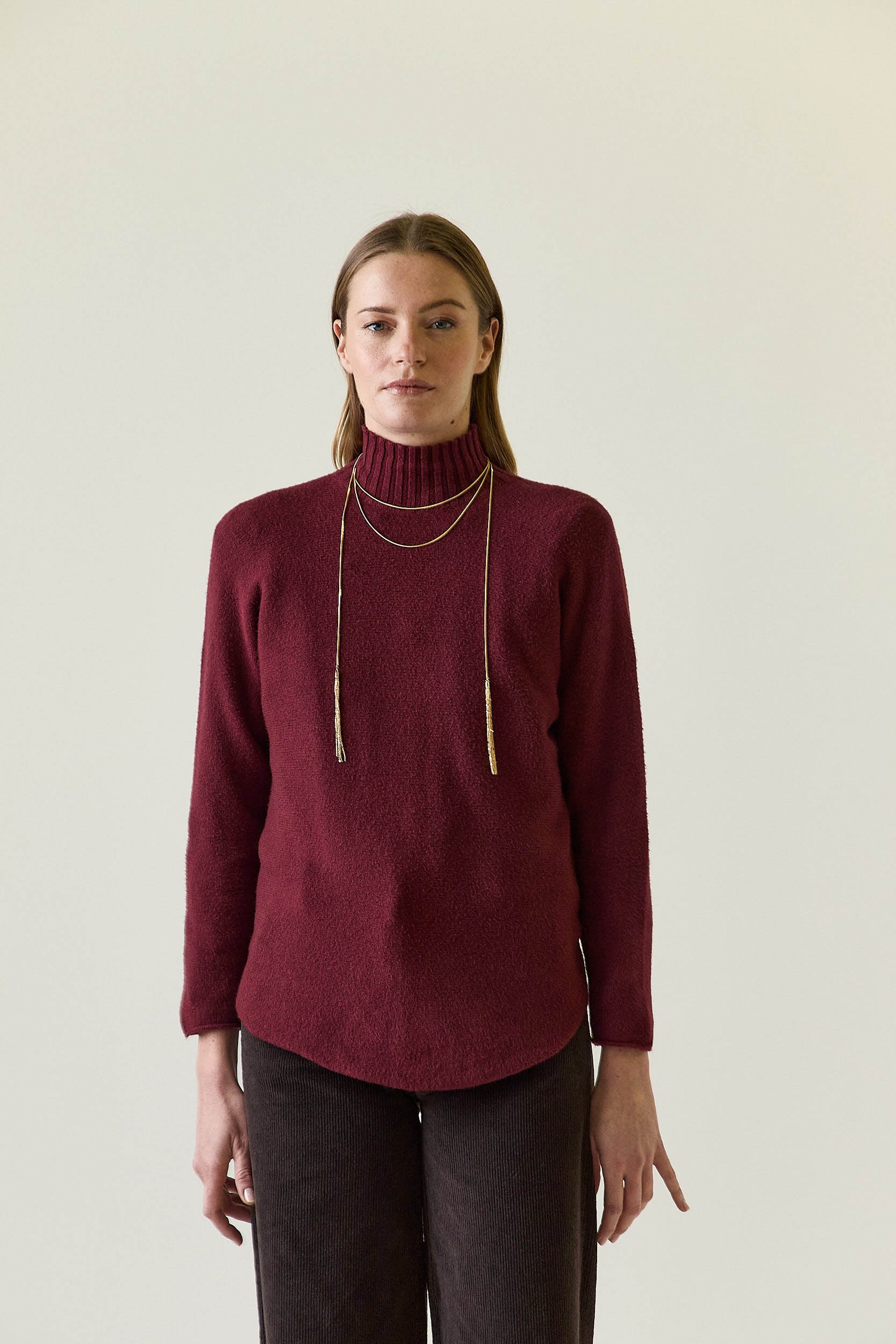 Jersey de punto en tono vino con cuello perkins acanalado que se ajusta suavemente al cuello. Presenta corte recto y limpio, con manga larga y acabados sencillos que aportan una silueta equilibrada y atemporal. El bajo ligeramente redondeado suaviza el diseño y favorece el conjunto.