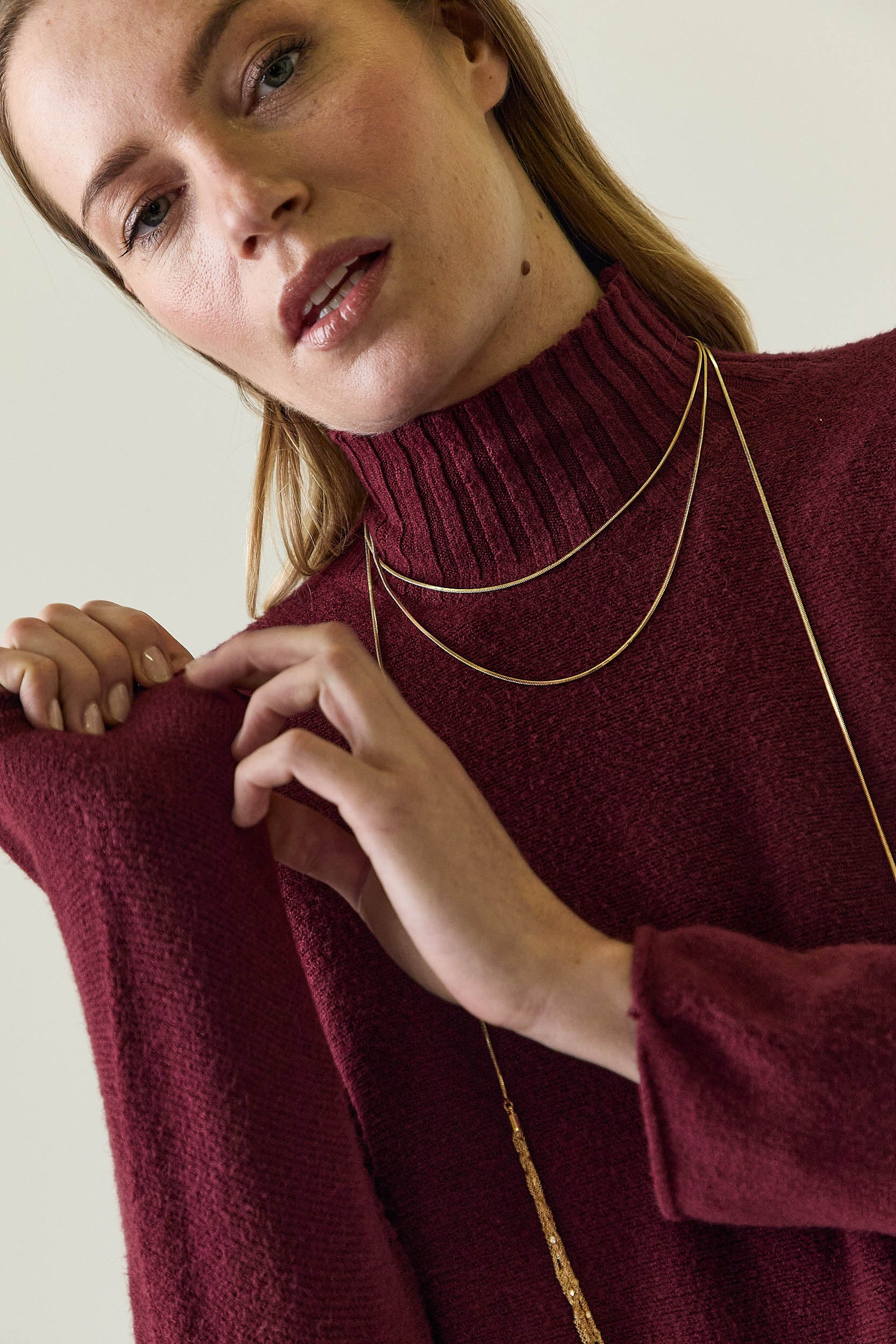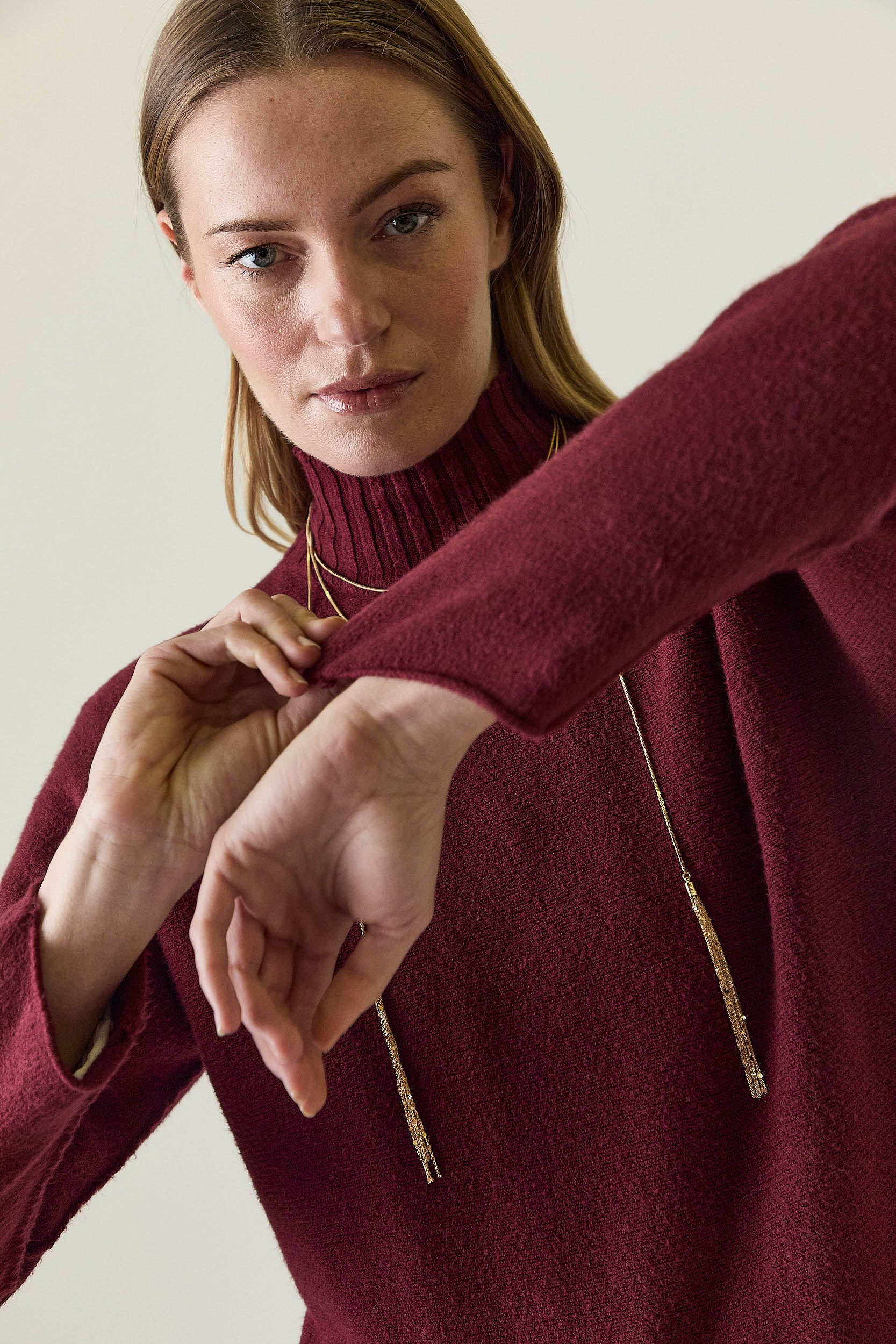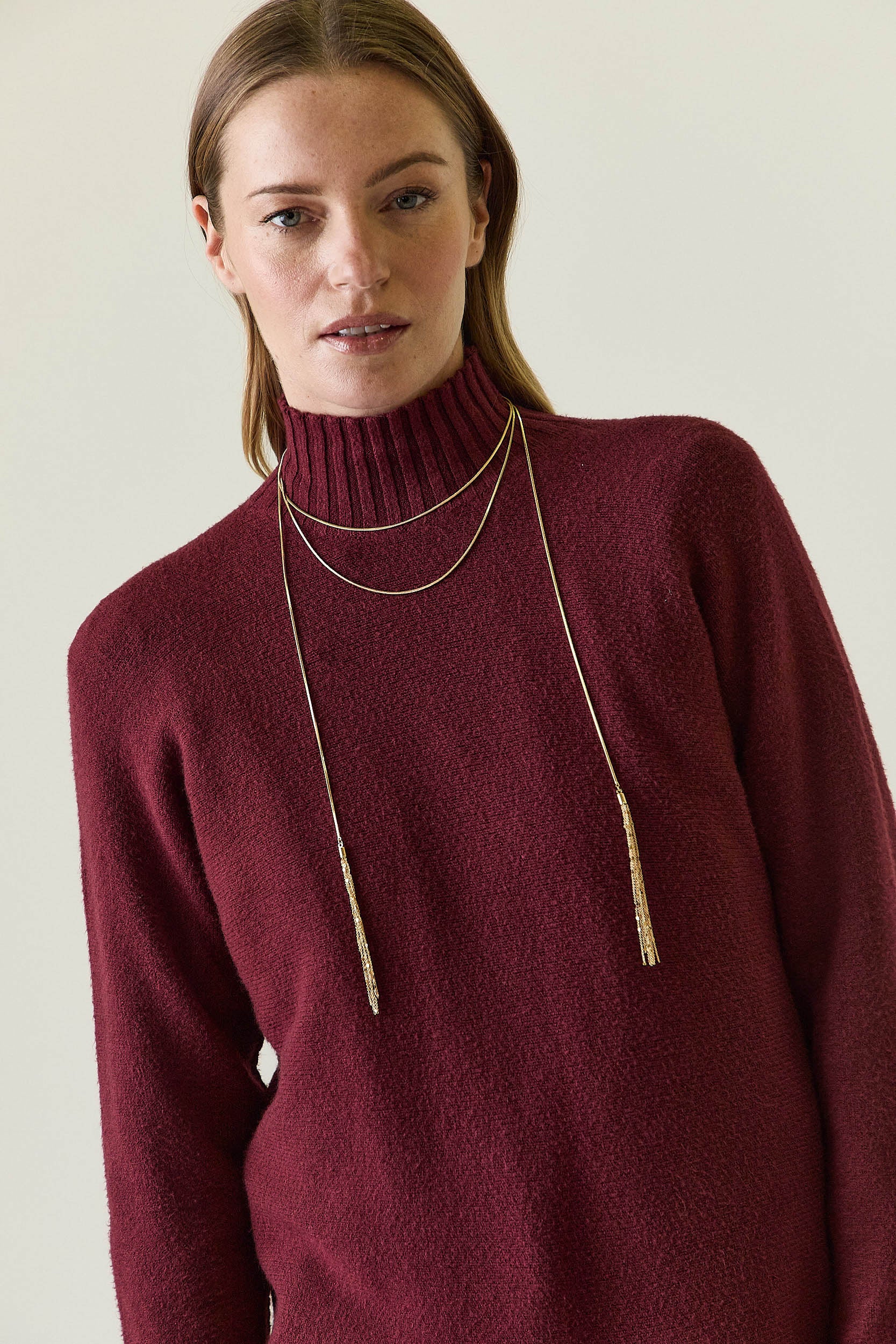 Jersey de punto en tono vino con cuello perkins acanalado que se ajusta suavemente al cuello. Presenta corte recto y limpio, con manga larga y acabados sencillos que aportan una silueta equilibrada y atemporal. El bajo ligeramente redondeado suaviza el diseño y favorece el conjunto.