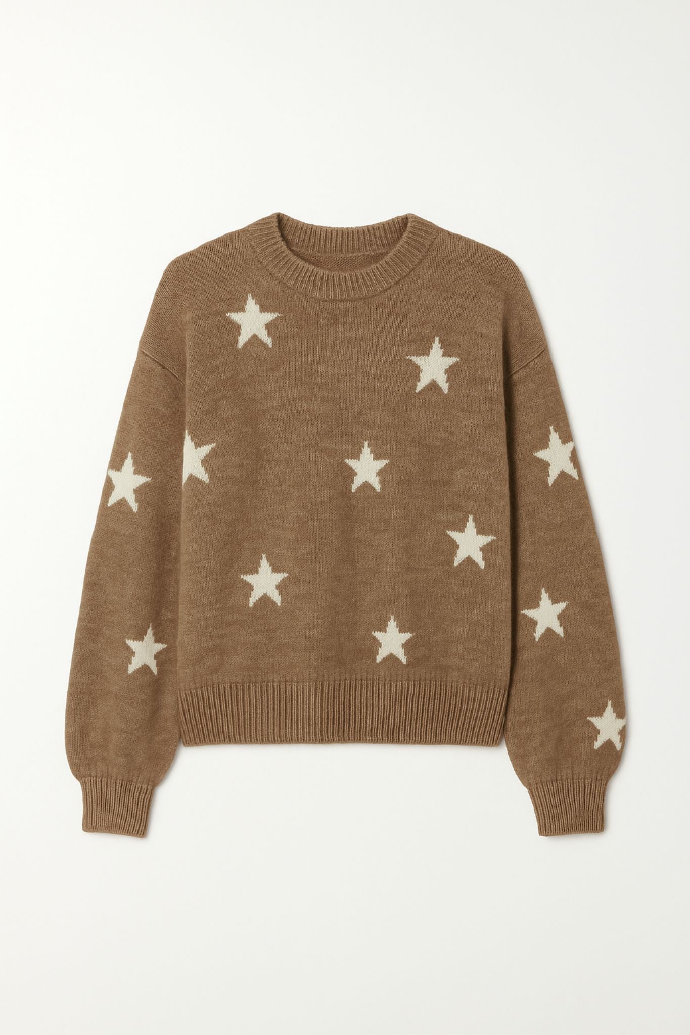 Jersey en tono topo con motivo de estrellas en contraste crudo. Diseño de cuello redondo con rib fino y manga larga de hombro caído. Las mangas presentan volumen suave y puño ligeramente fruncido, aportando una silueta relajada. Corte recto y largo a la cadera, pensado para llevar suelto o ligeramente metido por delante.