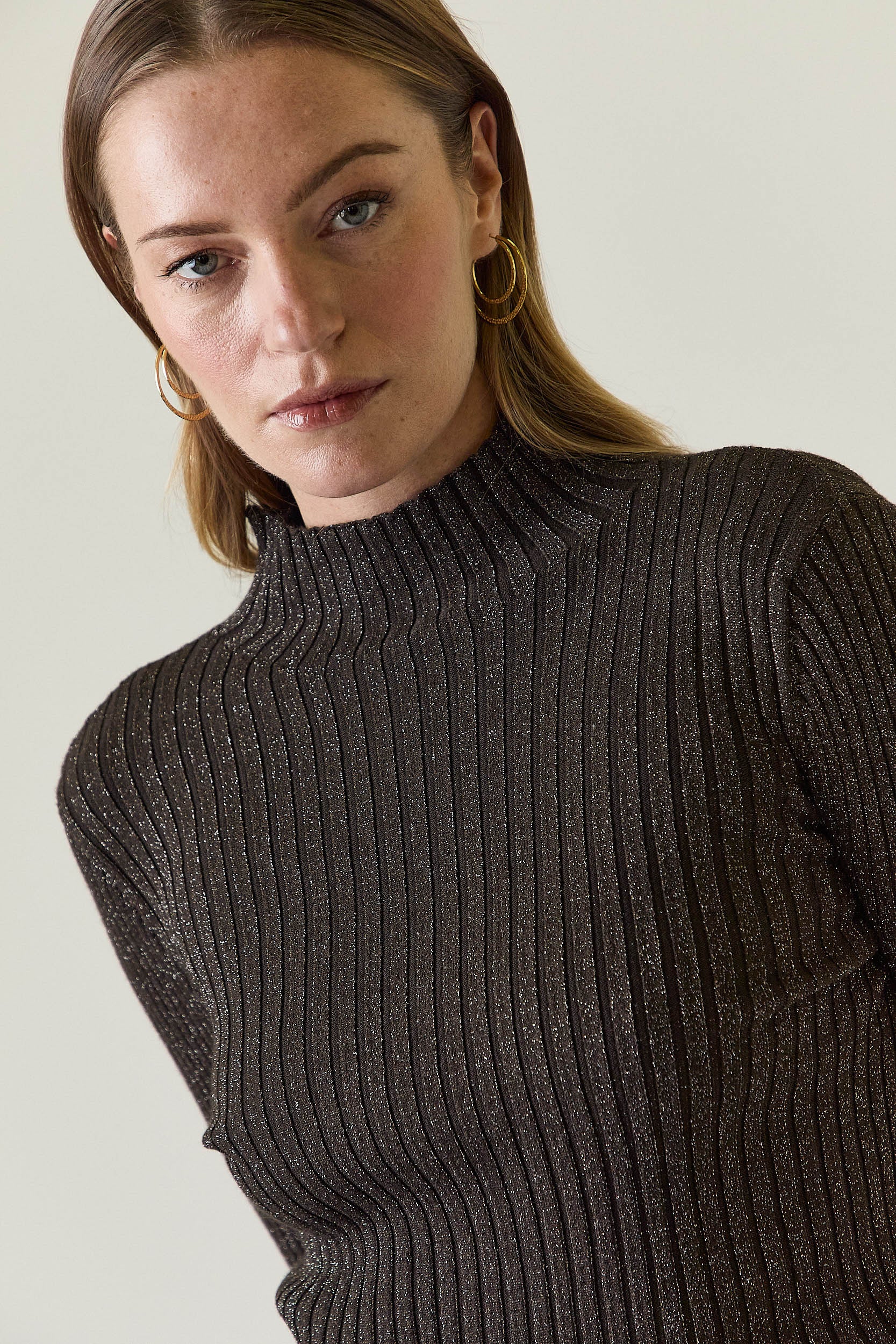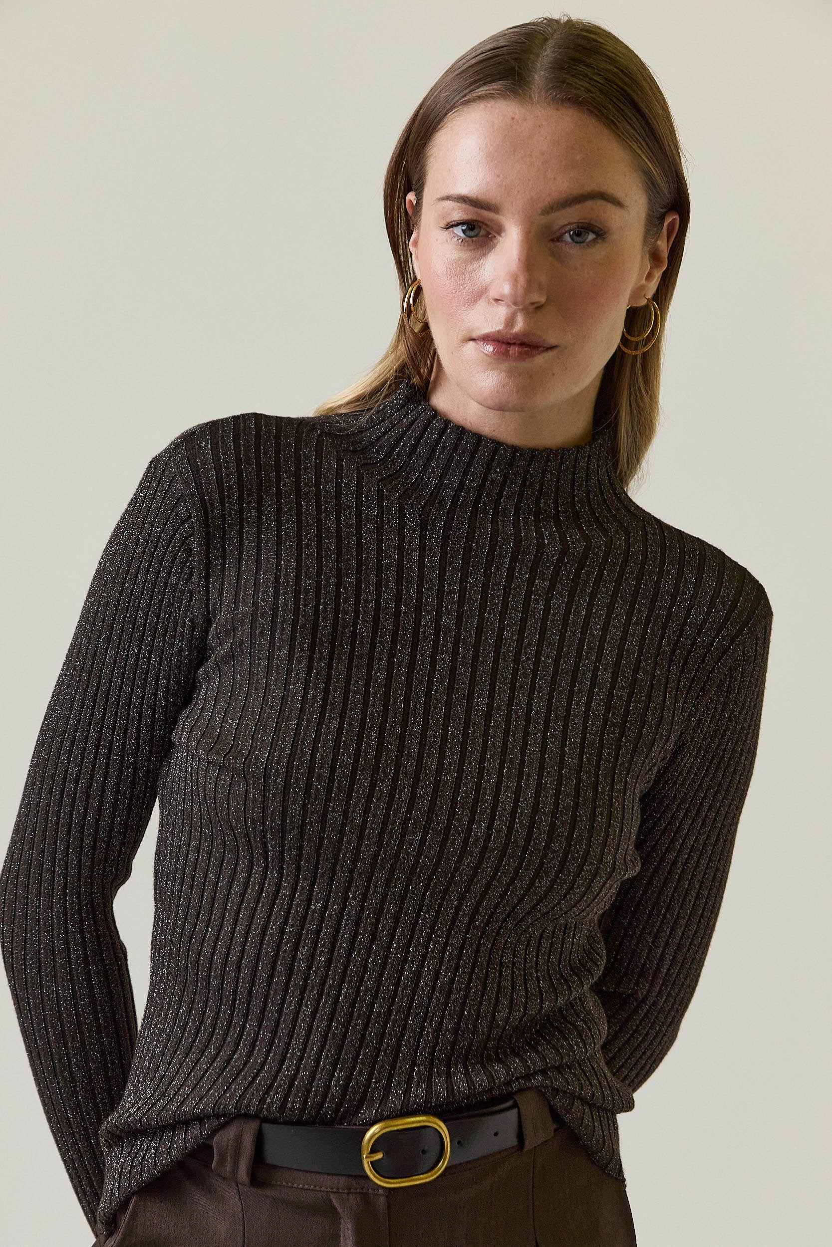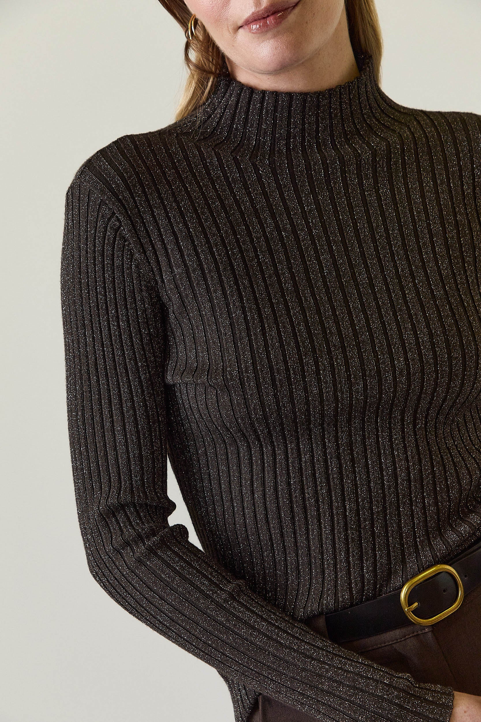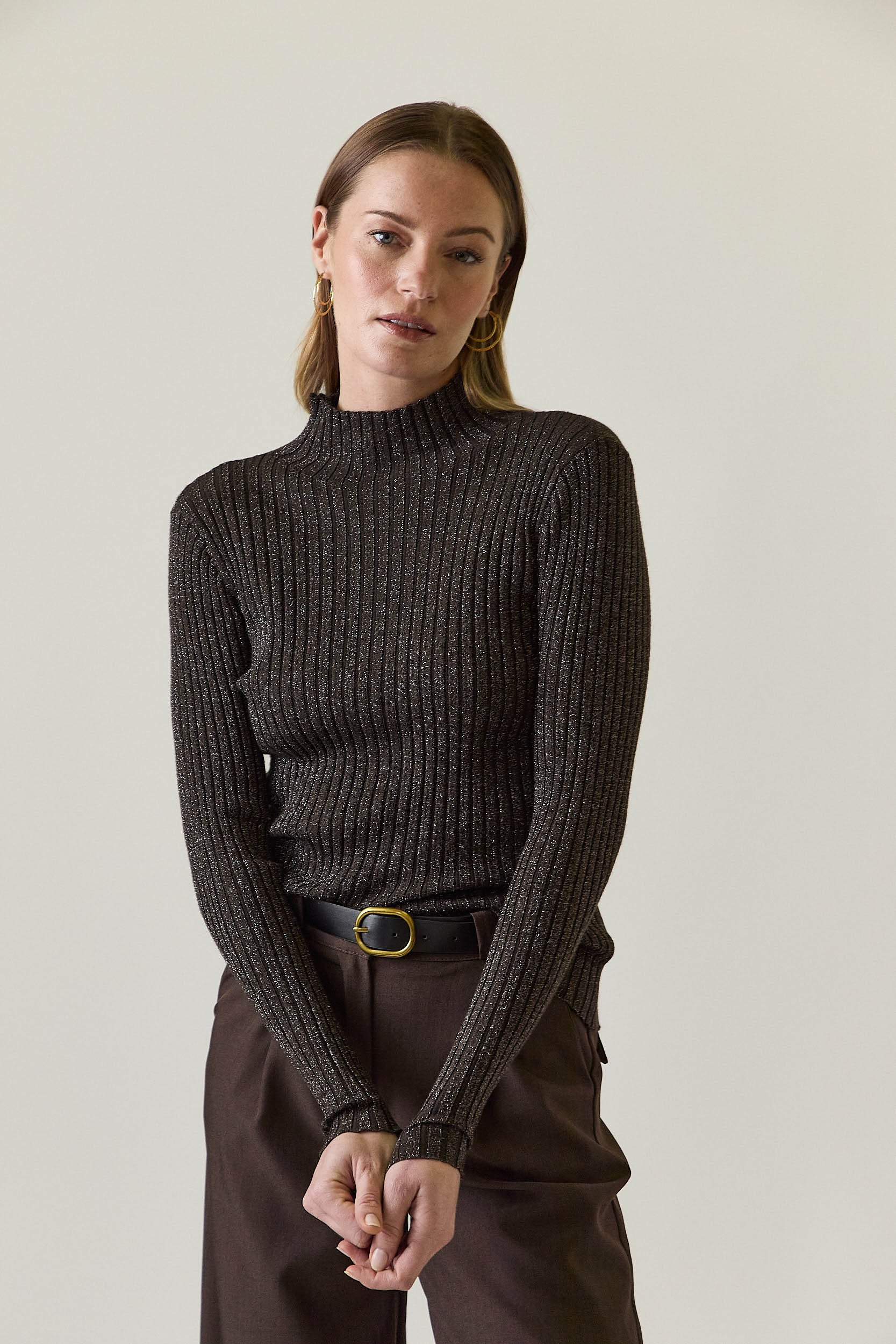 Jersey de punto fino con textura canalé y acabado lurex integrado en el hilo. Presenta cuello ligeramente subido y manga larga. Su silueta es ajustada, acompañando la forma del cuerpo sin rigidez gracias a la elasticidad del tejido. Largo estándar, pensado para llevar tanto por dentro como por fuera del pantalón. El brillo es sutil y uniforme, aportando profundidad al color marrón.