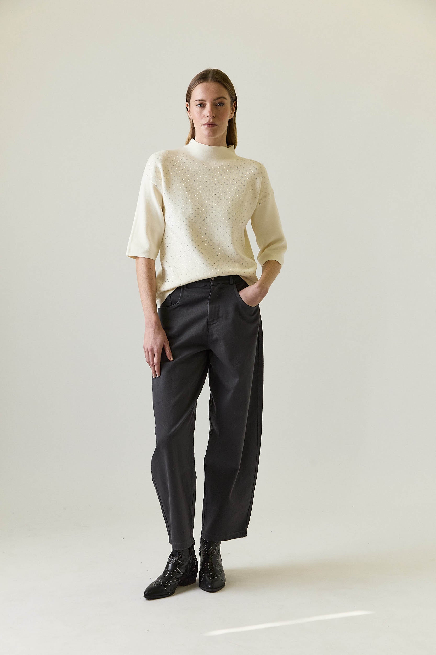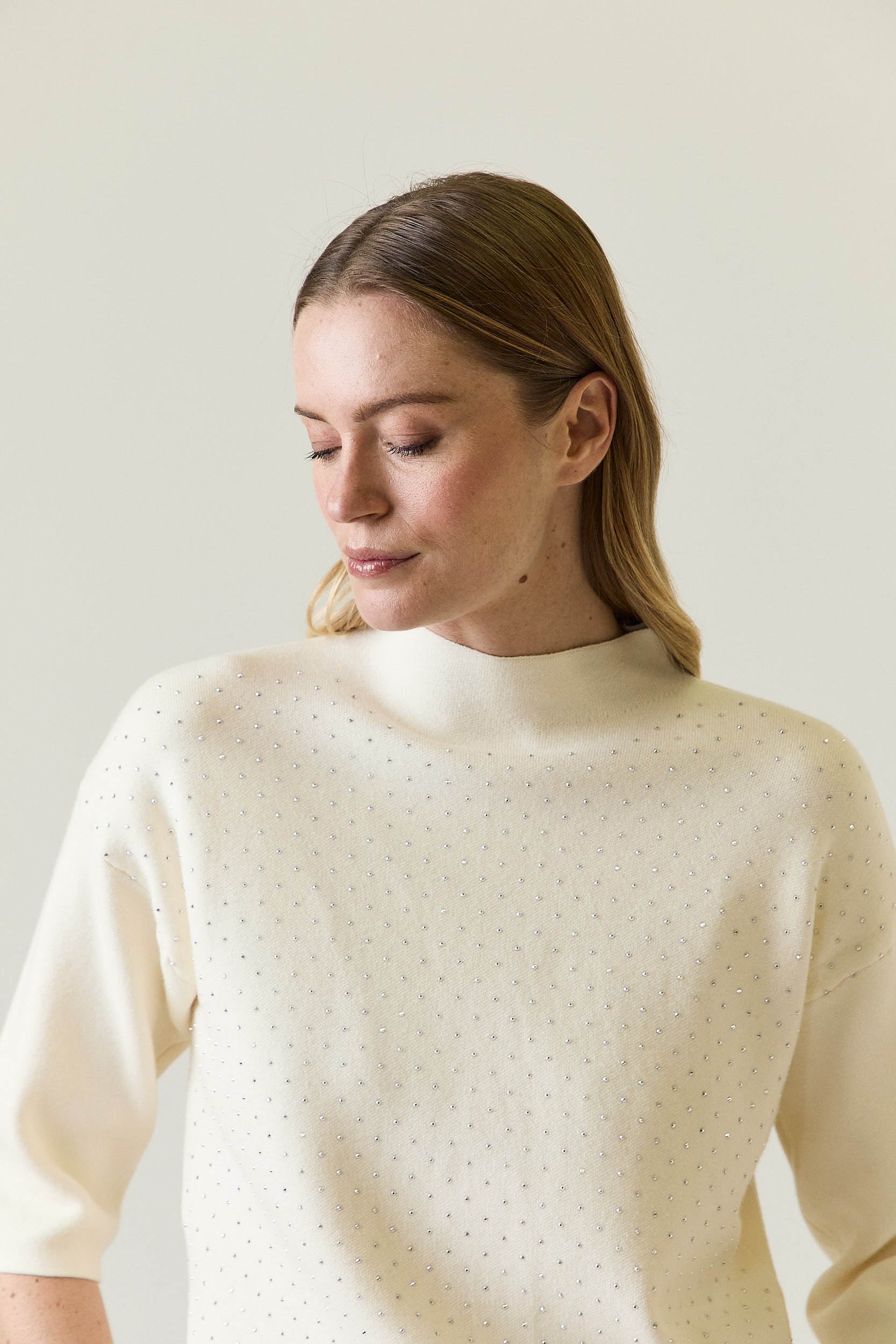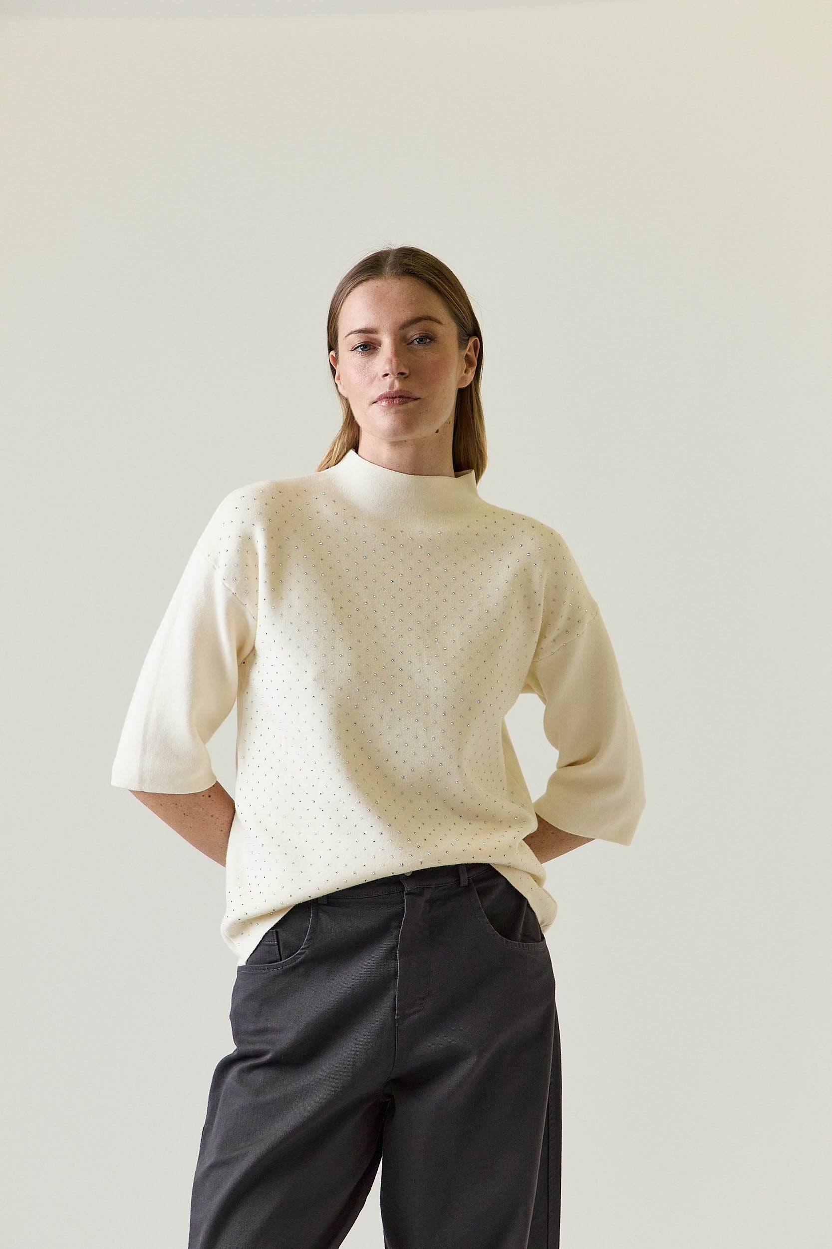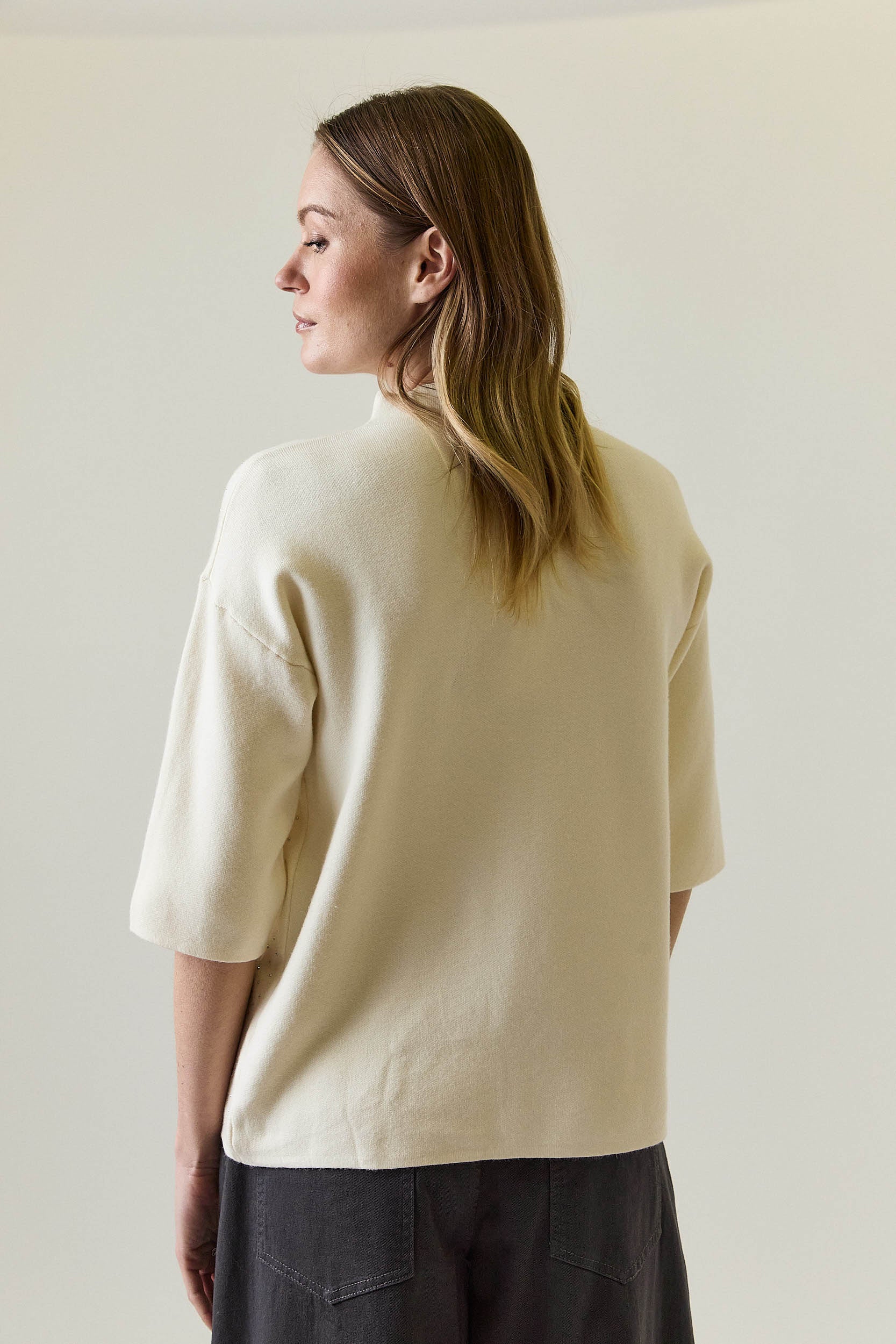 Jersey en color crudo con diseño de punto fino y corte recto, rematado con pequeñas tachas metálicas repartidas de forma regular en la parte frontal. Presenta cuello ligeramente subido y mangas tres cuartos, creando una silueta limpia y equilibrada. La espalda es lisa, aportando contraste y manteniendo el protagonismo en el delantero.