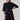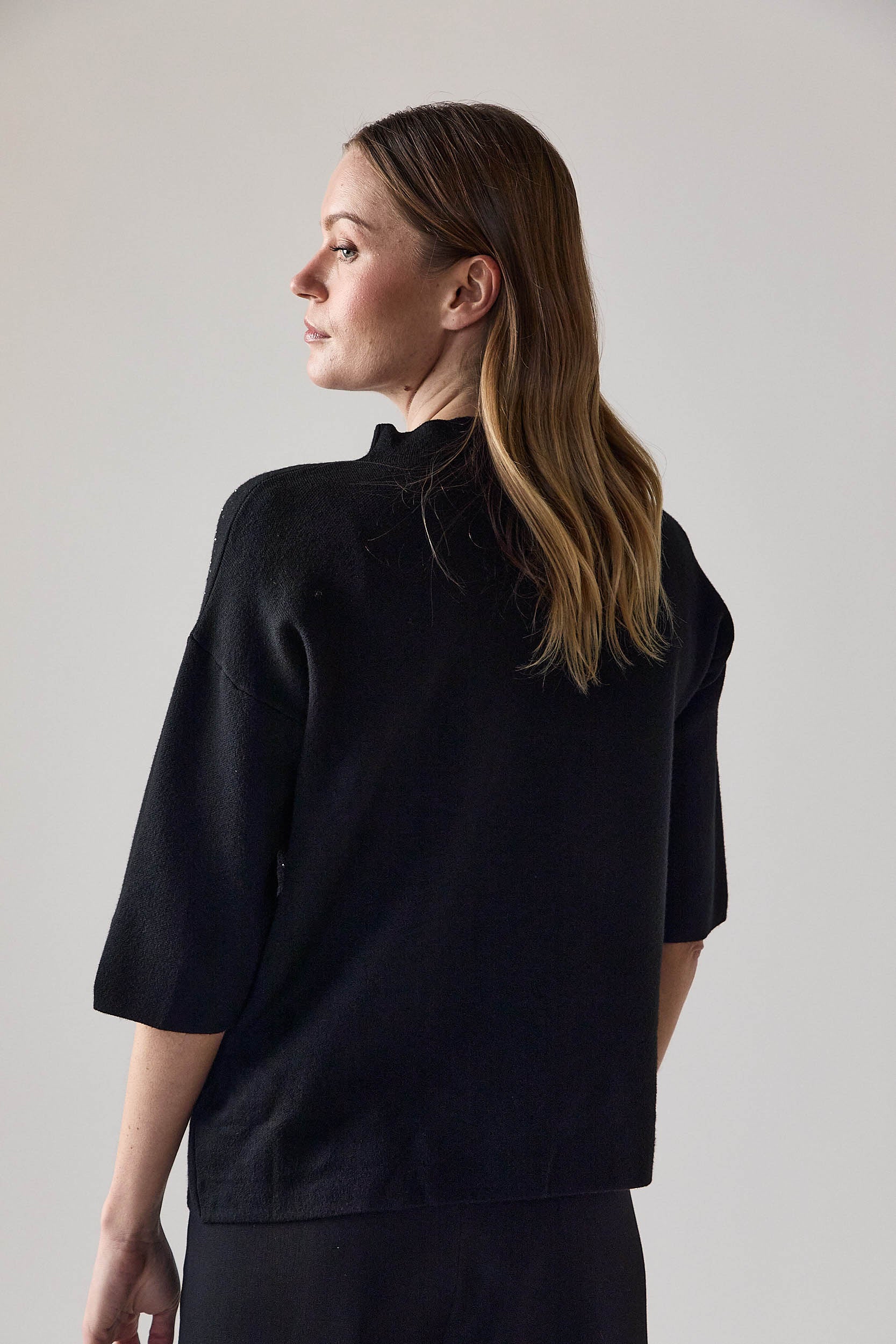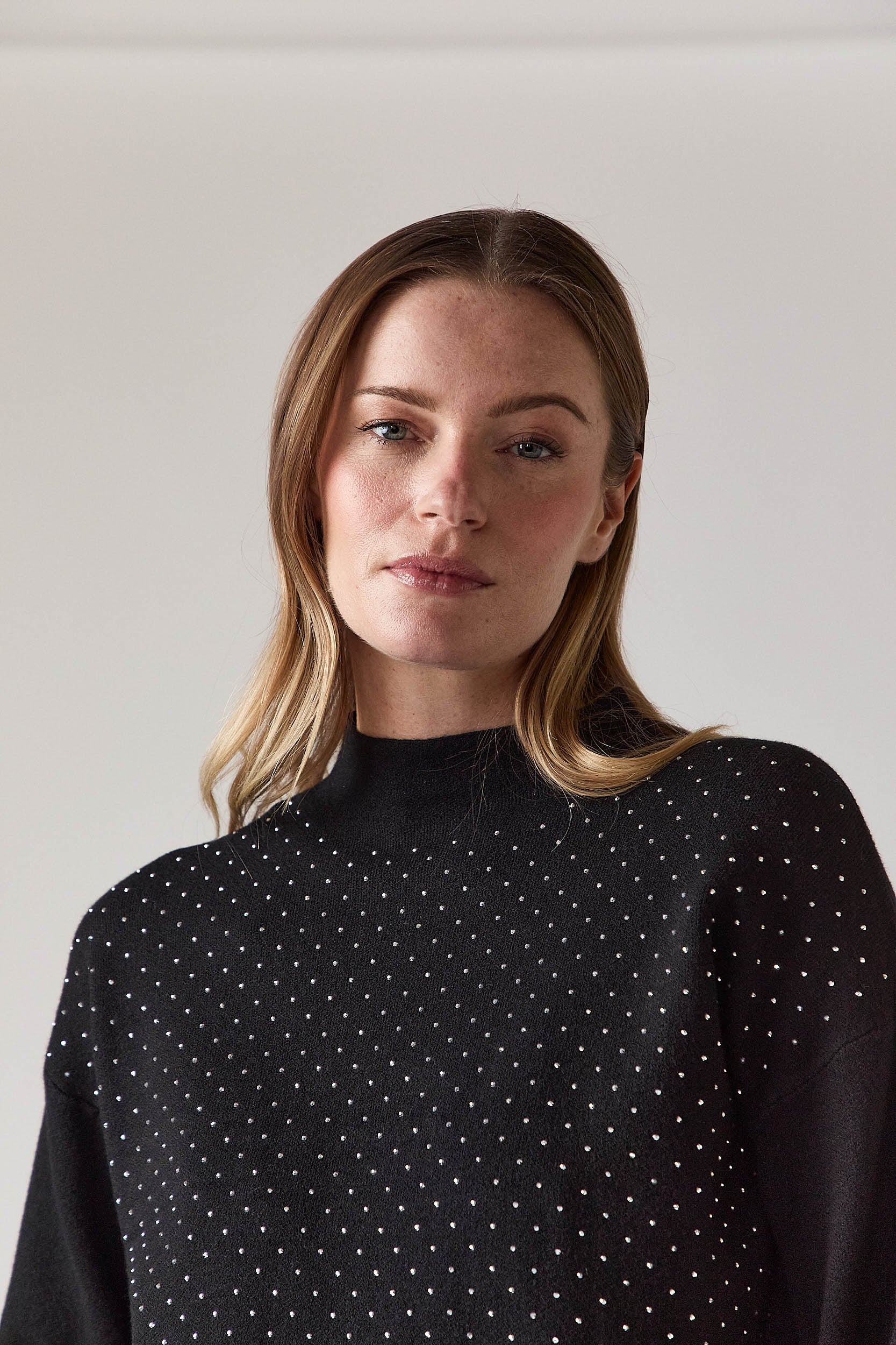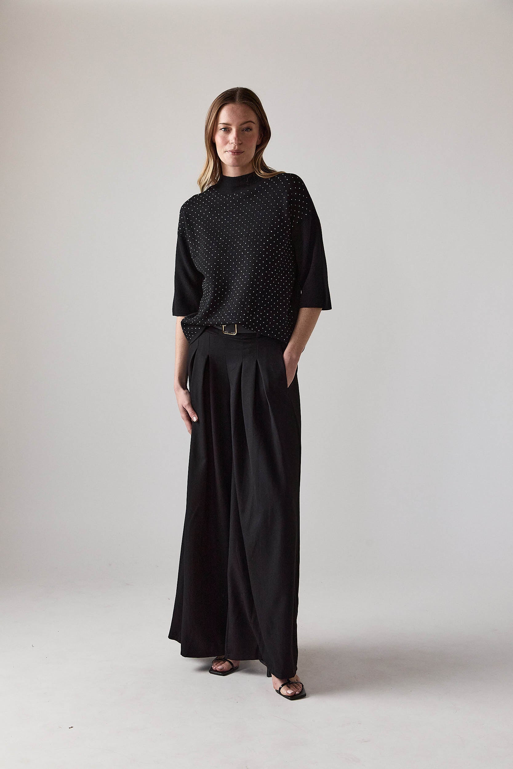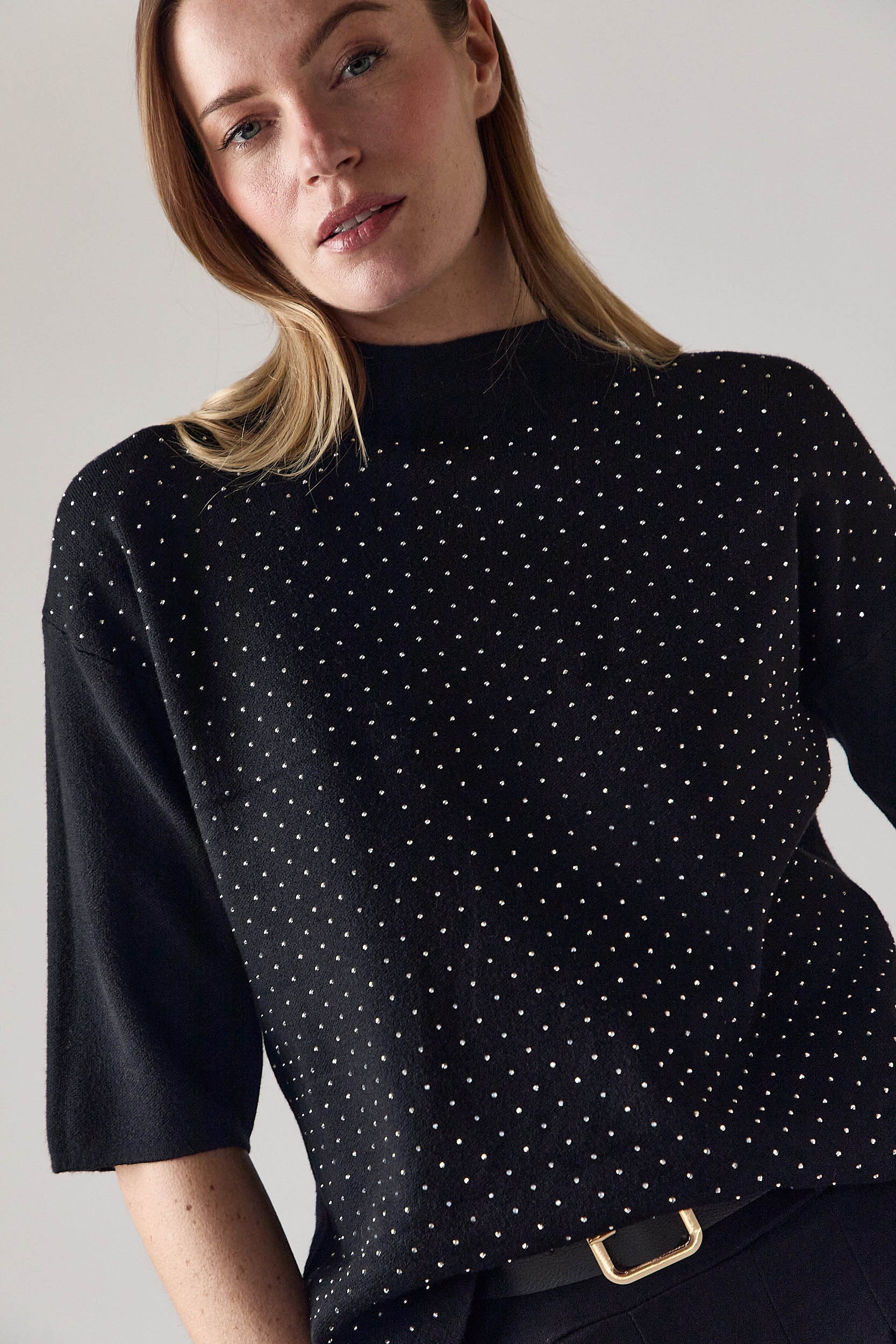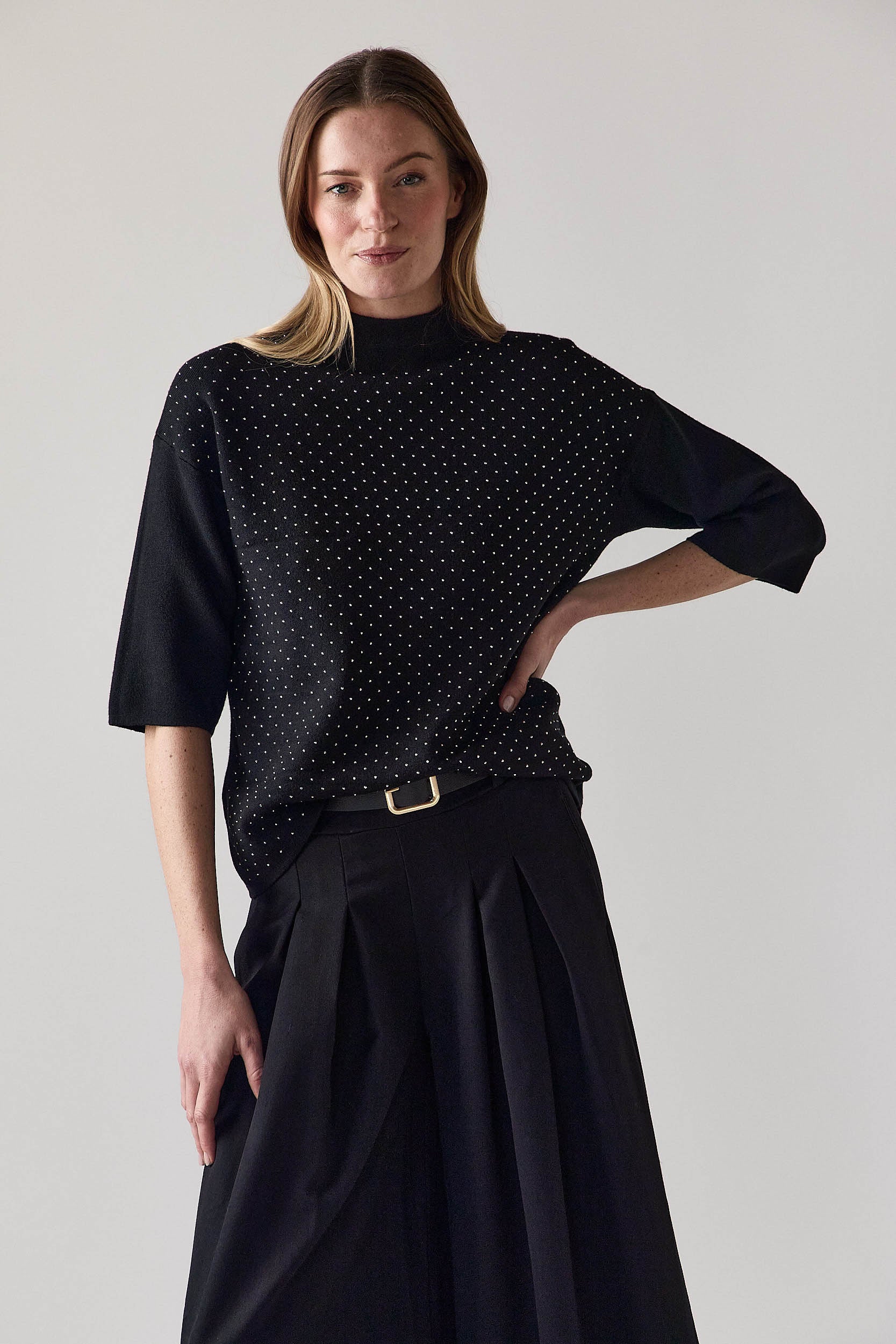 Jersey en color negro con diseño de punto fino y corte recto, rematado con pequeñas tachas metálicas repartidas de forma regular en la parte frontal. Presenta cuello ligeramente subido y mangas tres cuartos, creando una silueta limpia y equilibrada. La espalda es lisa, aportando contraste y manteniendo el protagonismo en el delantero.