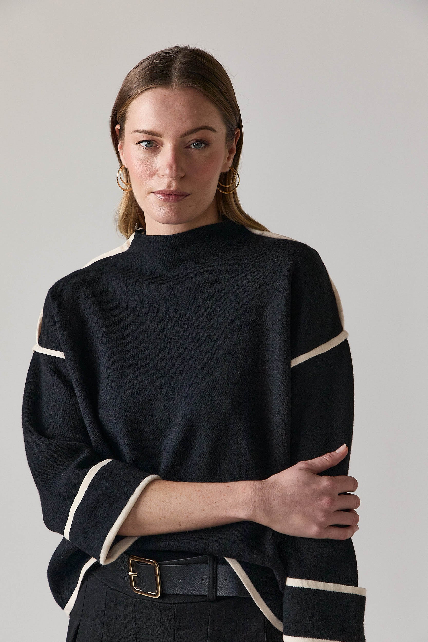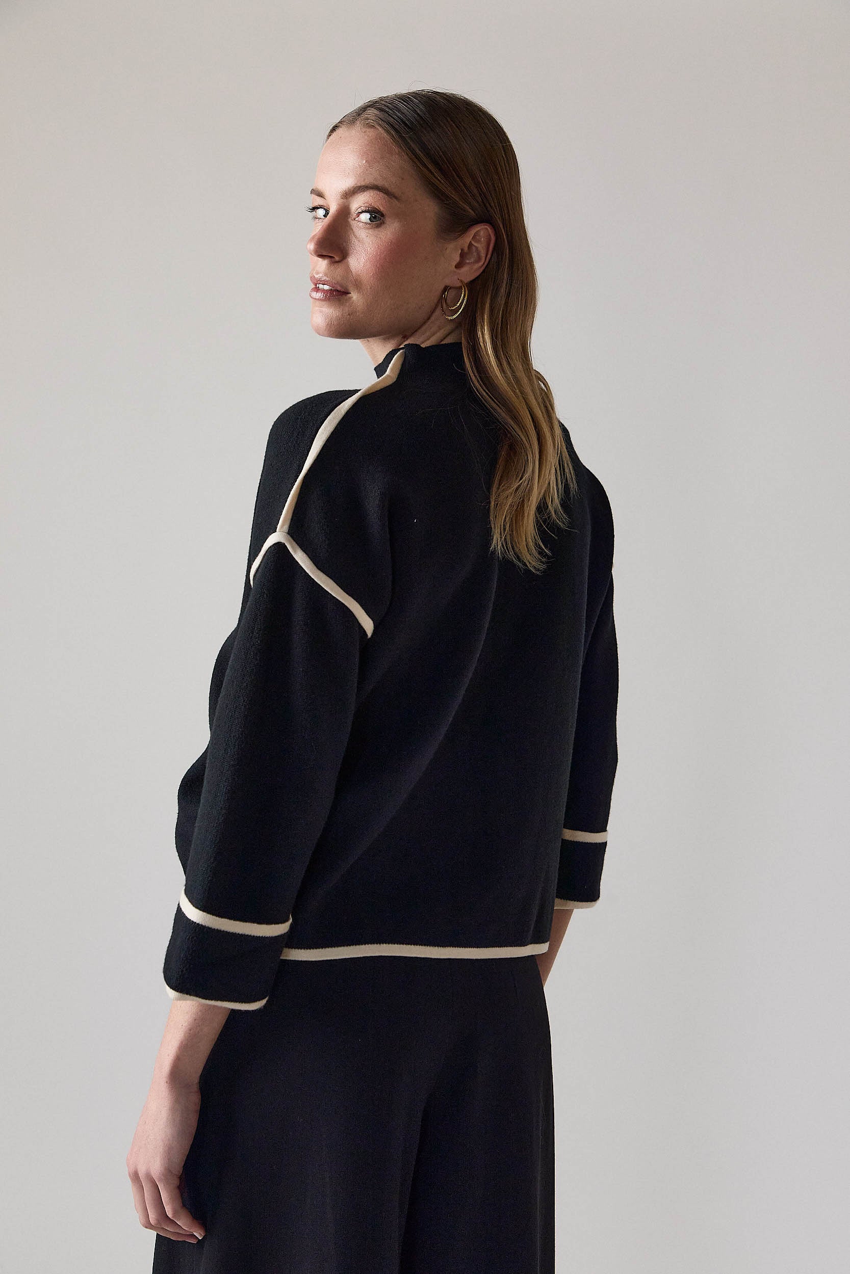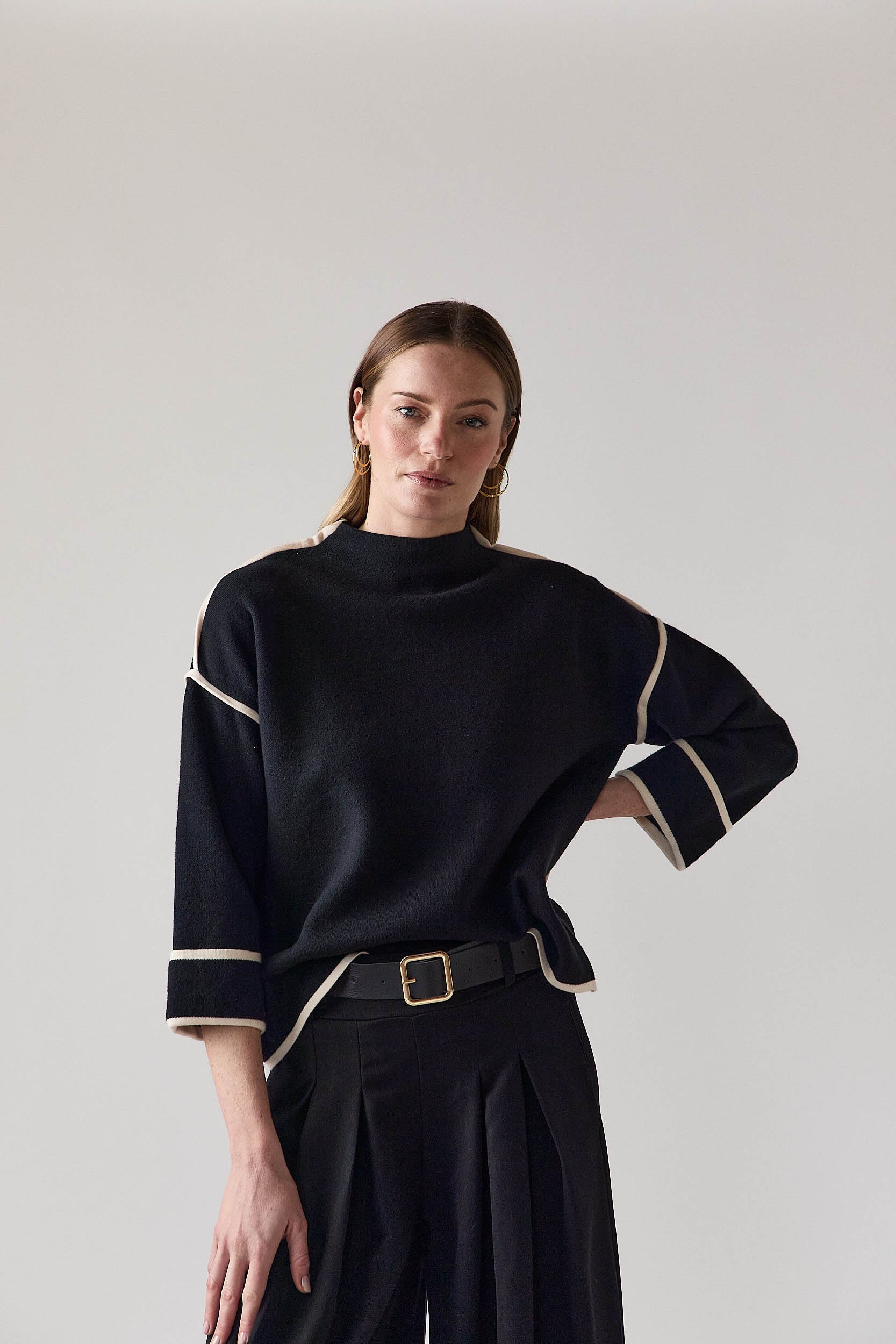 Jersey en color negro de punto con diseño limpio y detalles de vivos en contraste claro que recorren hombros, mangas y bajo. Presenta cuello ligeramente subido y corte recto, con mangas tres cuartos que aportan una silueta actual y equilibrada. El contraste de los ribetes define la prenda sin recargarla.