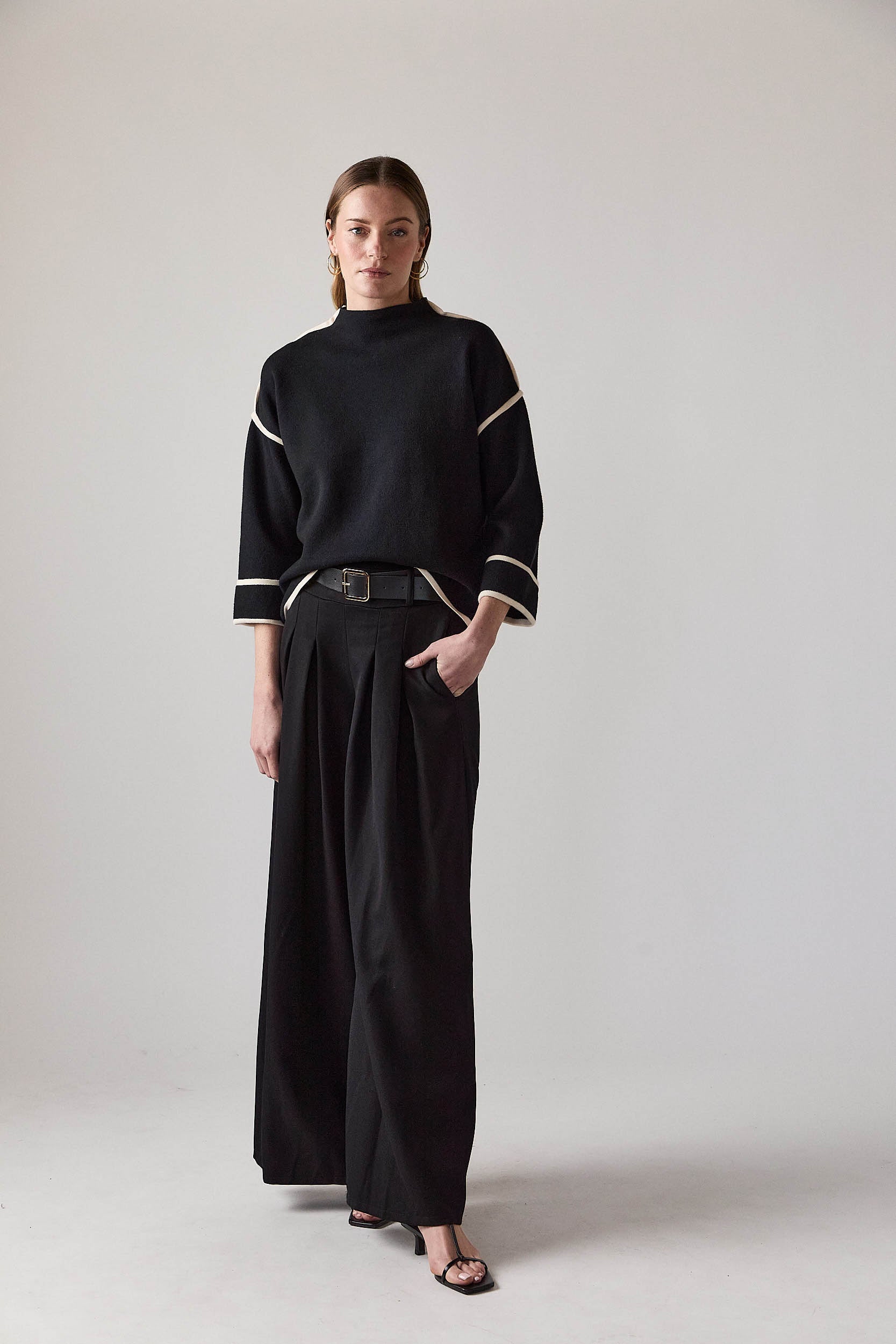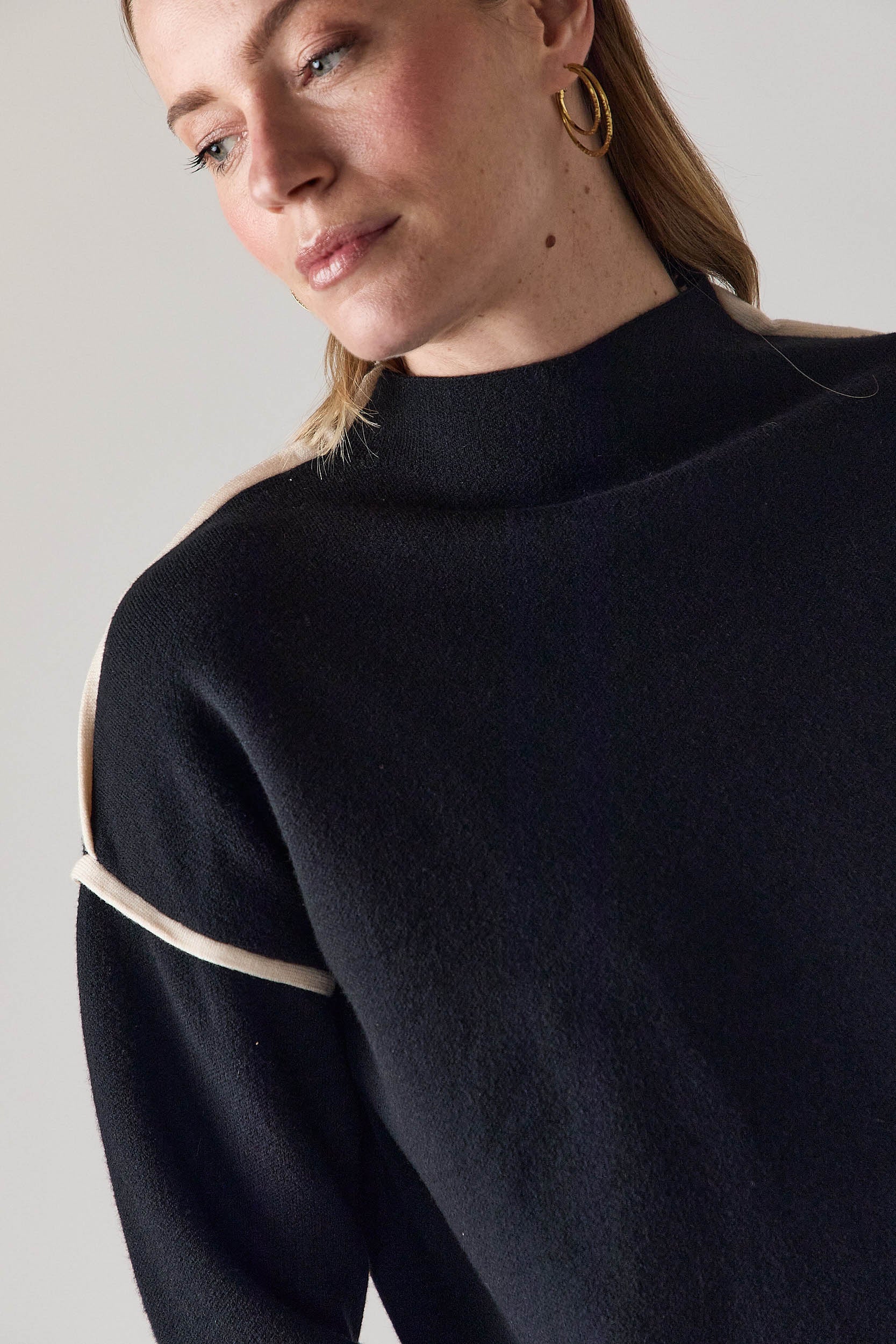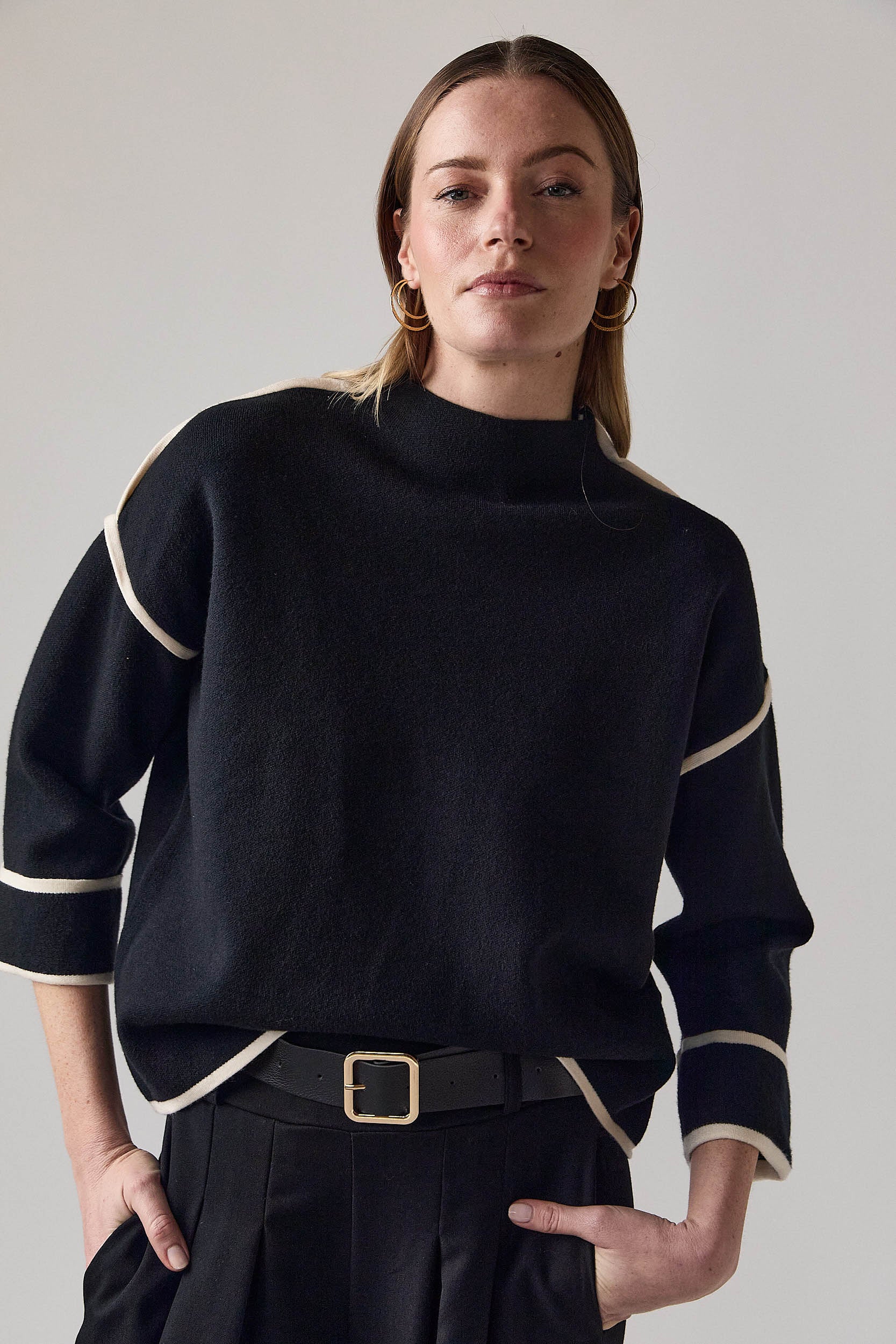 Jersey en color negro de punto con diseño limpio y detalles de vivos en contraste claro que recorren hombros, mangas y bajo. Presenta cuello ligeramente subido y corte recto, con mangas tres cuartos que aportan una silueta actual y equilibrada. El contraste de los ribetes define la prenda sin recargarla.