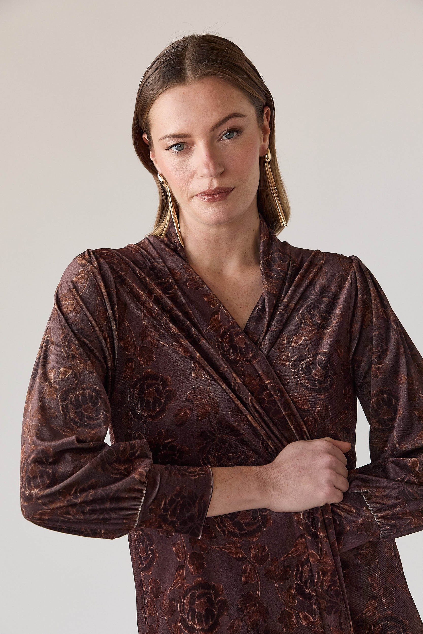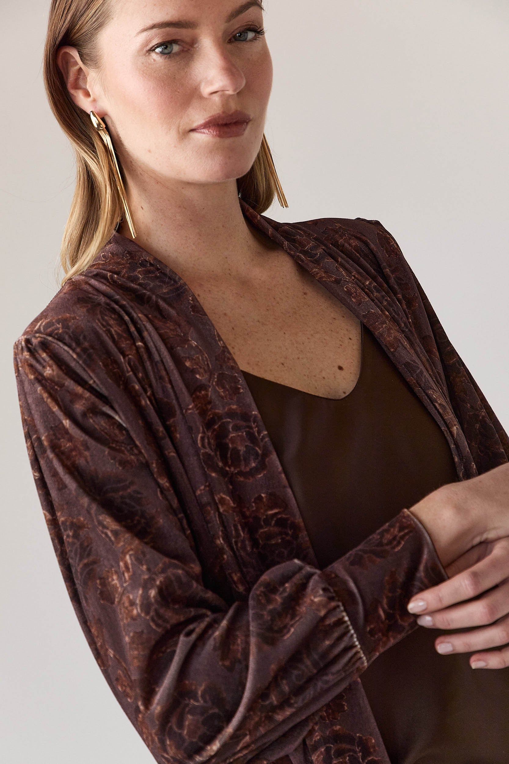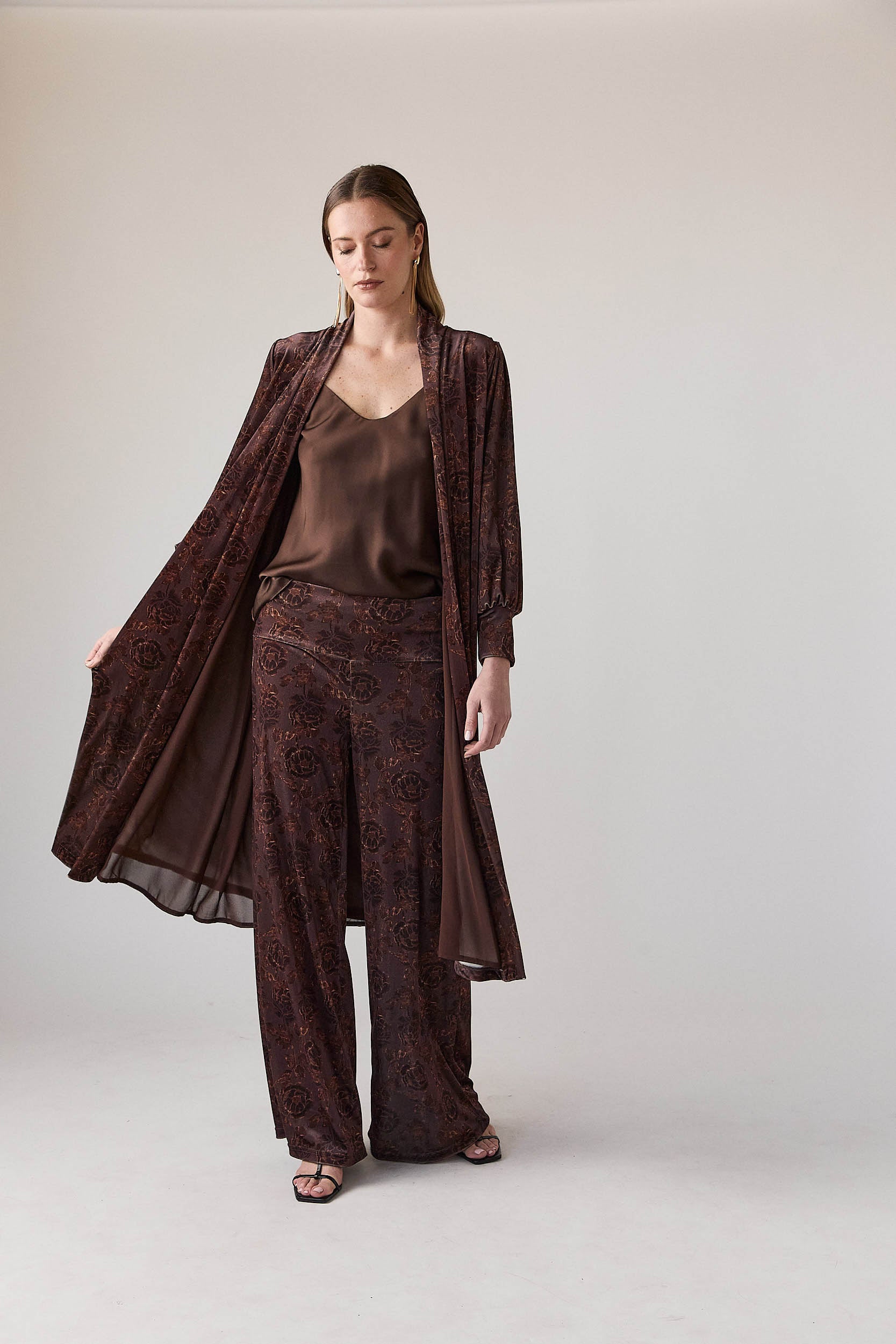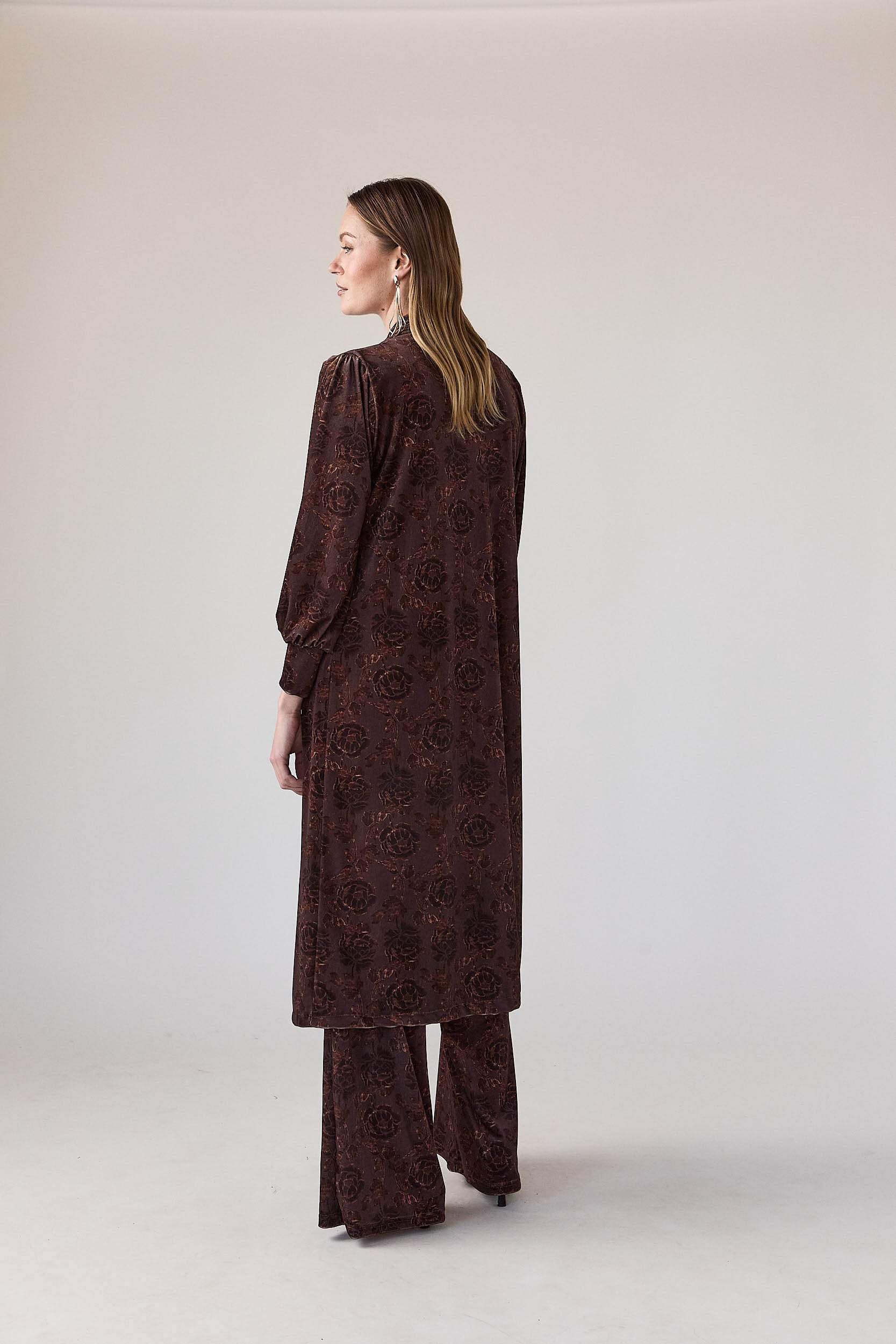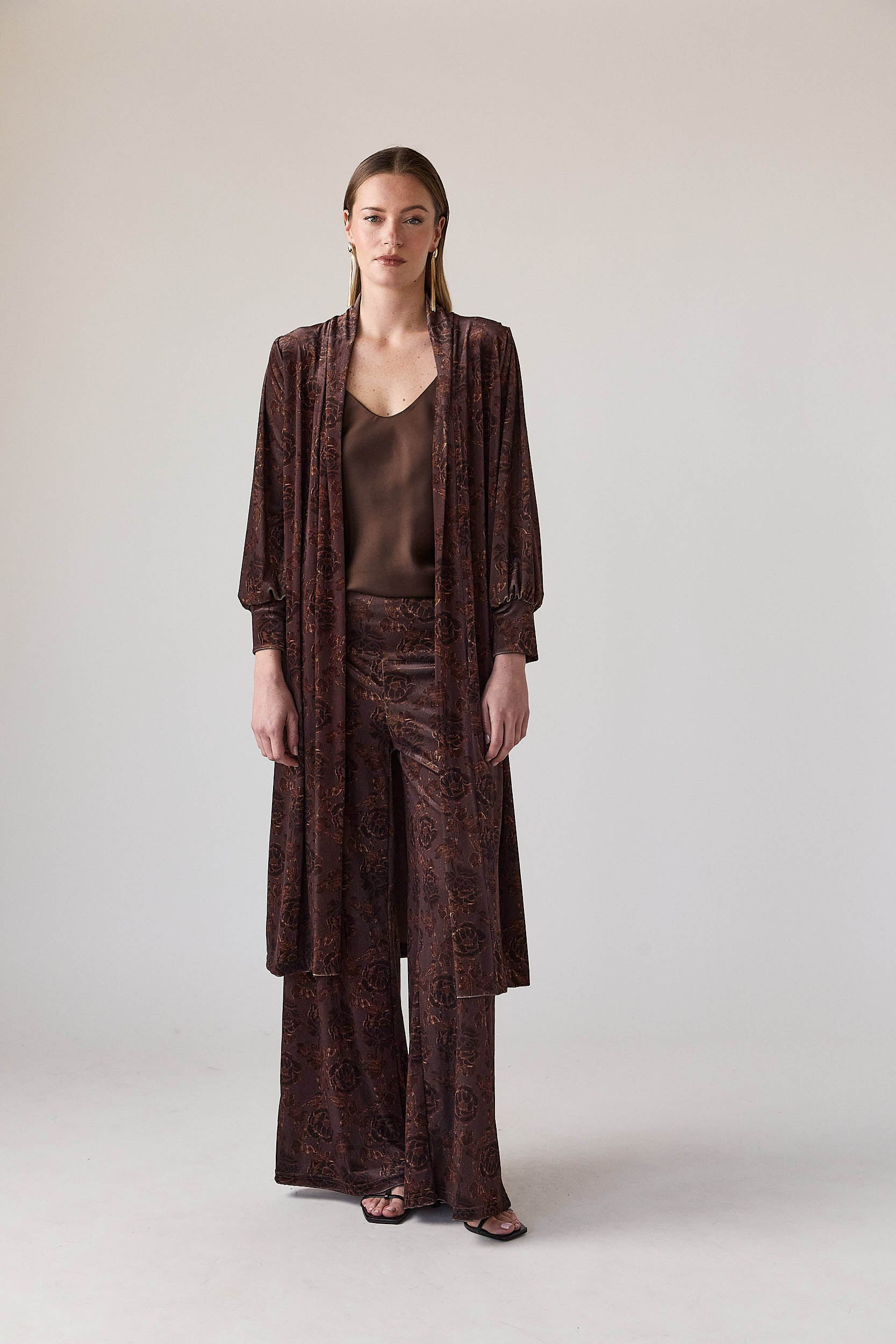 Kimono largo en tono marrón con motivo floral integrado. Diseño abierto, sin cierre, con escote en V suave y caída fluida. Manga larga ligeramente fruncida en el hombro y puño con elástico discreto. Largo por debajo de la rodilla, pensado para estilizar la silueta y aportar movimiento al conjunto.