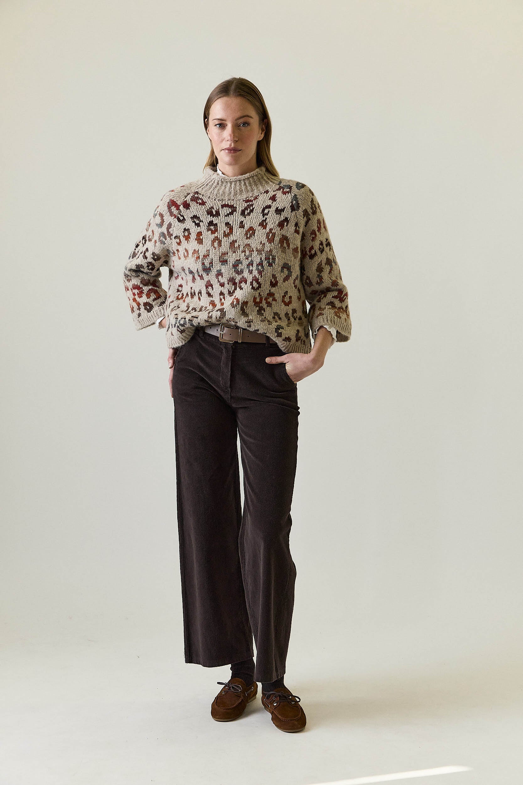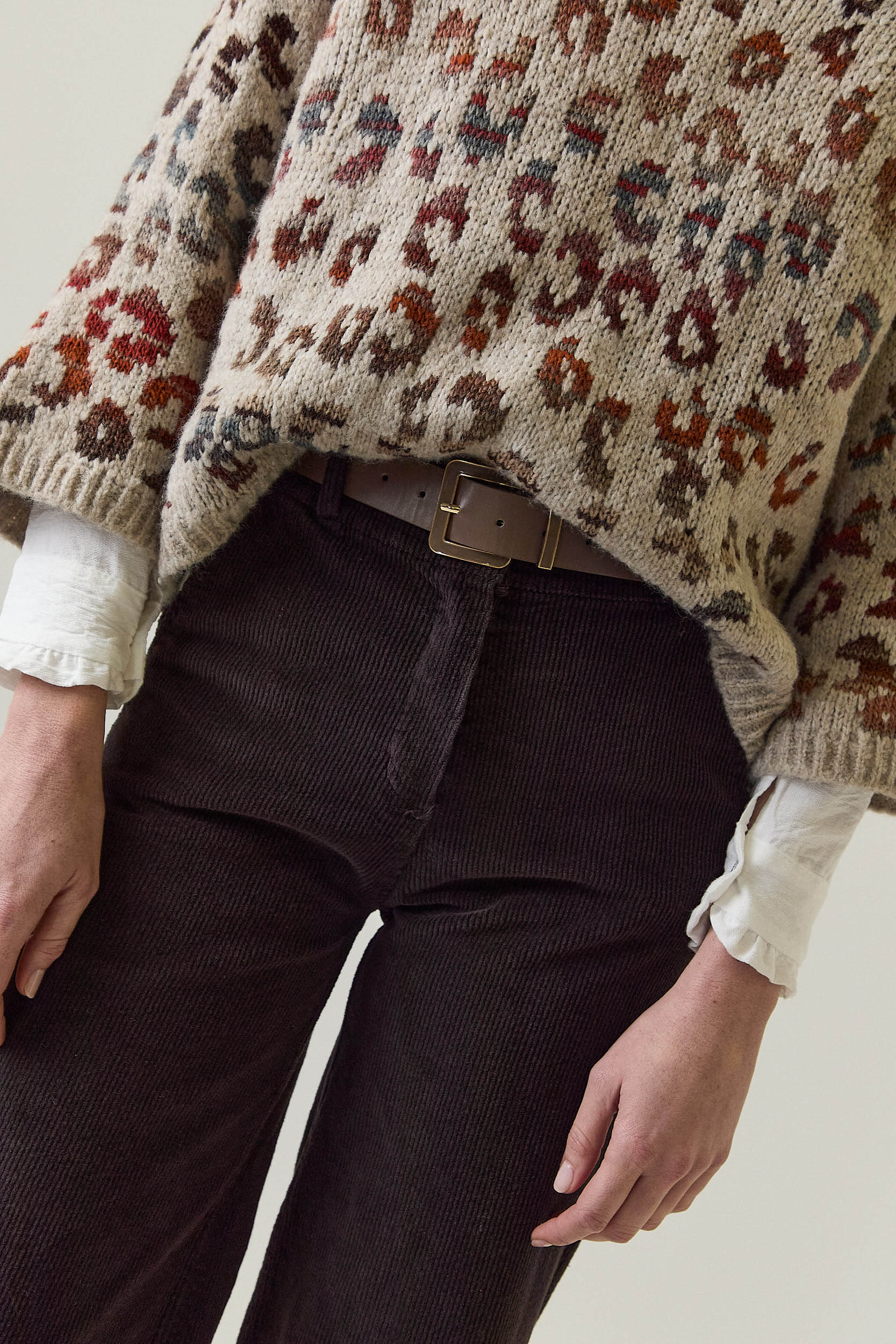 Pantalón recto en pana de tono marrón con tiro medio y corte limpio desde la cadera hasta el bajo. Presenta cierre frontal clásico y cinturón a juego incluido, que aporta estructura y define la silueta sin rigidez. La pierna es recta y ligeramente amplia, con una caída natural que mantiene el equilibrio entre comodidad y estilo.