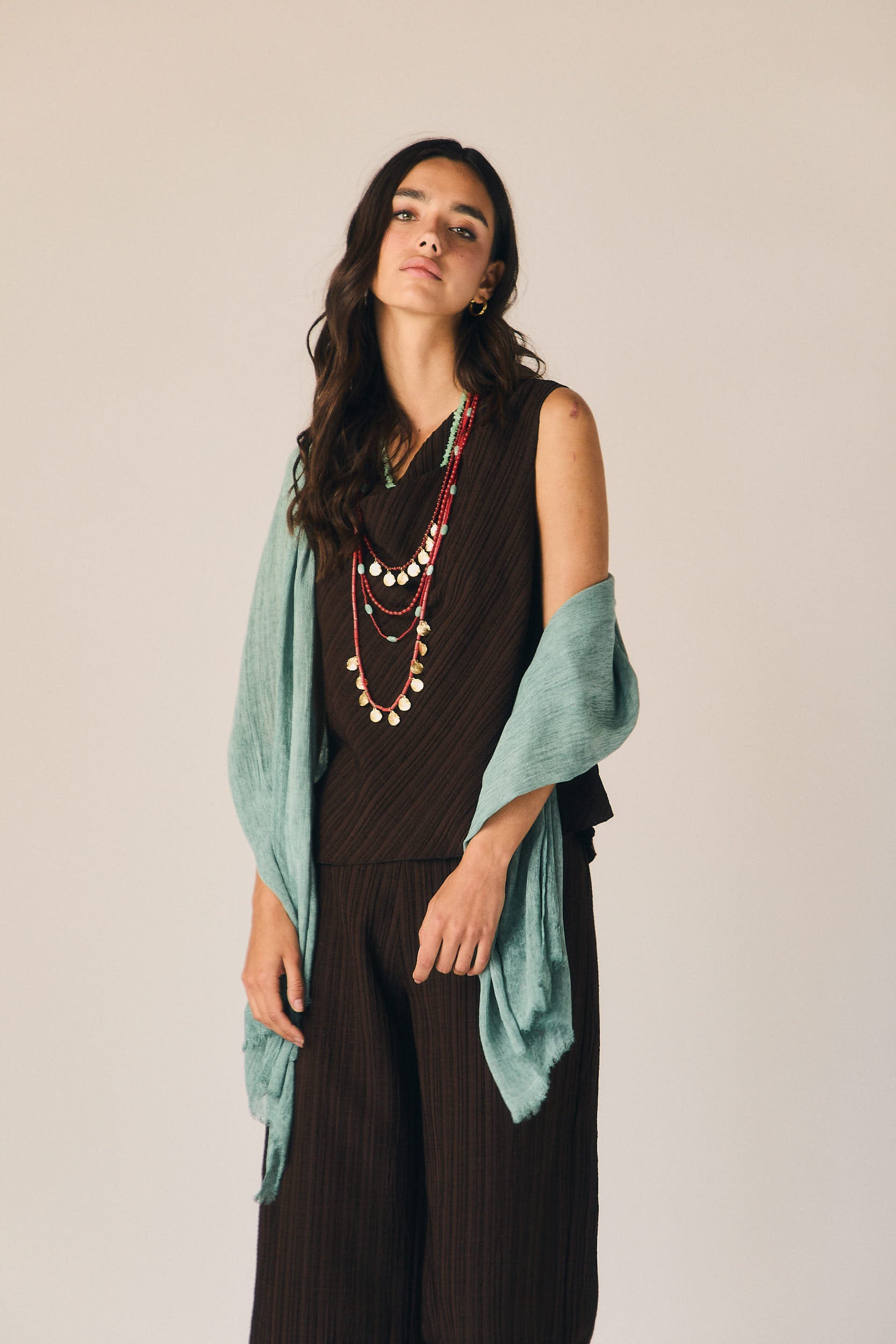 Una pieza que suma carácter sobre prendas lisas, desde vestidos fluidos hasta tops de punto o blusas neutras. Funciona tanto en looks de día como en combinaciones más especiales donde el accesorio cobra protagonismo.