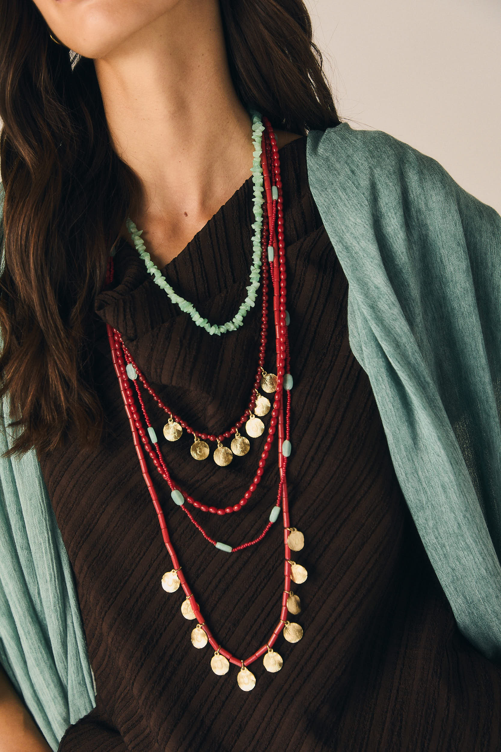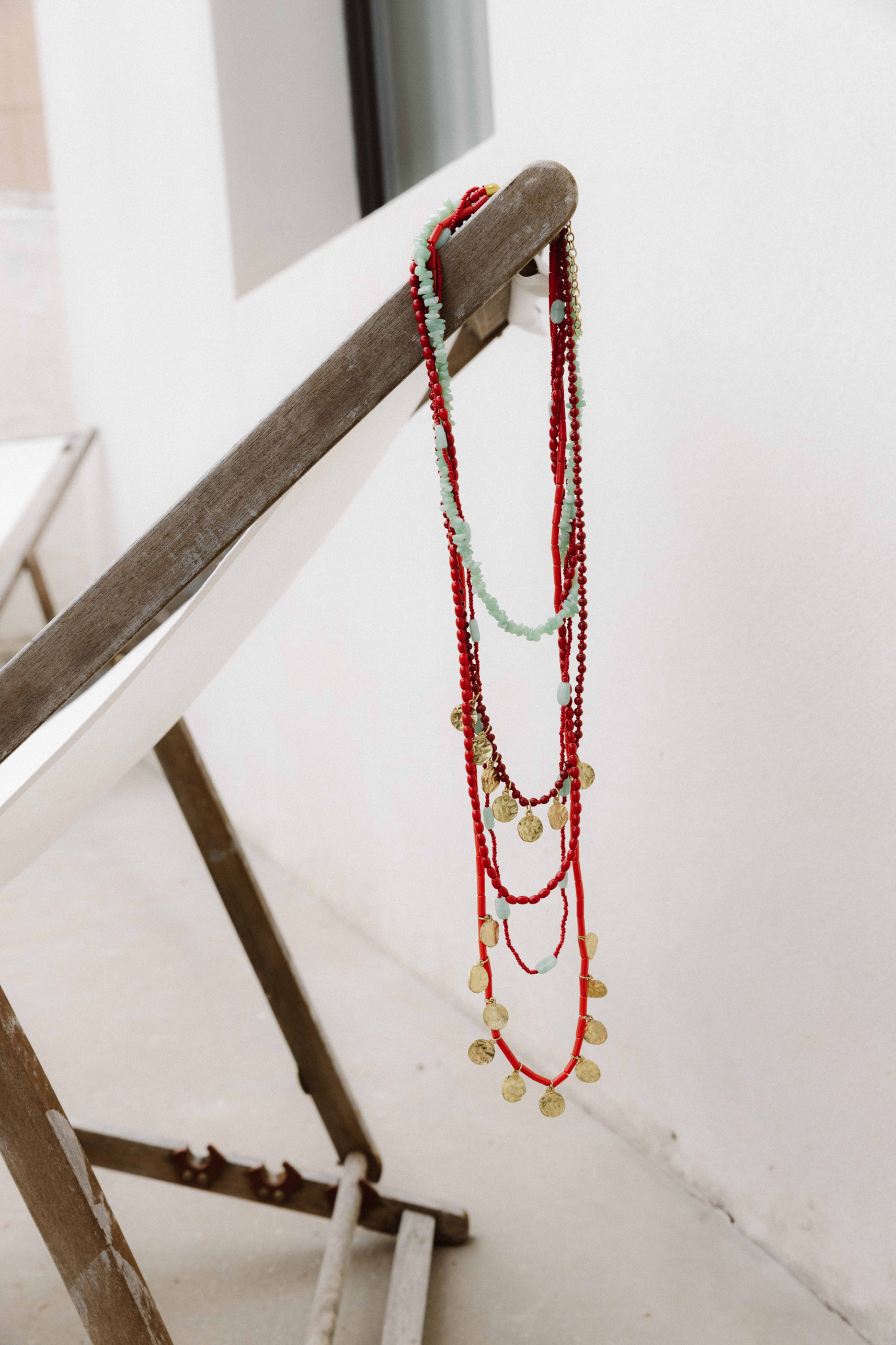 Collar largo de cuentas en tono rojo con detalles en contraste y pequeñas monedas metálicas colgantes. Diseño en varias vueltas con mezcla de tamaños y acabados que aportan textura y movimiento. Cierre posterior ajustable.