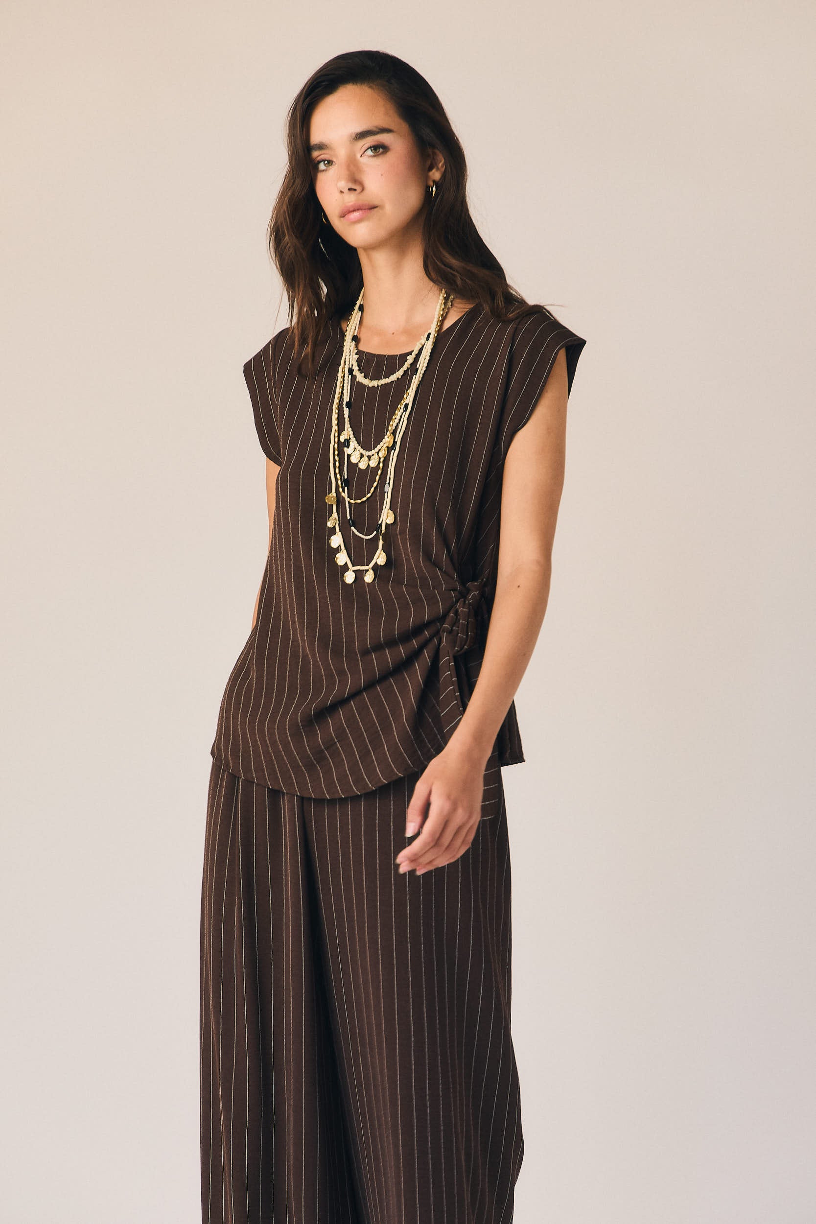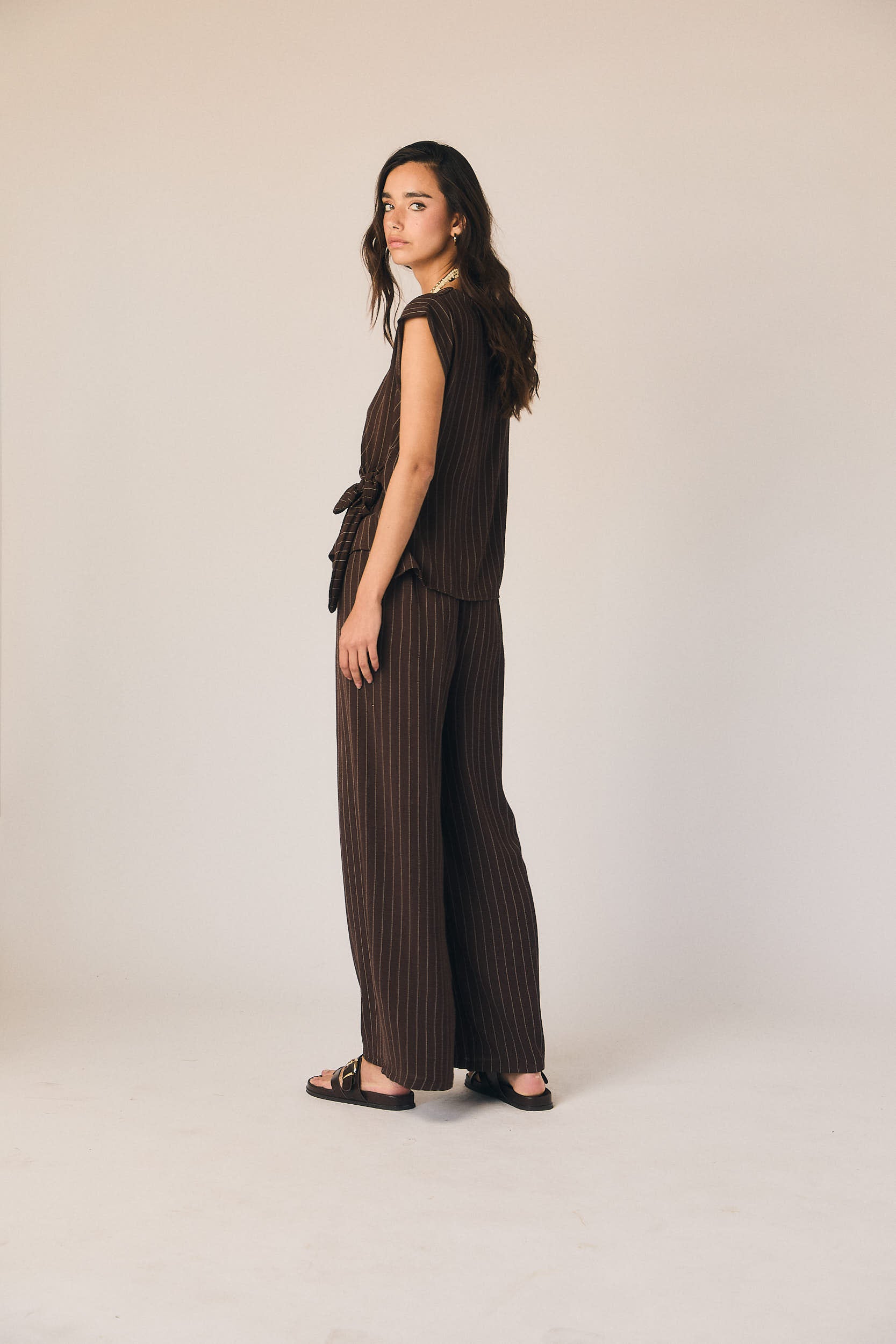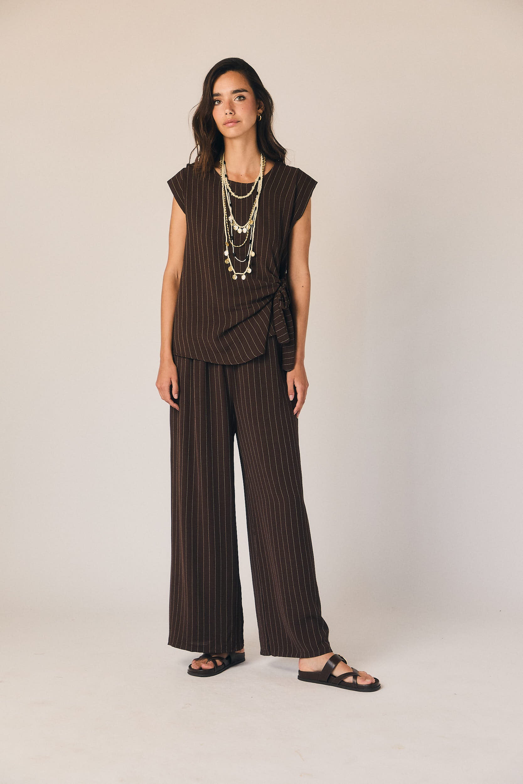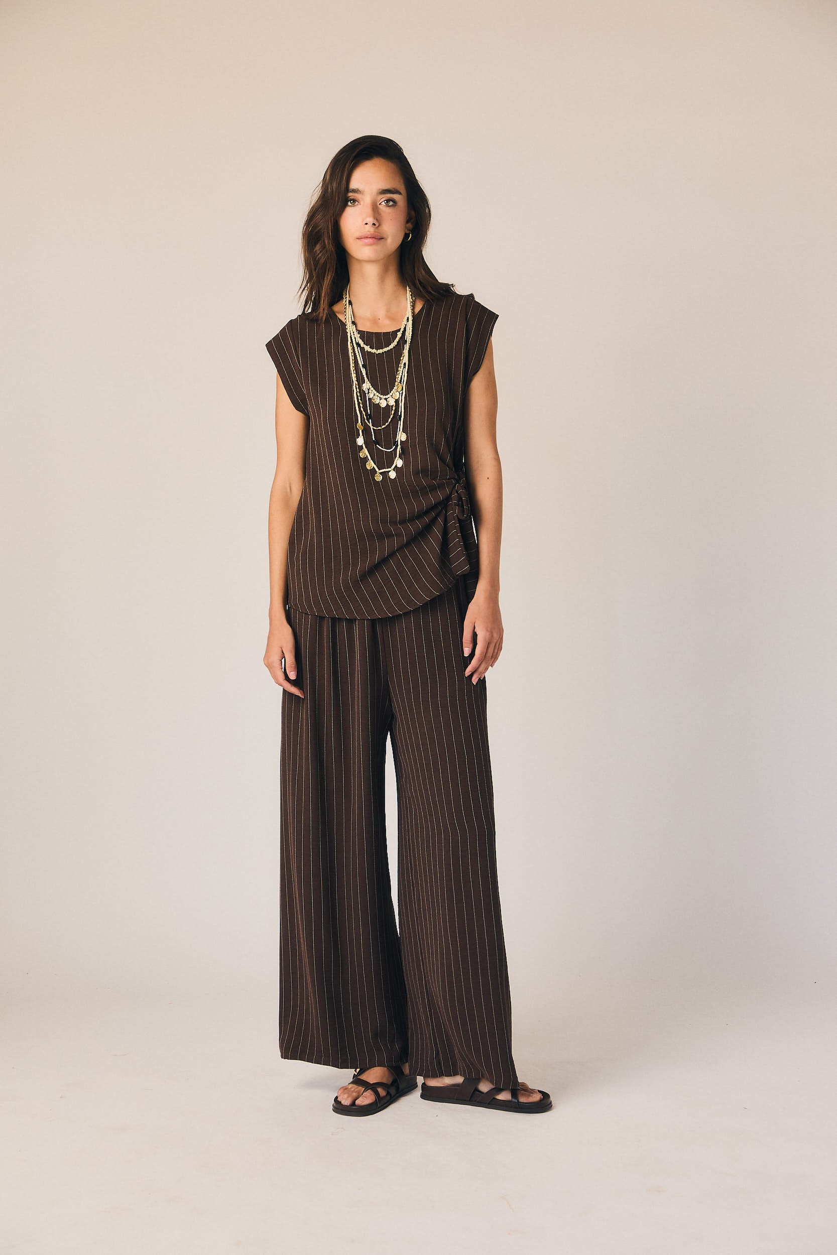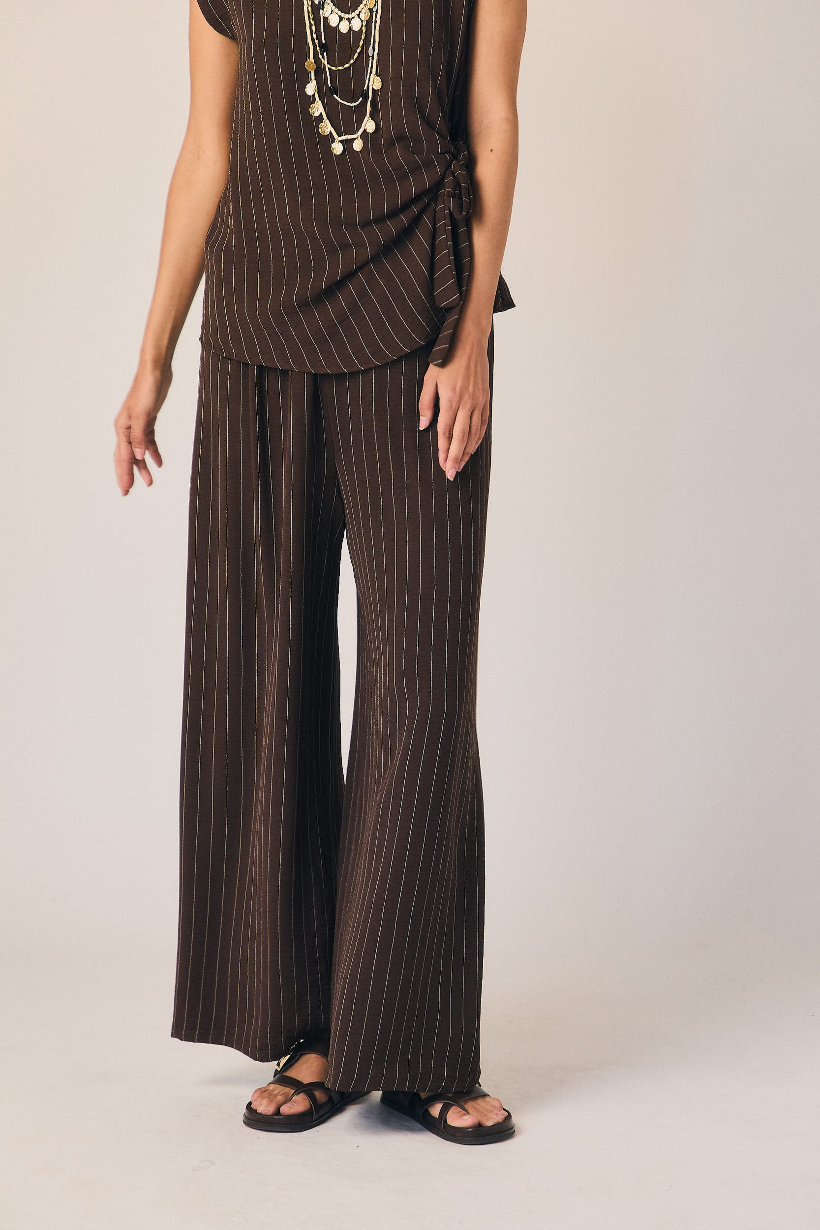Pantalón largo de corte fluido en tono marrón con rayas verticales finas en contraste. Cintura elástica con lazada ajustable y pernera recta amplia que aporta movimiento. Diseño ligero con caída suave.