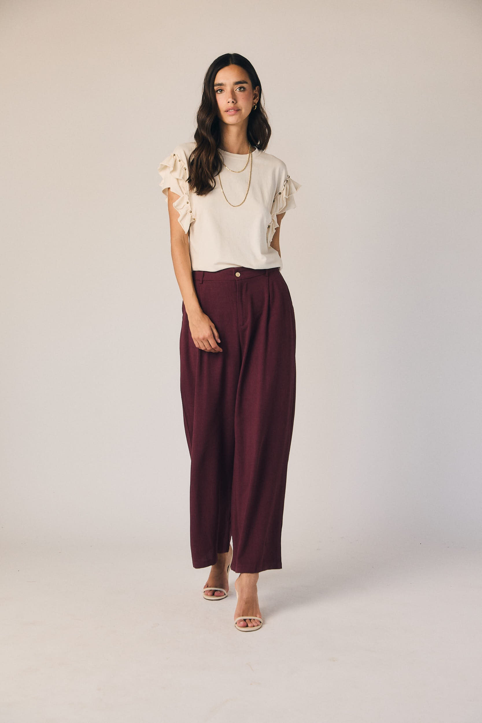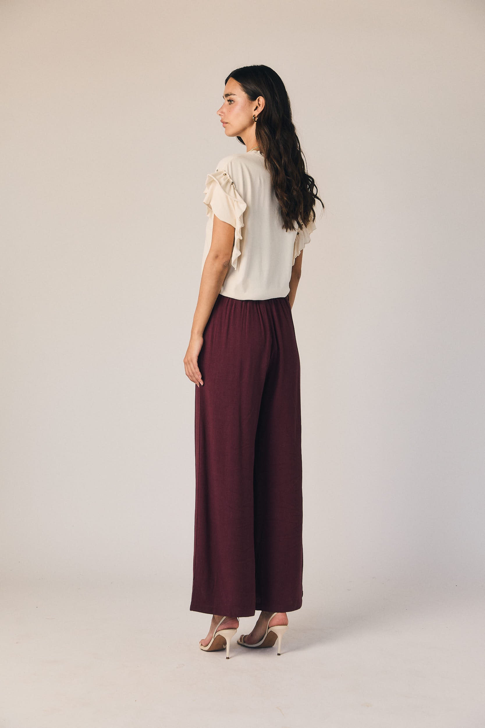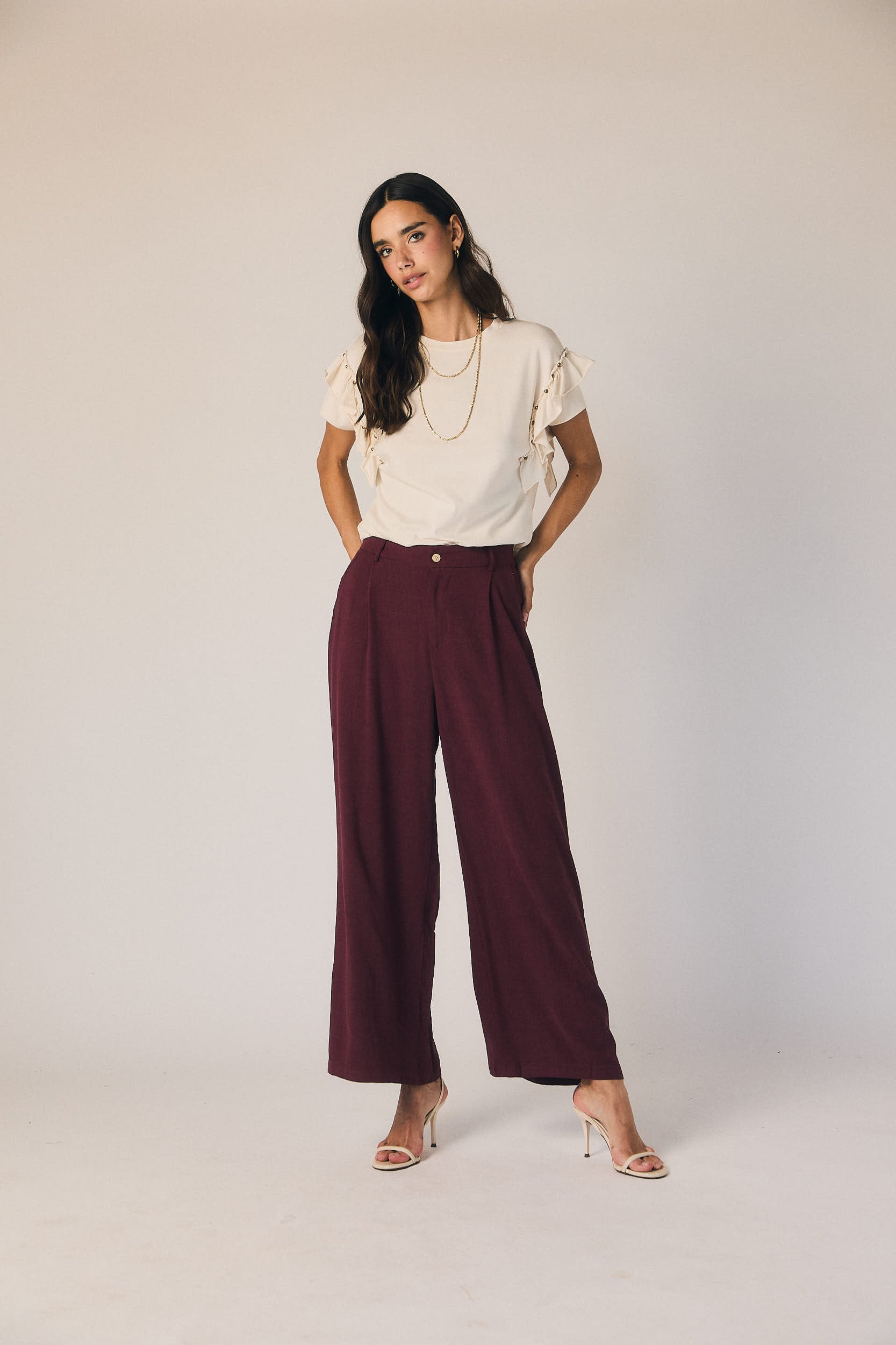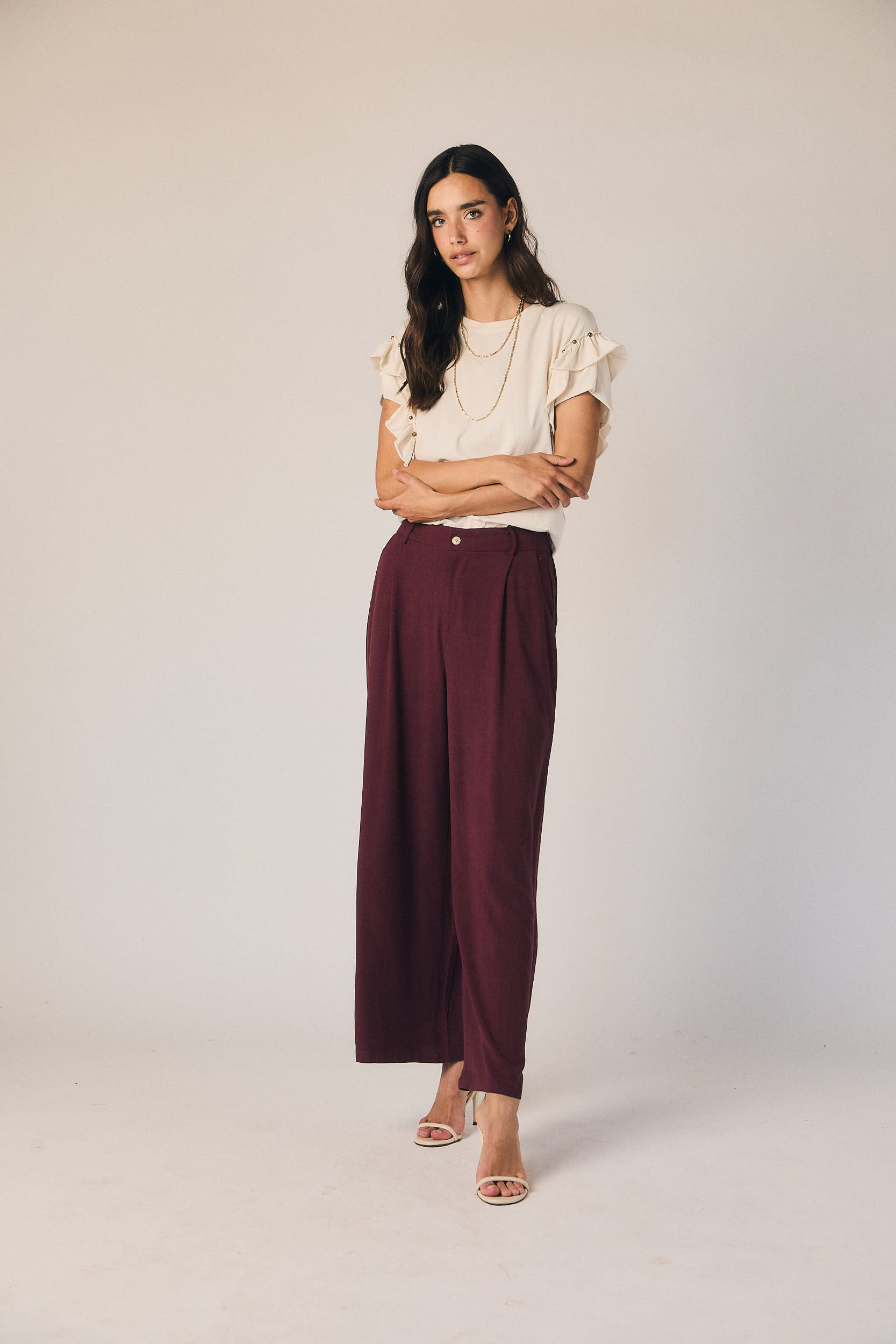 Pantalón de tiro medio en tono granate con diseño de pierna ancha y recta. Presenta pinzas frontales que aportan estructura y caída, con cierre de botón y bolsillos laterales. El tejido fluido acompaña el movimiento sin ajustar.