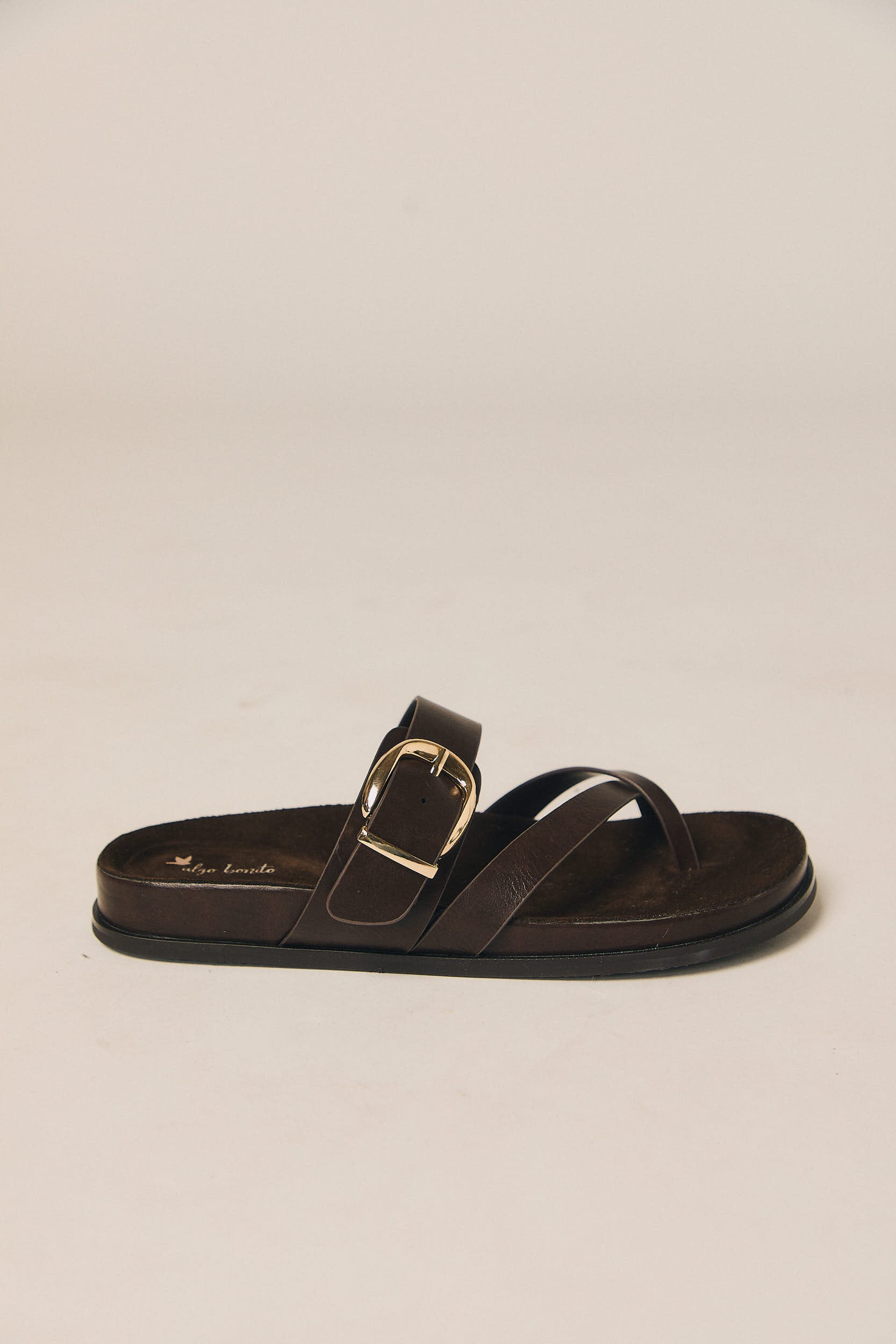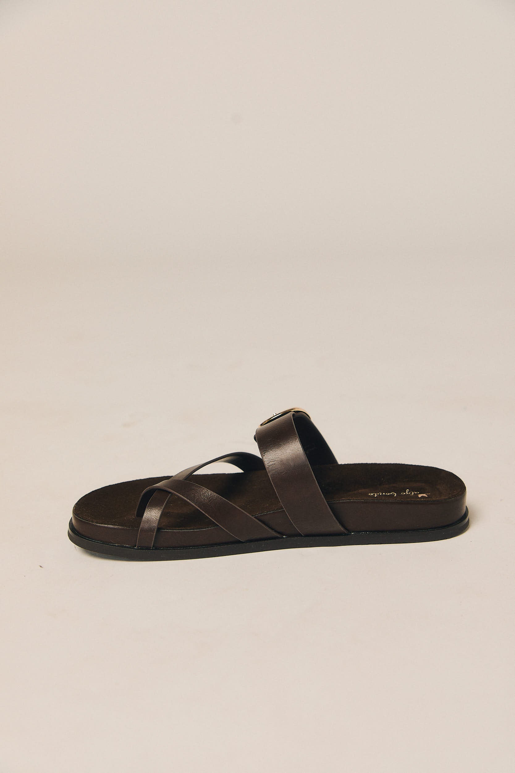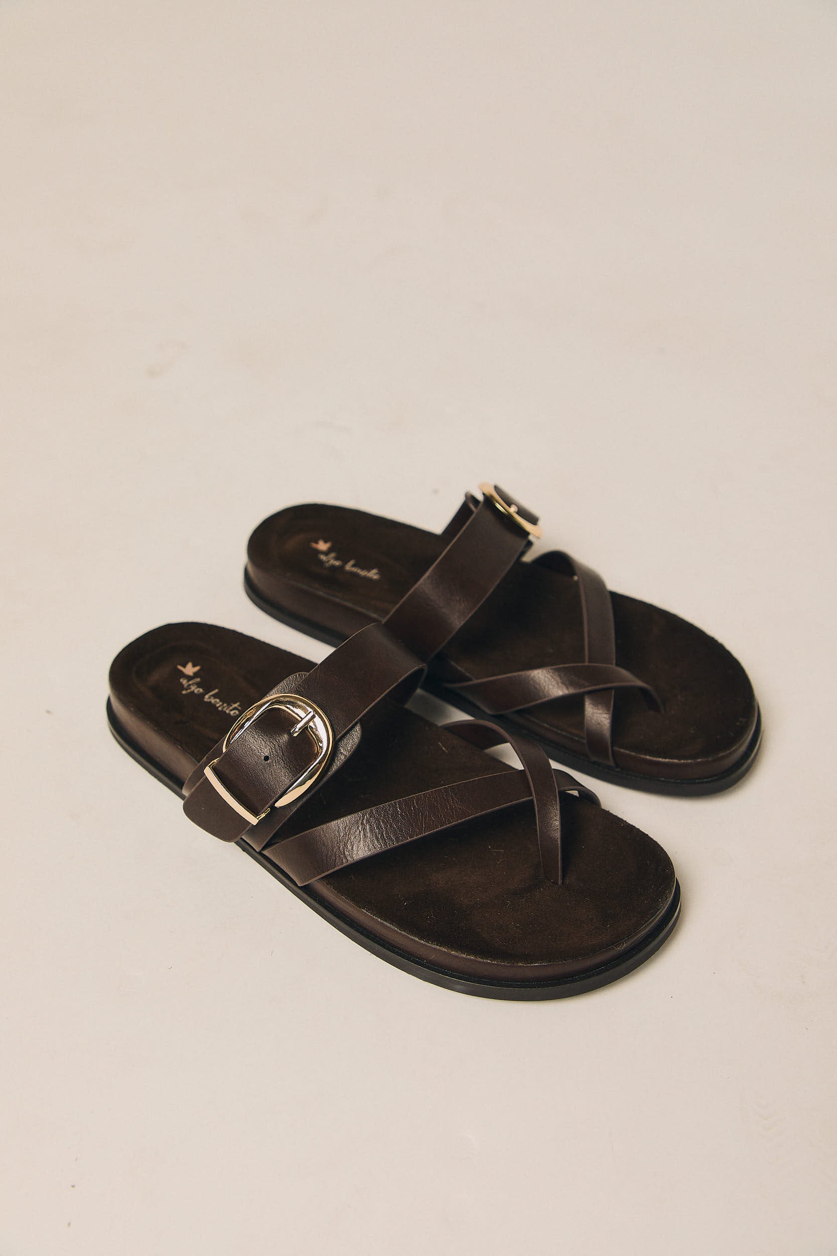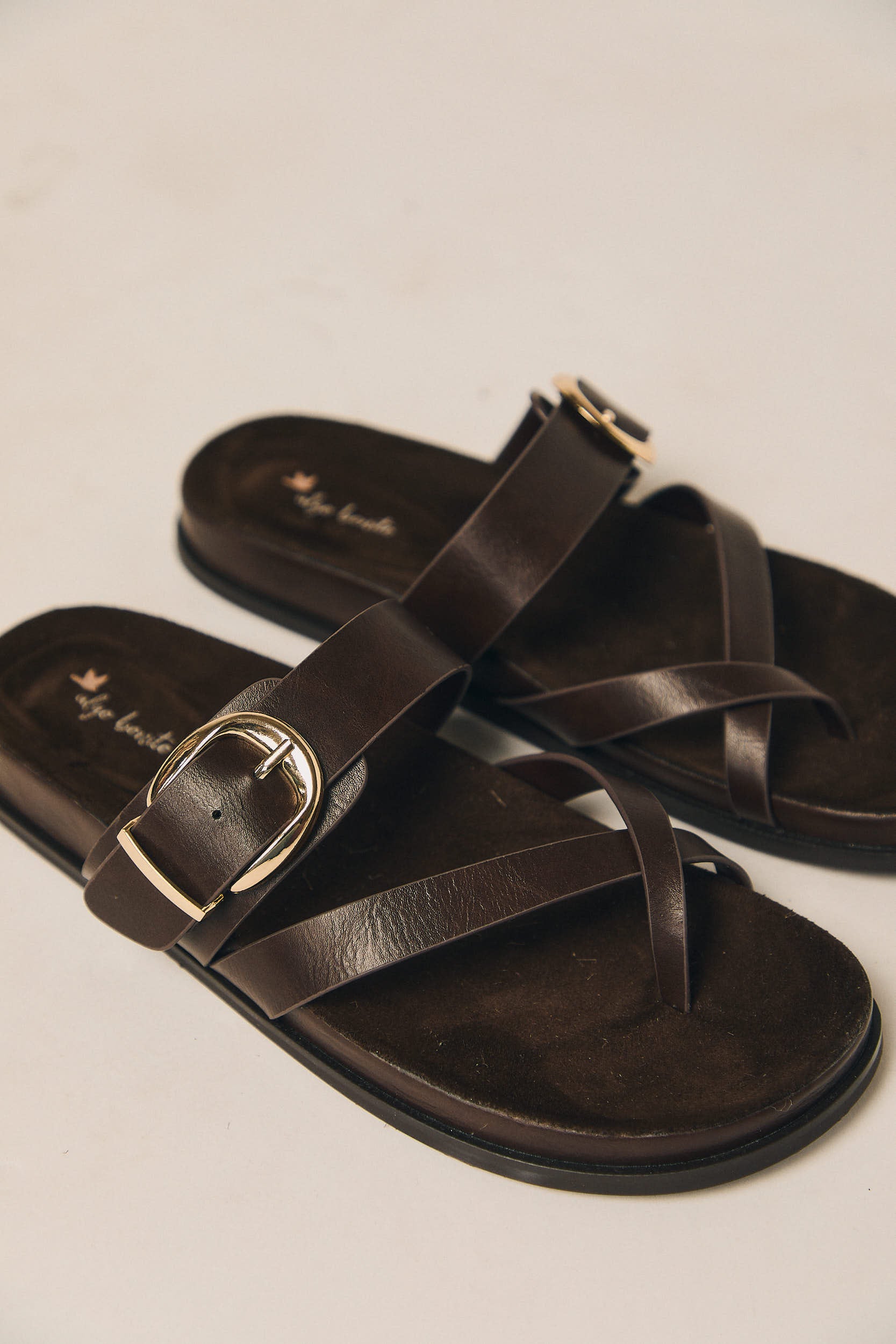 Sandalia plana en tono marrón con diseño de tiras finas cruzadas en la parte delantera y pala ancha con hebilla metálica ajustable. Silueta abierta que deja el pie al descubierto y aporta un acabado limpio y equilibrado.