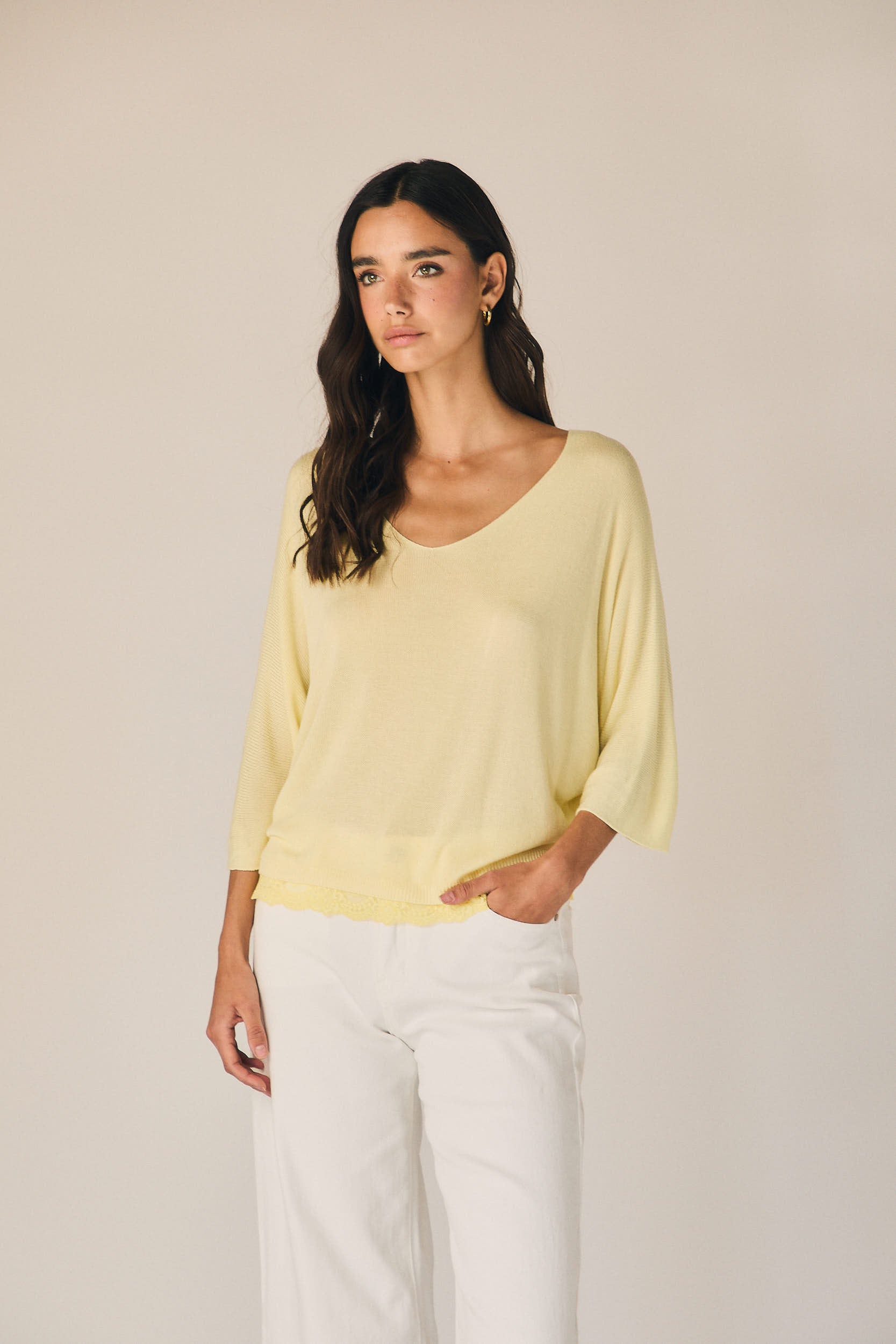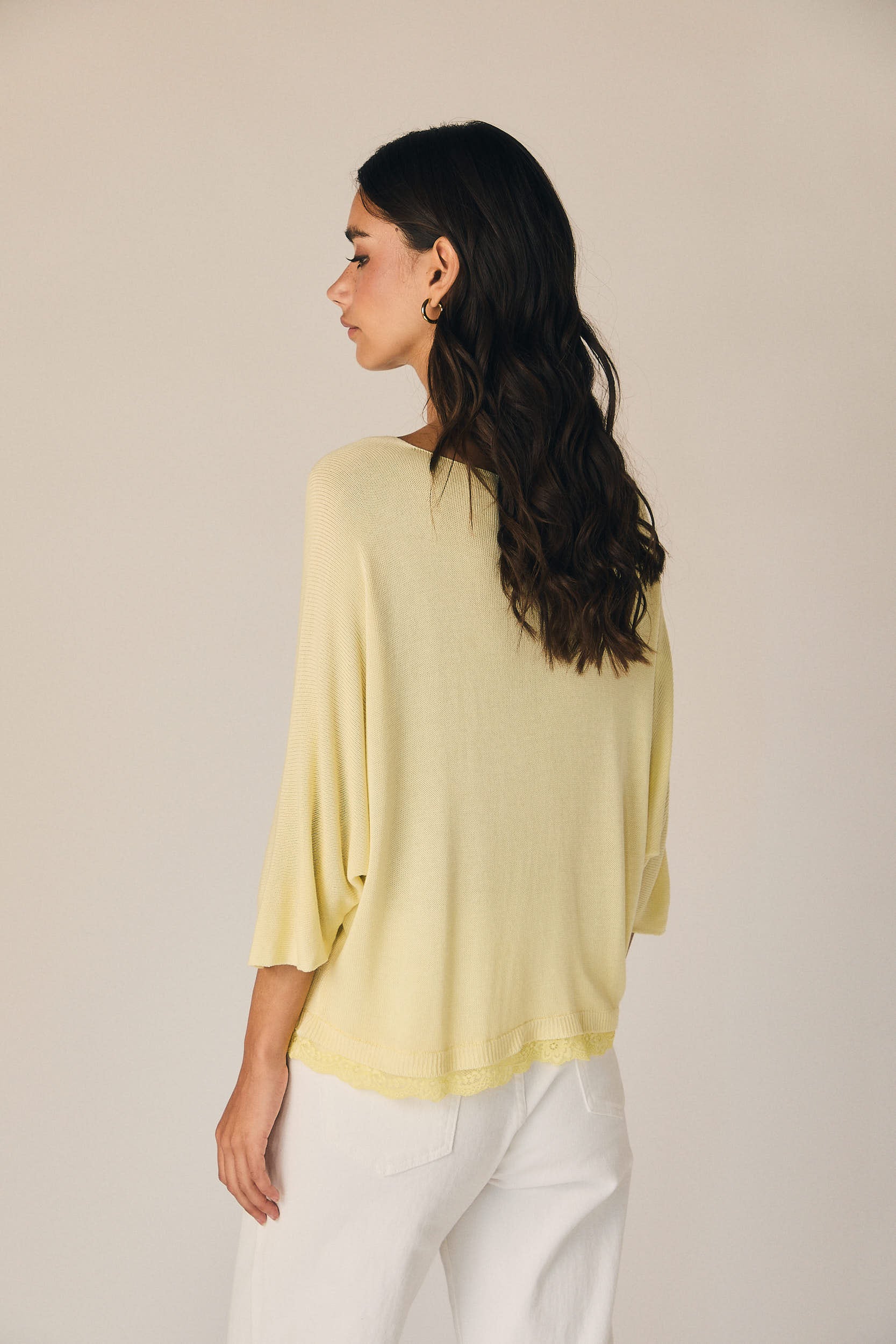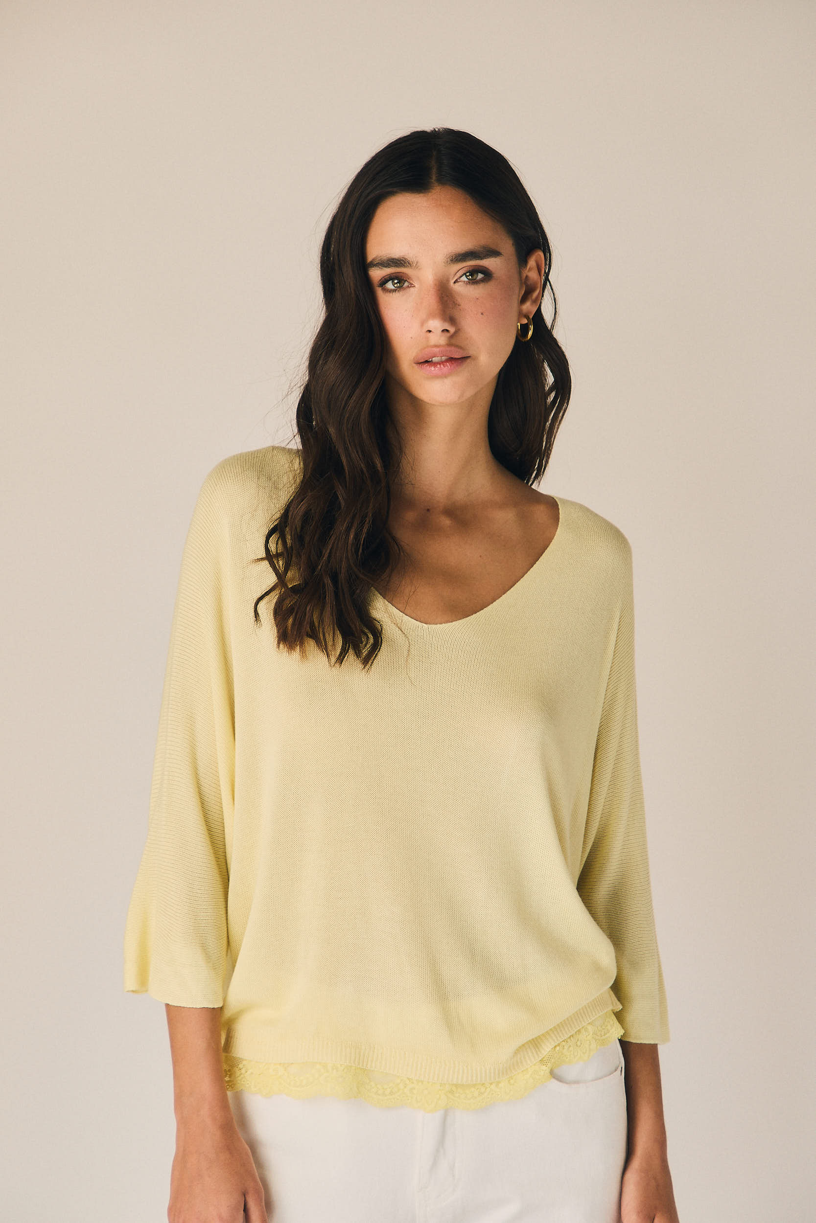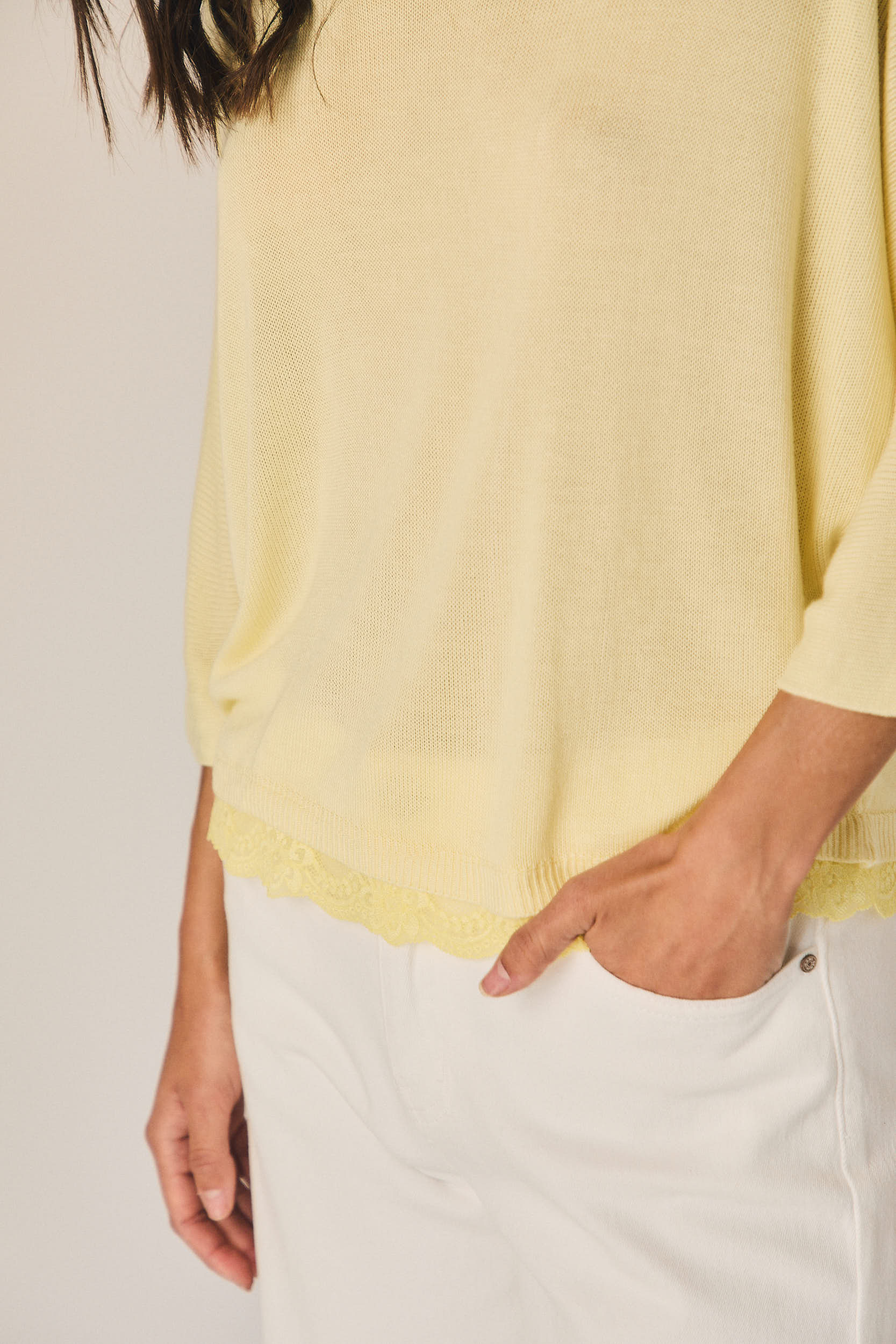 Top de punto ligero en tono amarillo con escote en pico y corte amplio. Manga tres cuartos con hombro caído que aporta un ajuste relajado. Bajo acabado en puntilla que suma detalle y textura al diseño.