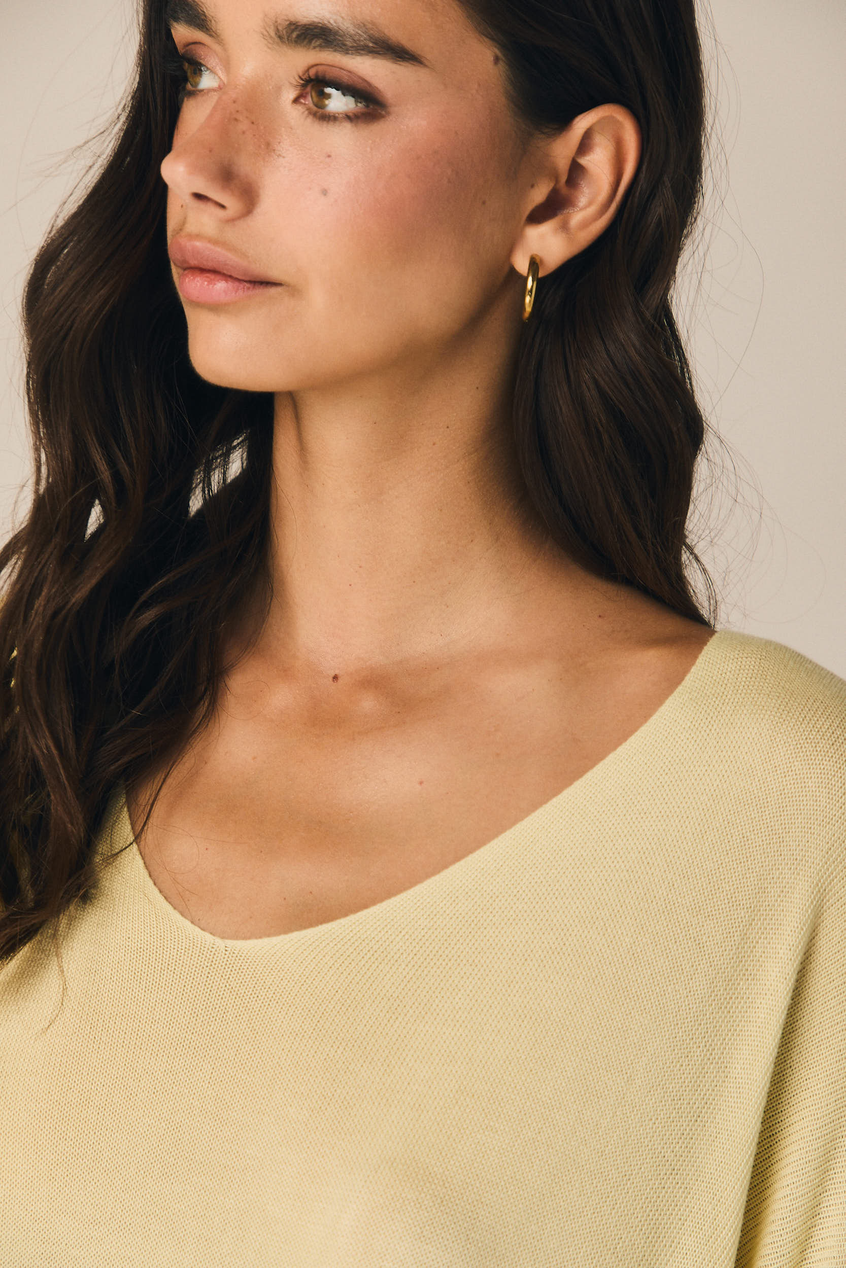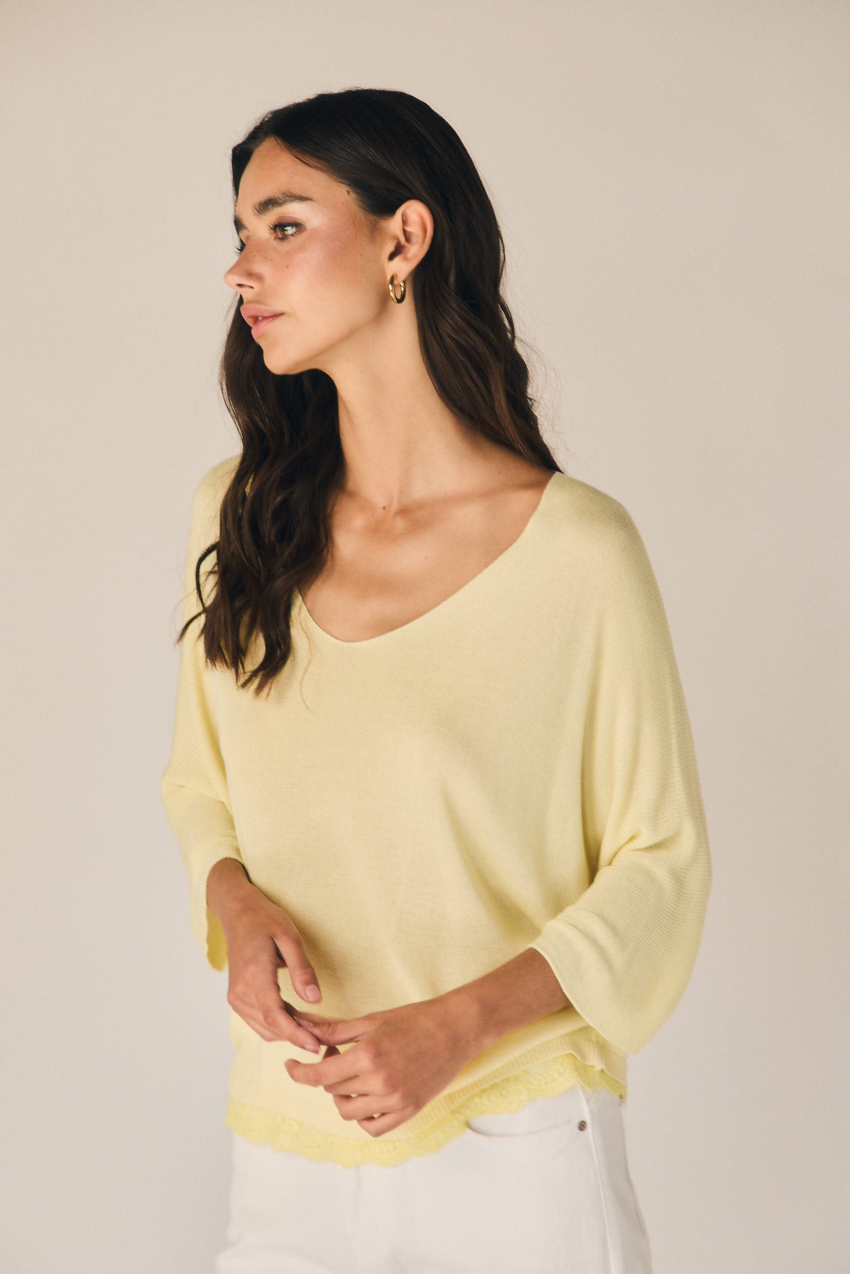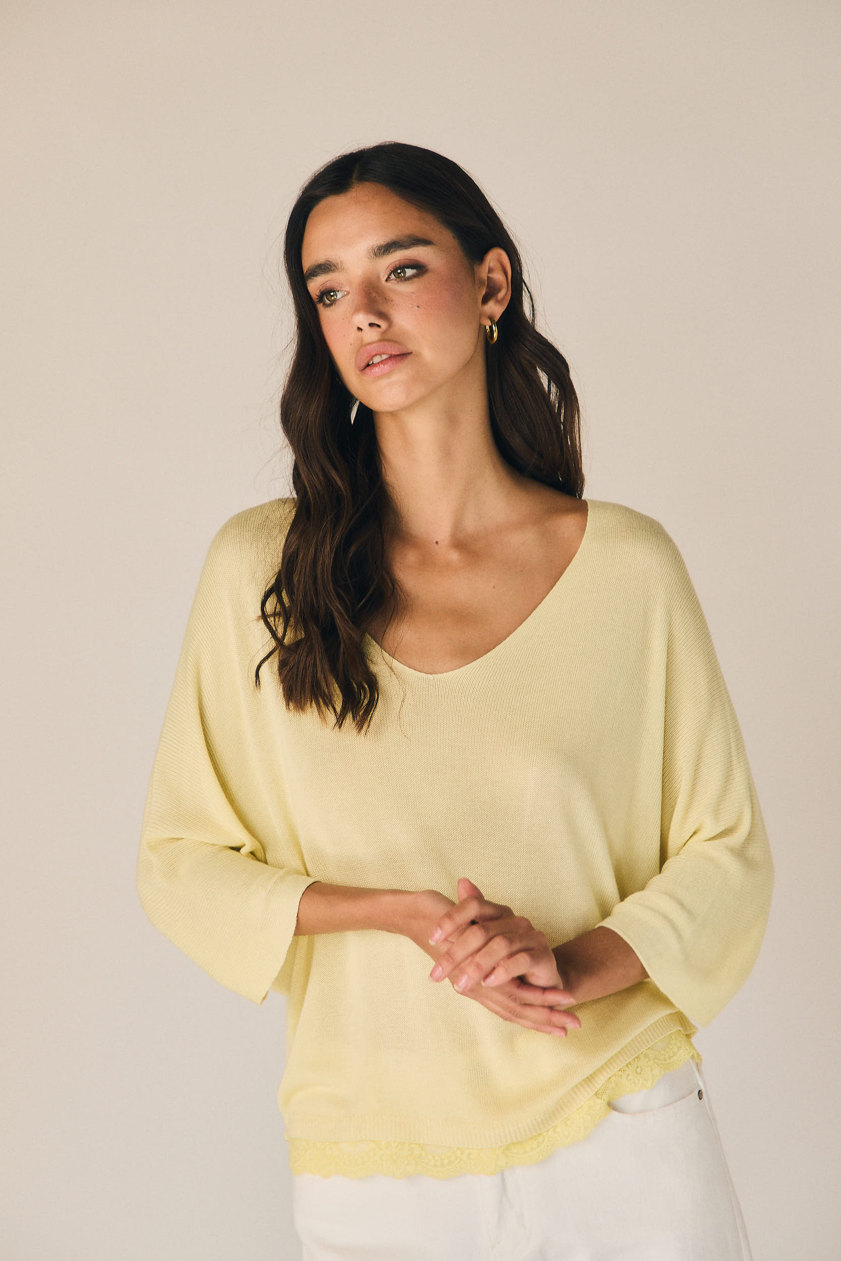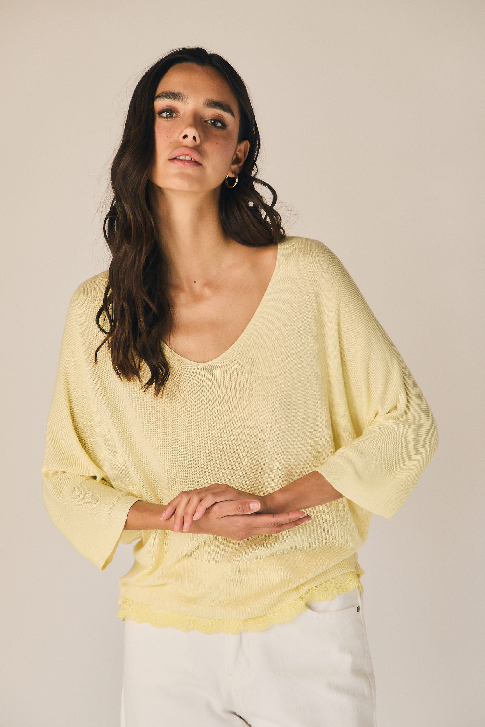 Top de punto ligero en tono amarillo con escote en pico y corte amplio. Manga tres cuartos con hombro caído que aporta un ajuste relajado. Bajo acabado en puntilla que suma detalle y textura al diseño.